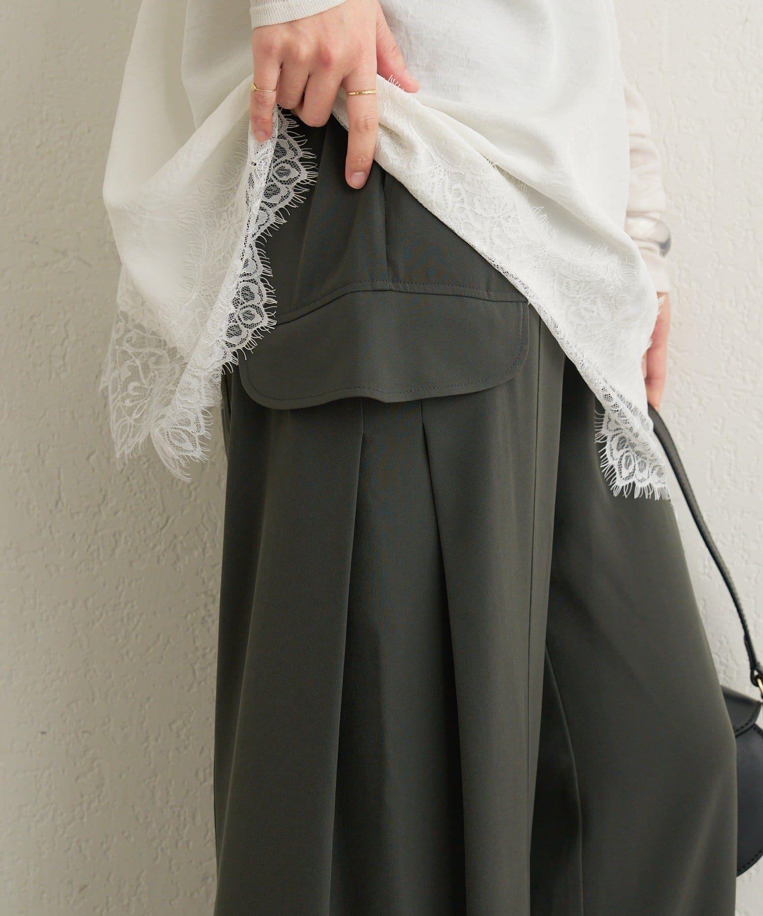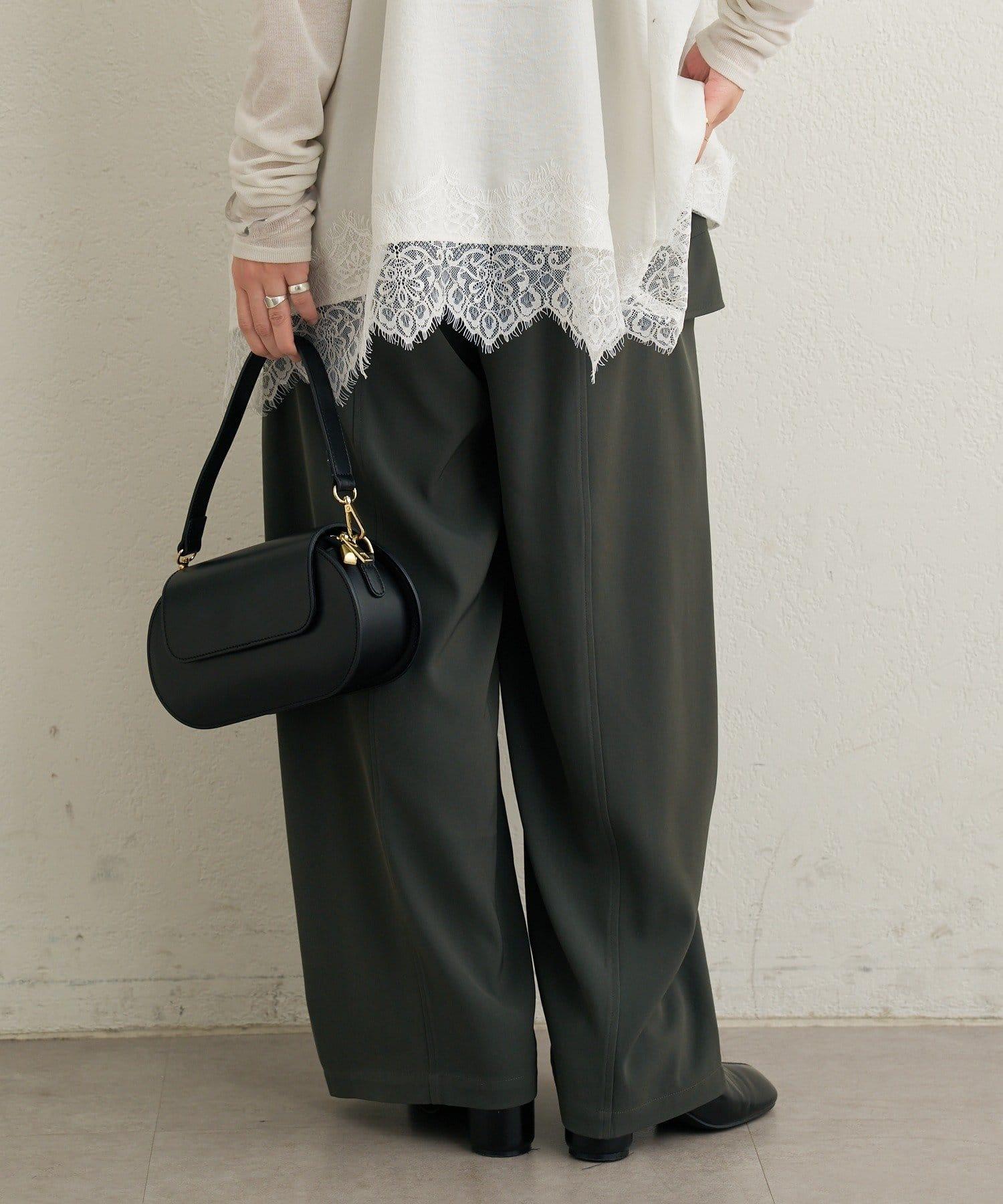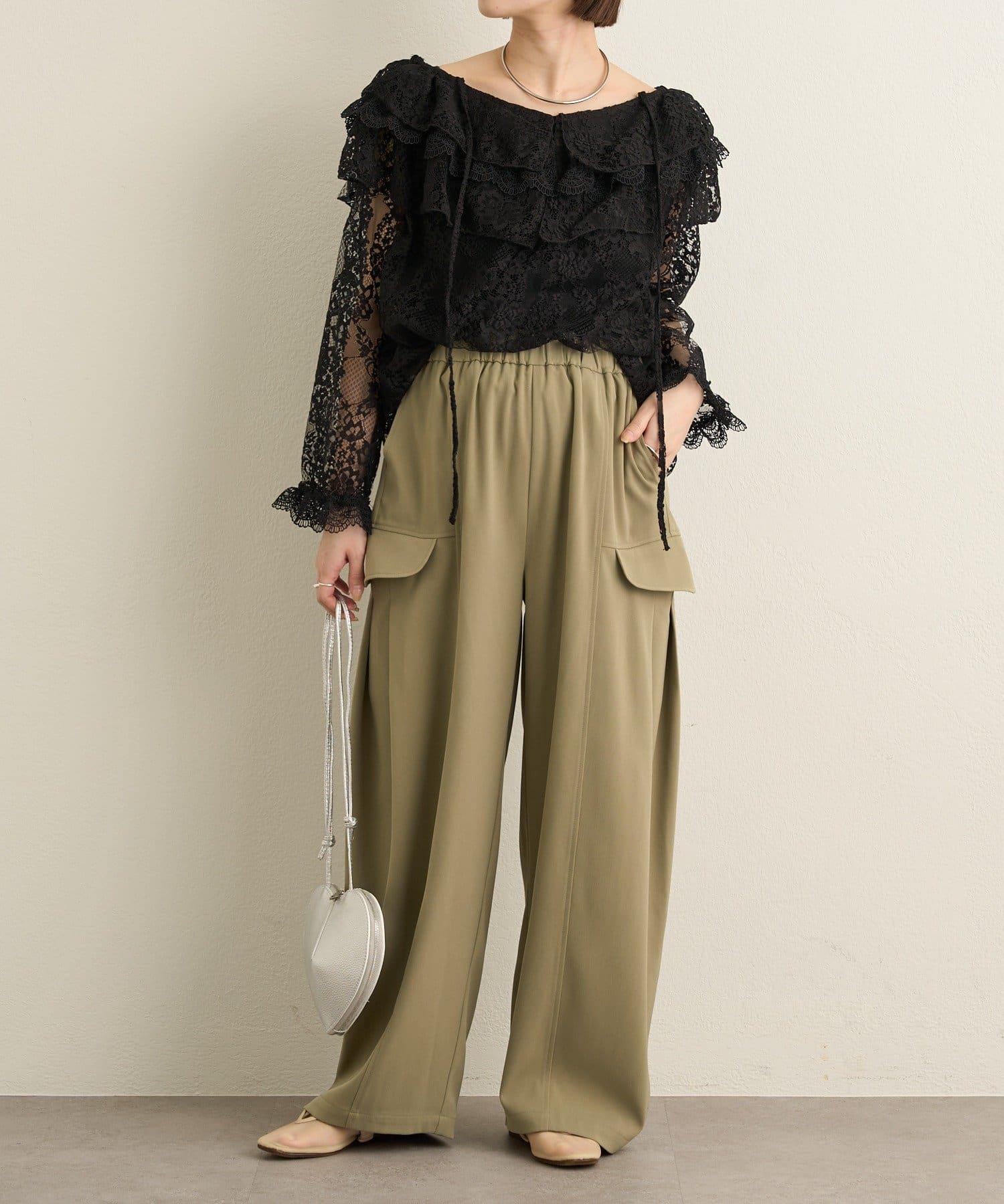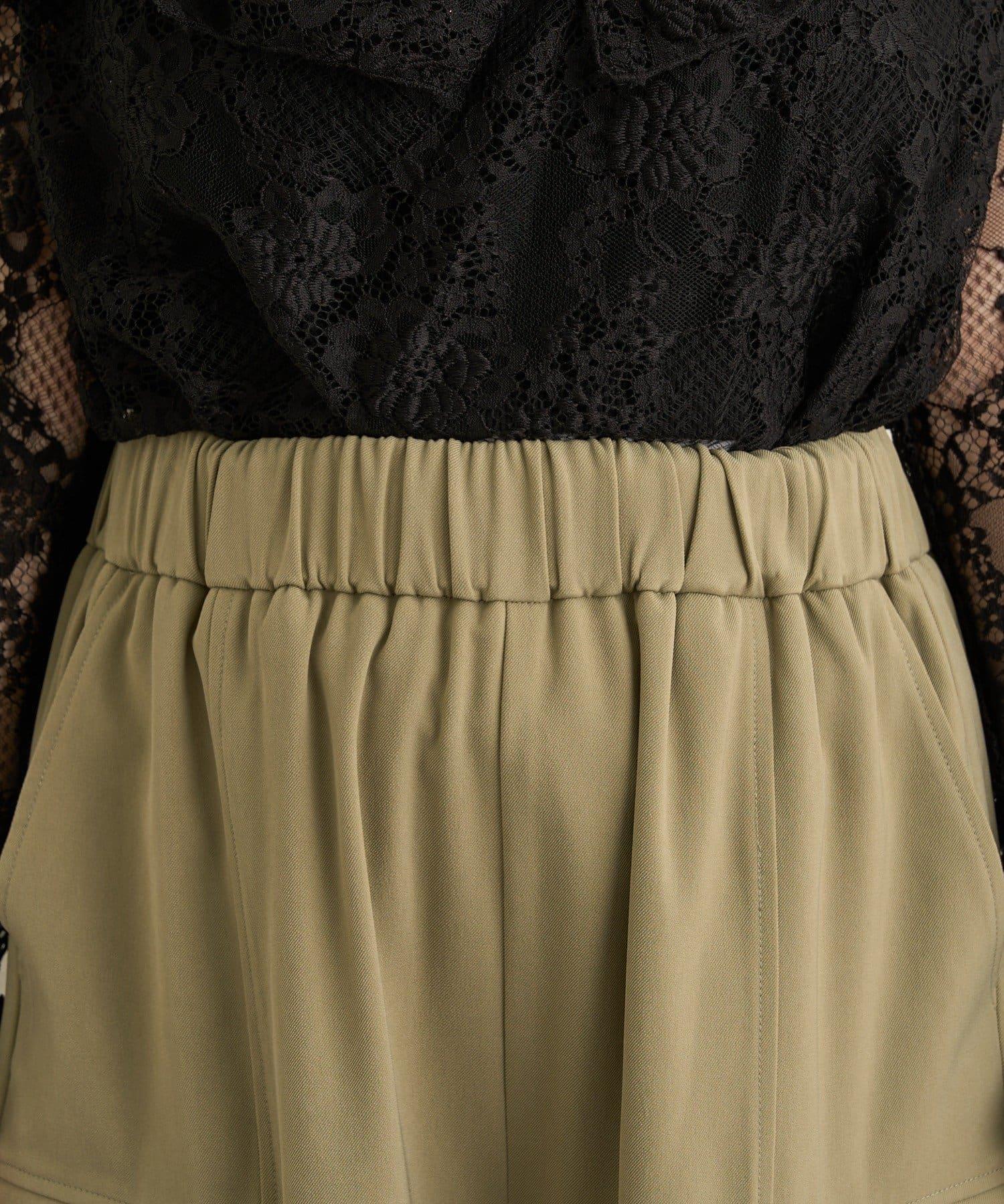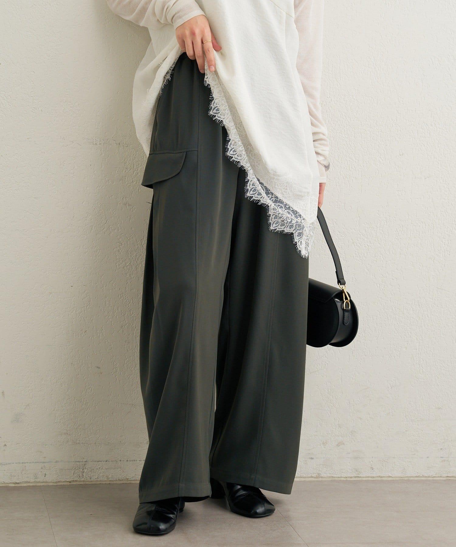 兩側口袋的收褶設計使褲身輪廓更具立體感,營造出女性化的外觀。