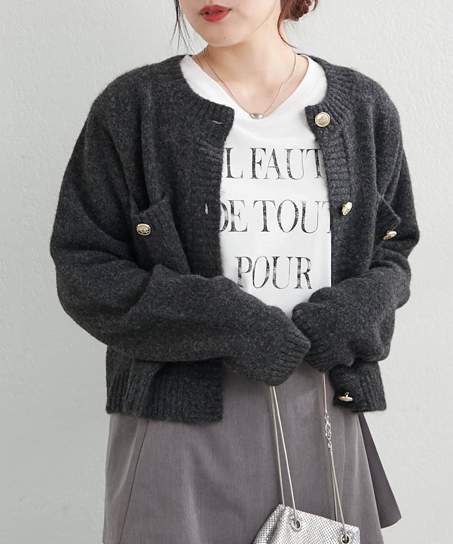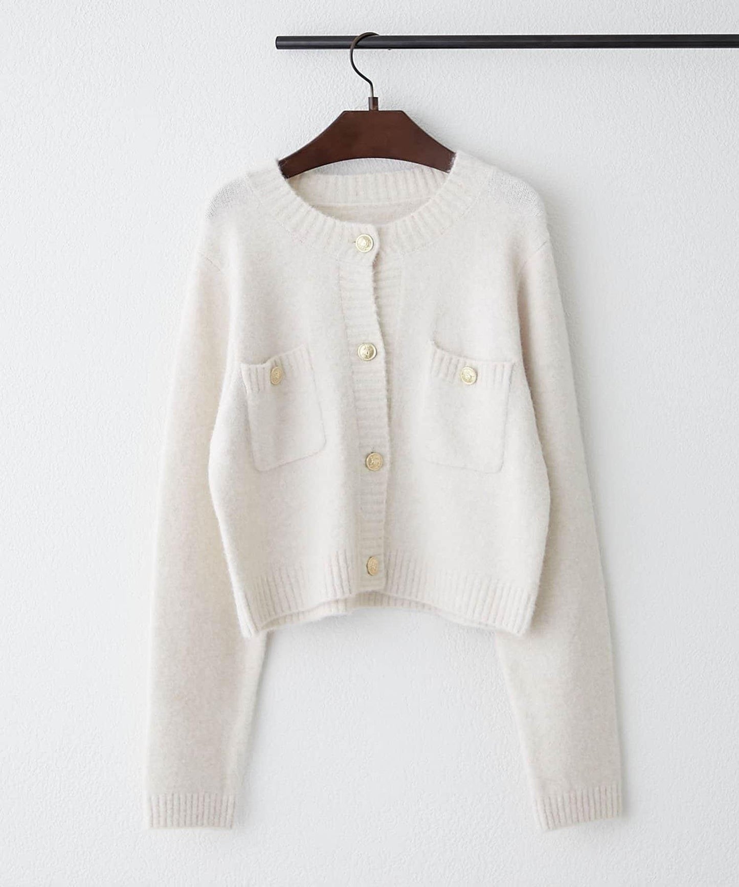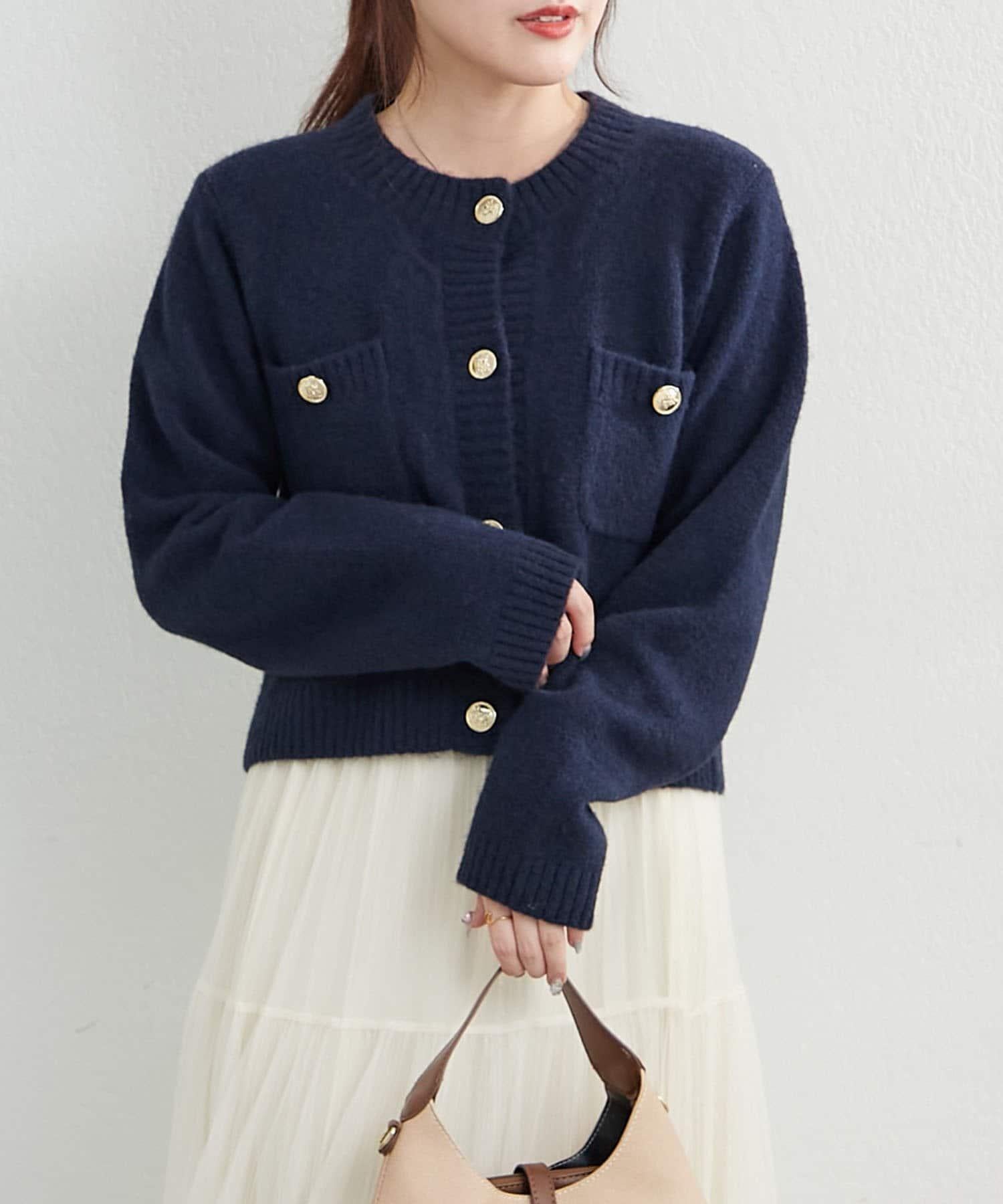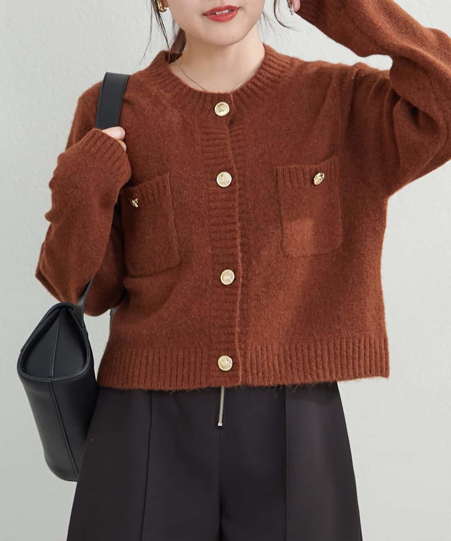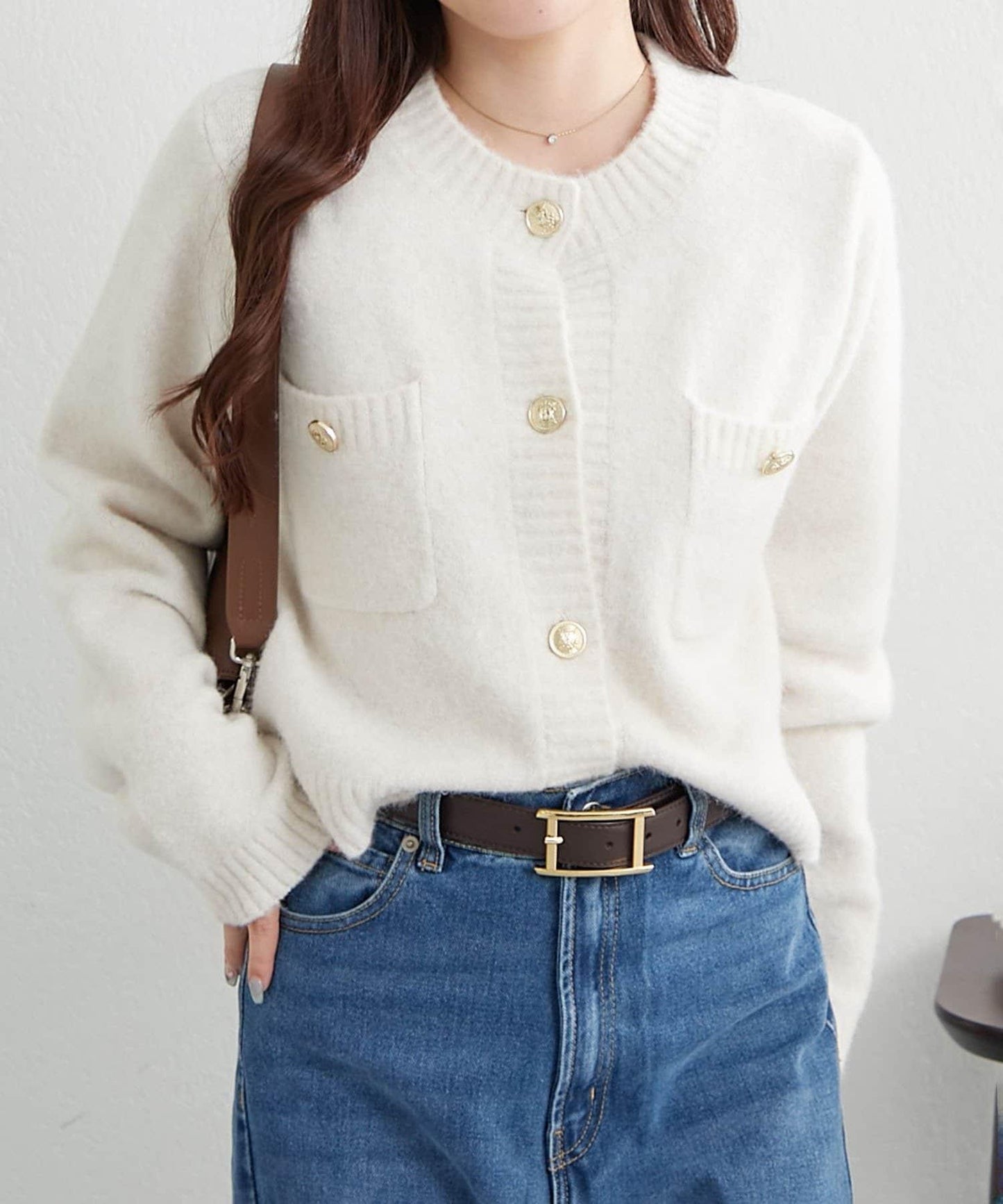 開衫正面的金色紐扣給人一種簡潔的感覺,蓬鬆的面料也不會刺痛皮膚。