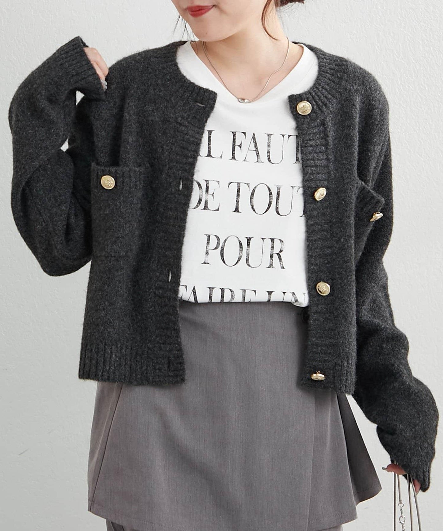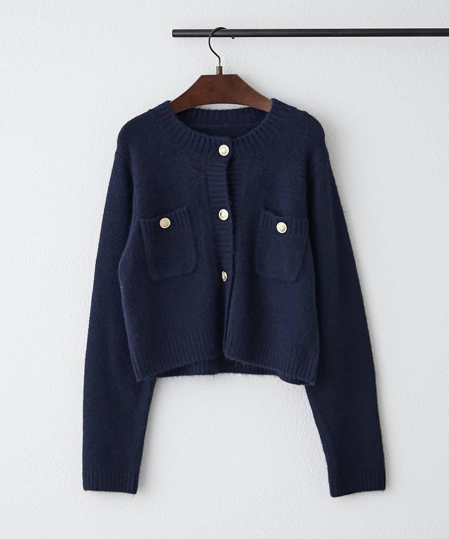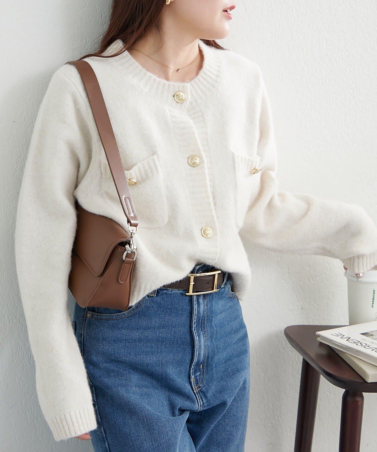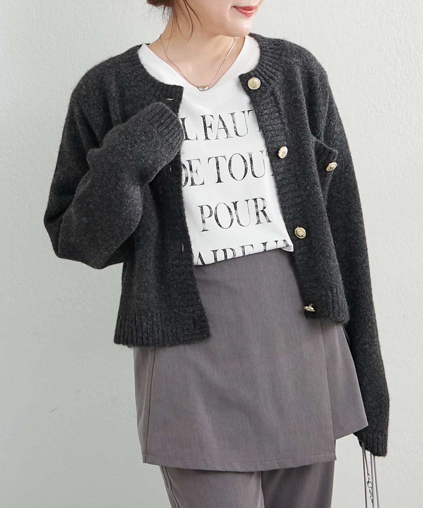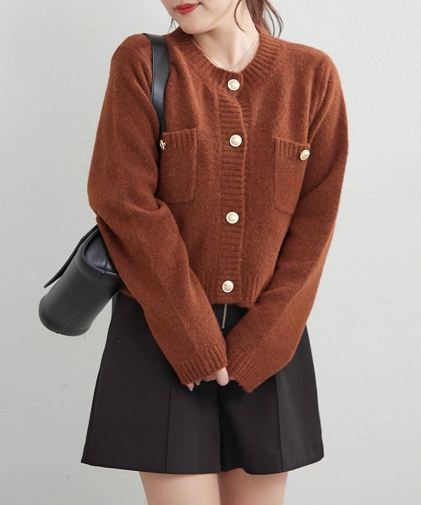 開衫正面的金色紐扣給人一種簡潔的感覺,蓬鬆的面料也不會刺痛皮膚。