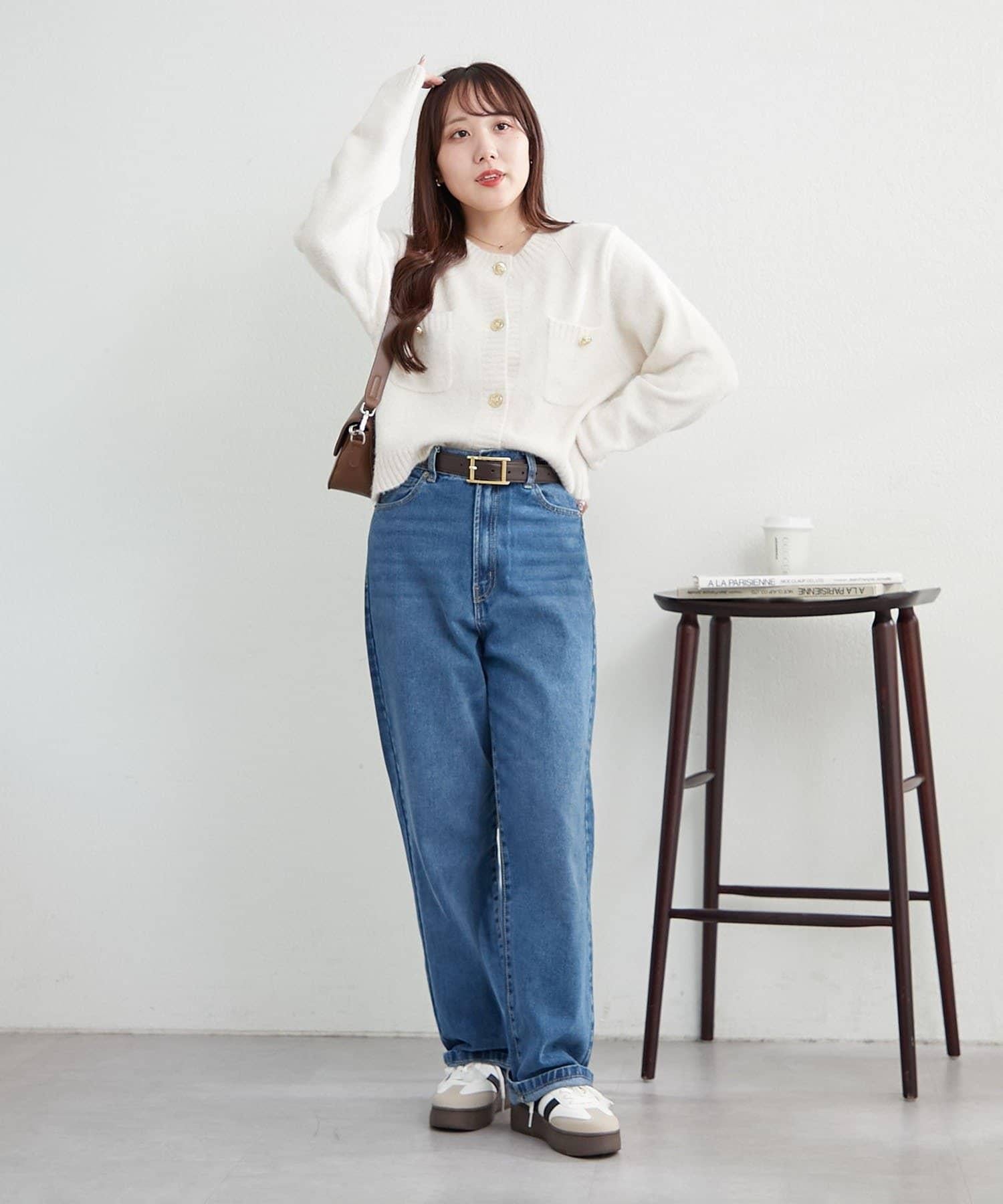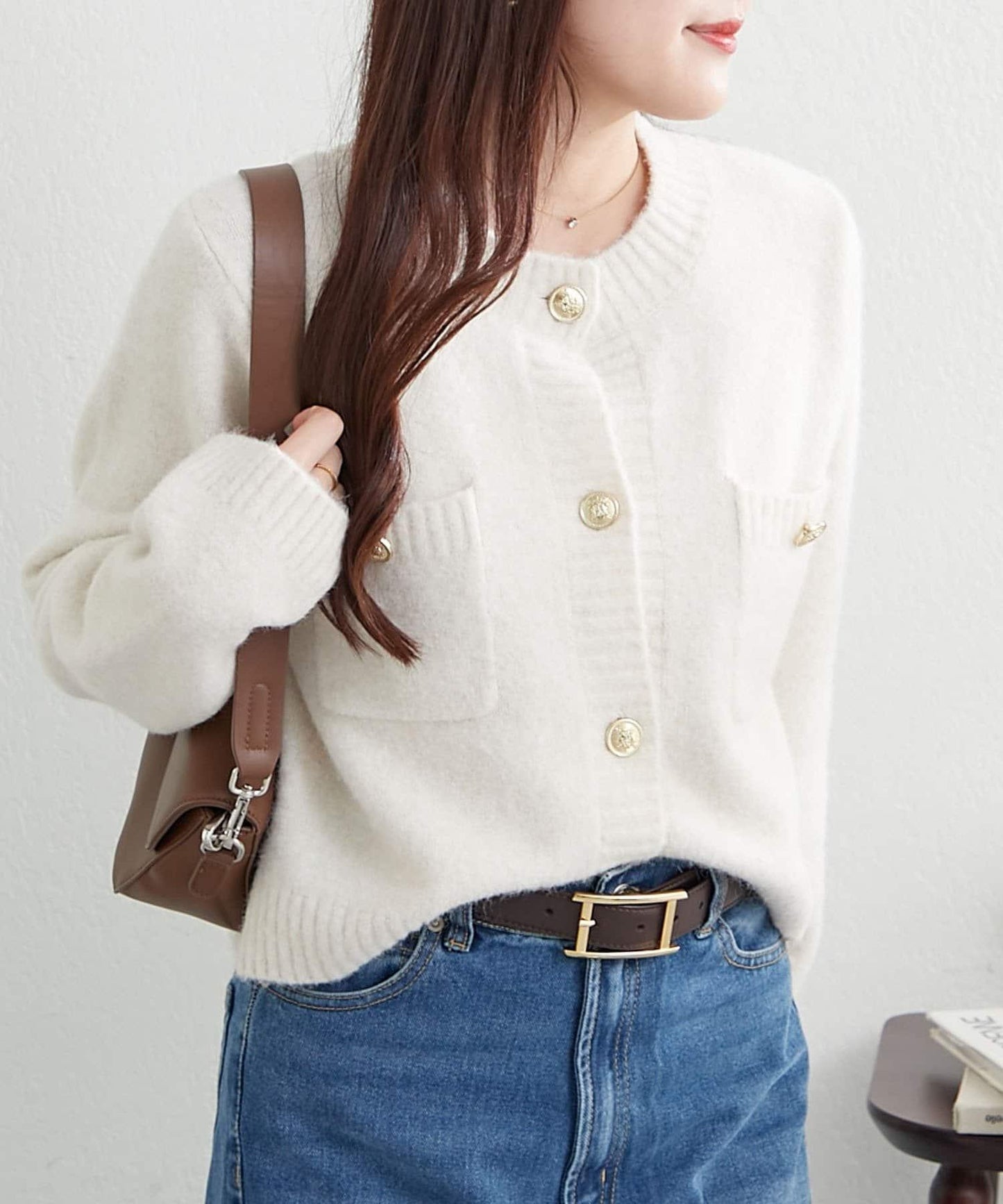 金色紐扣的開襟羊毛衫,簡潔大方。