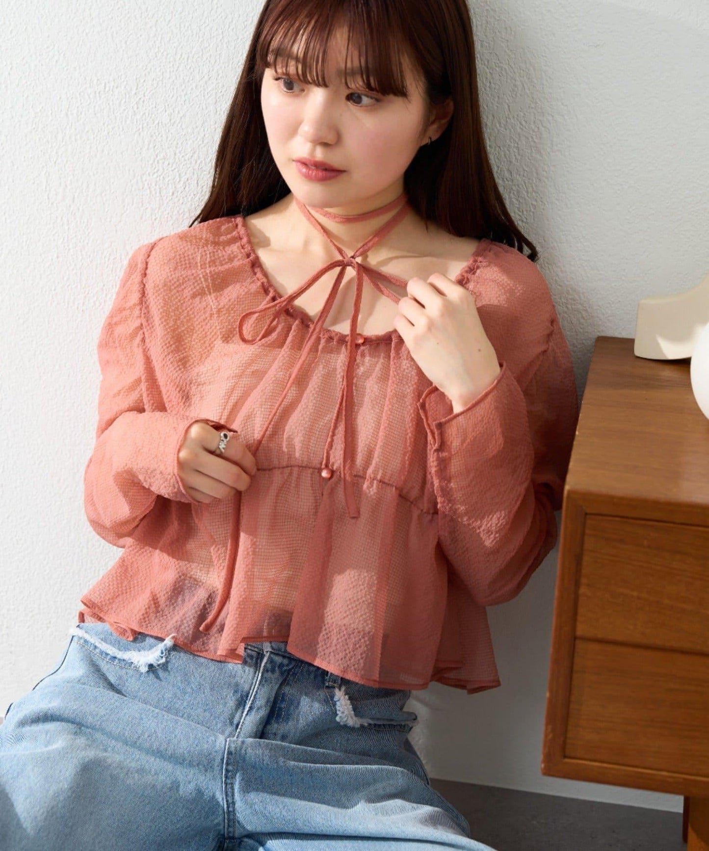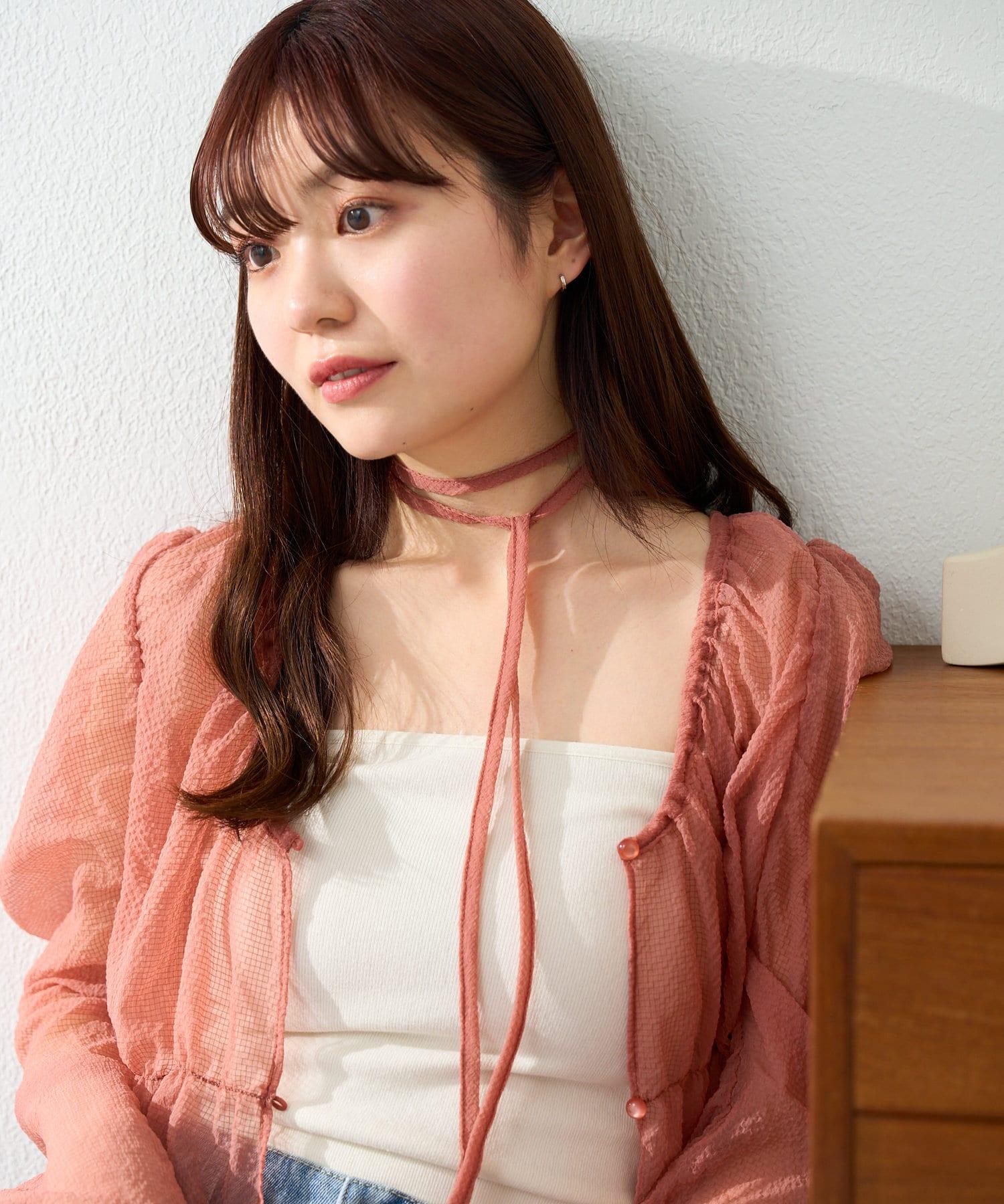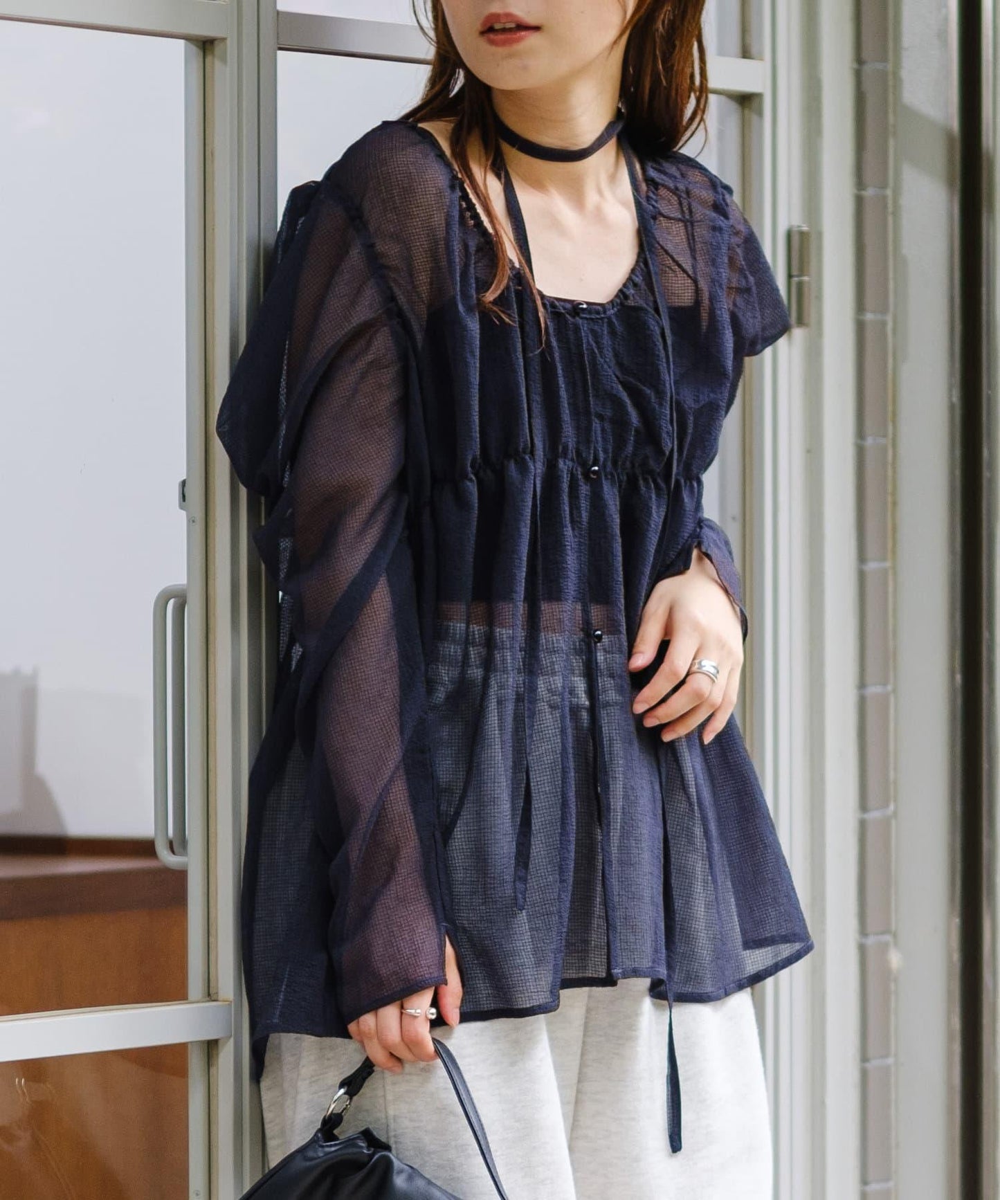多層上衣套裝,配有與上衣相同材質的choker。
