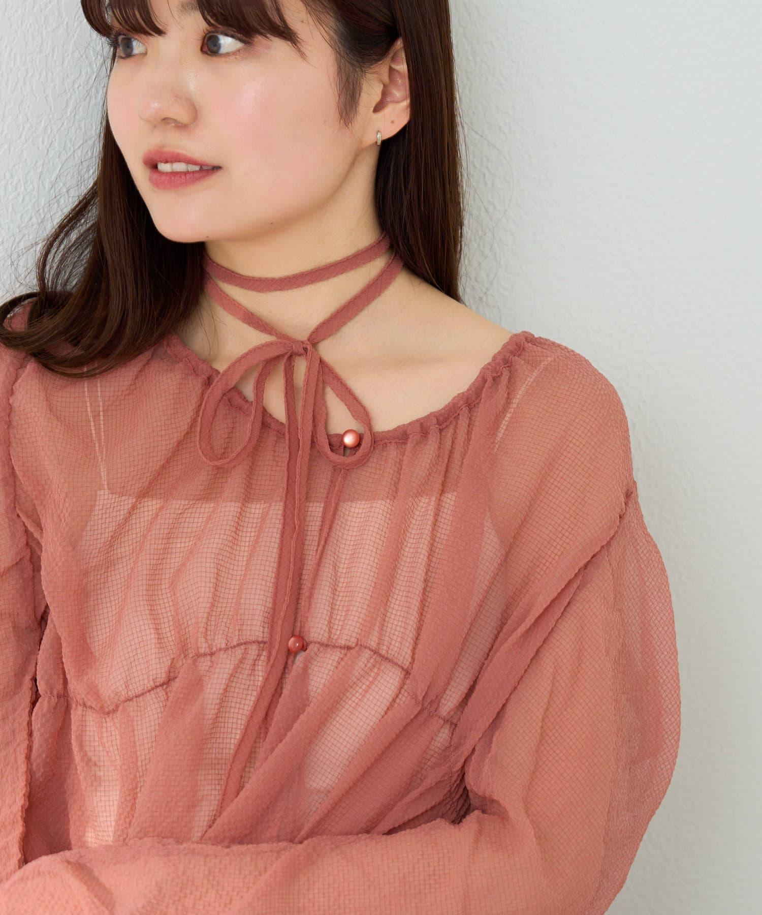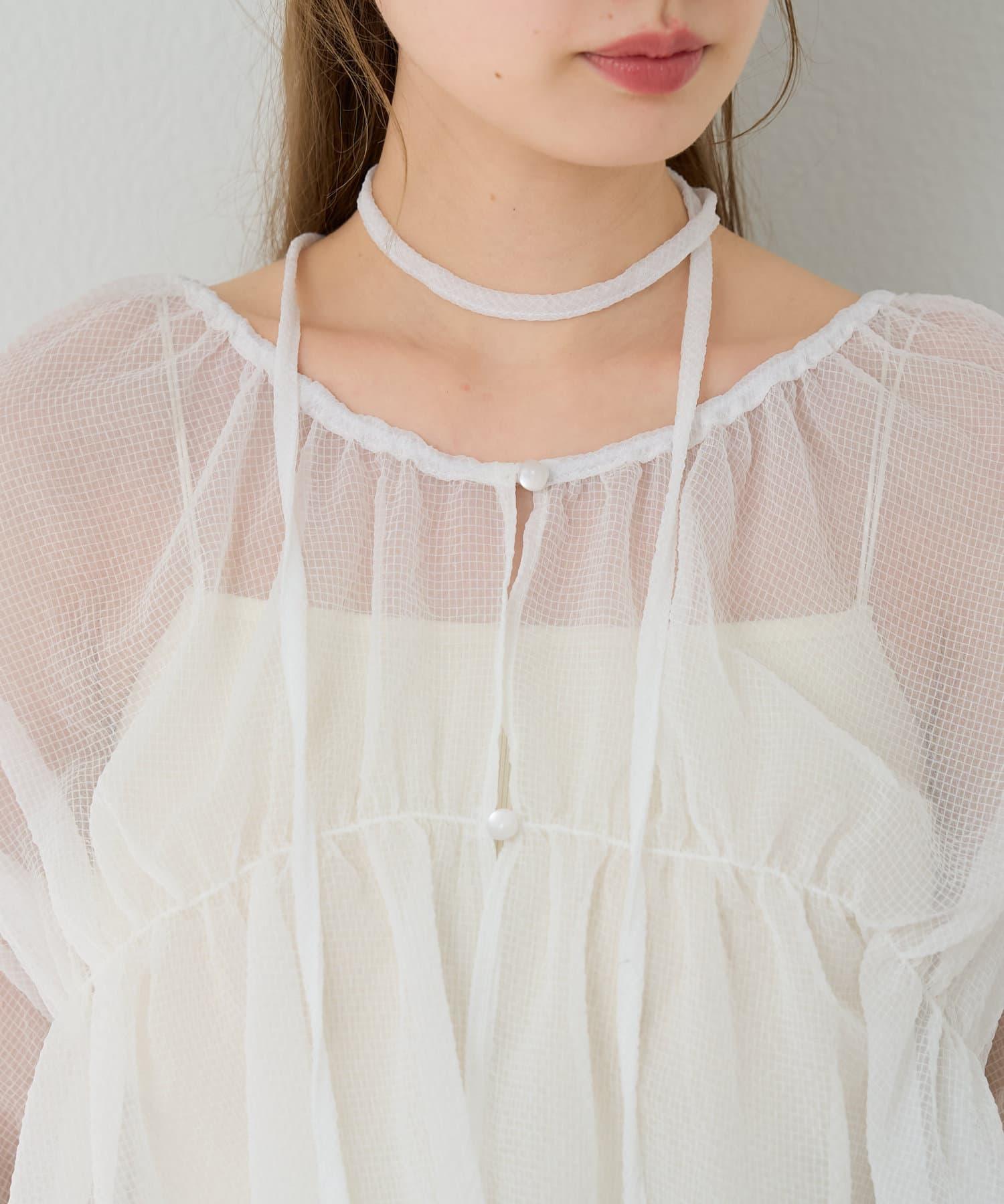 帶頸鍊的強肩褶皺襯衫