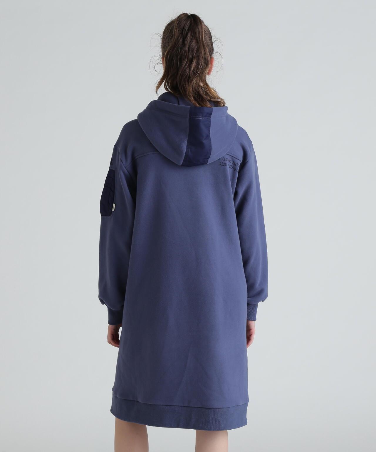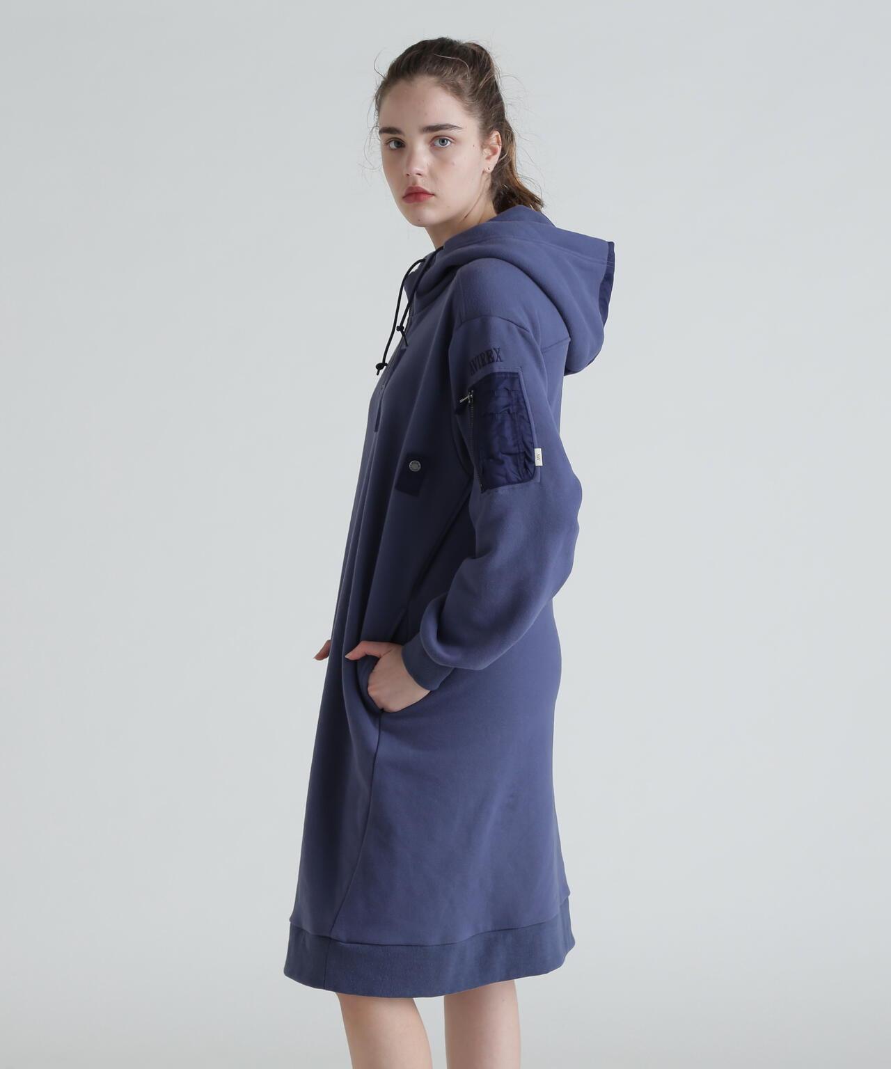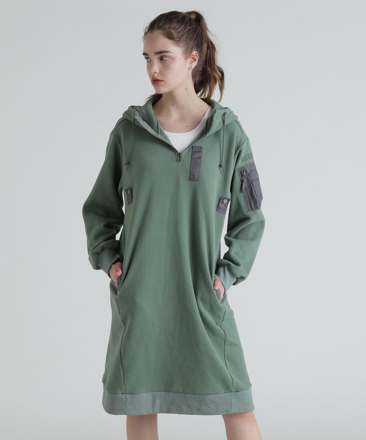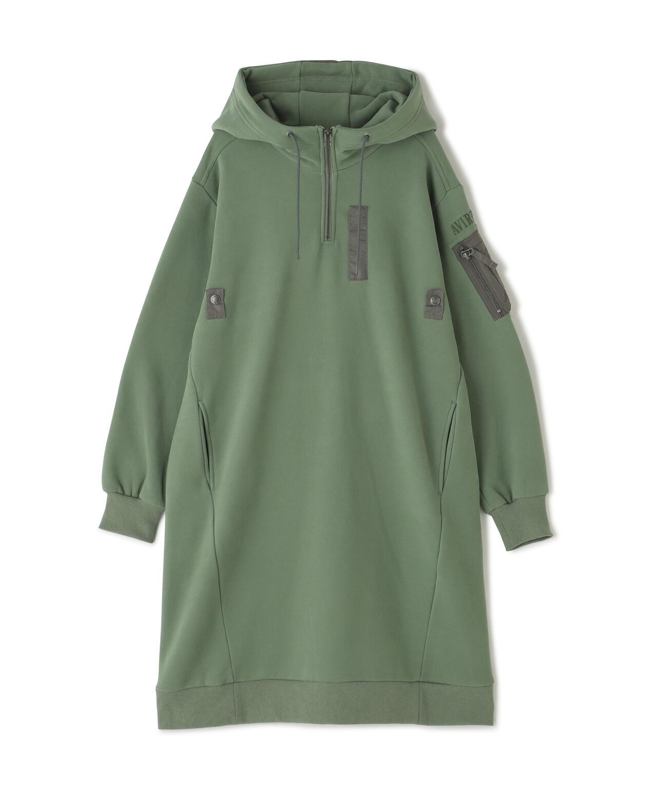 AVIREX Official Shop] 2024 WINTER ITEMHOODIE NYLON MILITARY ONEPIECE,帶 MA-1 袖袋和側面標籤細節,軍裝禮服,衣領可用拉鍊開合。衣領可用拉鍊開合。頸部乾淨整潔,從裡面也可以穿高領衫 ◎即使疊穿褲子,也能輕鬆平衡的長度。與褲子疊穿時也能輕鬆平衡的長度。AVIREX WOMAN] 該系列將純正軍裝的功能性和設計感投射到女式休閒裝上。作為一個獨特而永恆的女裝品牌,它以智慧、自由和品味著稱。