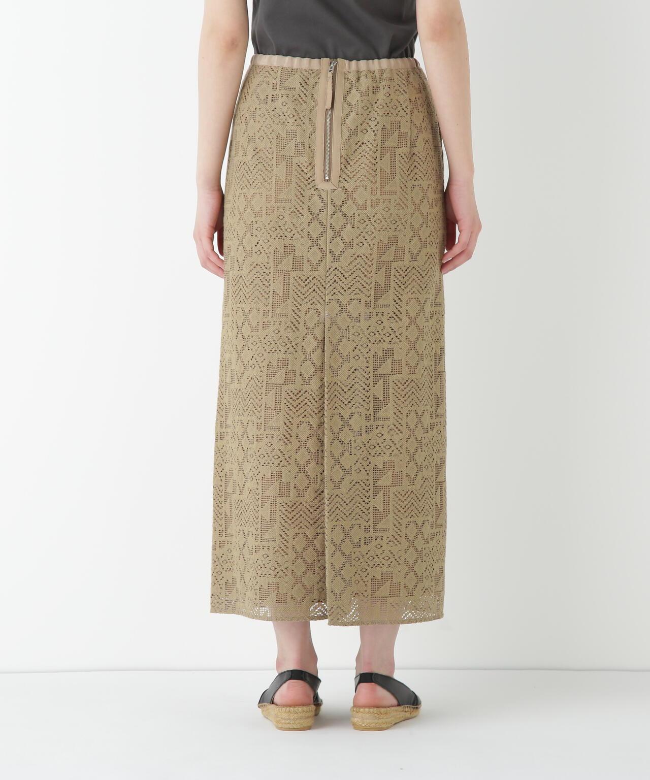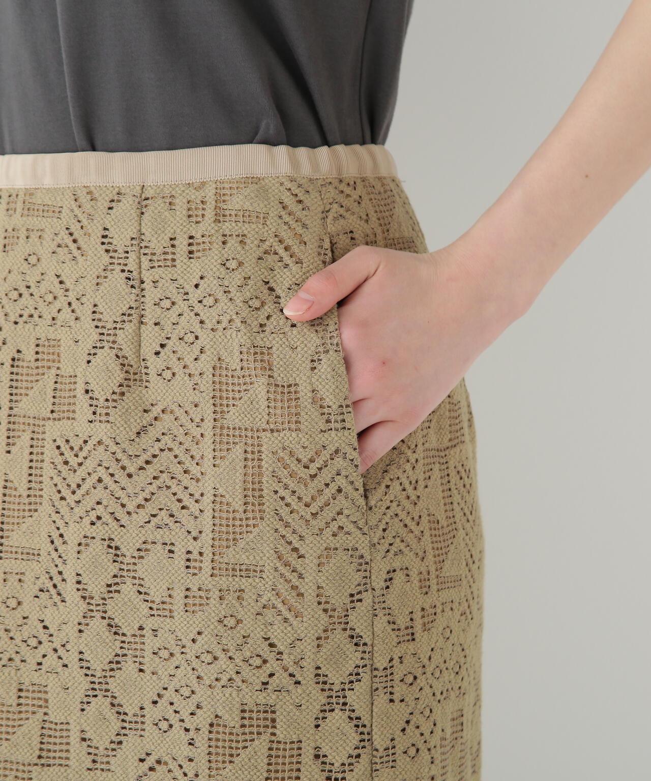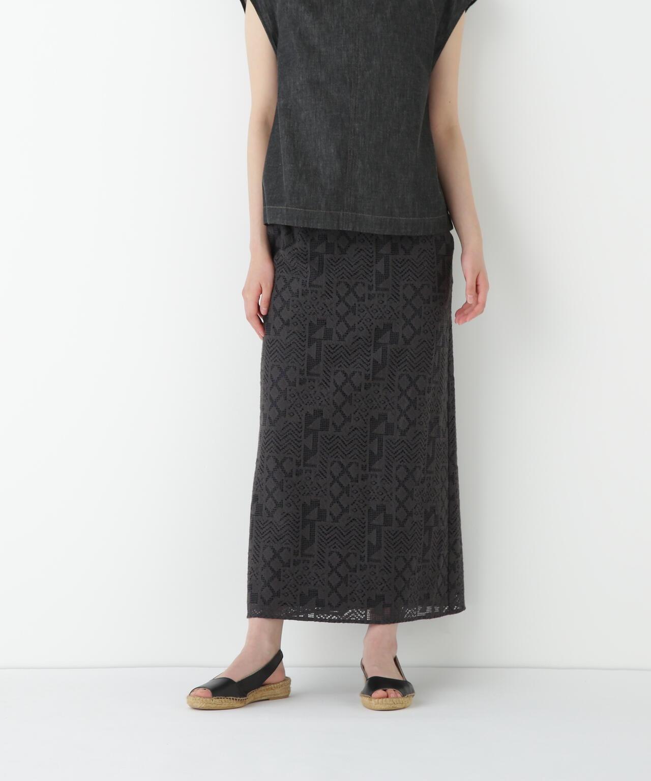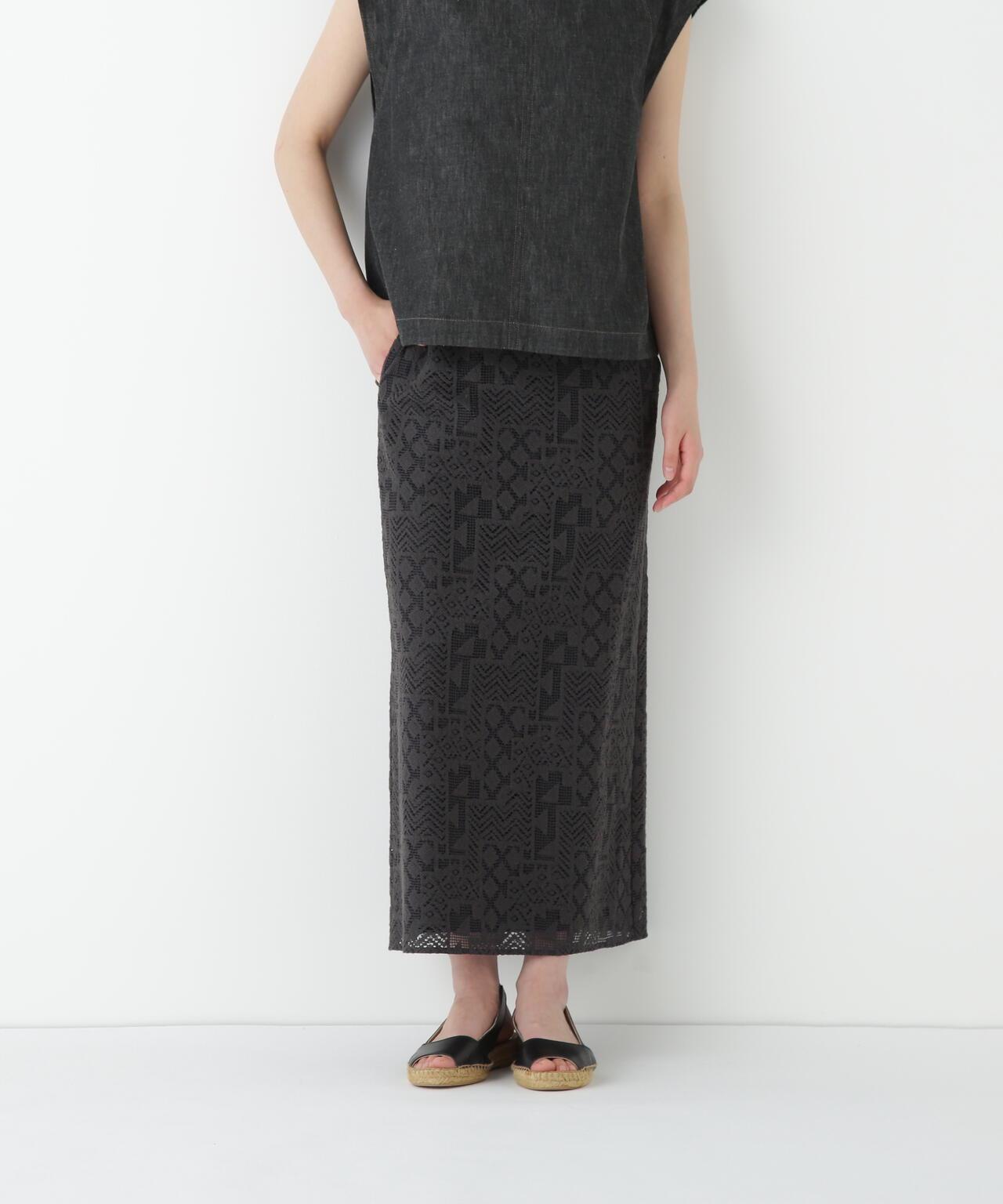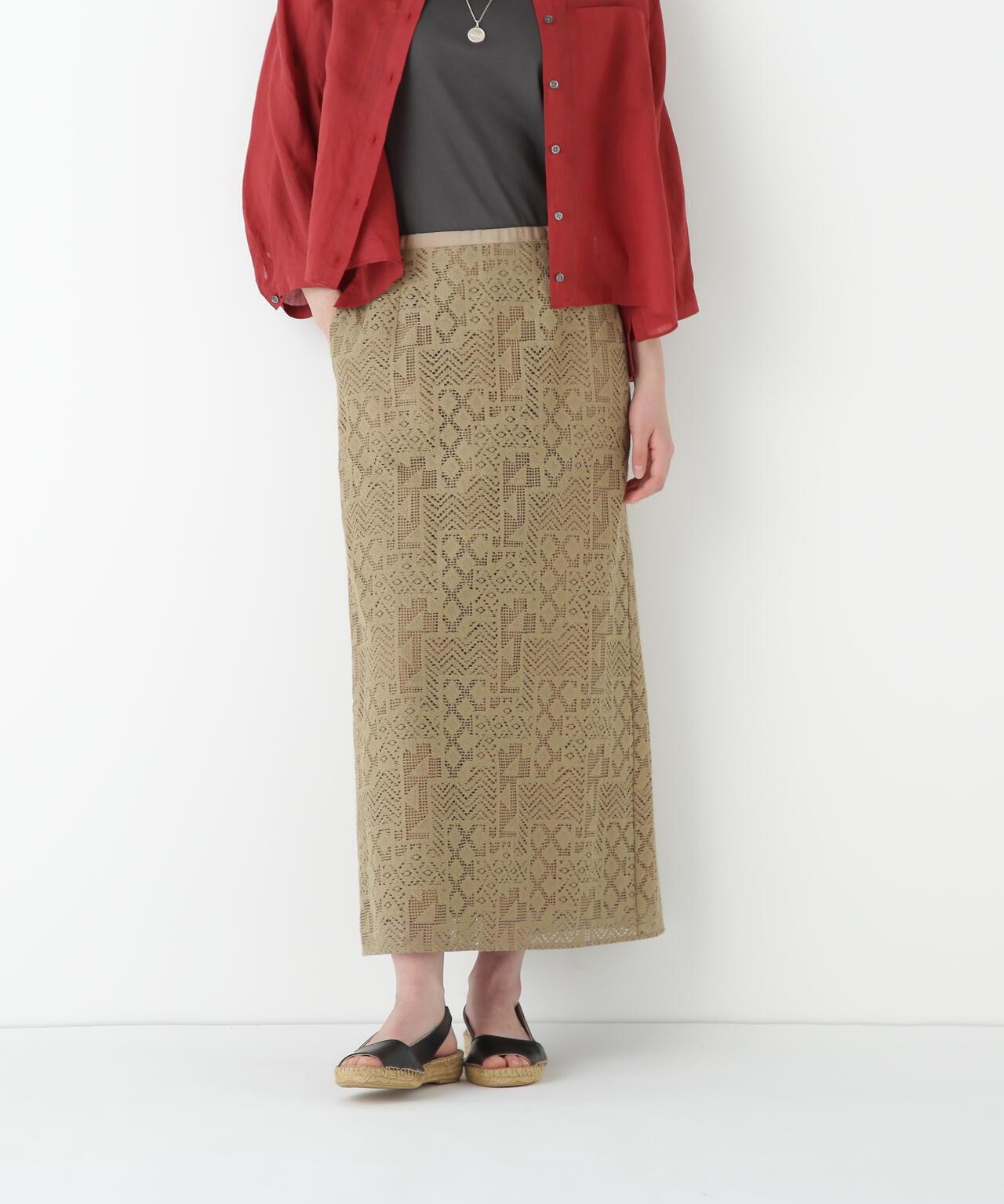 蕾絲裙提升簡約協調性 [設計特色] 直筒輪廓的簡約蕾絲裙。腰部的羅緞絲帶和前後的鬆緊帶使其易於穿著,不會有束縛感。裙子由幾何圖案的拉舍爾蕾絲與棉和聚酯纖維製成。這款蕾絲裙可搭配休閒單品,也可搭配簡單的上衣。搭配涼鞋,給人感覺更輕盈。此外,還建議搭配同種面料的外套。