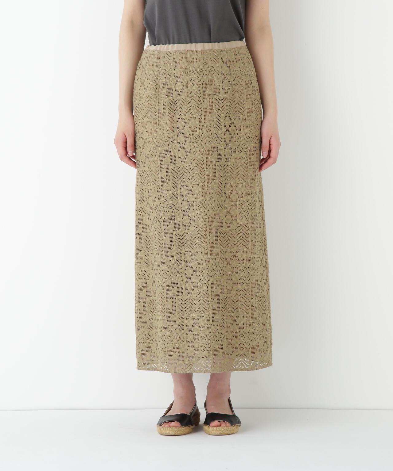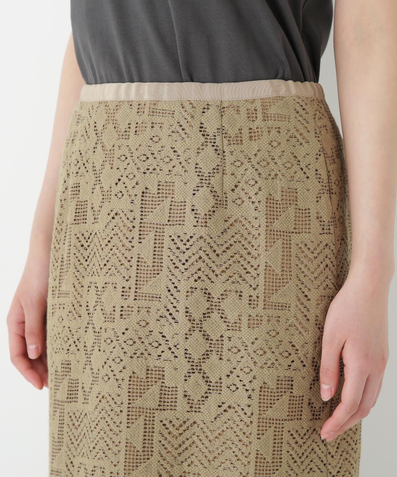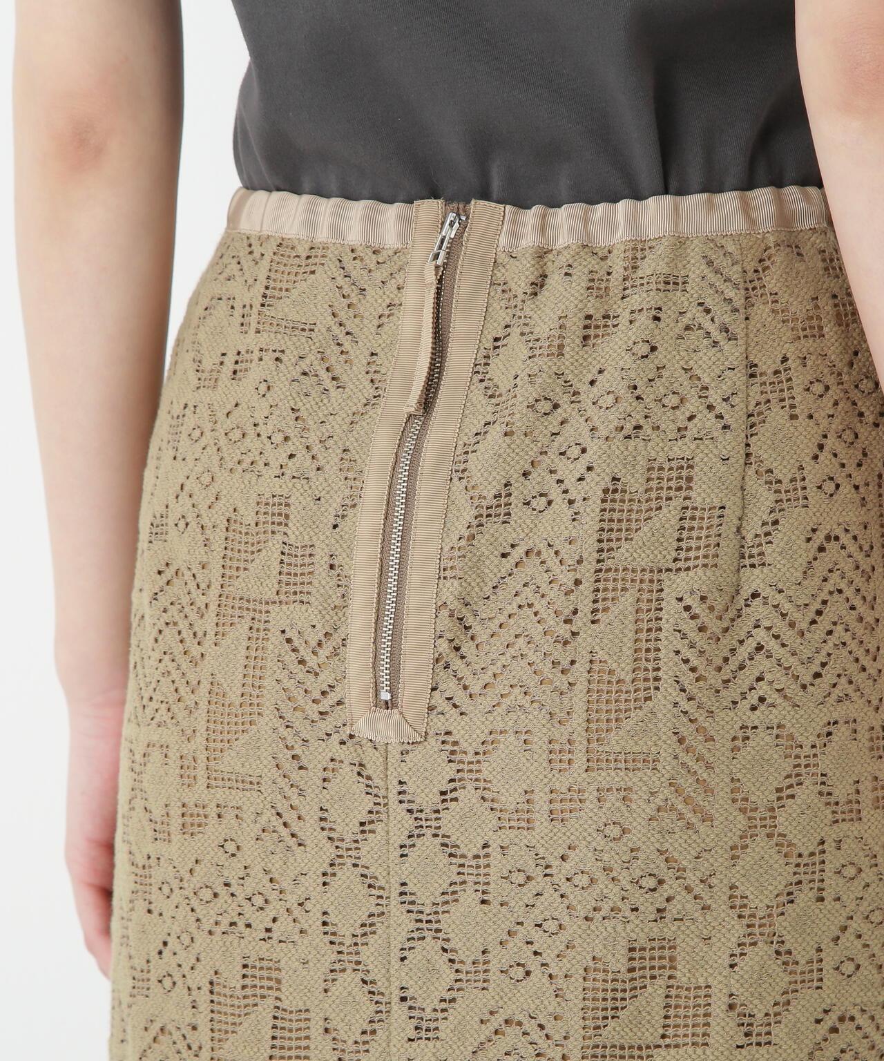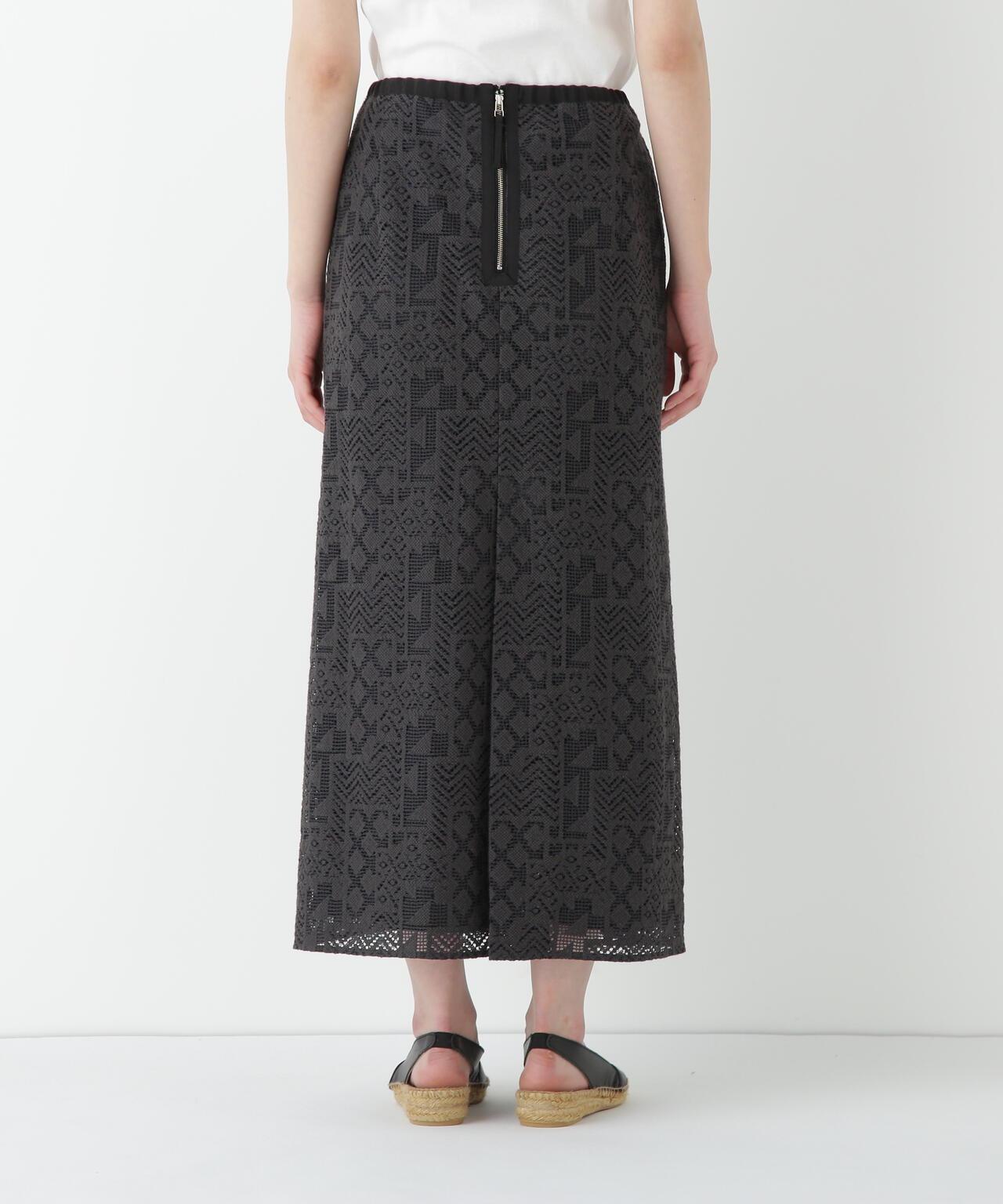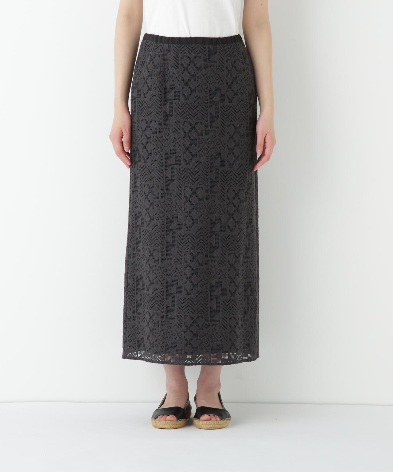 蕾絲裙提升簡約協調性 [設計特色] 直筒輪廓的簡約蕾絲裙。腰部的羅緞絲帶和前後的鬆緊帶使其易於穿著,不會有束縛感。裙子由幾何圖案的拉舍爾蕾絲與棉和聚酯纖維製成。這款蕾絲裙可搭配休閒單品,也可搭配簡單的上衣。搭配涼鞋,給人感覺更輕盈。此外,還建議搭配同種面料的外套。