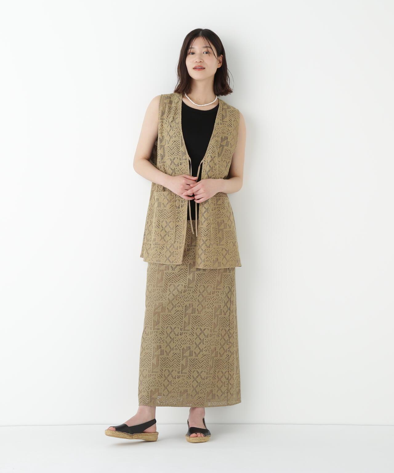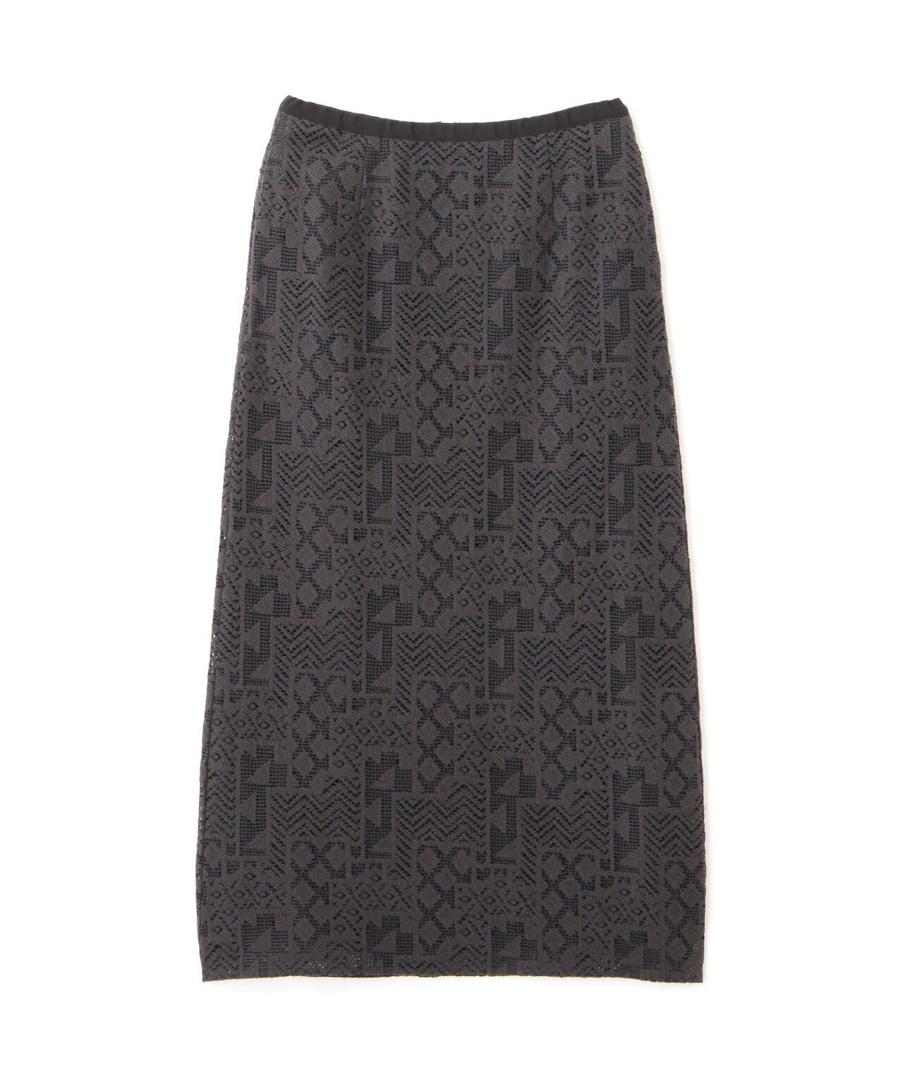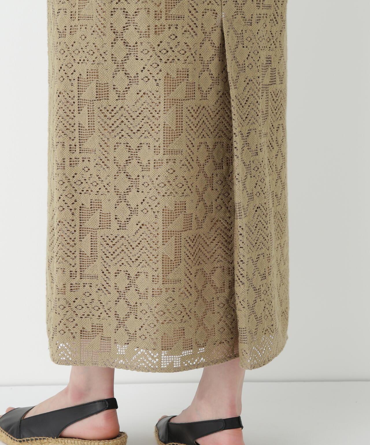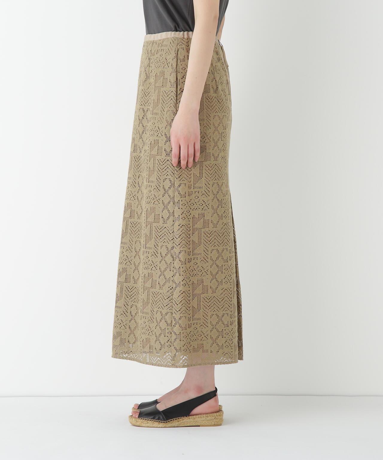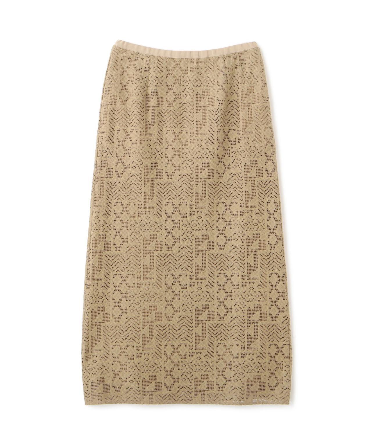 蕾絲裙提升簡約協調性 [設計特色] 直筒輪廓的簡約蕾絲裙。腰部的羅緞絲帶和前後的鬆緊帶使其易於穿著,不會有束縛感。裙子由幾何圖案的拉舍爾蕾絲與棉和聚酯纖維製成。這款蕾絲裙可搭配休閒單品,也可搭配簡單的上衣。搭配涼鞋,給人感覺更輕盈。此外,還建議搭配同種面料的外套。