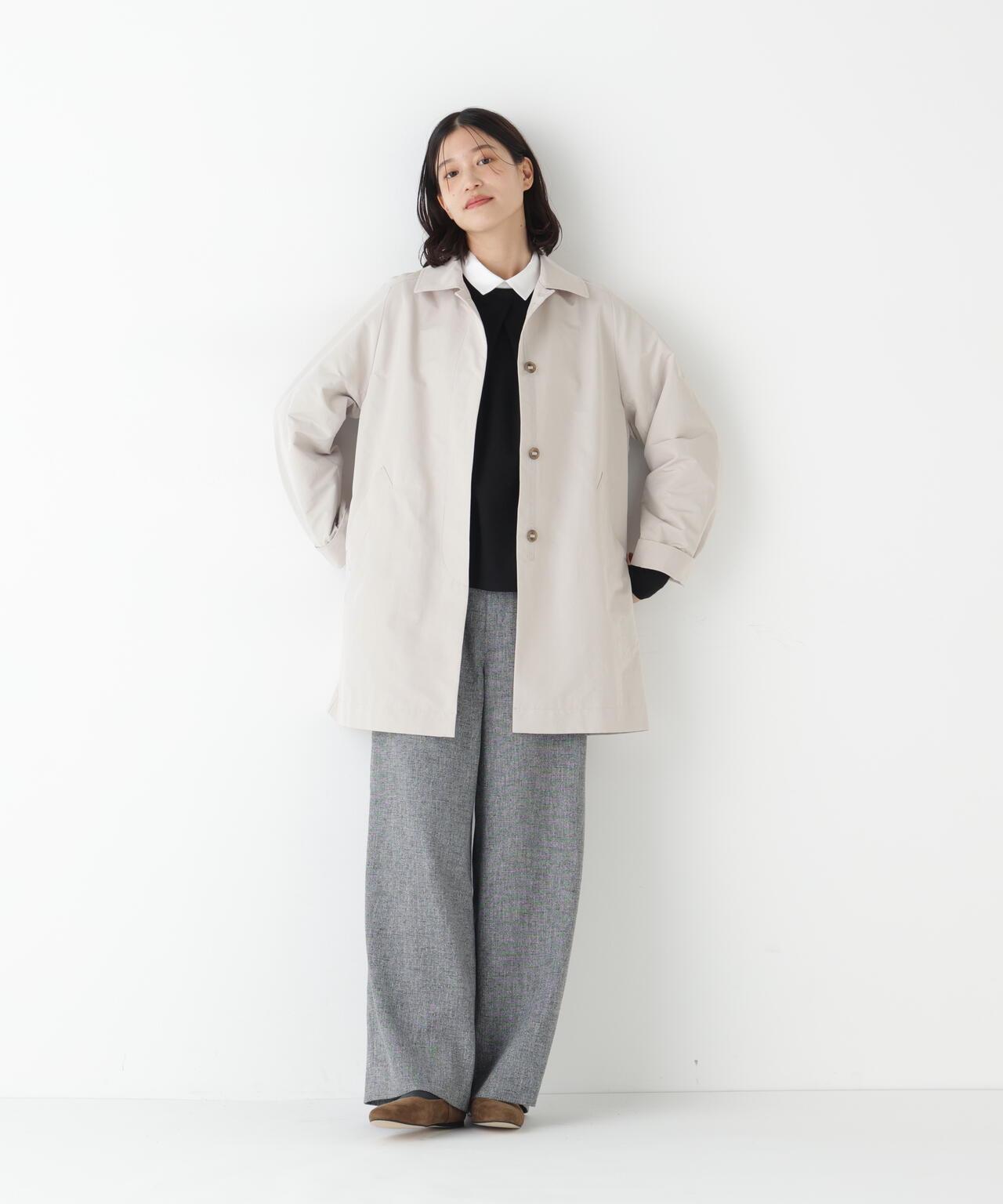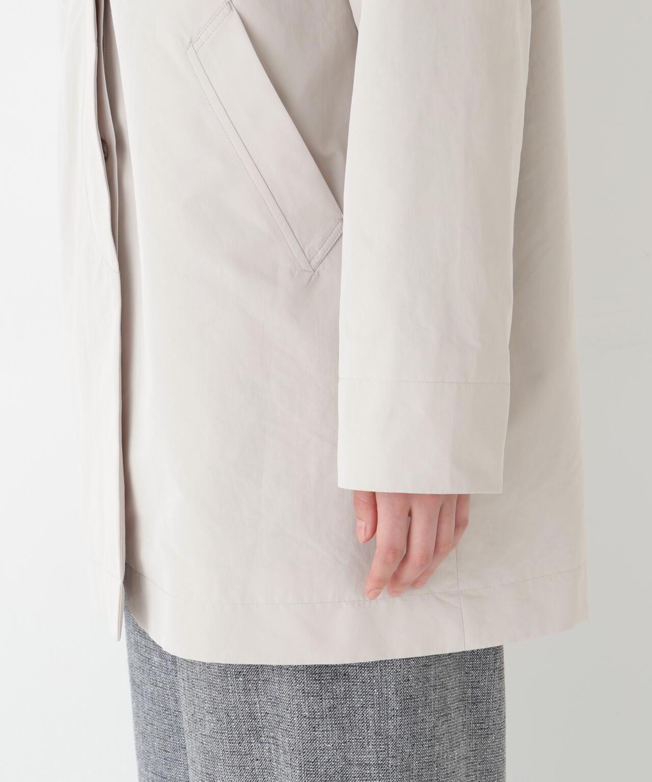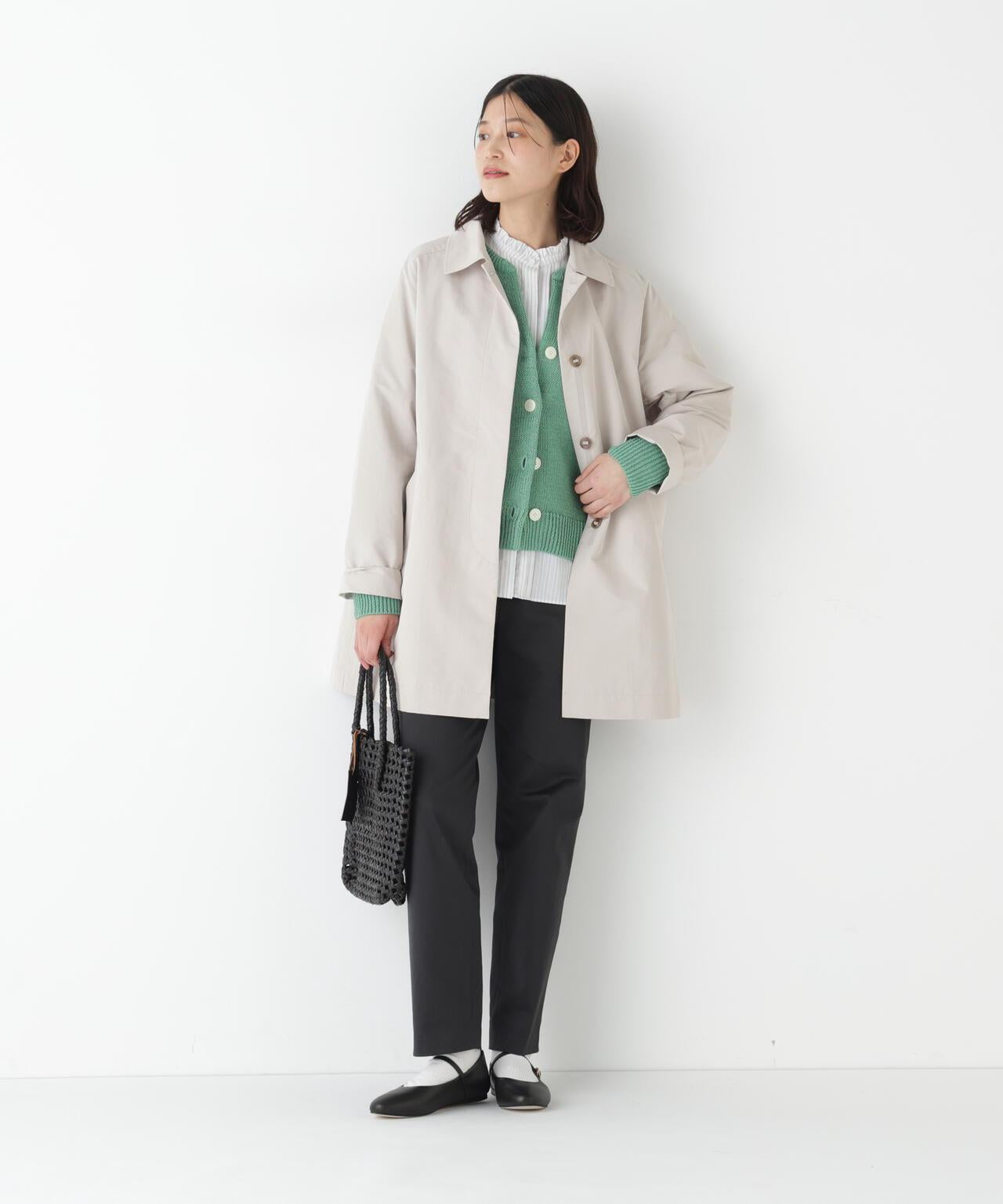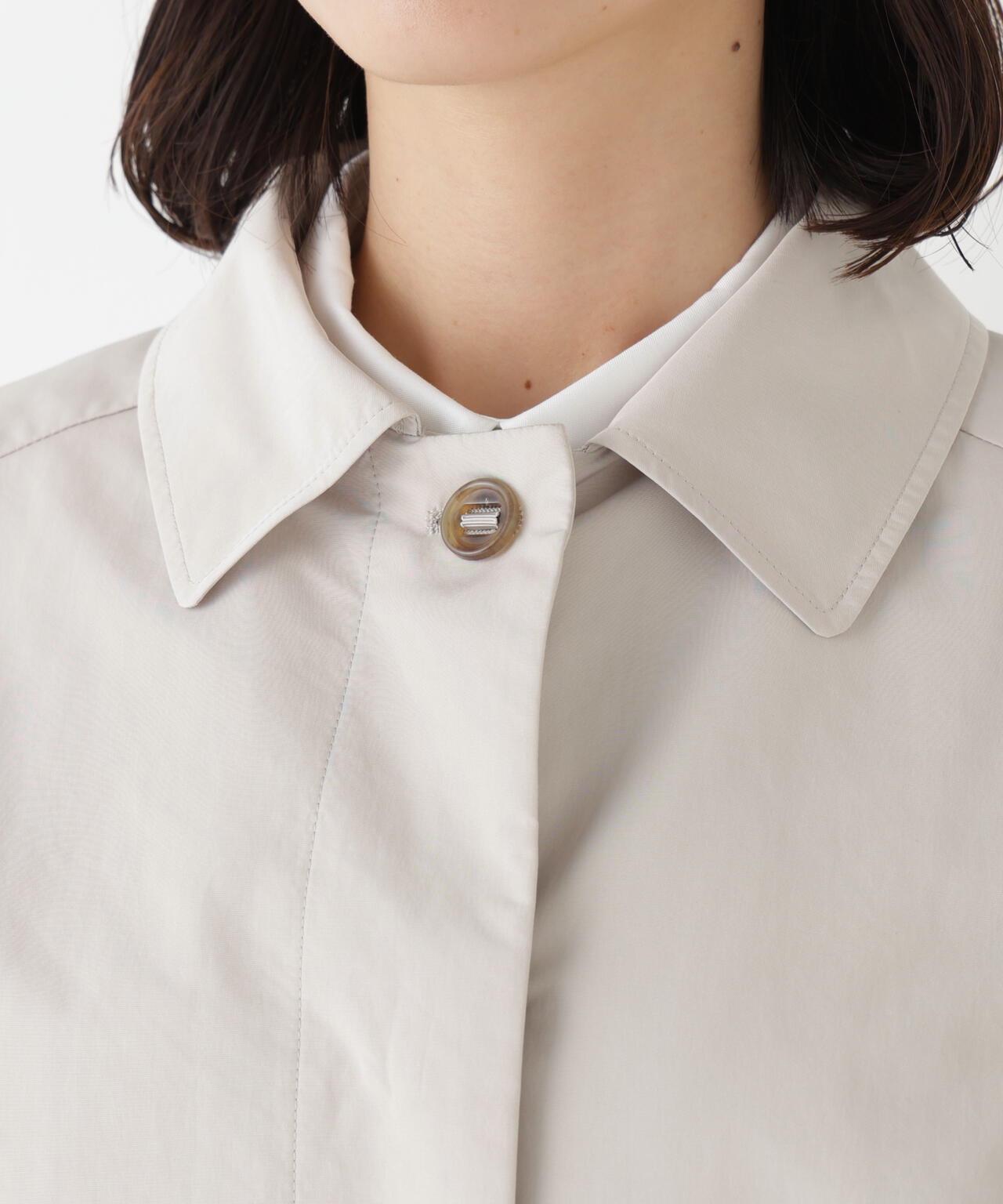 多功能不鏽鋼領大衣,適合日常穿著 [設計要點] 這是一款簡潔的不鏽鋼領大衣,採用輕質材料製成,並配有襯裡。傘扣和背面的條紋圖案是設計要點。袖口沒有打開,但可以向後翻轉,翻轉幅度較深。這種具有弱防水功能的塔夫綢面料由回收的聚酯纖維和有機棉編織而成。它具有優雅而微妙的光澤。推薦座標] 這款春季百搭大衣的長度不會太長,因此可以搭配任何下身輪廓。