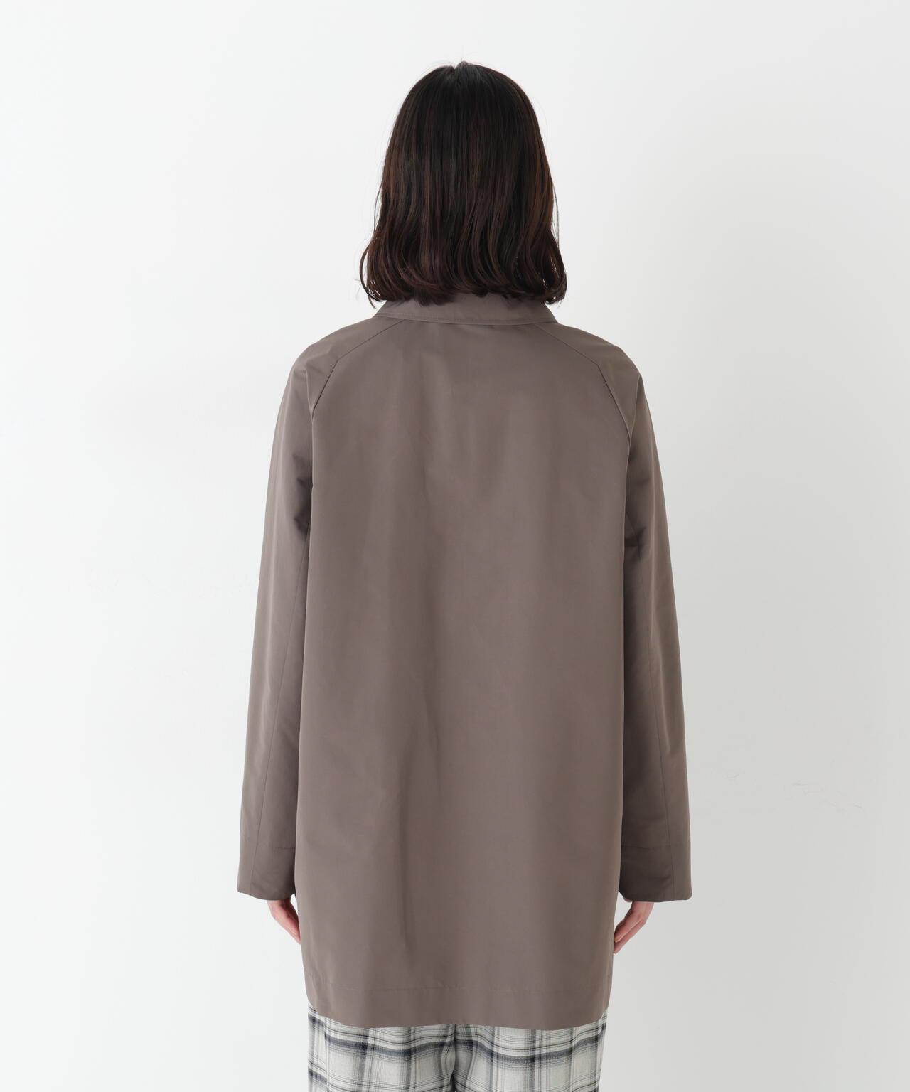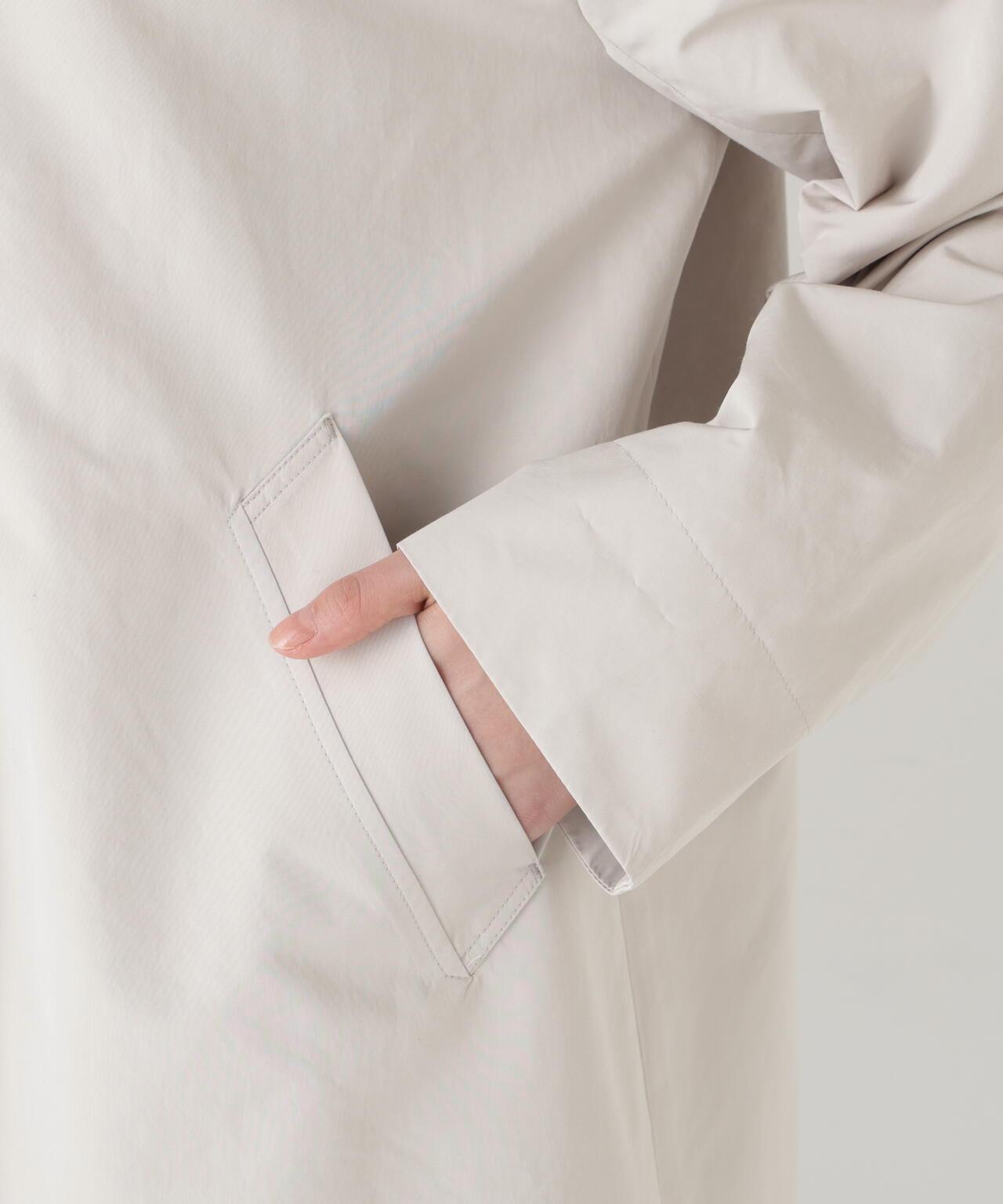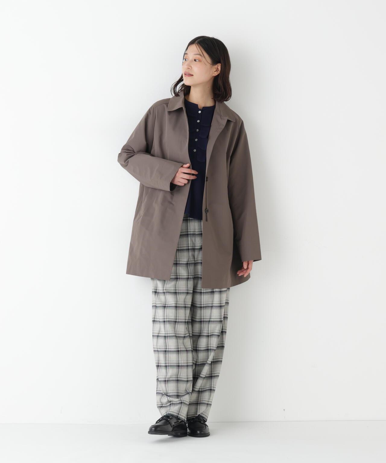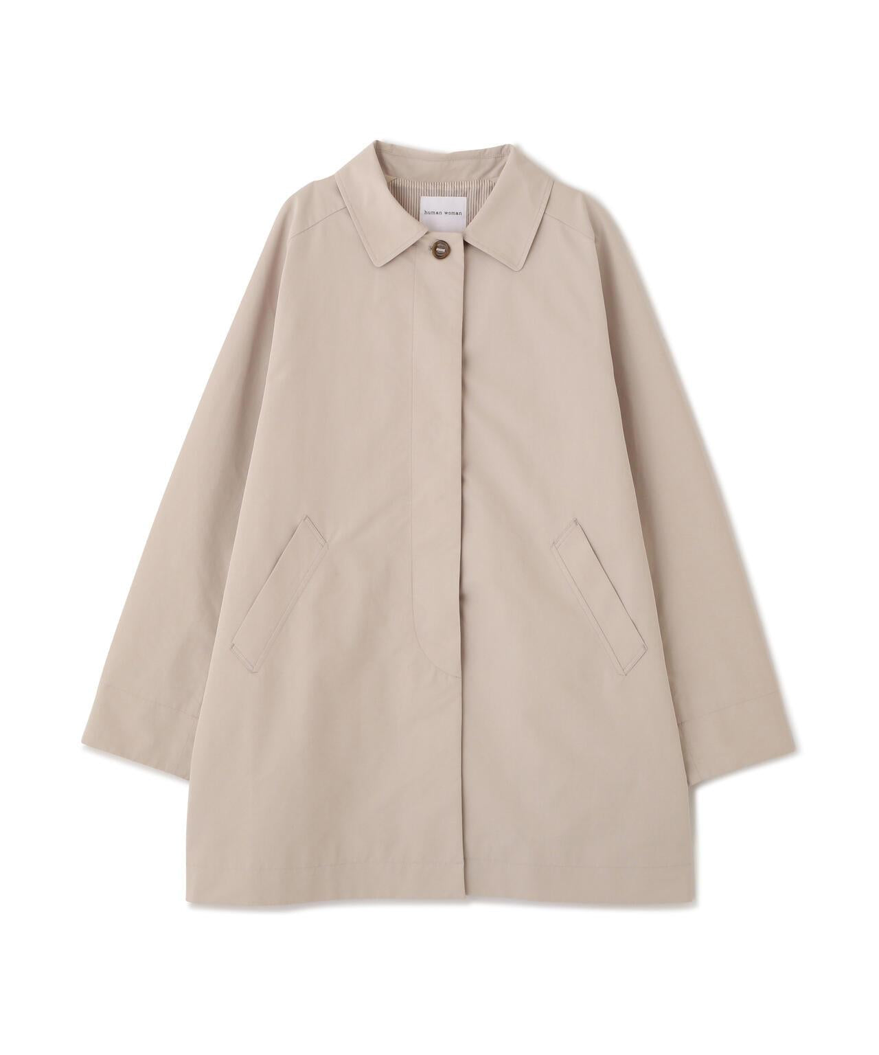多功能不鏽鋼領大衣,適合日常穿著 [設計要點] 這是一款簡潔的不鏽鋼領大衣,採用輕質材料製成,並配有襯裡。傘扣和背面的條紋圖案是設計要點。袖口沒有打開,但可以向後翻轉,翻轉幅度較深。這種具有弱防水功能的塔夫綢面料由回收的聚酯纖維和有機棉編織而成。它具有優雅而微妙的光澤。推薦座標] 這款春季百搭大衣的長度不會太長,因此可以搭配任何下身輪廓。