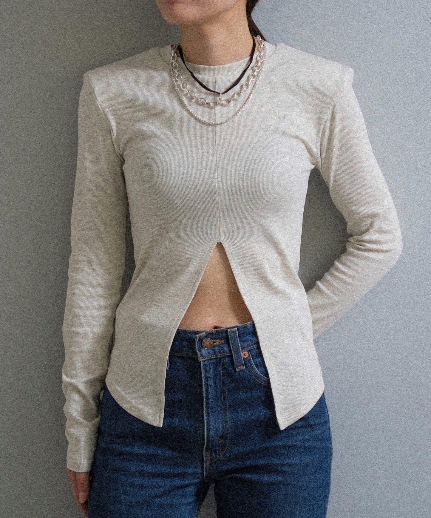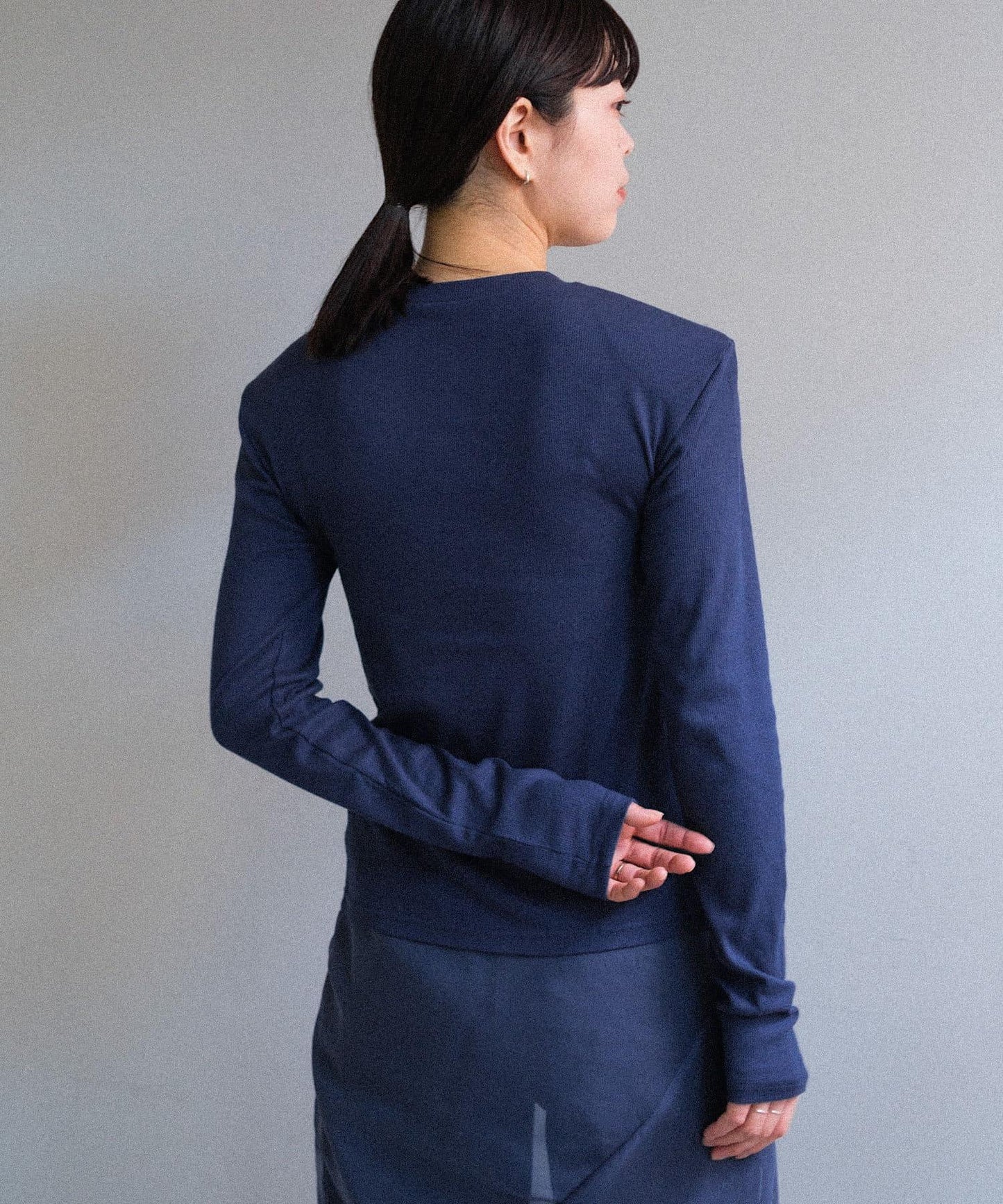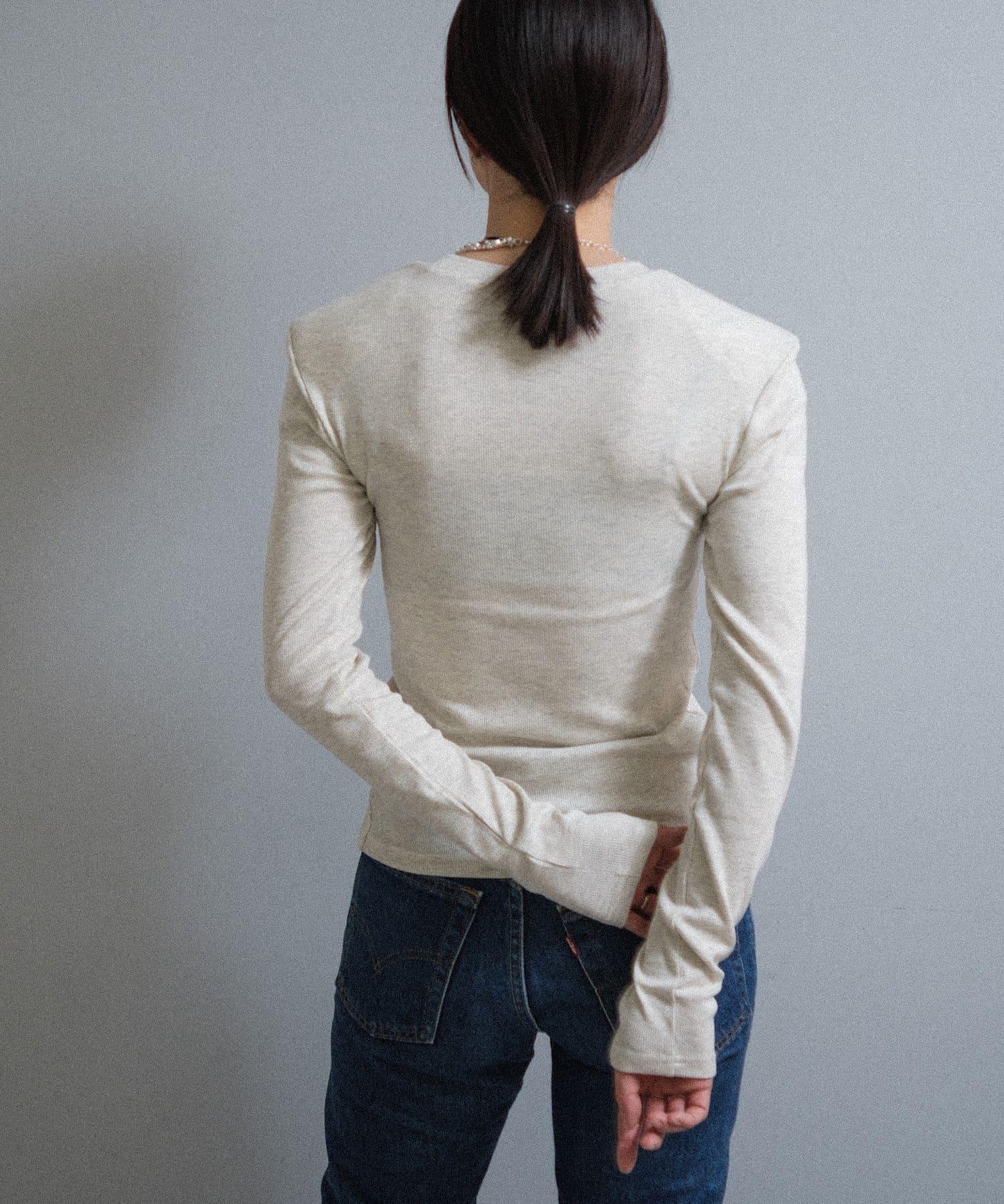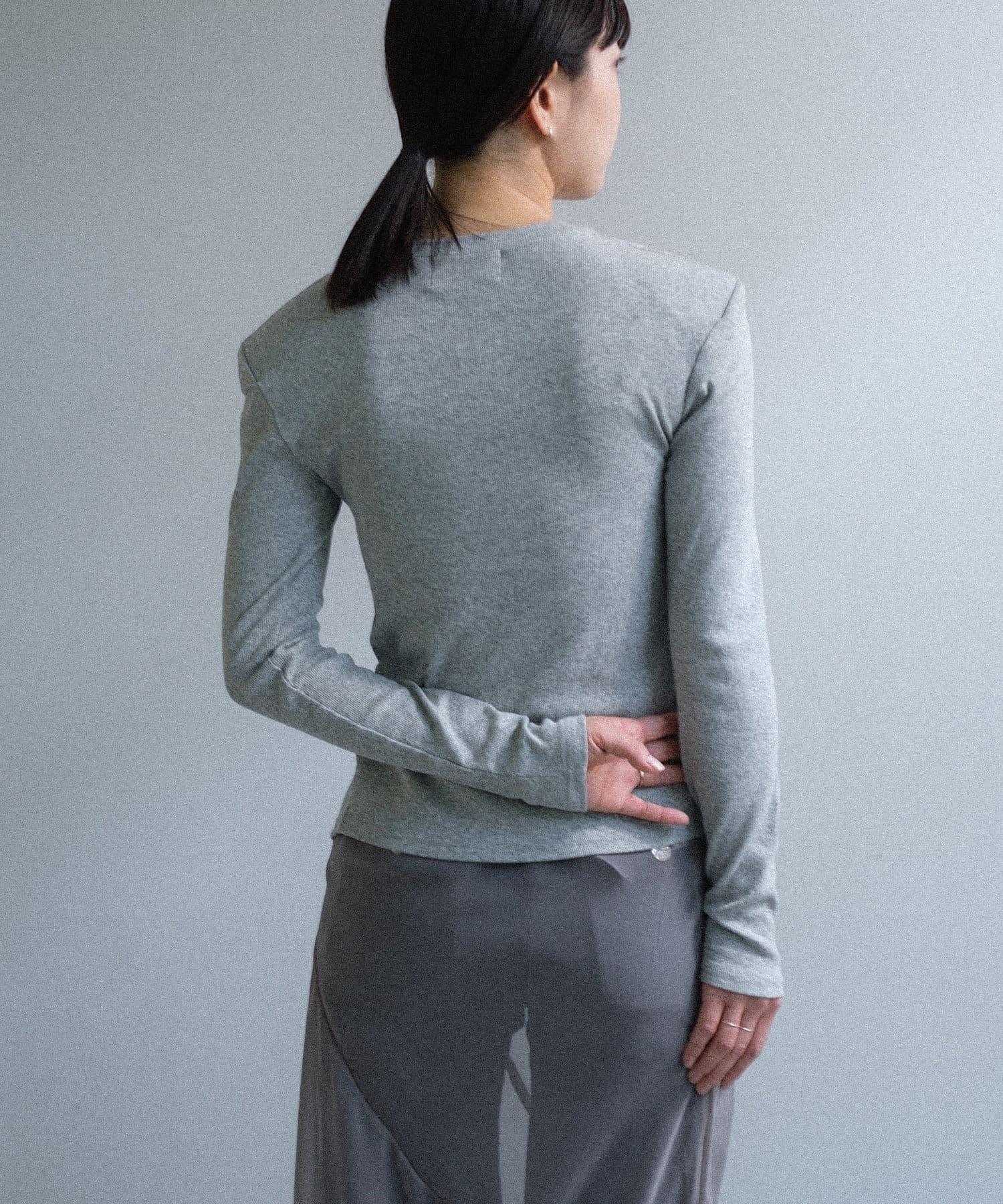 基本款羅紋上衣,內置墊肩。充滿情調的強力墊肩設計為本季呆板的款式注入了新的活力。