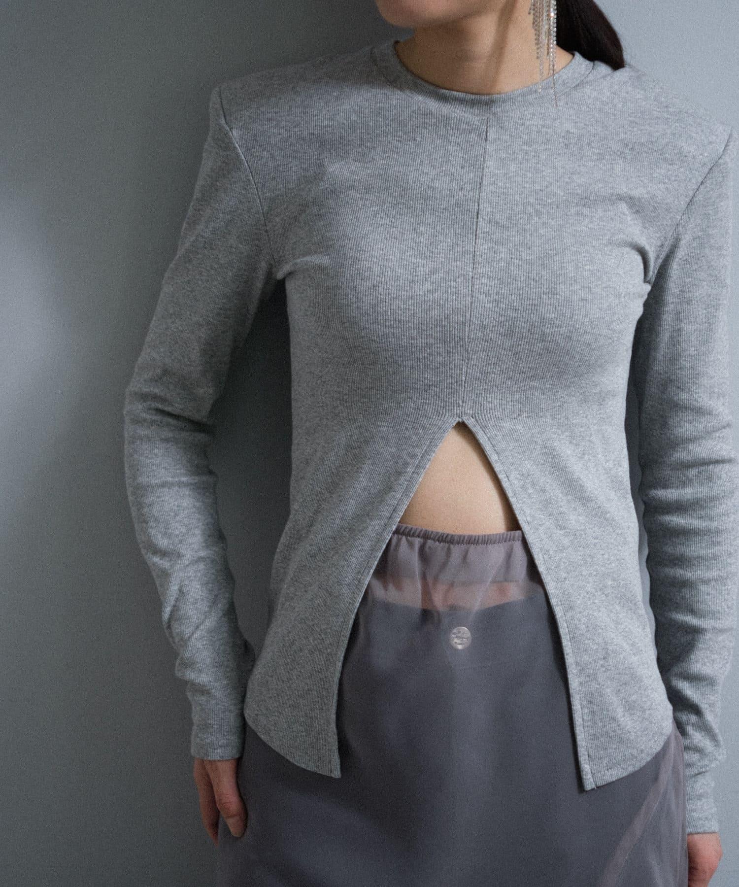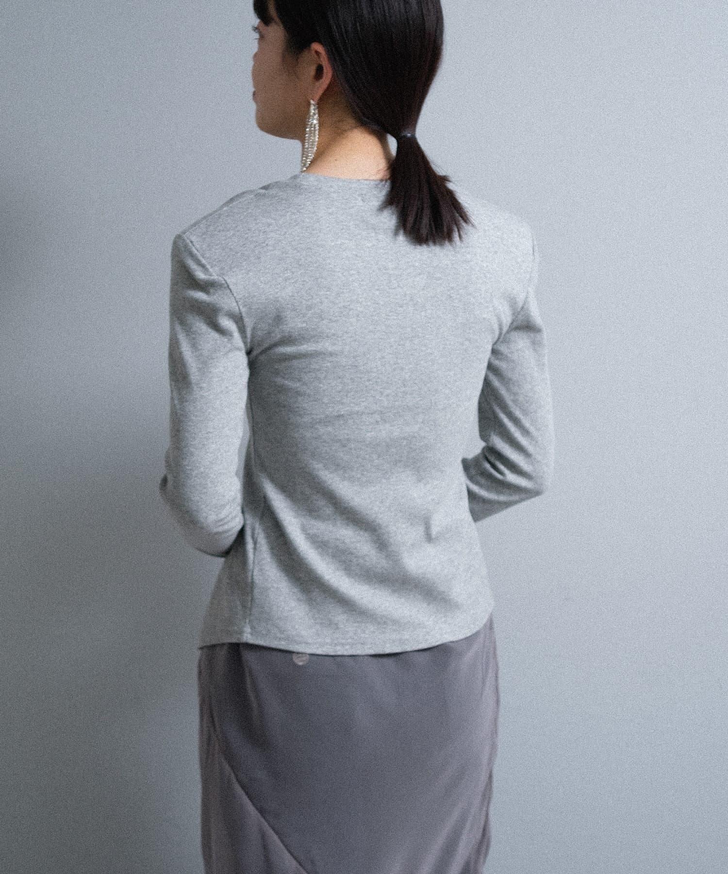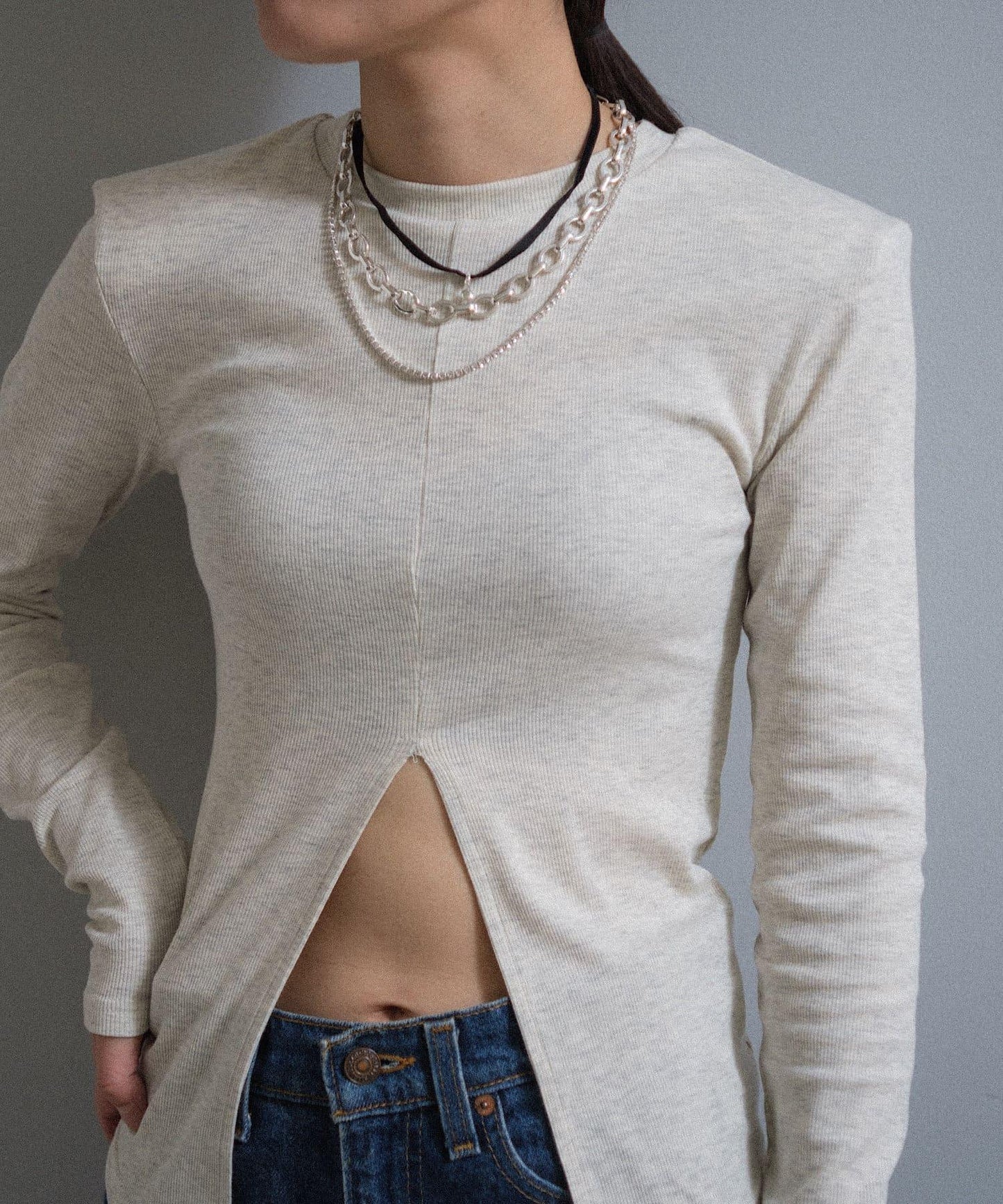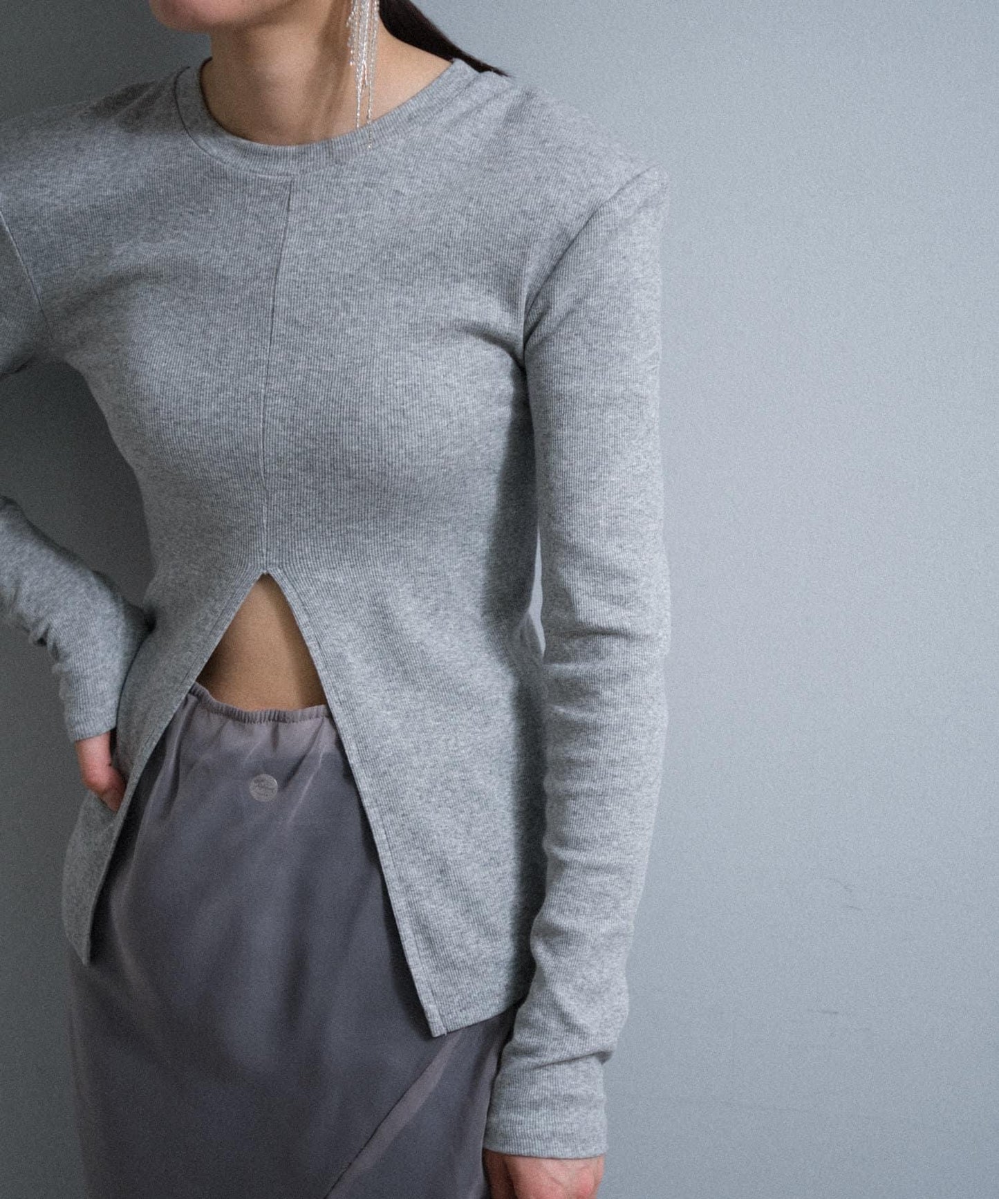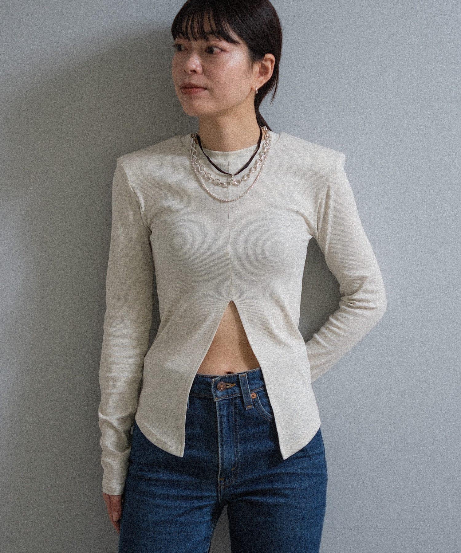 基本款羅紋上衣,內置墊肩。充滿情調的強力墊肩設計為本季呆板的款式注入了新的活力。