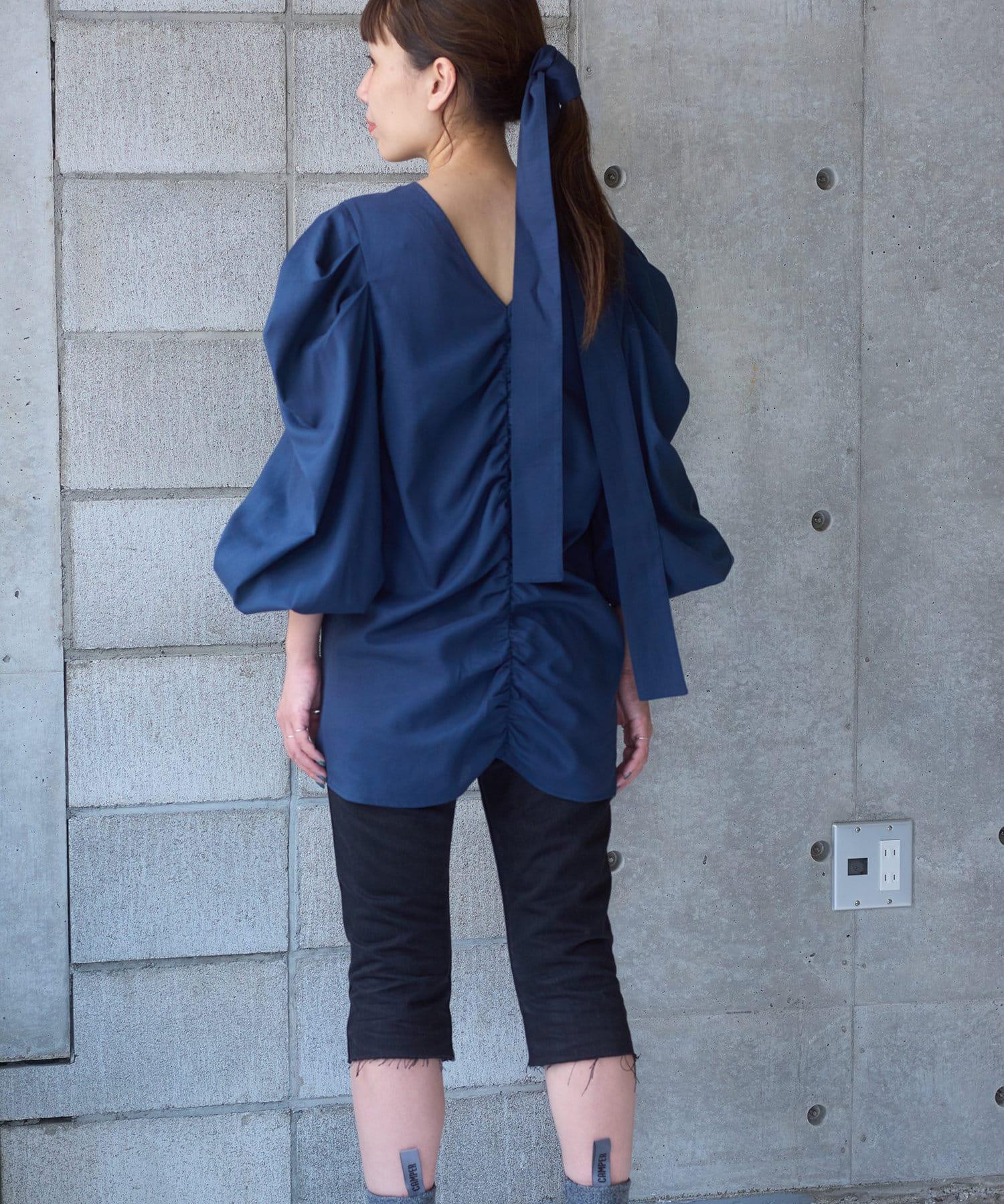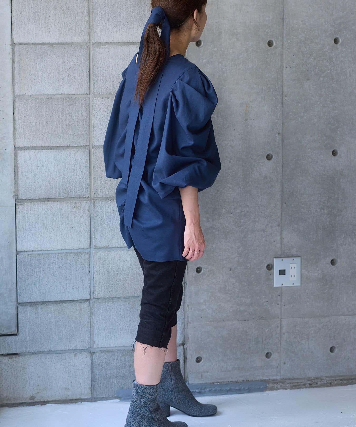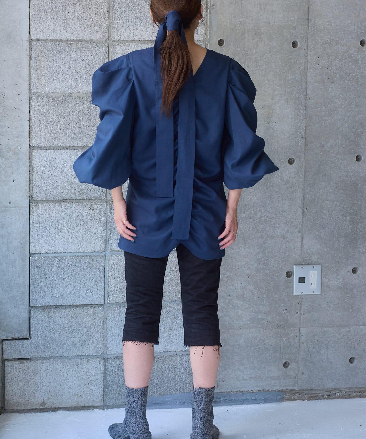 蝴蝶廓形上衣,袖子豐滿,肩部設計大膽有力,讓人心情愉悅。這款上衣兩面都可穿:圓領一面有紐扣開口,V 領一面中間有褶皺。