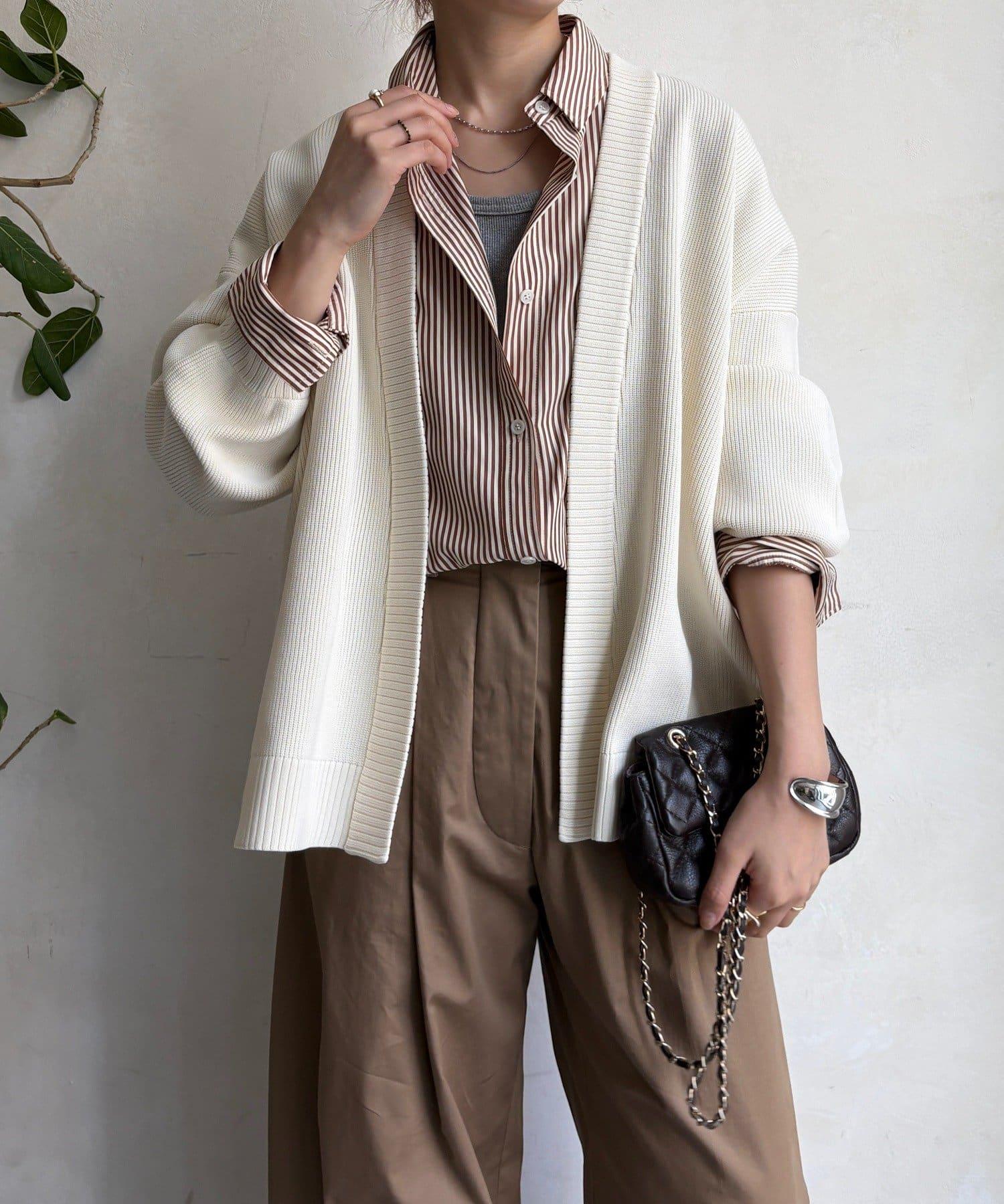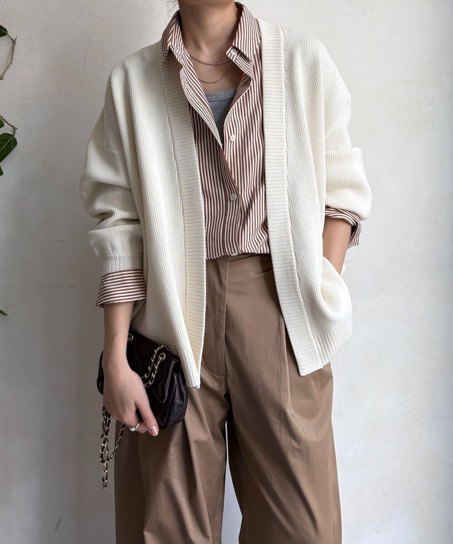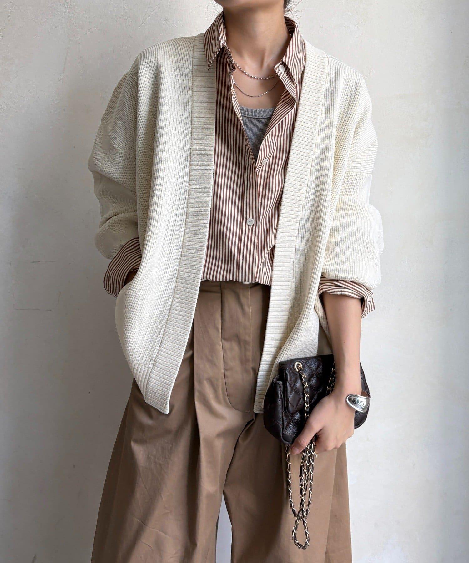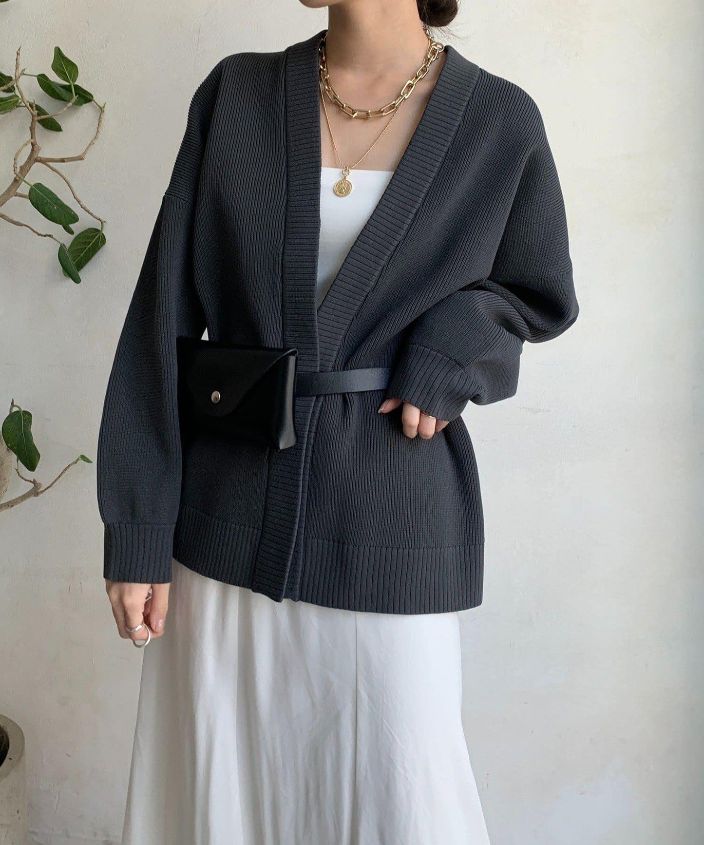 這款 "彈力紗單層羅紋開衫 "只需快速穿上,就能給人留下精緻的印象。