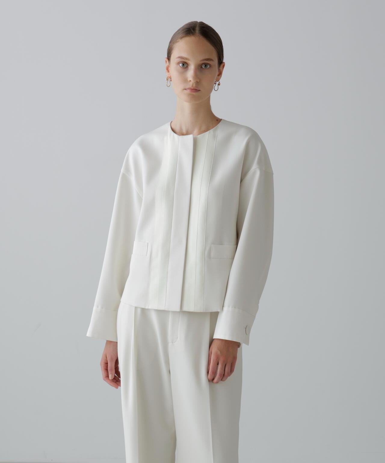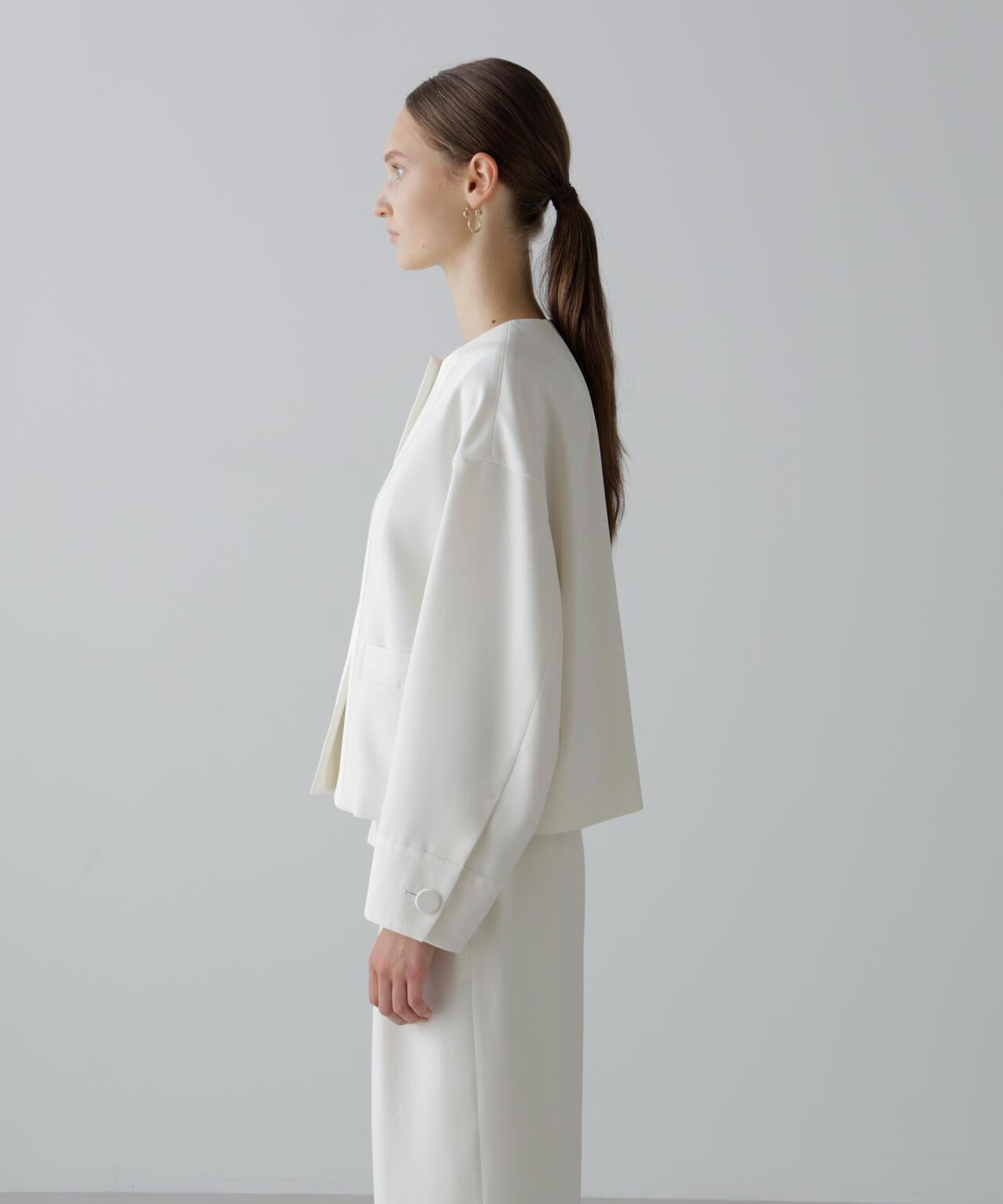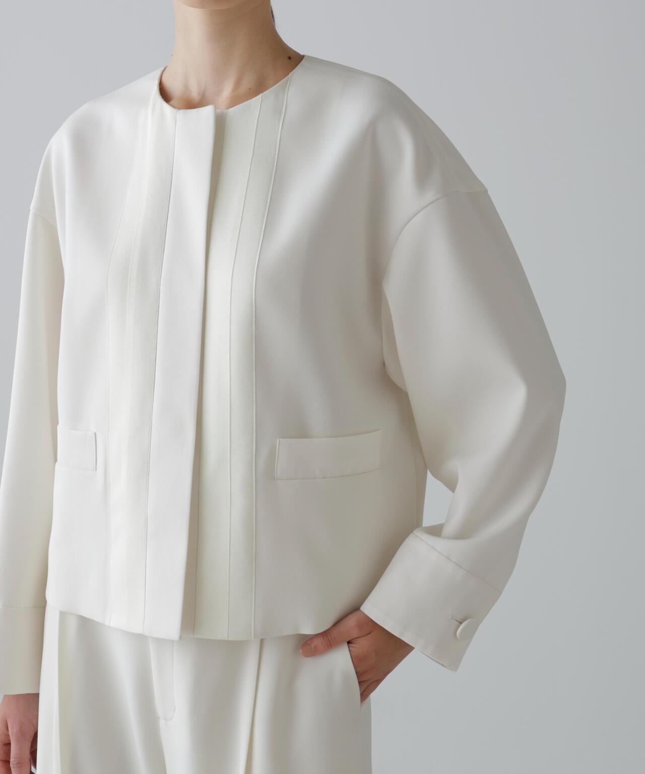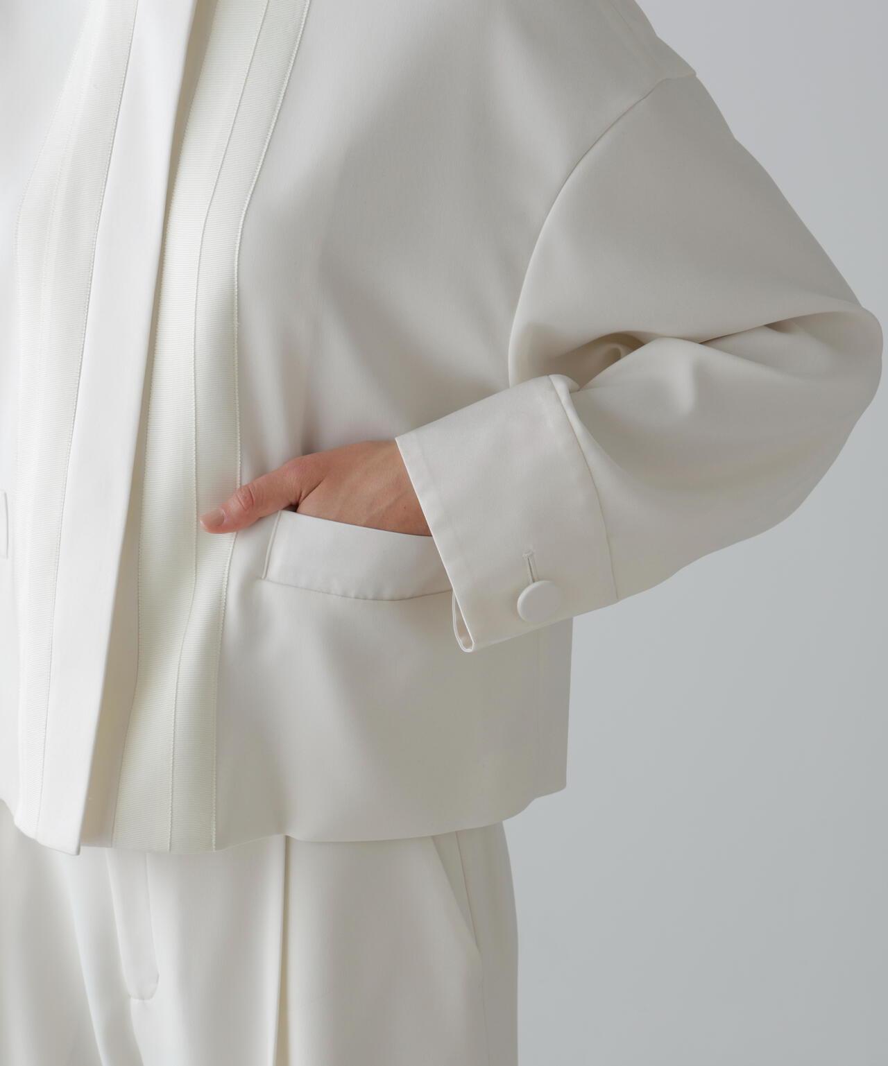 具有柔軟垂墜感的彈力喬其紗夾克這件夾克由具有垂墜感的彈力混紡合成纖維製成。夾克採用無領、方形剪裁,前部採用緞面或羅緞縫製。採用彈力多臂編織面料剪裁,具有高捻紗特有的輕盈觸感和柔軟度。