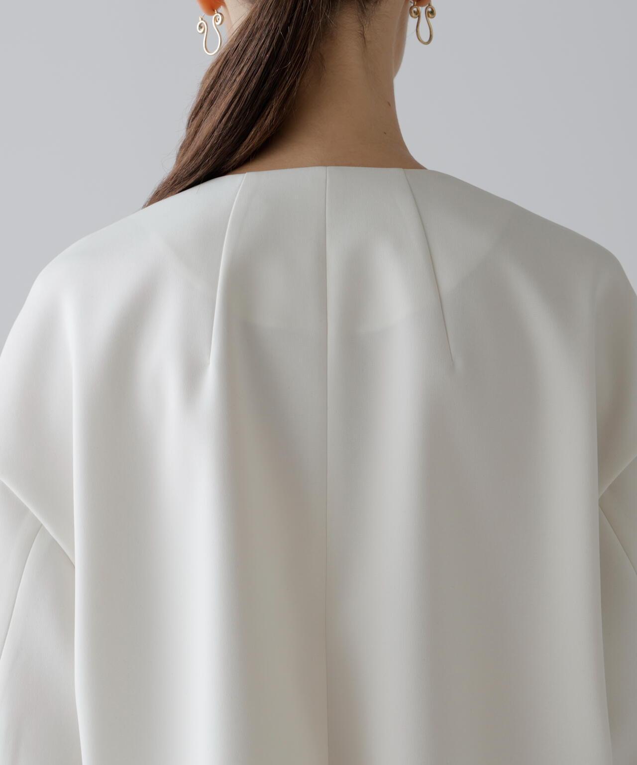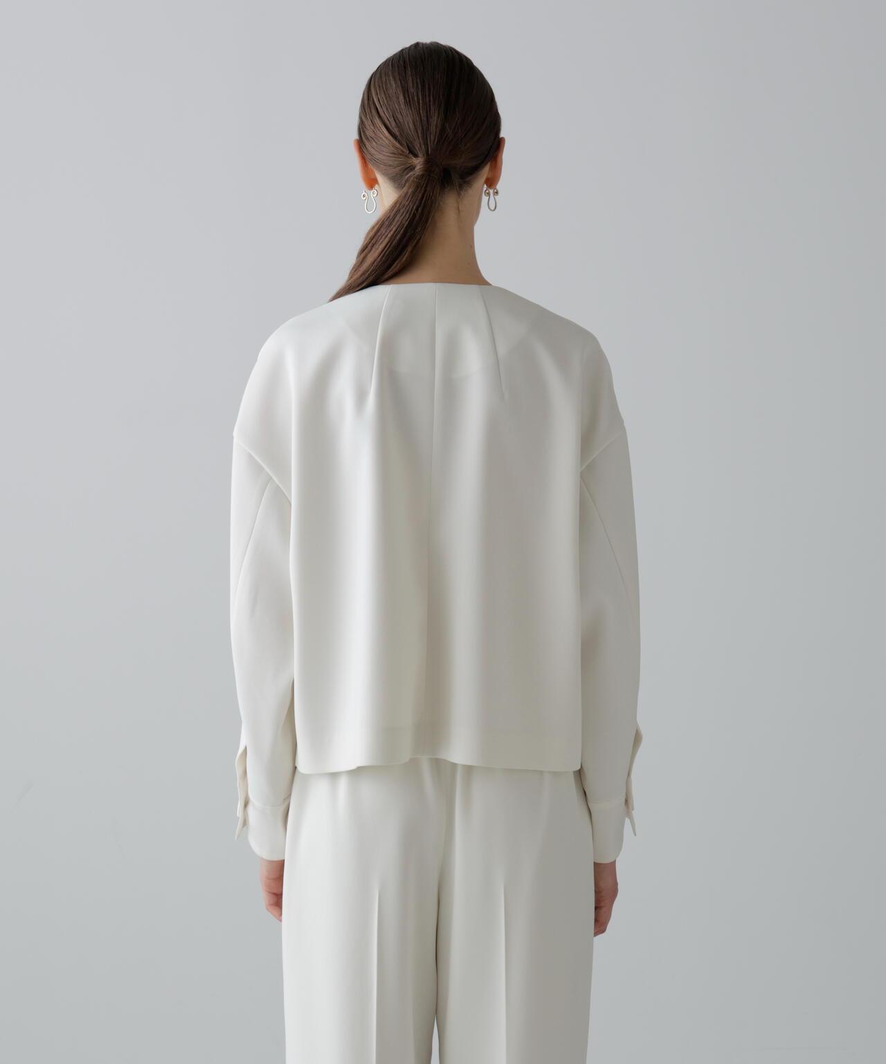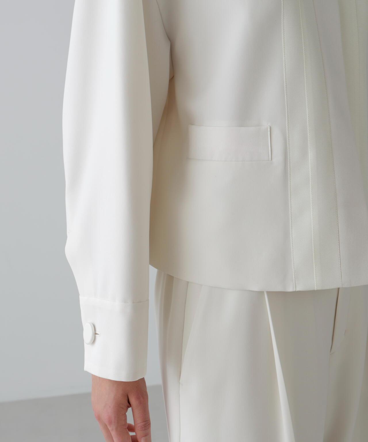 具有柔軟垂墜感的彈力喬其紗夾克這件夾克由具有垂墜感的彈力混紡合成纖維製成。夾克採用無領、方形剪裁,前部採用緞面或羅緞縫製。採用彈力多臂編織面料剪裁,具有高捻紗特有的輕盈觸感和柔軟度。