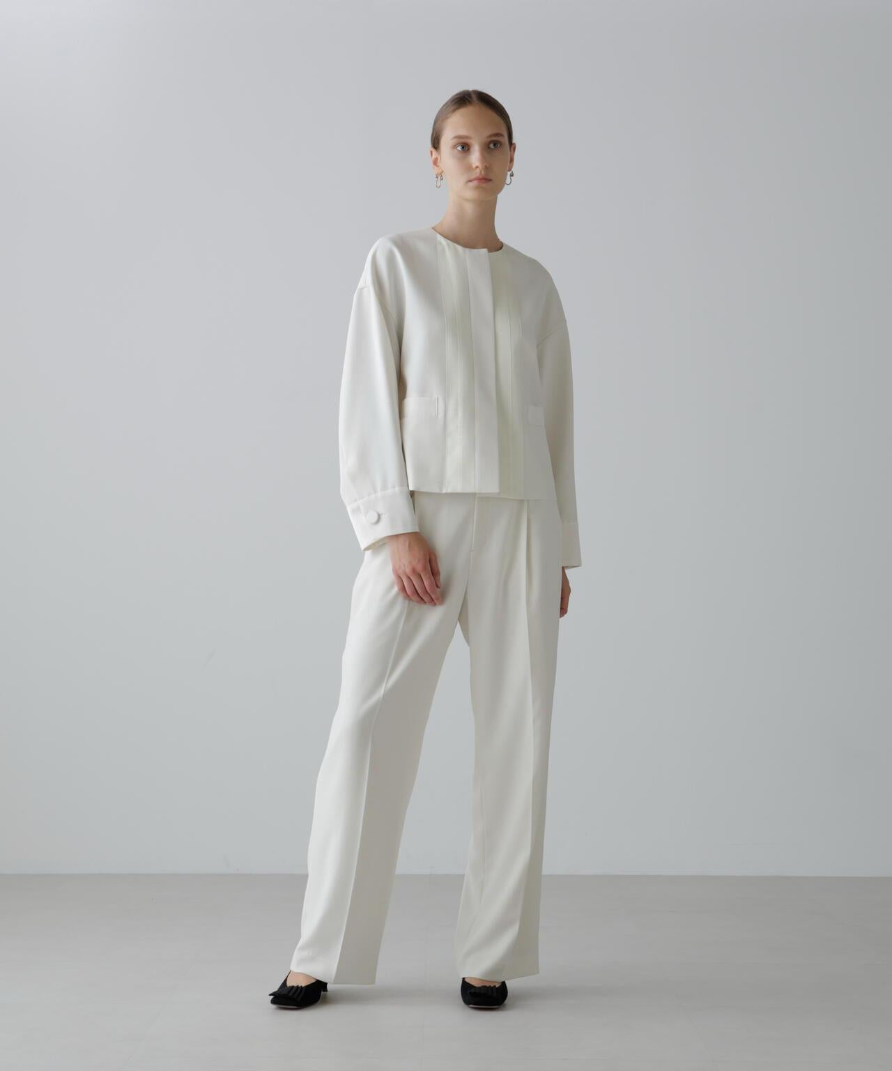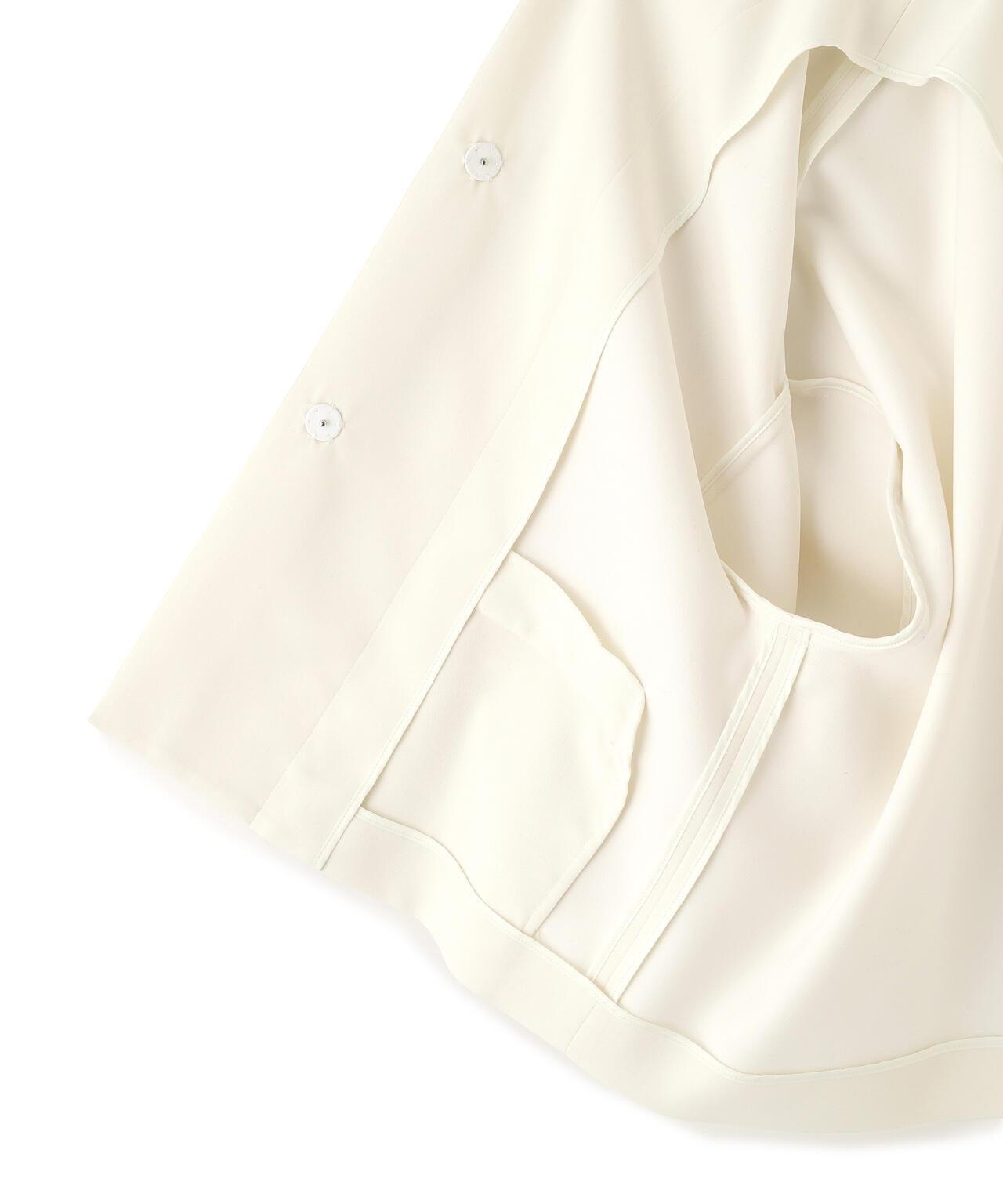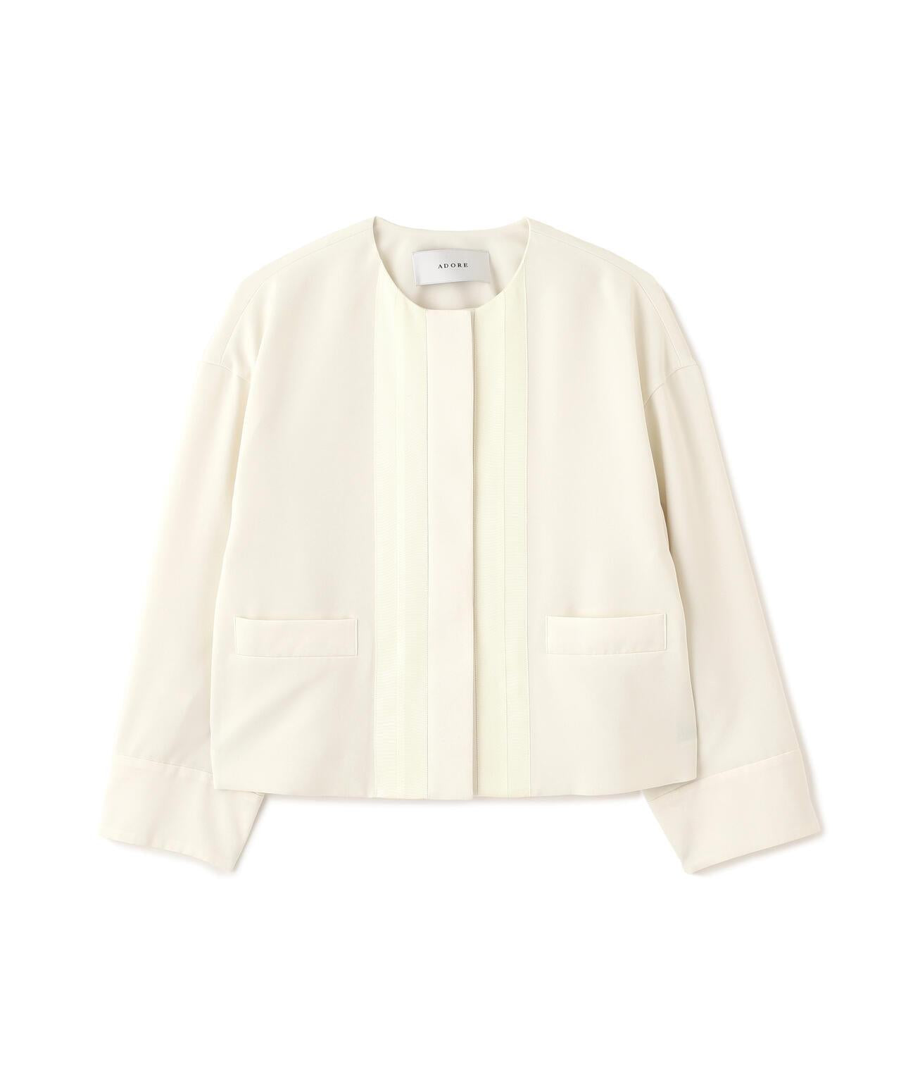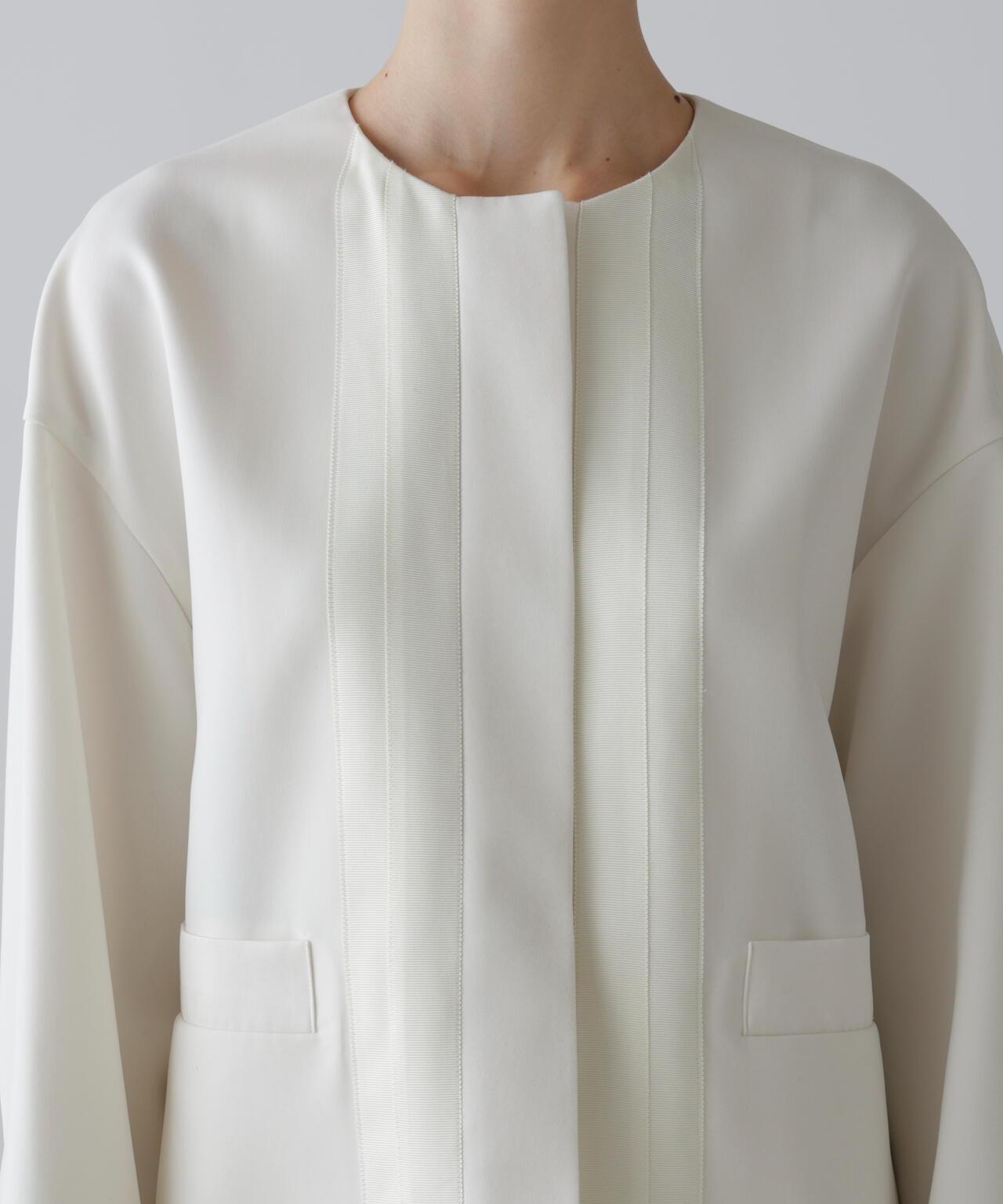 具有柔軟垂墜感的彈力喬其紗夾克這件夾克由具有垂墜感的彈力混紡合成纖維製成。夾克採用無領、方形剪裁,前部採用緞面或羅緞縫製。採用彈力多臂編織面料剪裁,具有高捻紗特有的輕盈觸感和柔軟度。