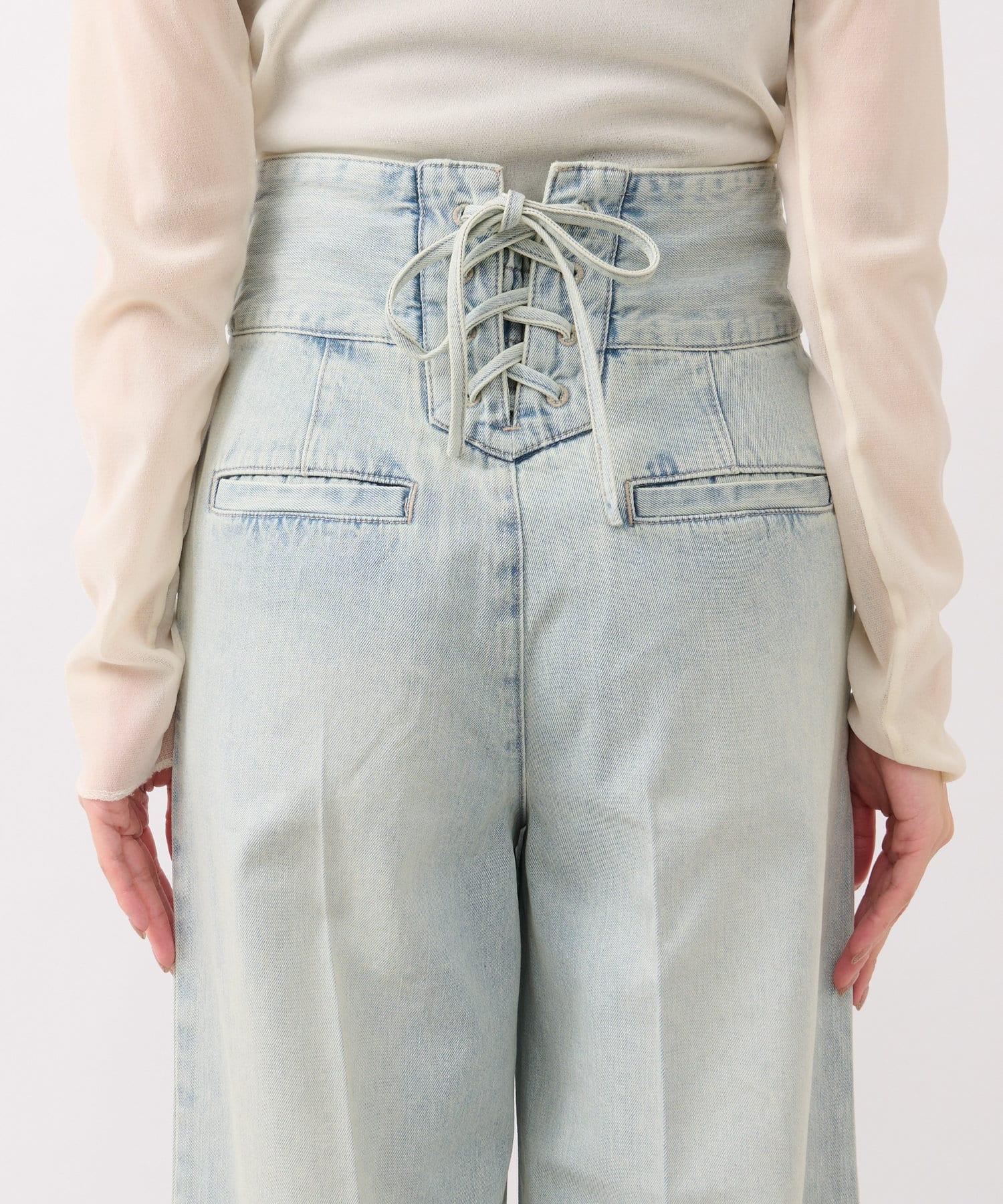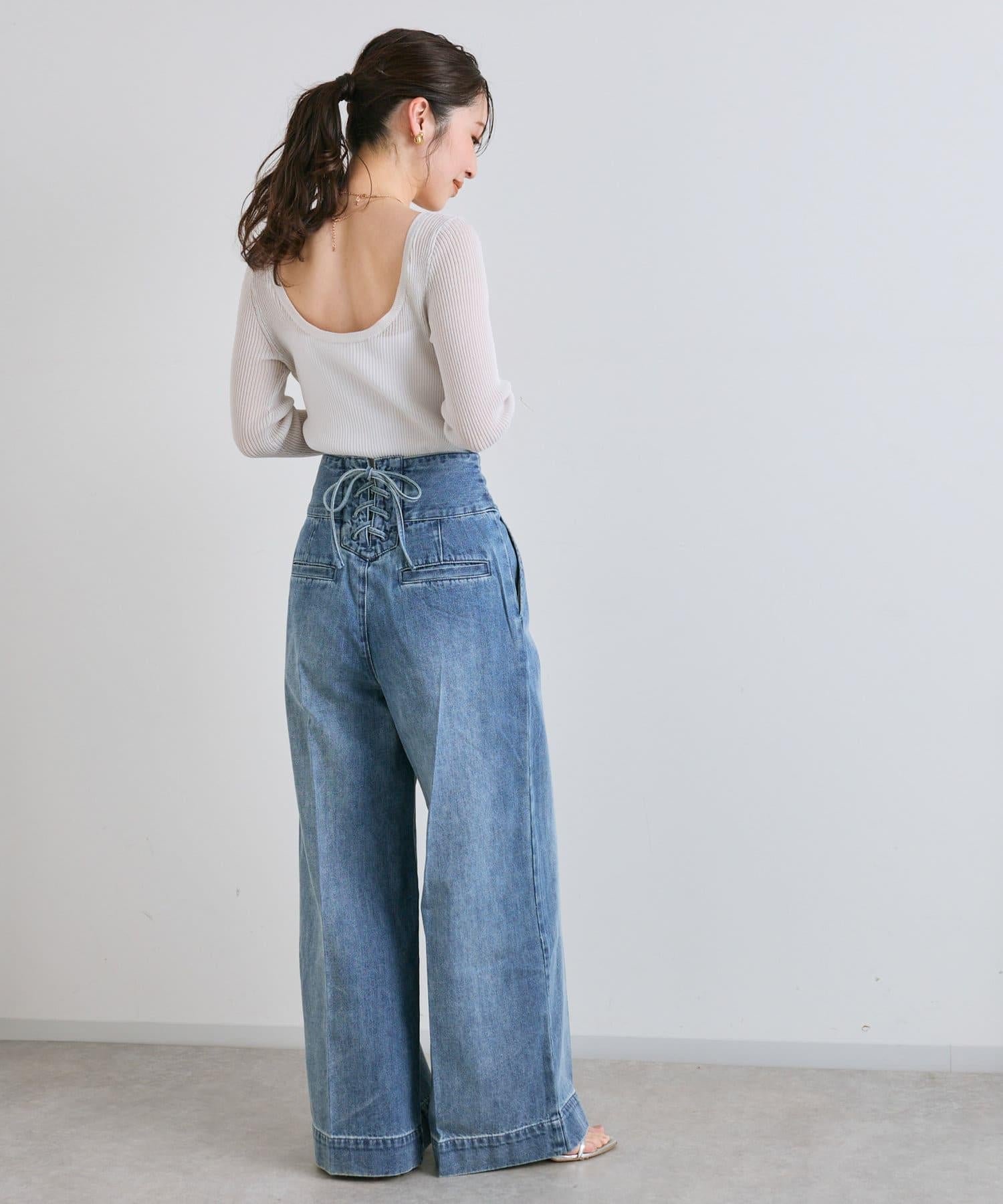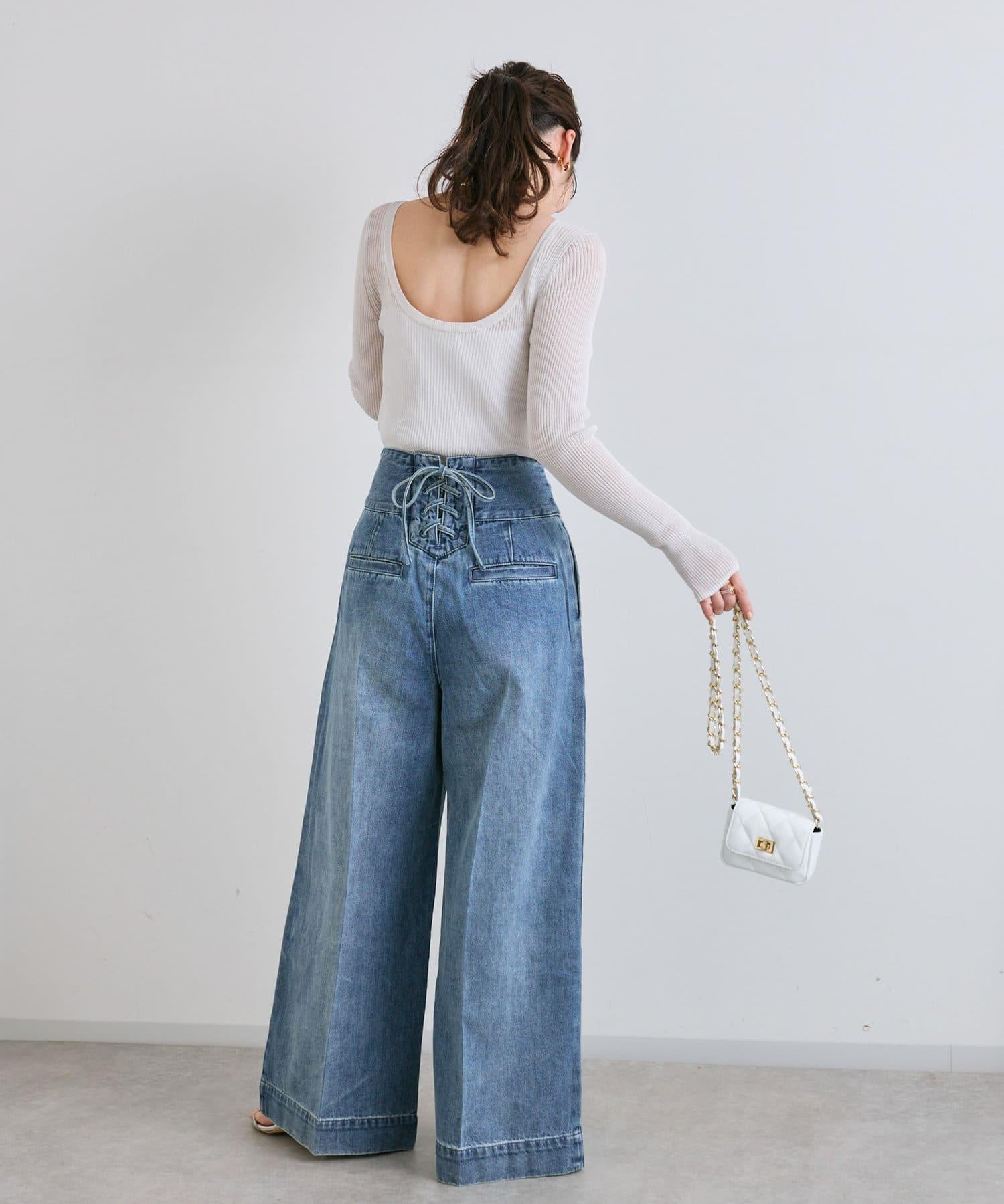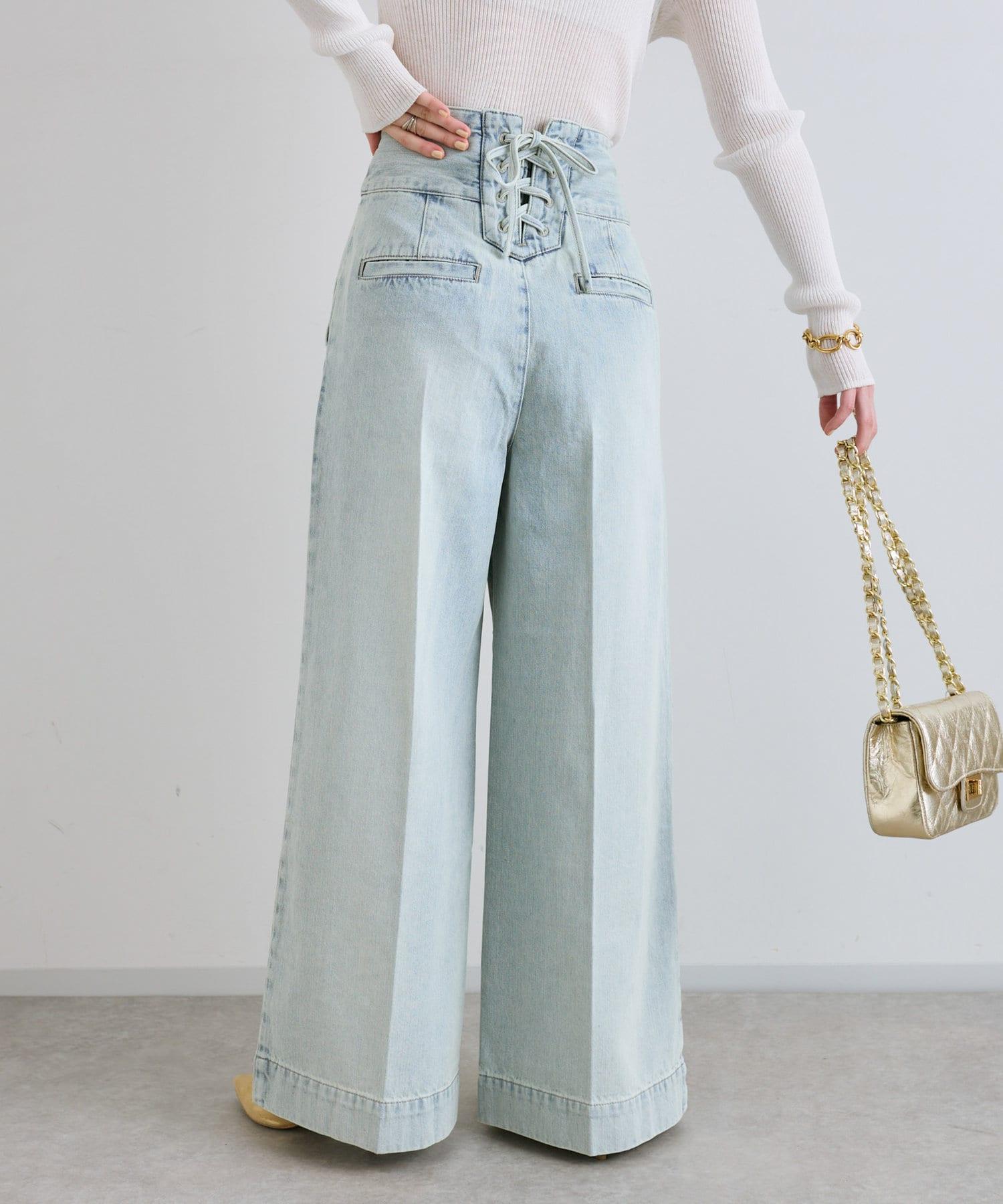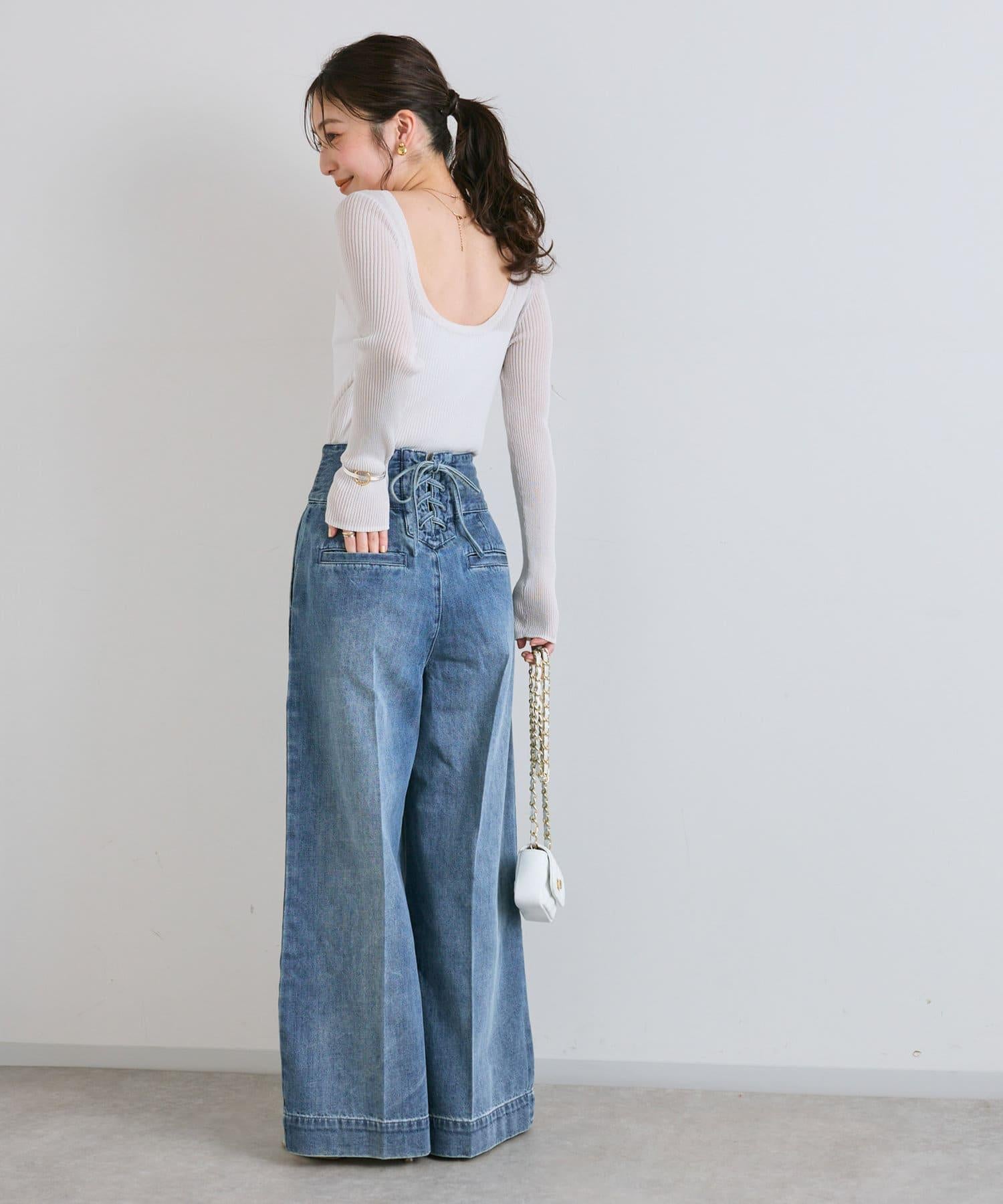 這條寬鬆的牛仔長褲背部飾有蕾絲花邊。