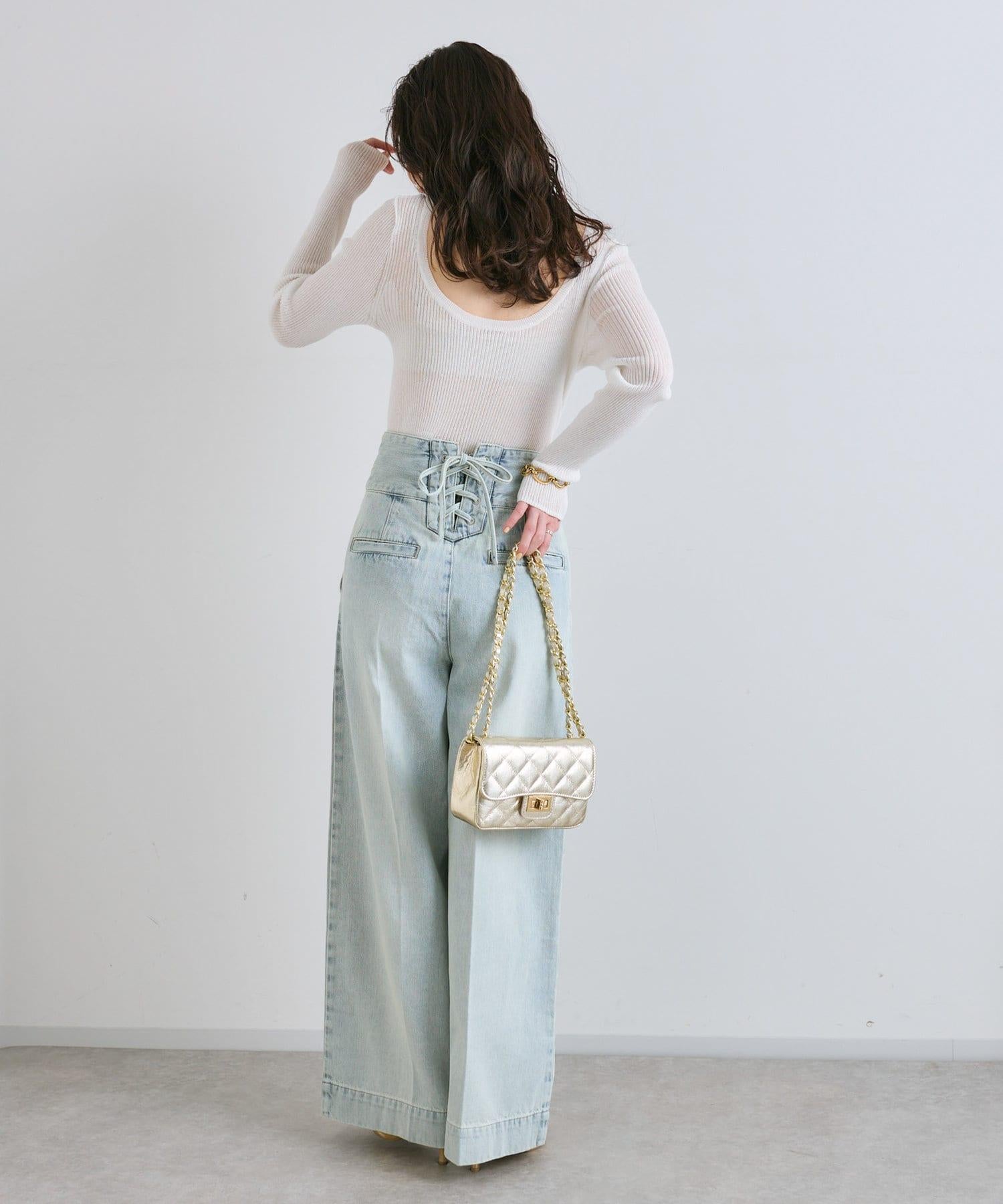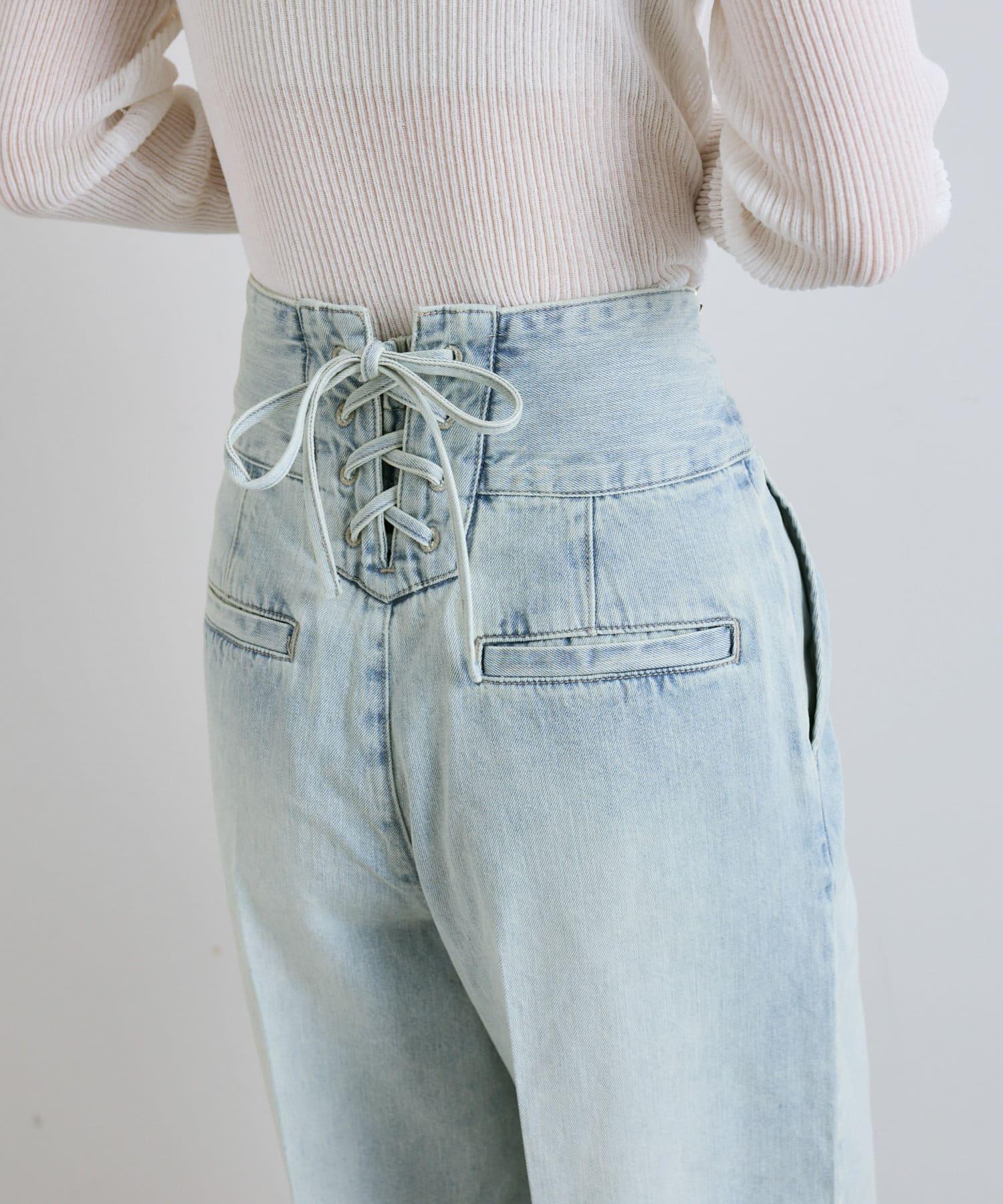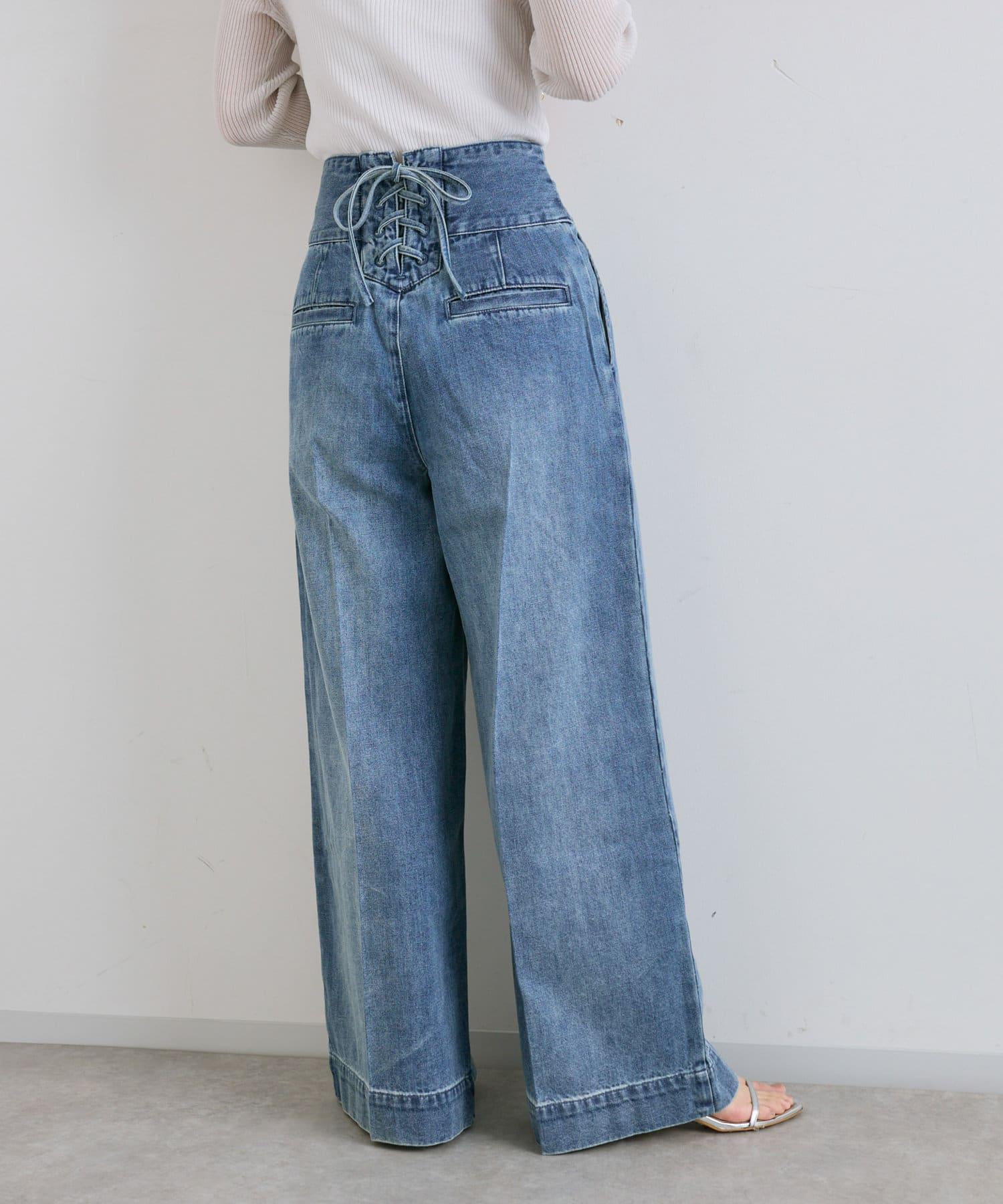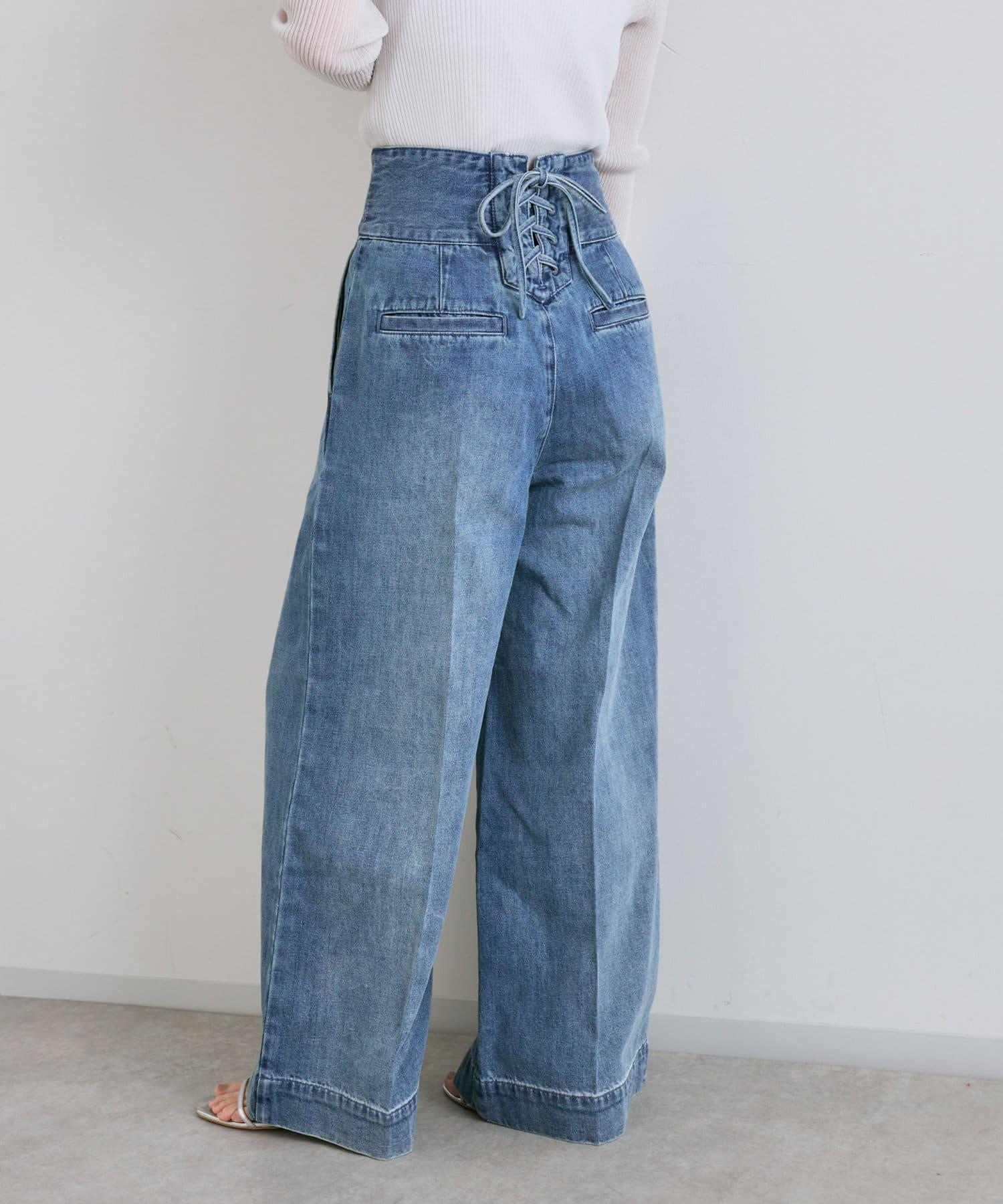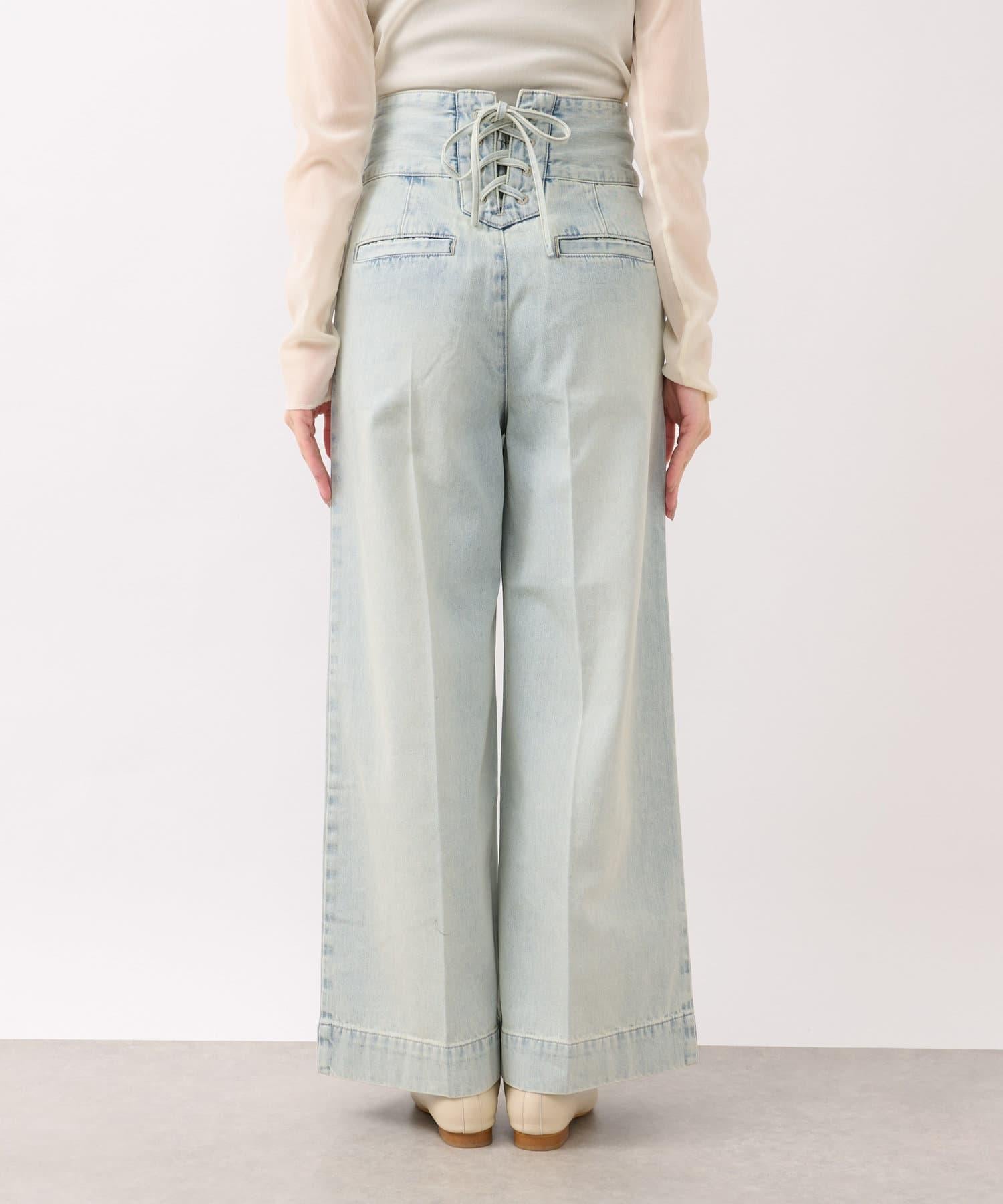 這條寬鬆的牛仔長褲背部飾有蕾絲花邊。