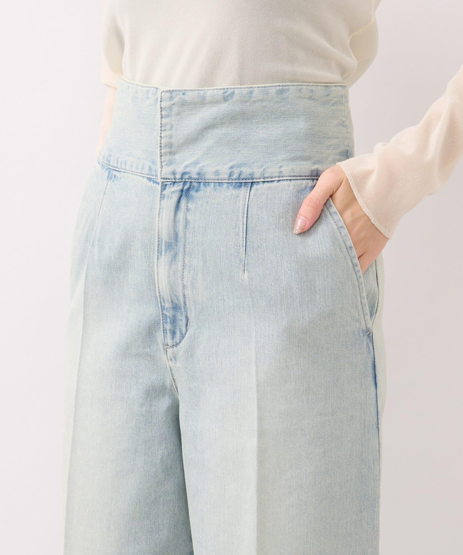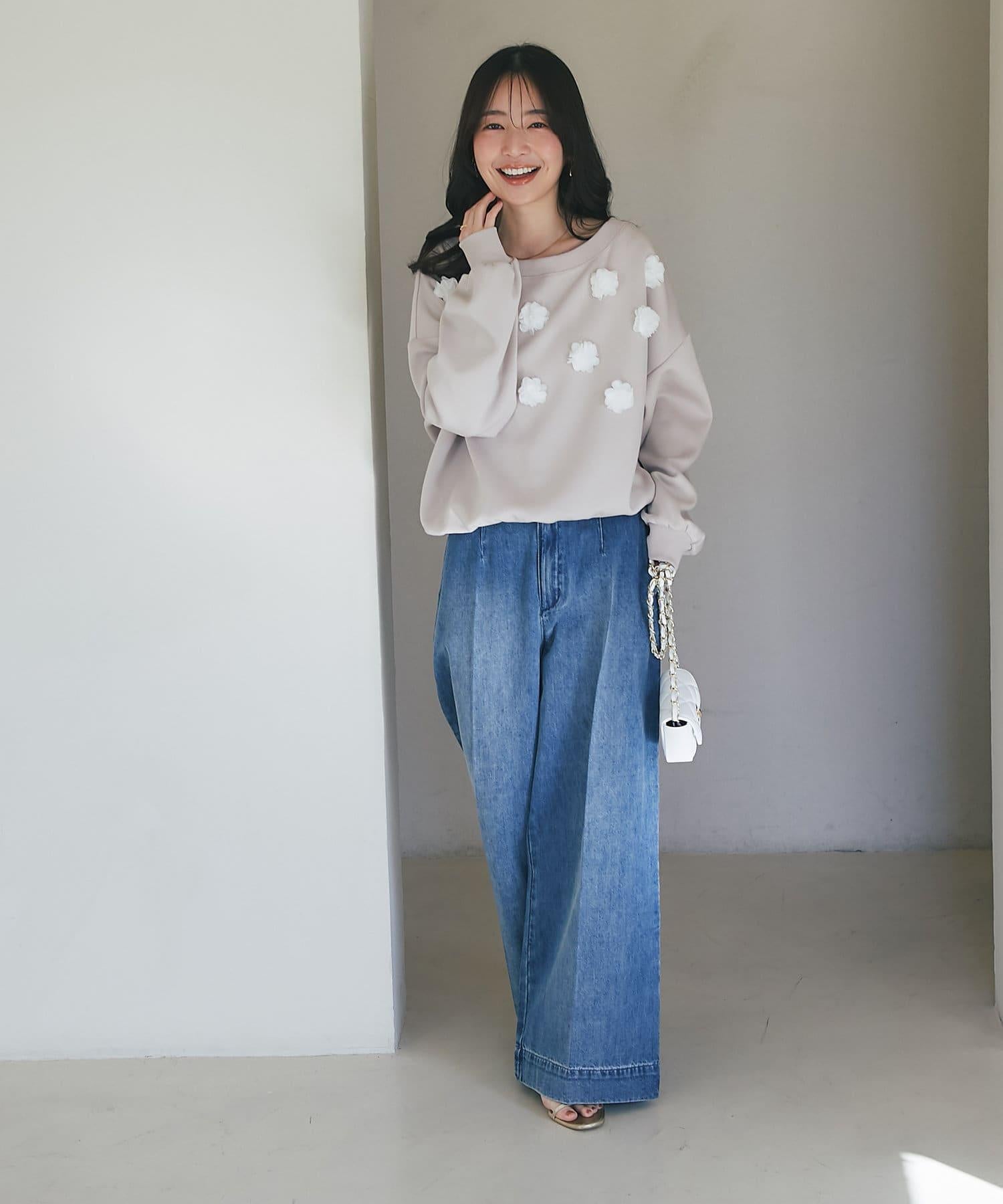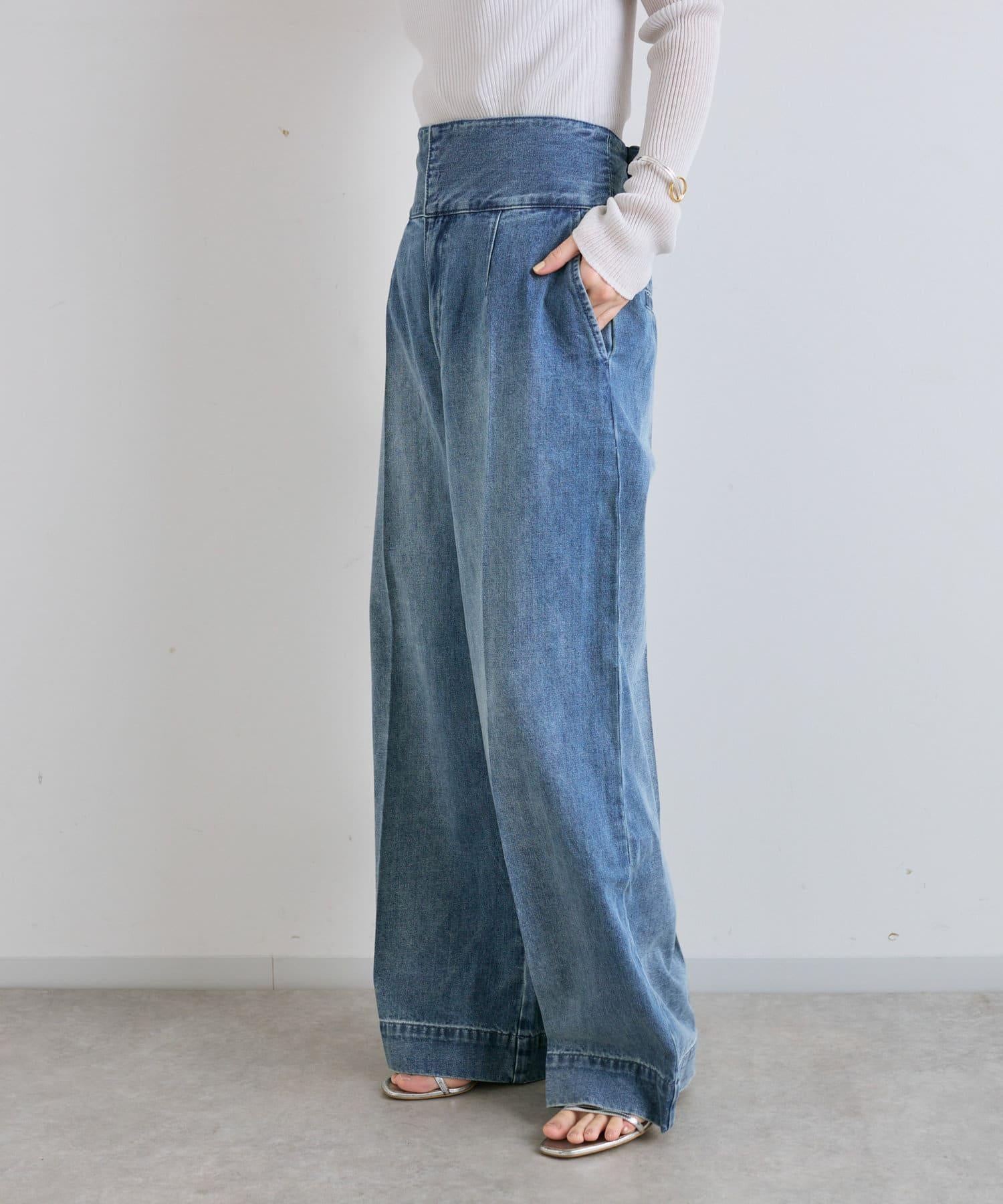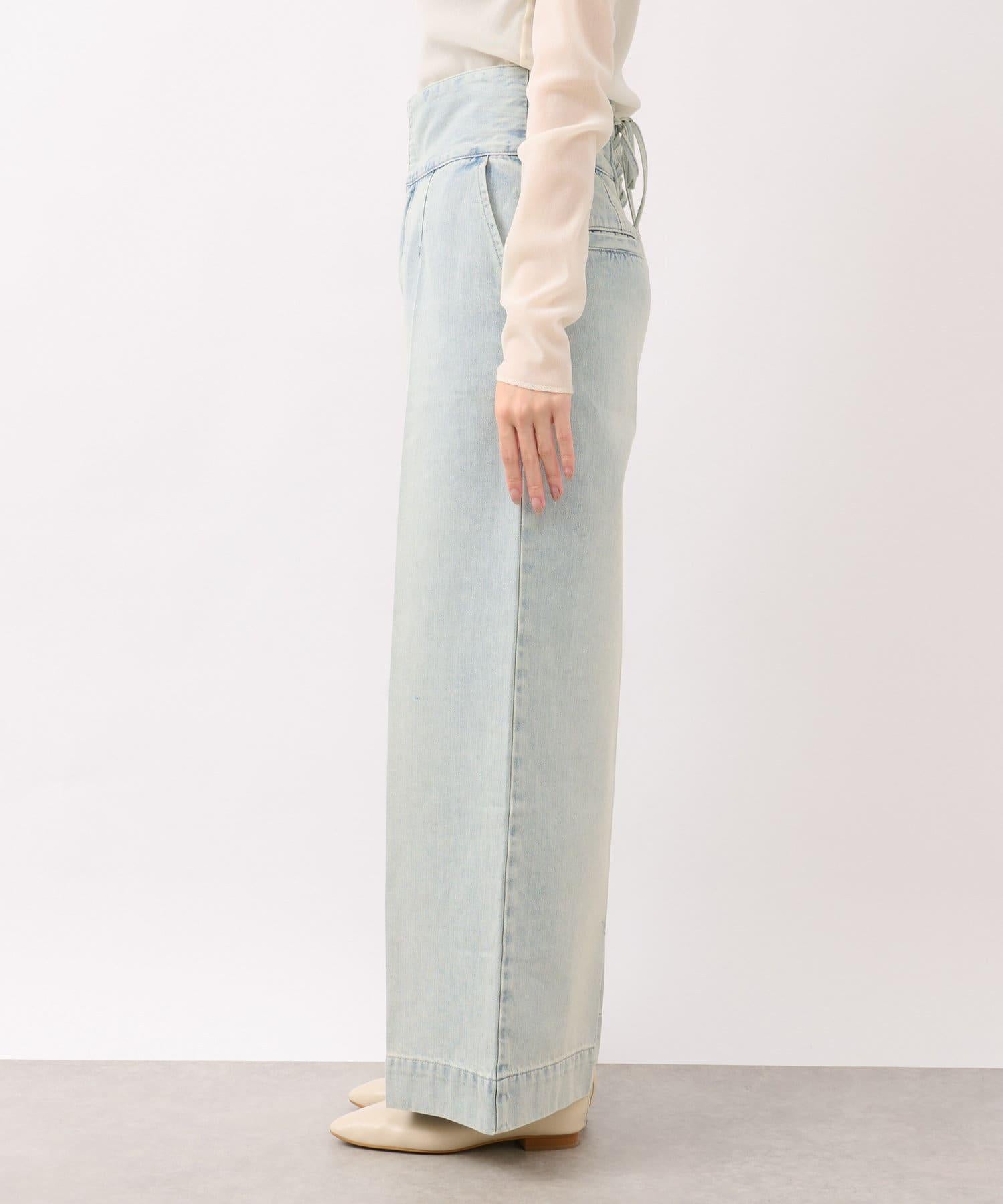 這條寬鬆的牛仔長褲背部飾有蕾絲花邊。
