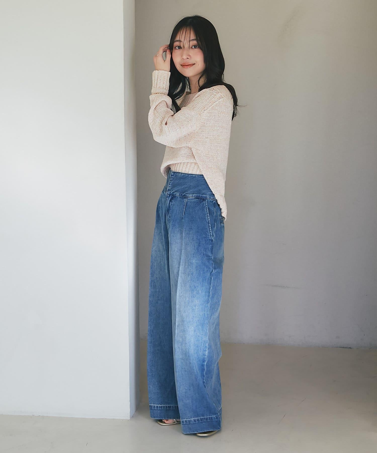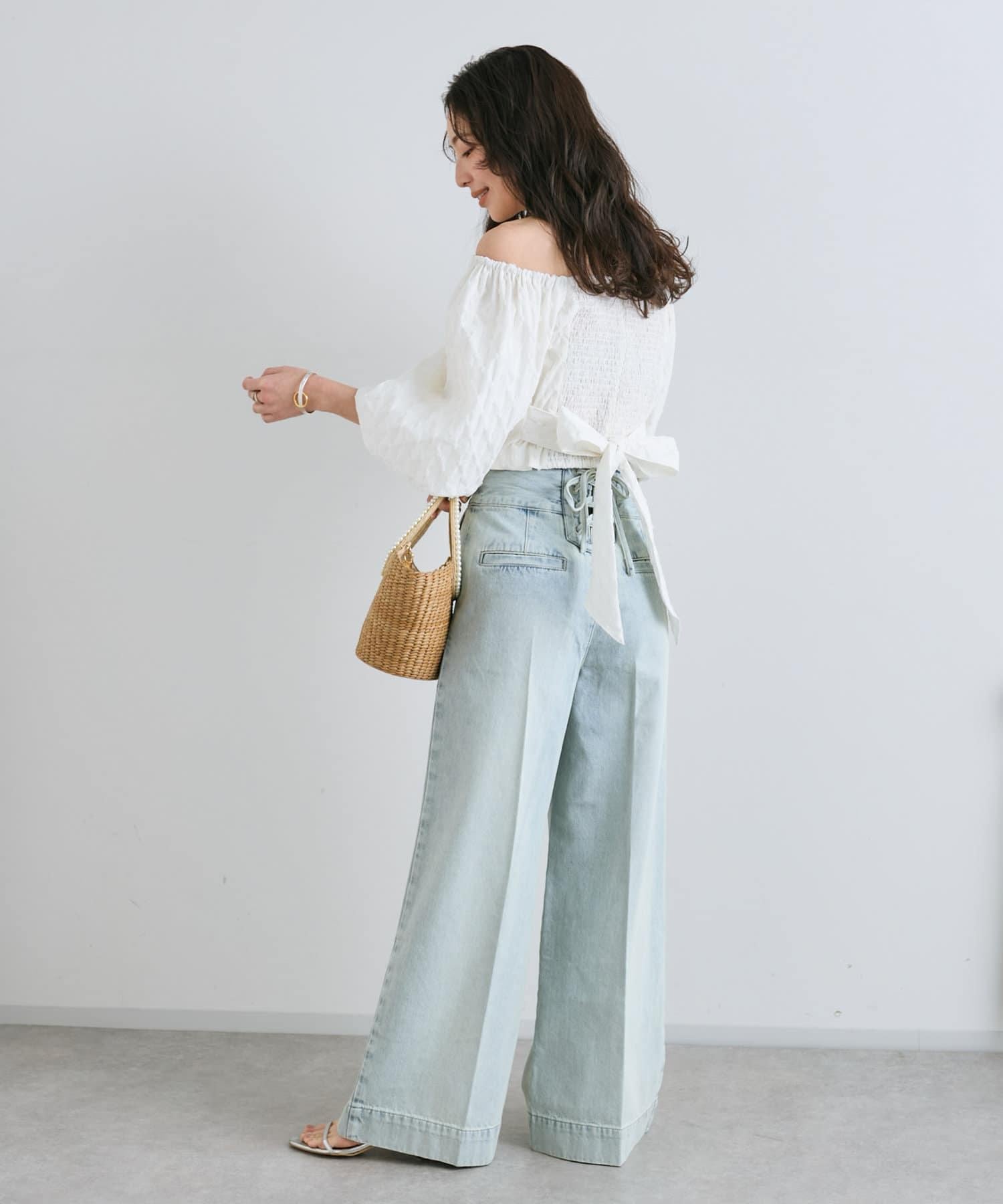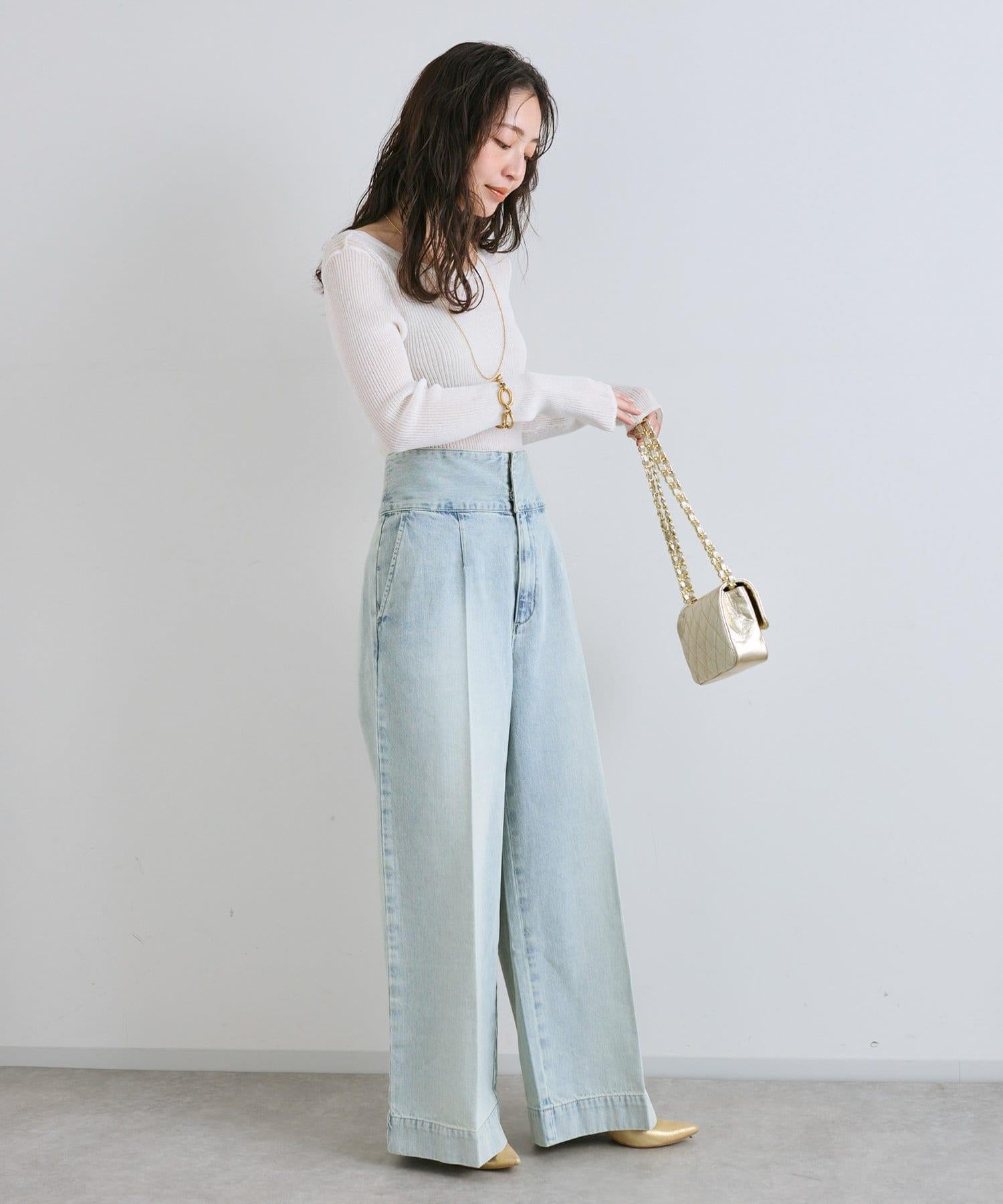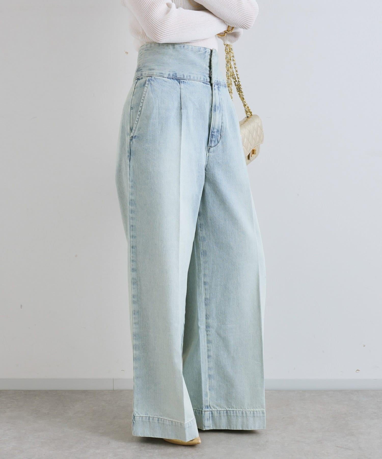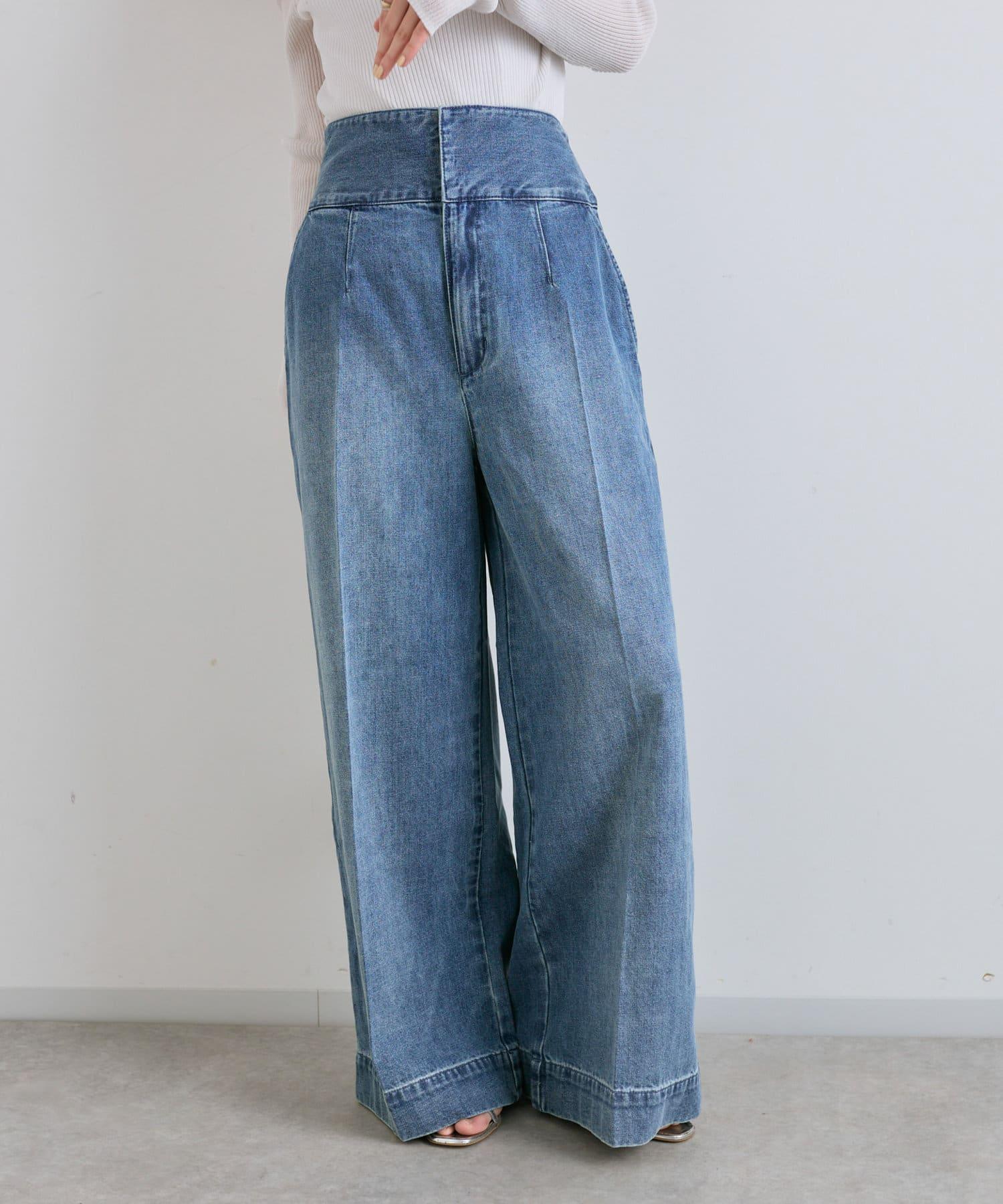 這條寬鬆的牛仔長褲背部飾有蕾絲花邊。