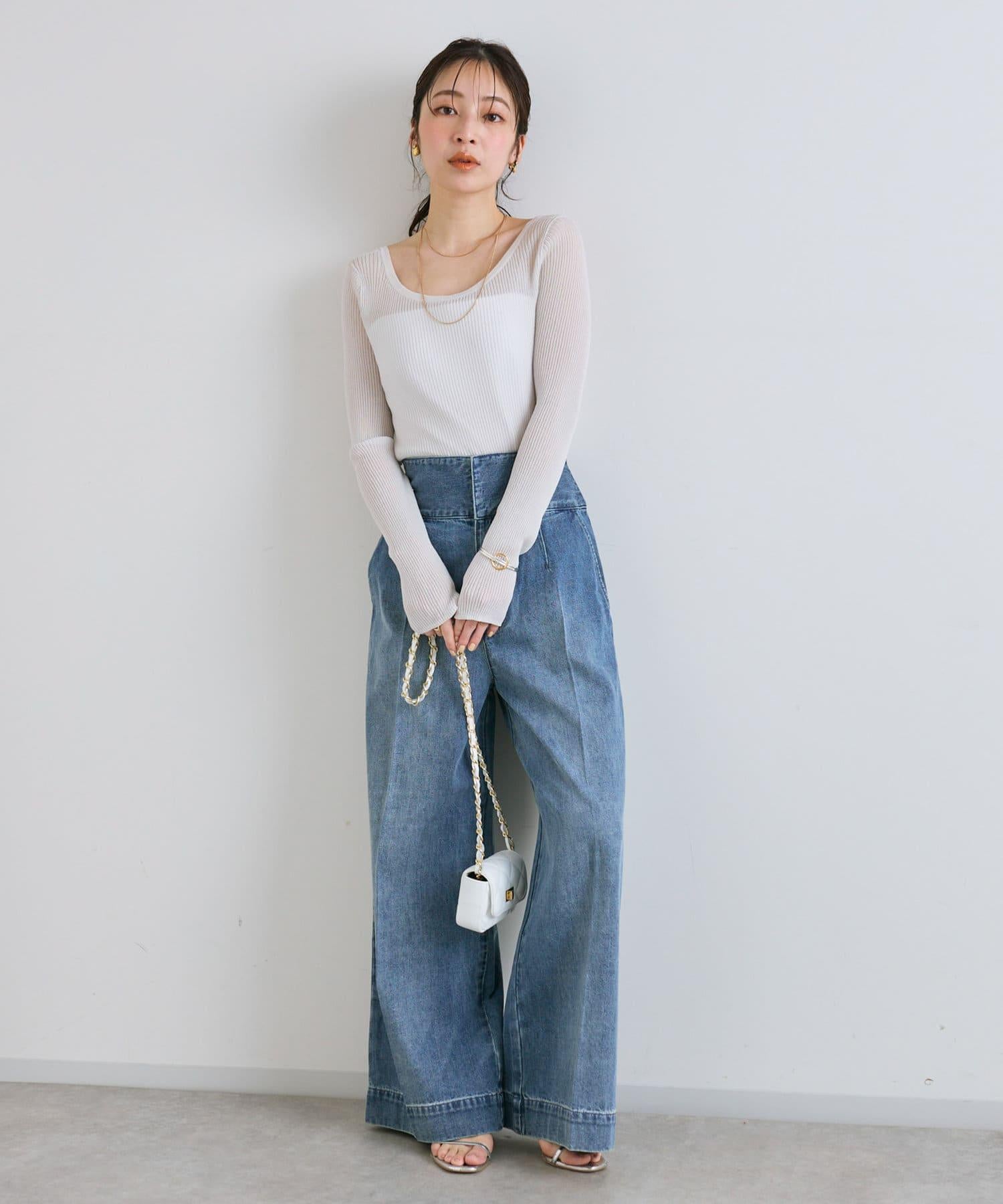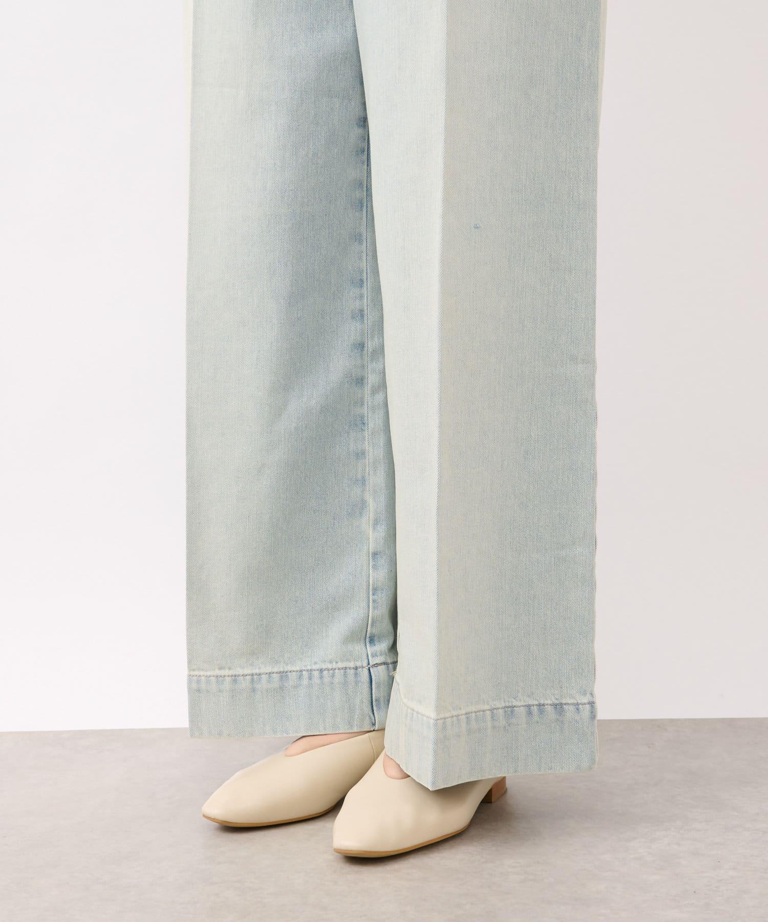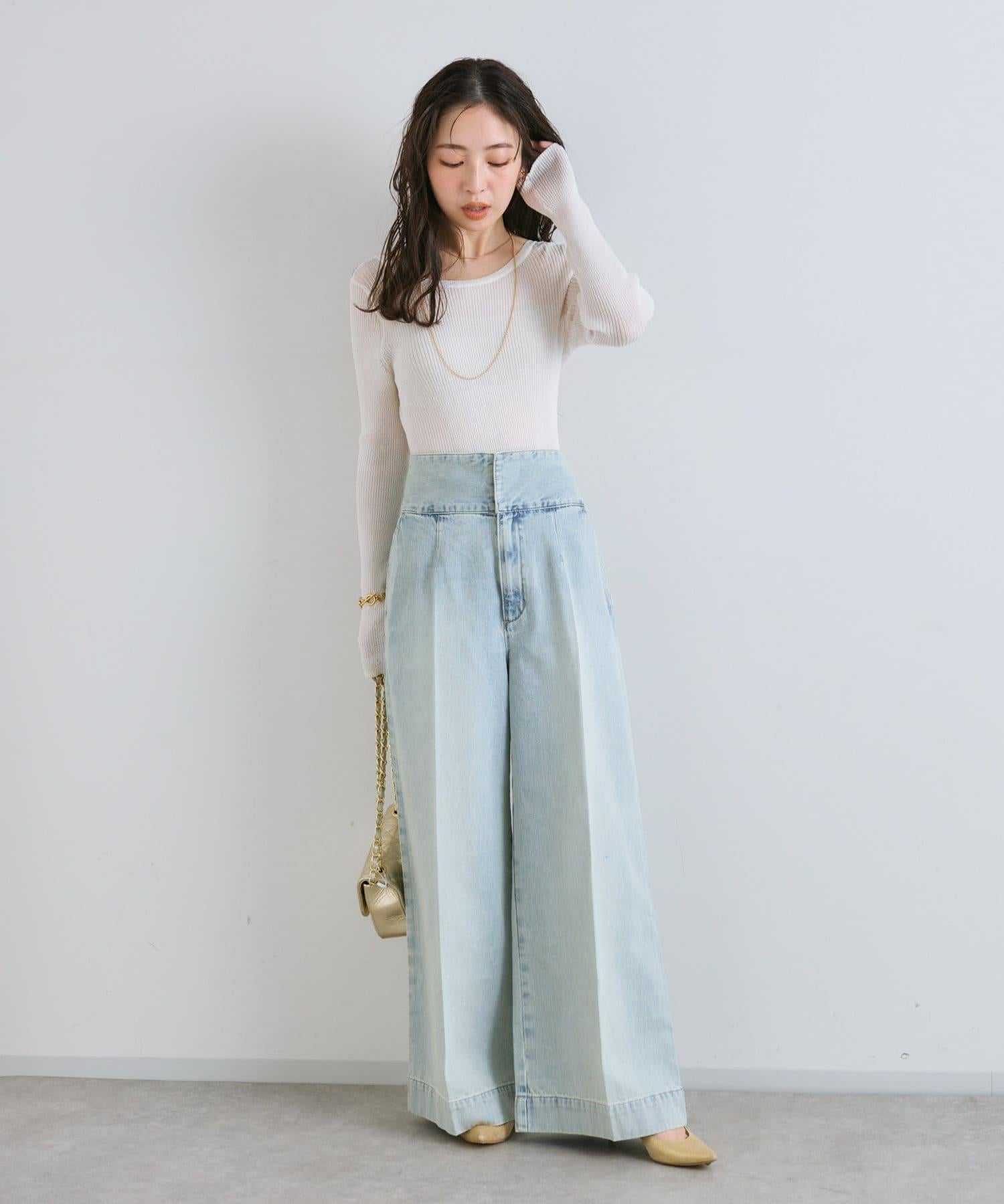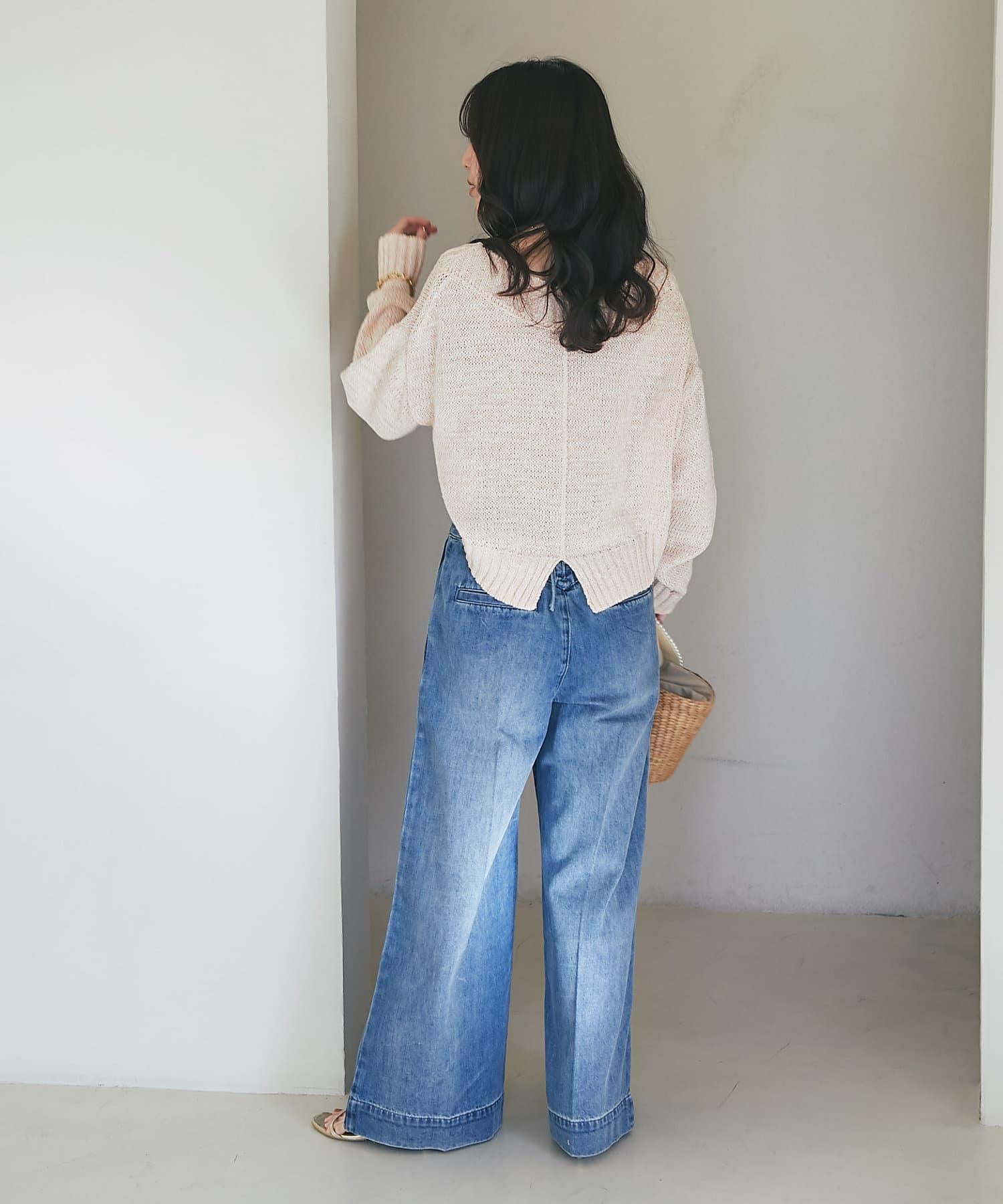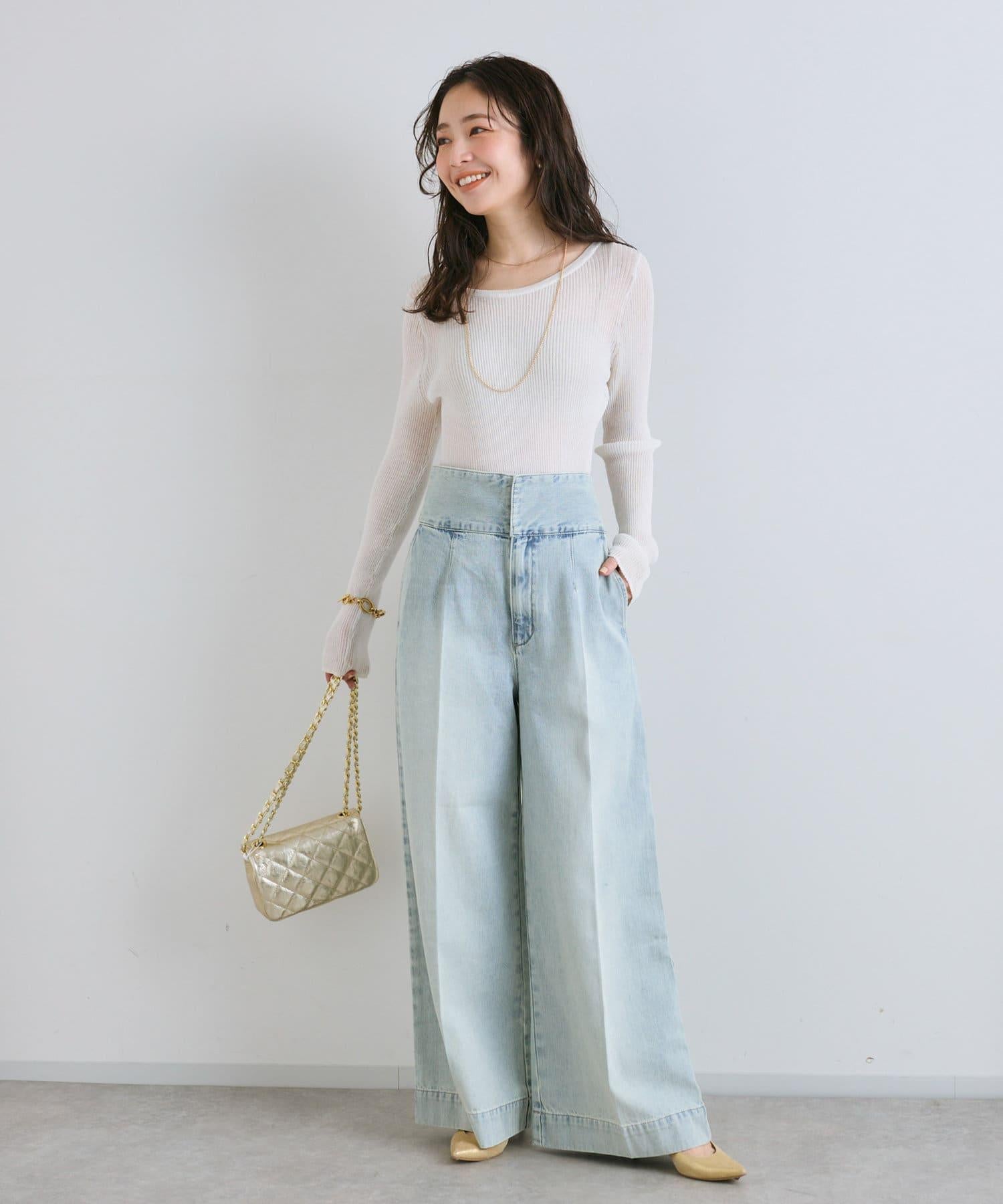這條寬鬆的牛仔長褲背部飾有蕾絲花邊。