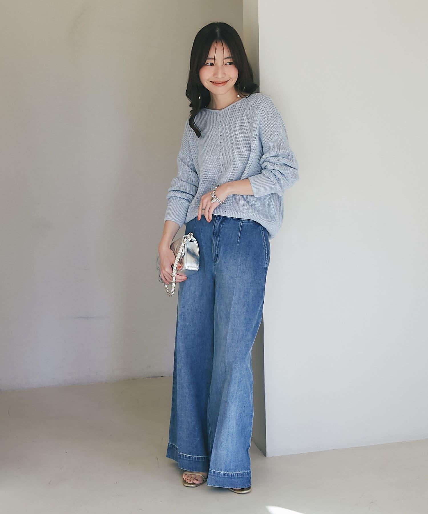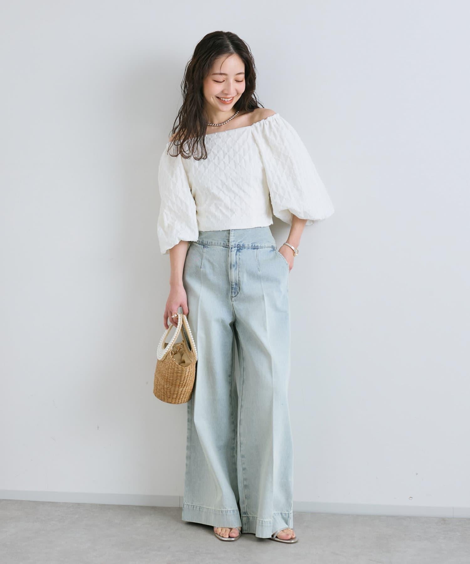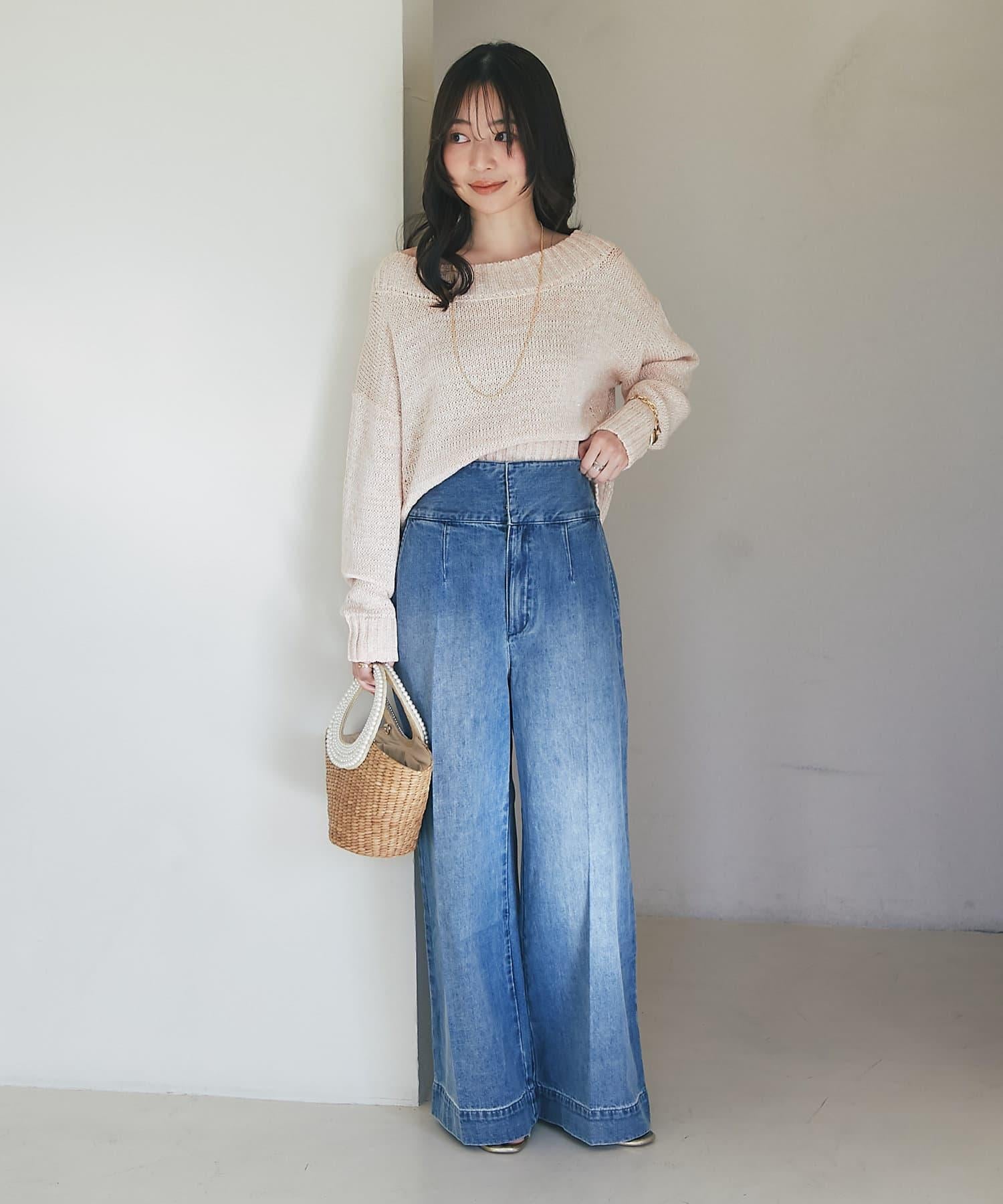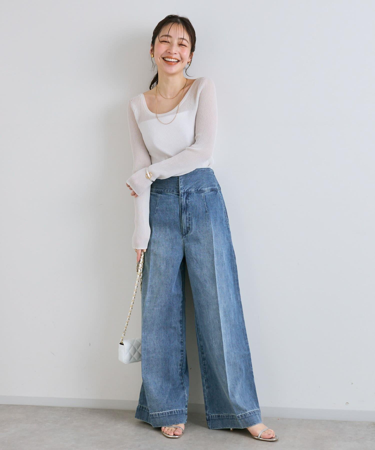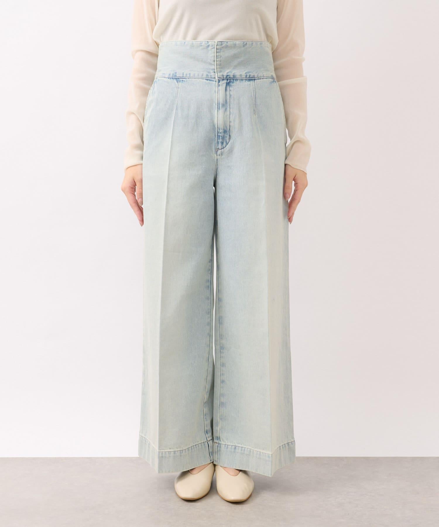 這條寬鬆的牛仔長褲背部飾有蕾絲花邊。