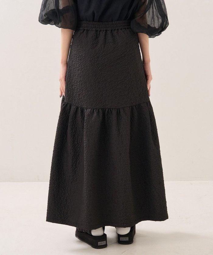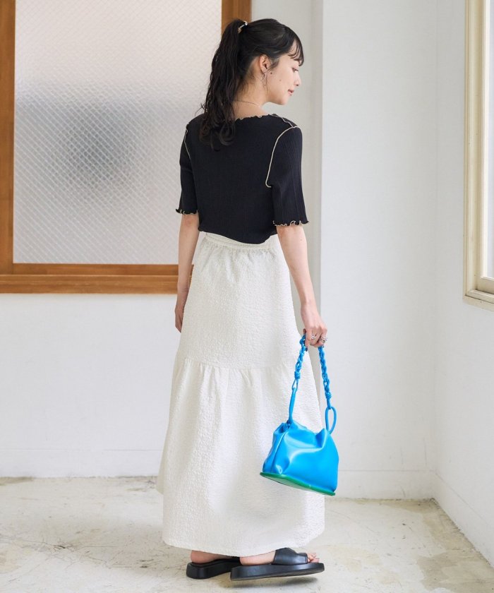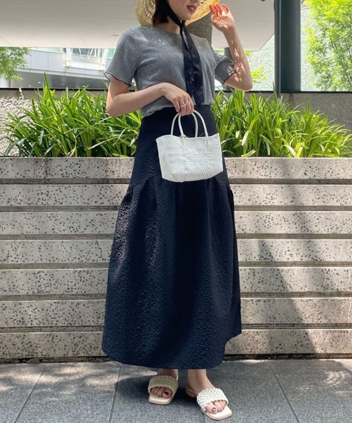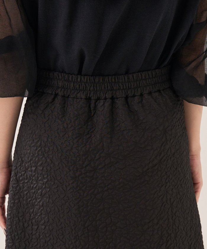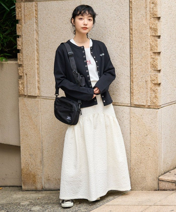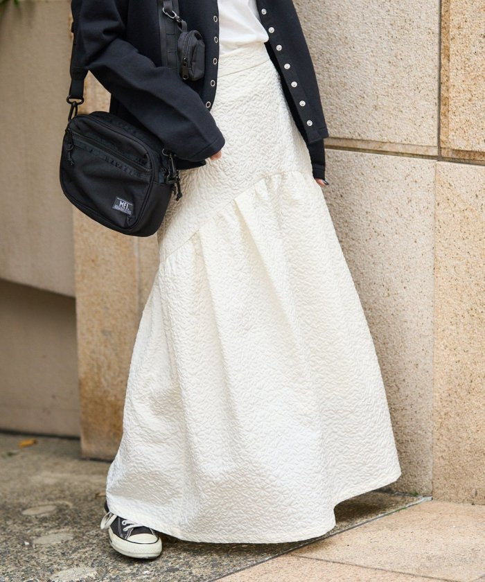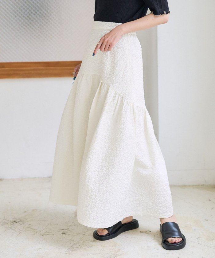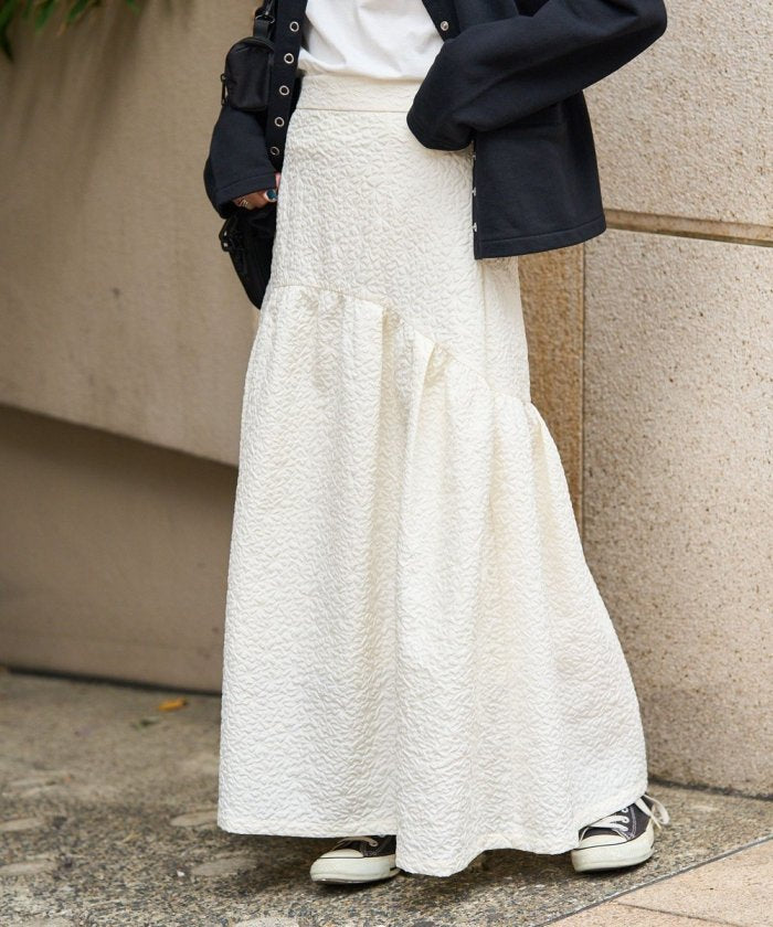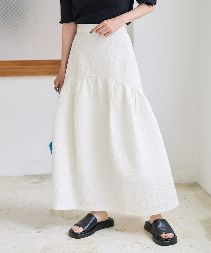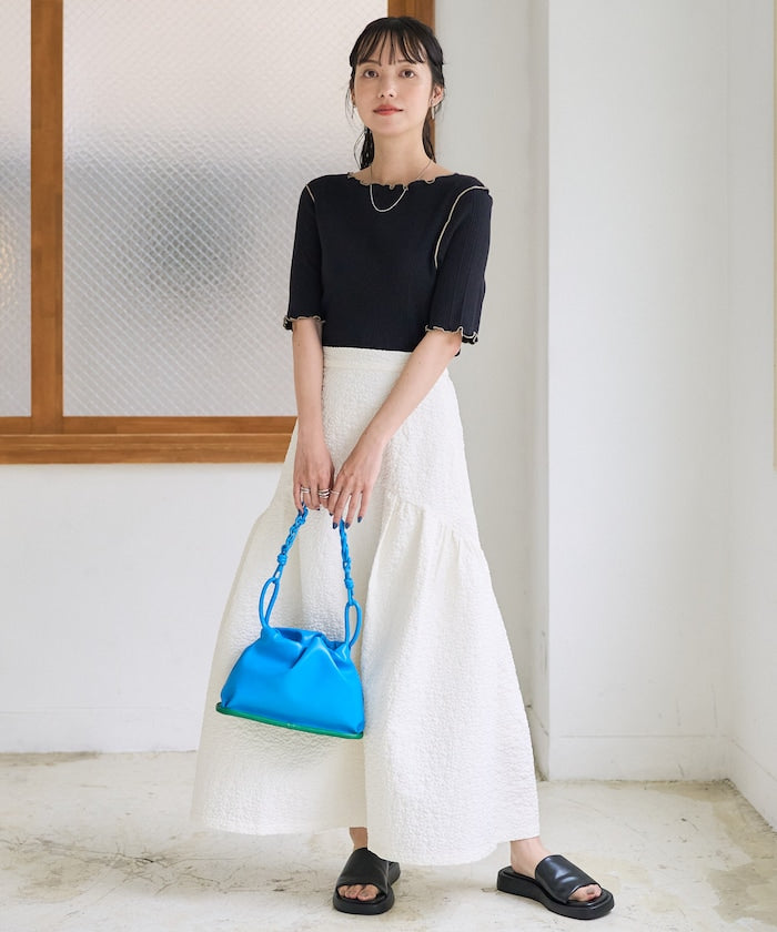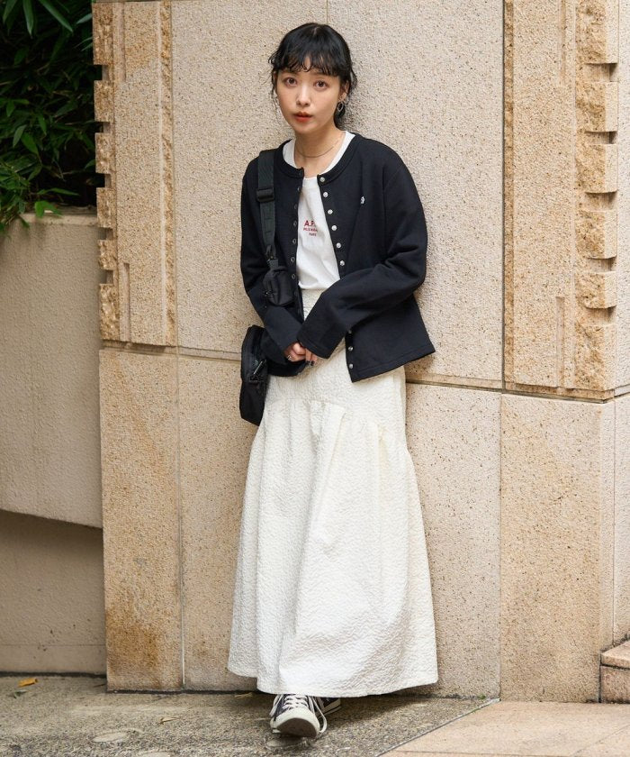 裙子採用時下流行的 Fouclé 提花面料,具有凹凸紋理和彈力感。