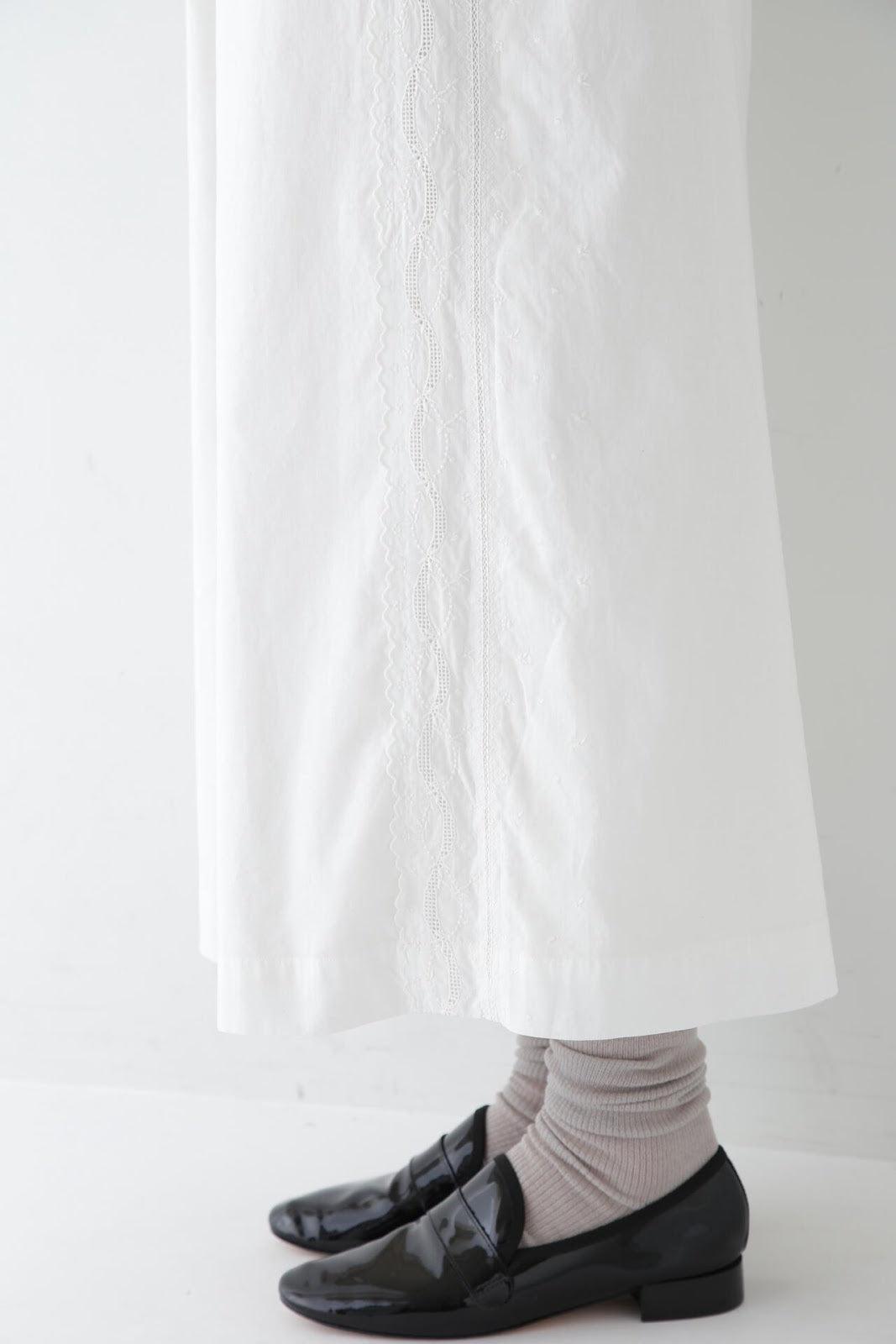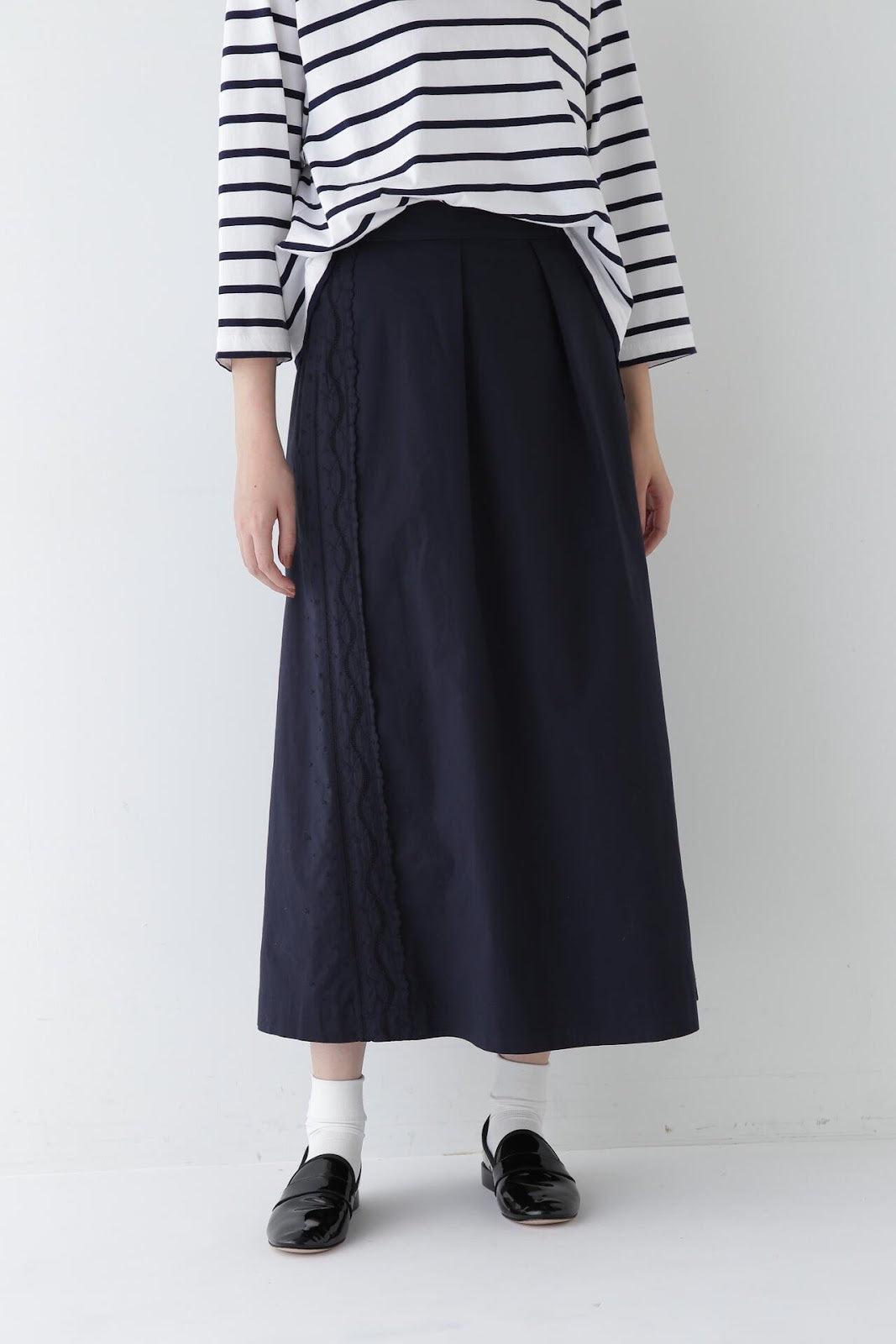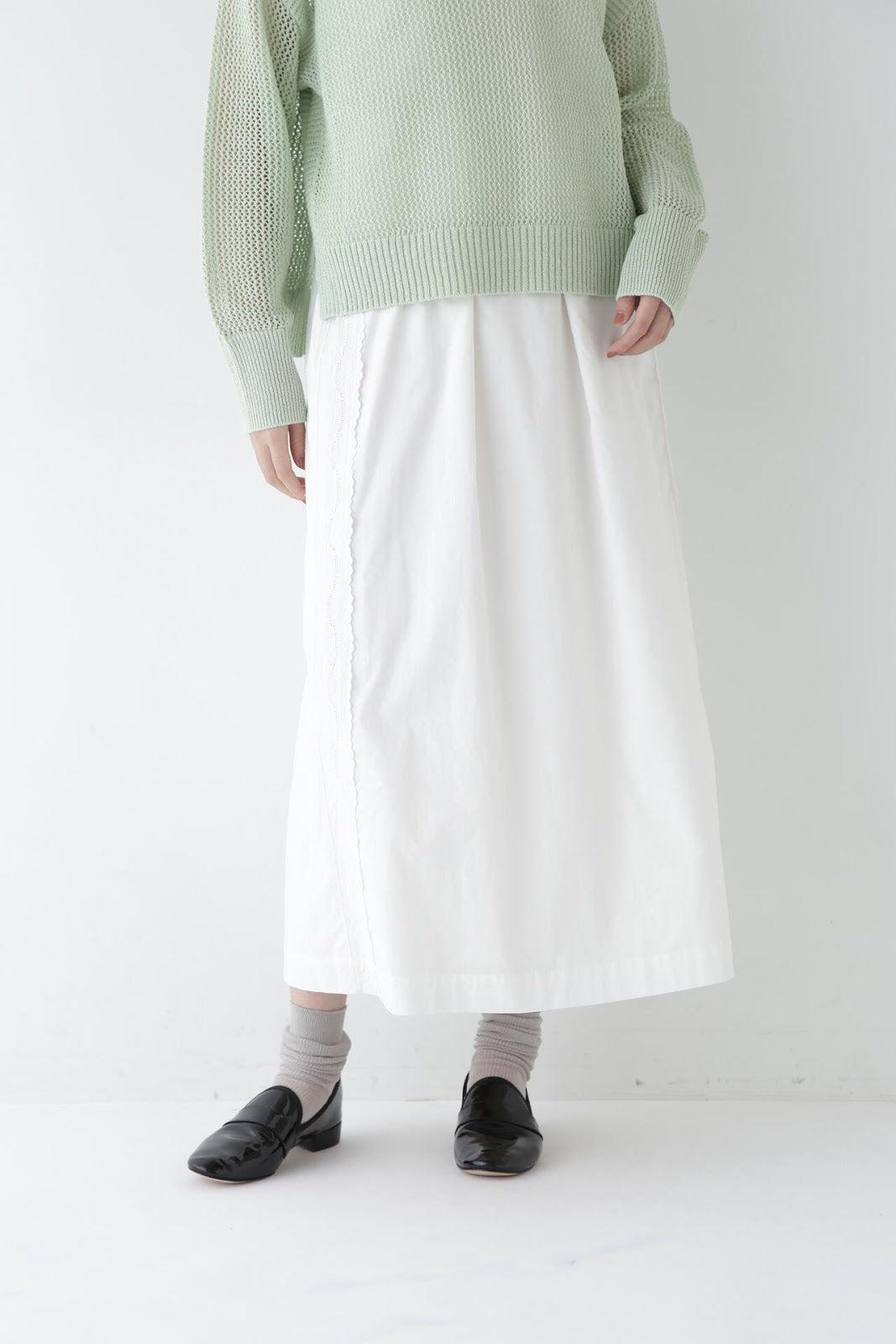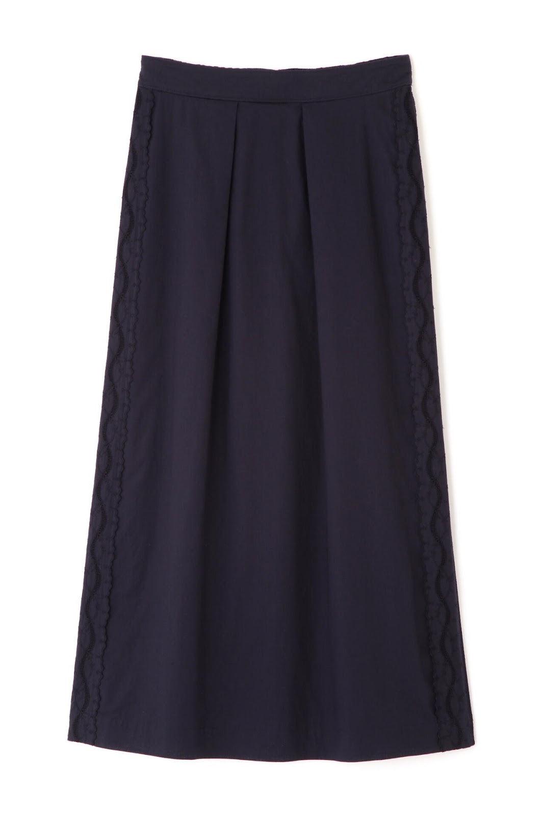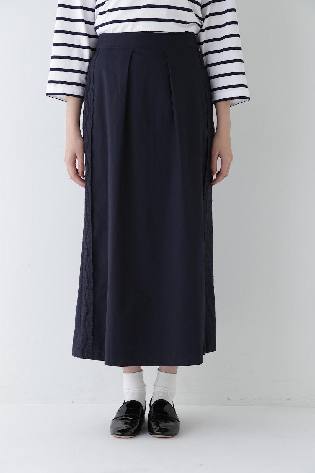 帶有復古蕾絲的 A 字裙 [設計要點] 簡單的 A 字裙,兩側帶有扇形蕾絲。👍初的扇形花紋靈感來自於 60Lloan 底布上的復古枕套花紋。裙子有兩種顏色:灰白色和海軍藍。蕾絲點綴簡單而有效,建議搭配春季色彩的針織衫或運動衫,腳踩樂福鞋或運動鞋,造型略顯厚重。