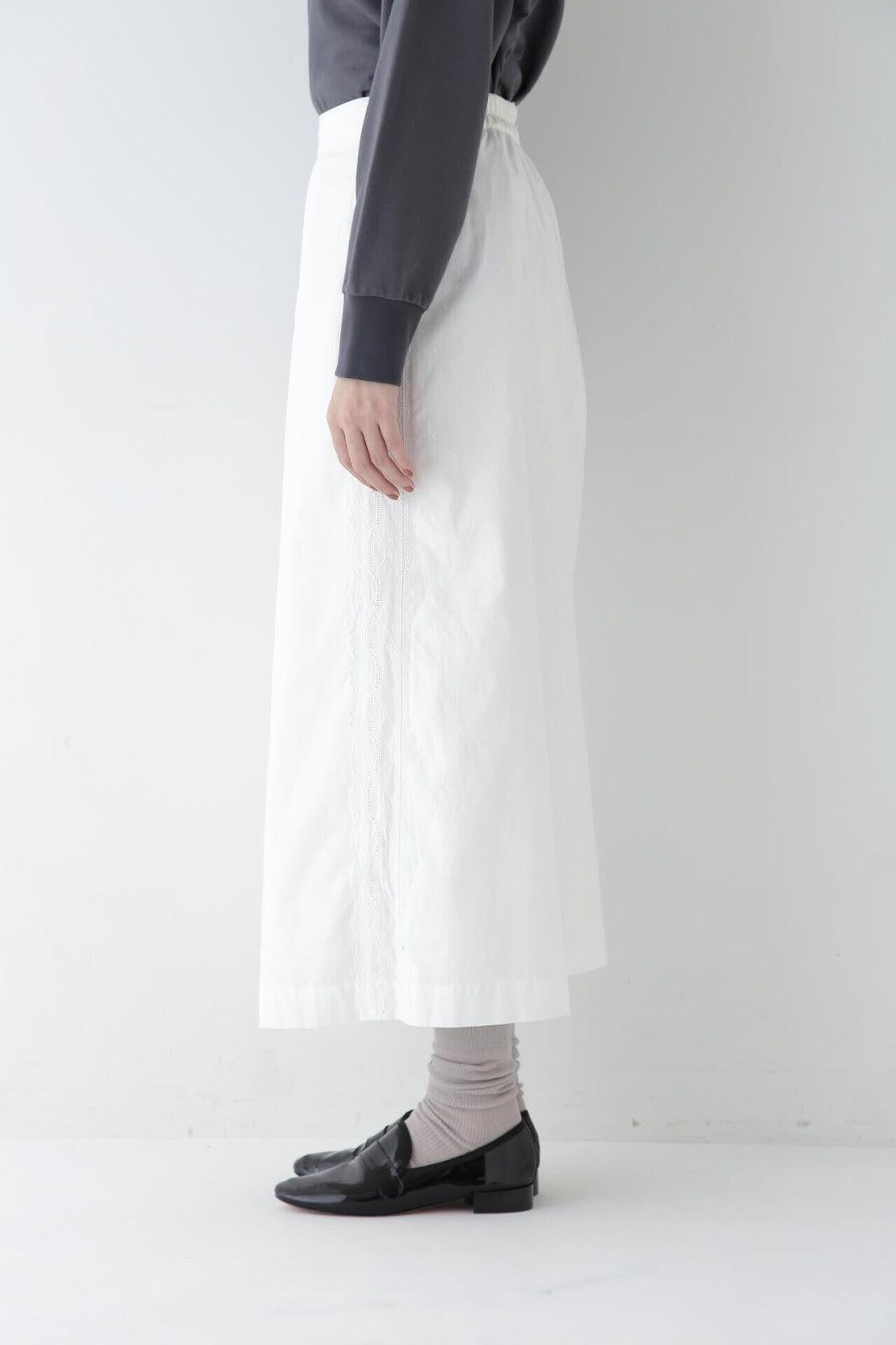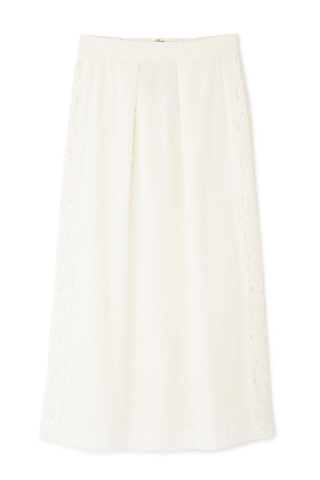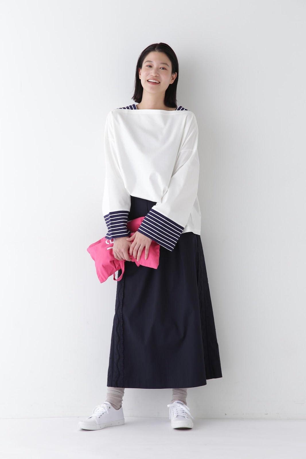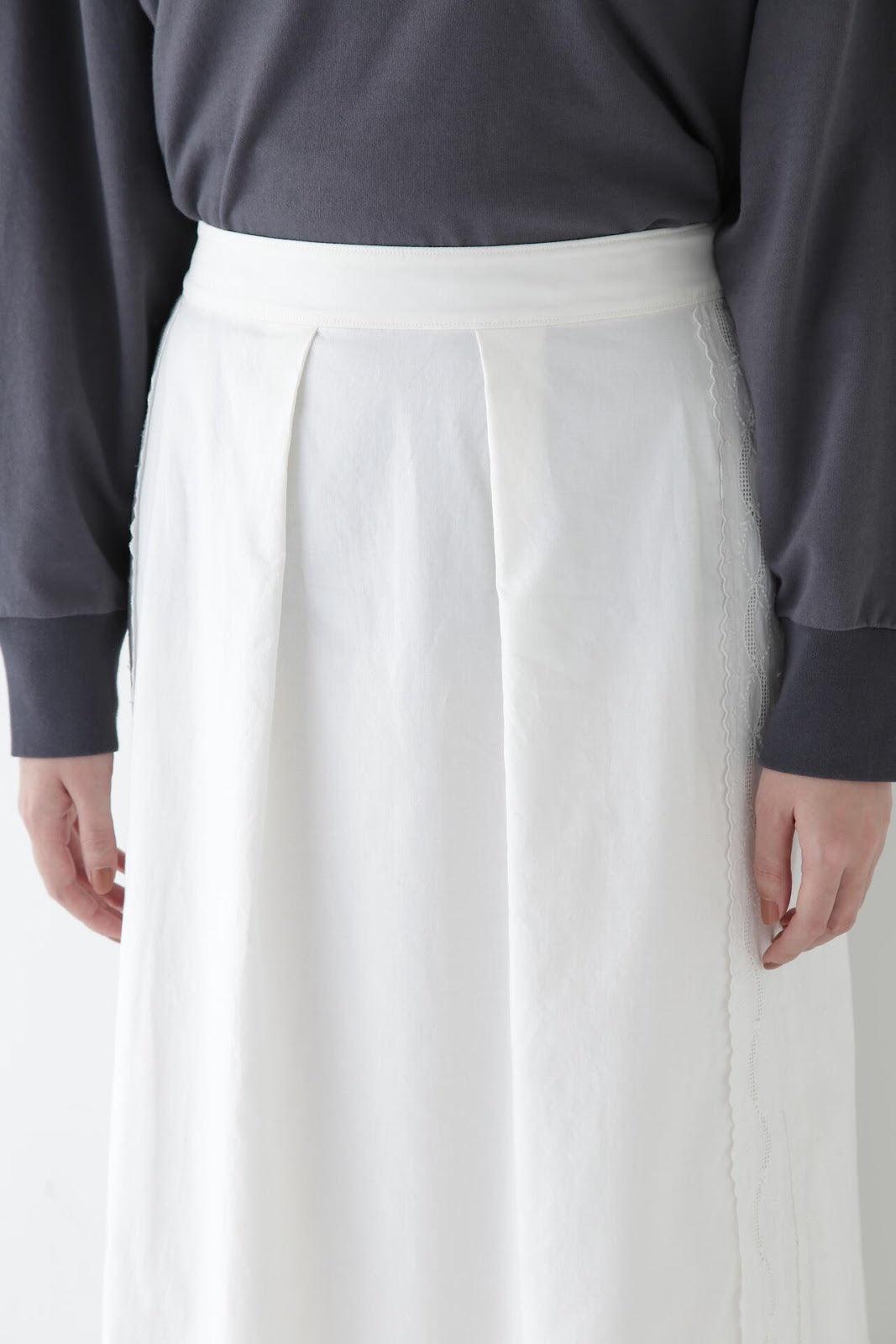 帶有復古蕾絲的 A 字裙 [設計要點] 簡單的 A 字裙,兩側帶有扇形蕾絲。👍初的扇形花紋靈感來自於 60Lloan 底布上的復古枕套花紋。裙子有兩種顏色:灰白色和海軍藍。蕾絲點綴簡單而有效,建議搭配春季色彩的針織衫或運動衫,腳踩樂福鞋或運動鞋,造型略顯厚重。