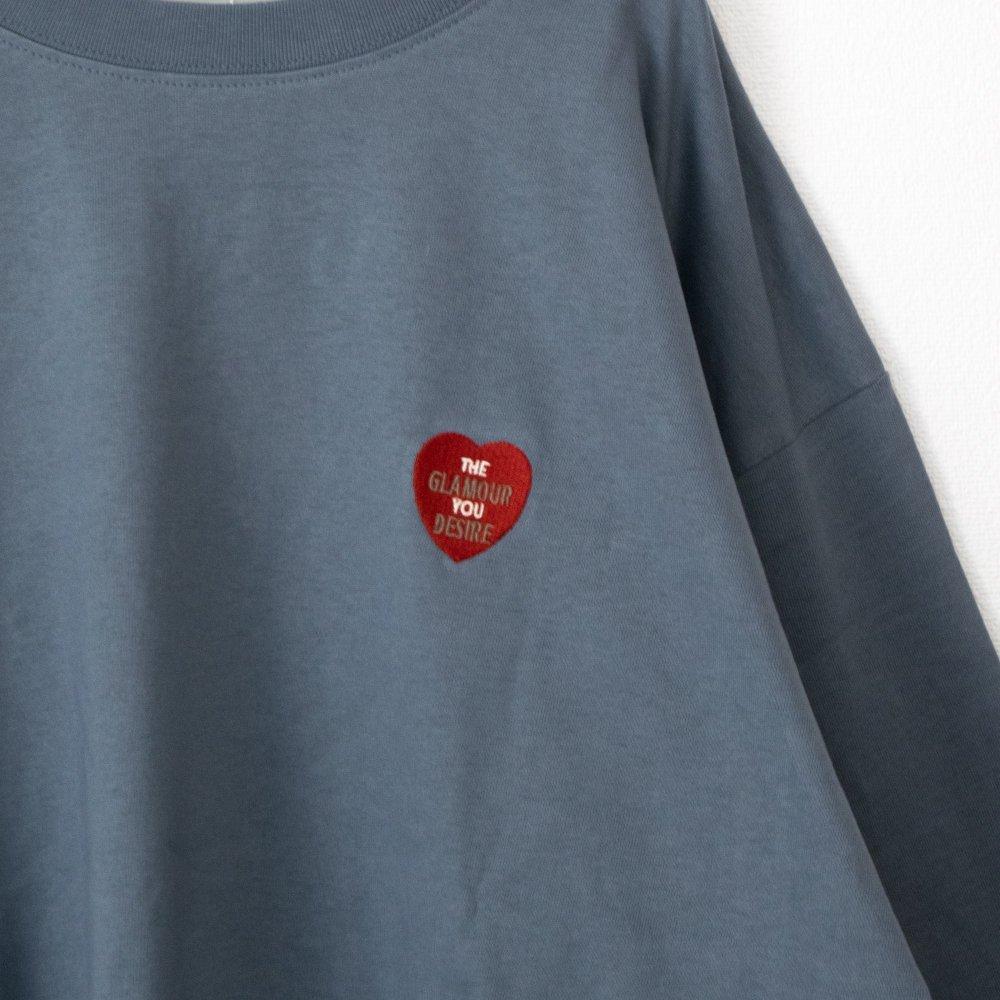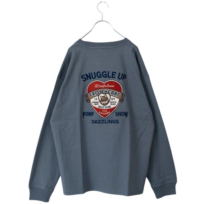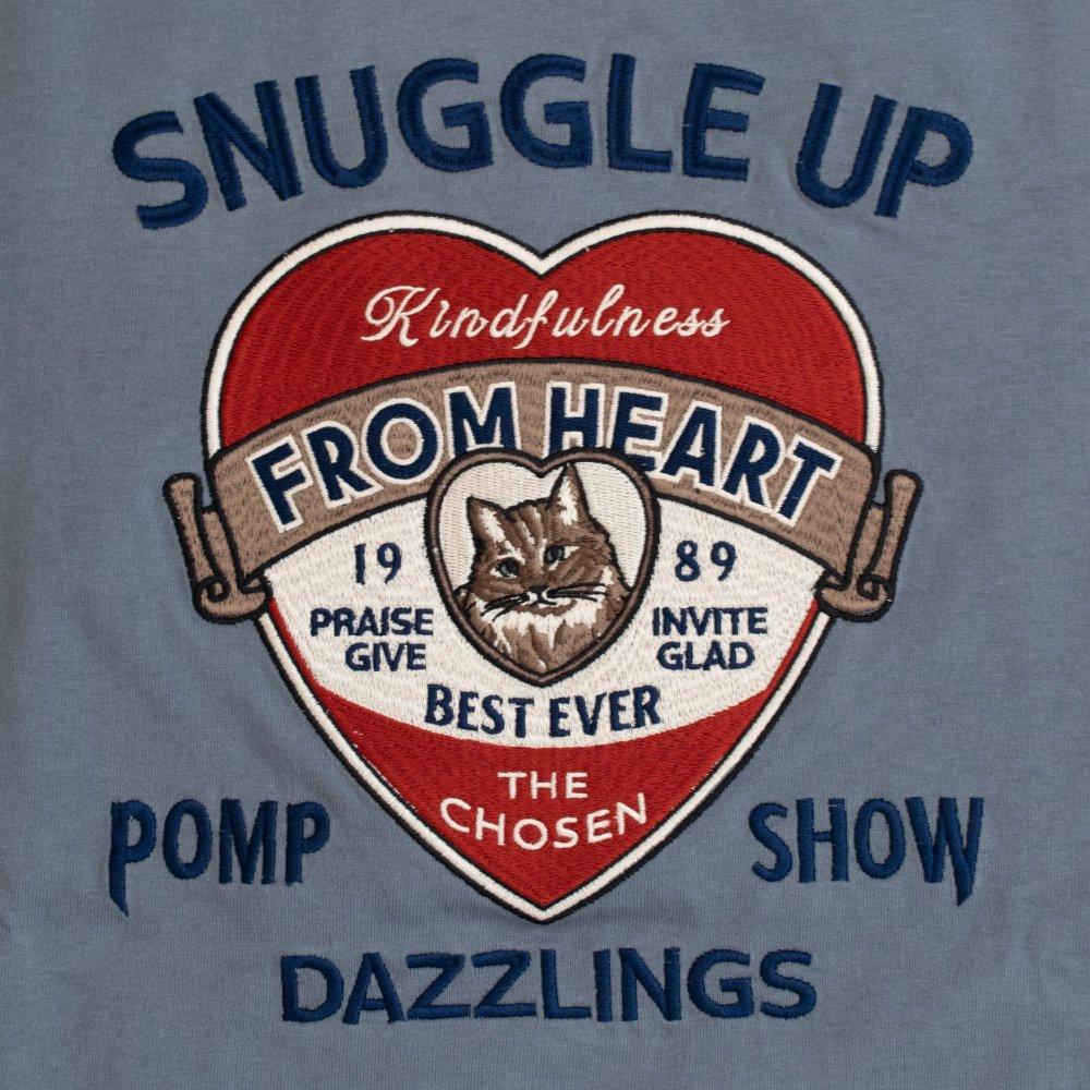 背面繡有心與貓圖案的長款 T ● 背面繡有徽章式心與貓圖案的精密 BIG 刺繡。