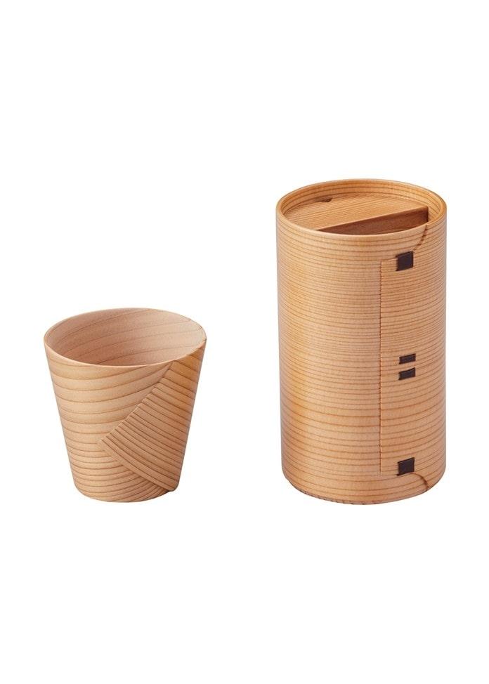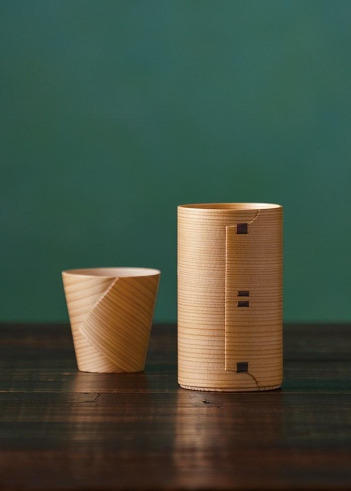 秋田音頭》是一首關於秋田特產的歌曲。歌曲中出現了歌詞"~Odate bent-wood"。彎曲的瓦帕起源於過去伐木工人將原木彎曲成手工飯盒的時代。慄森順治(Kurimori Shunji)是慄森的第六代傳人,也是傳統的大館彎曲木工藝師。將秋田杉削成四分之一鋸開的薄木板浸泡在熱水中,使其充分吸收水分,然後將兩塊木板疊放在被稱為 "koro "的原木彎曲工具上,通過滾動使其彎曲成形。根據容器的大小和深度,彎曲工具有各種形狀,圓錐形的用錐形彎曲工具,橢圓形的用橢圓形彎曲工具。臨時固定後,將其晾乾並上膠。👍後,用櫻桃樹皮將它們縫合在一起,然後插入底部並上漆,這樣就製成了一個漂亮的彎曲器皿。有一天,Kurimori 先生的妻子對他說:"你總是使用圓柱形,這很難用。"Kurimori 先生感到非常震驚。 經過反覆試驗,他製作出了一個頂部寬口的臼形彎曲瓦帕。由此,一個前所未有的現代新容器誕生了。自 1968 年以來,該公司獲得了無數獎項,包括👍設計獎和長壽設計獎。這套酒具集功能性和設計性於一體,適合現代生活,讓居家時光變得美味而愜意。