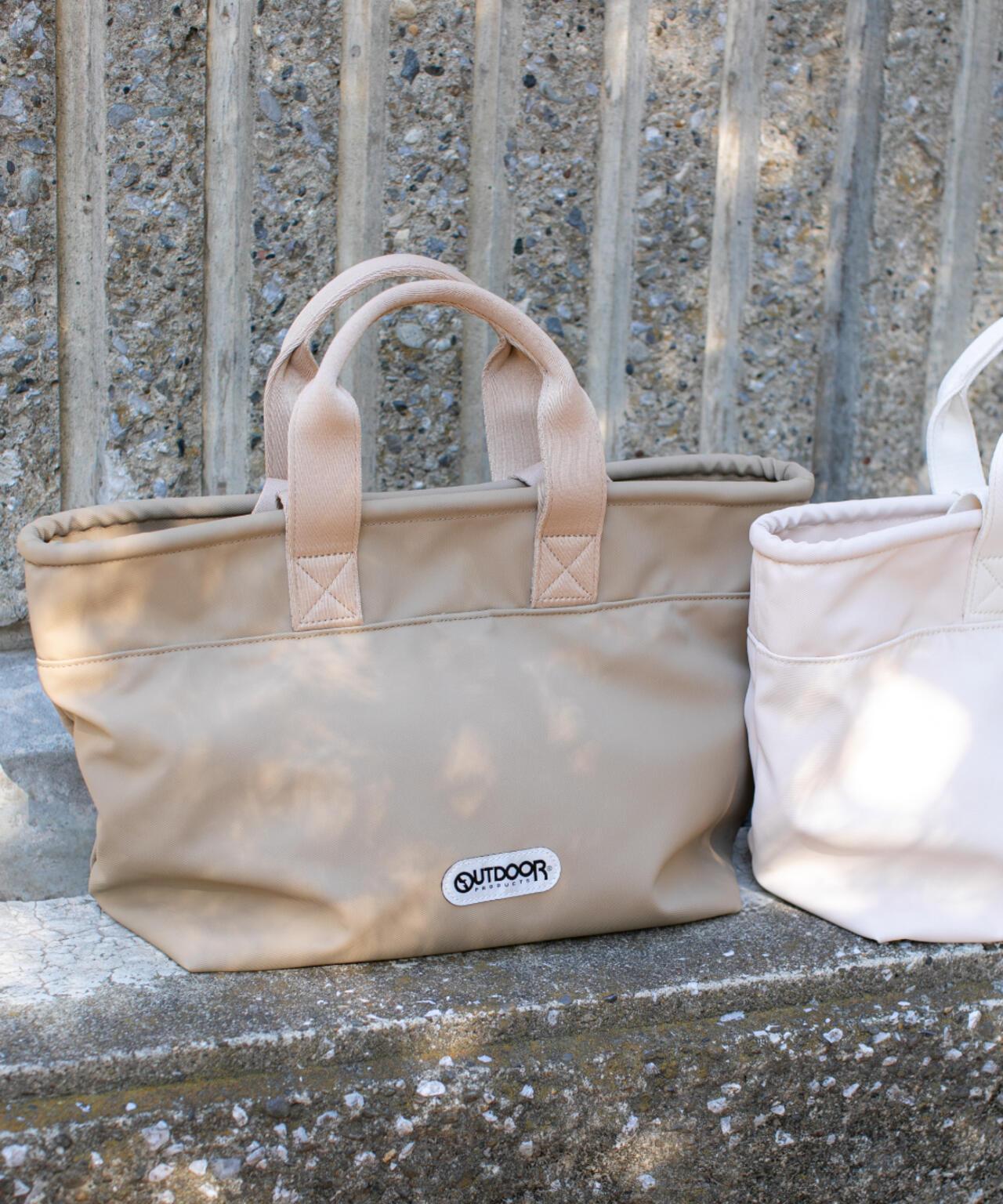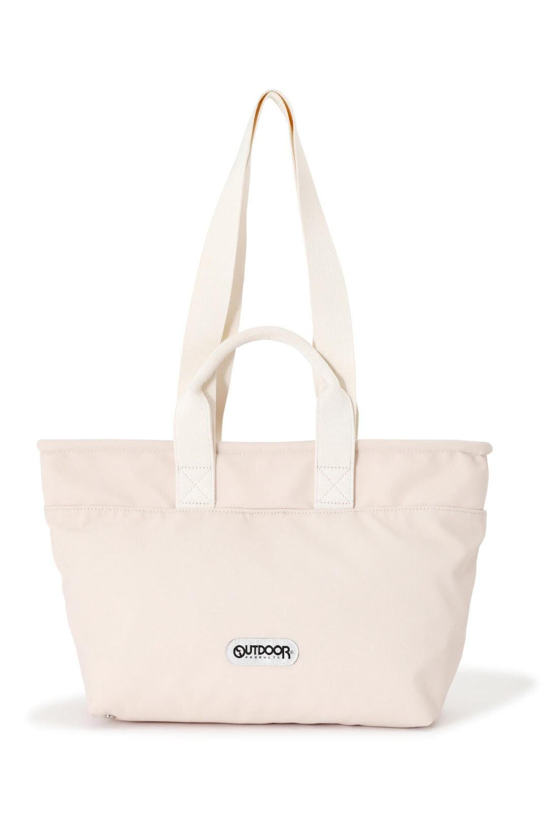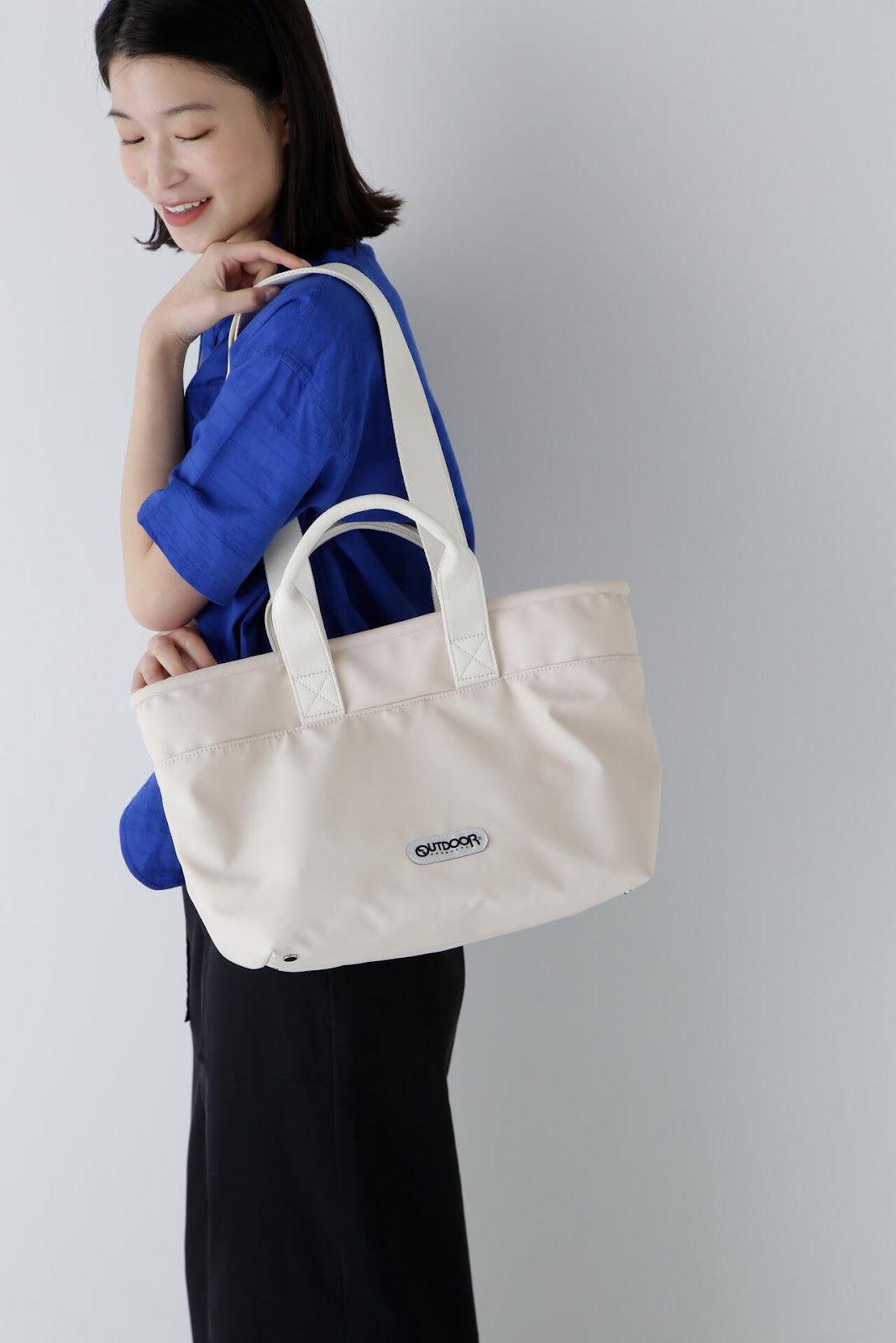 來自 "OUTDOOR PRODUCTS" 的定製手提袋 從外形上看完全是定製的,這款手提袋使用方便,有一個雙向手柄,內有很多口袋。口袋旁邊還有一個鑰匙環。有白色和米色可供選擇。啞光塗層包身搭配閃亮的實心皮帶提手。大號手提包的尺寸足以容納大量行李,適合一日遊使用。