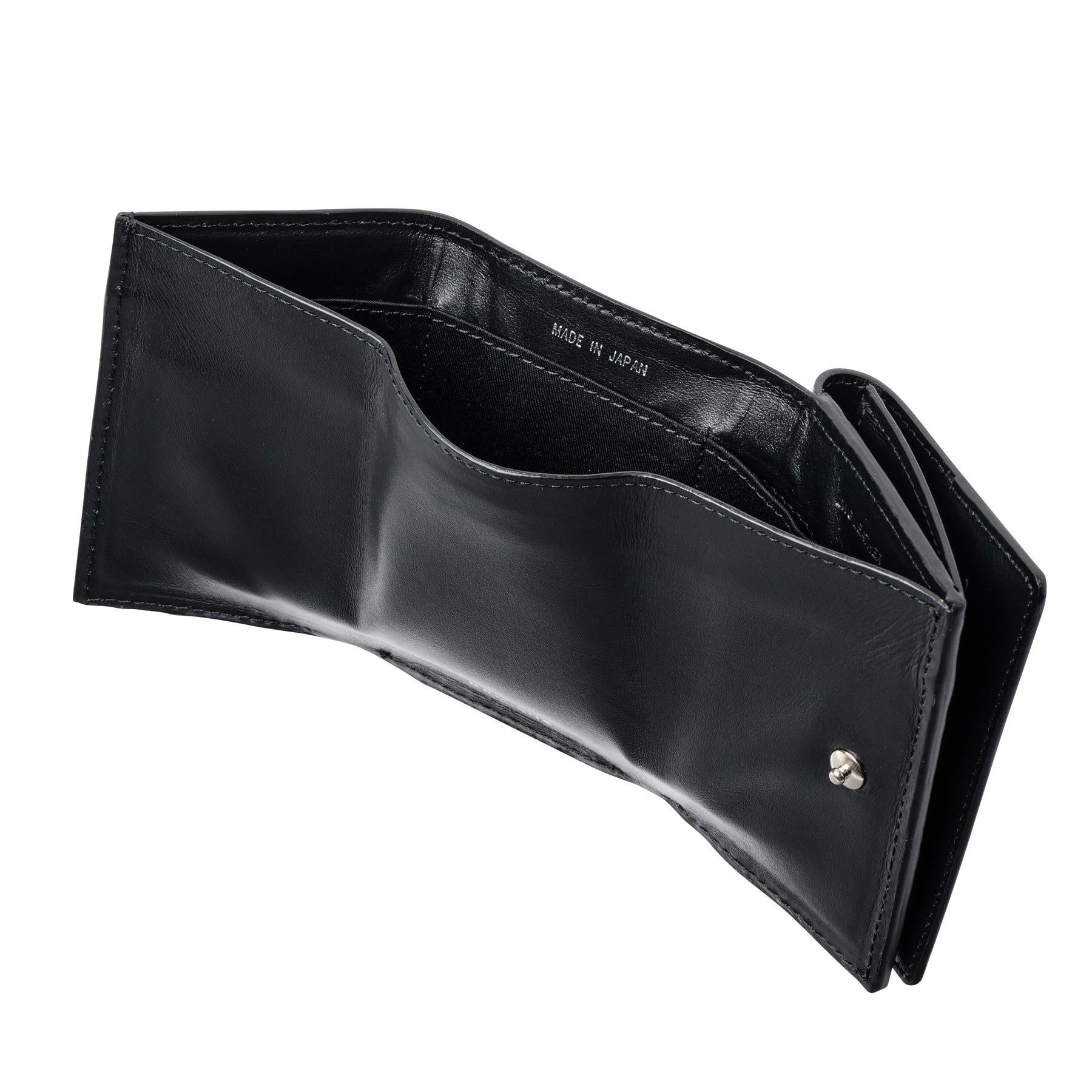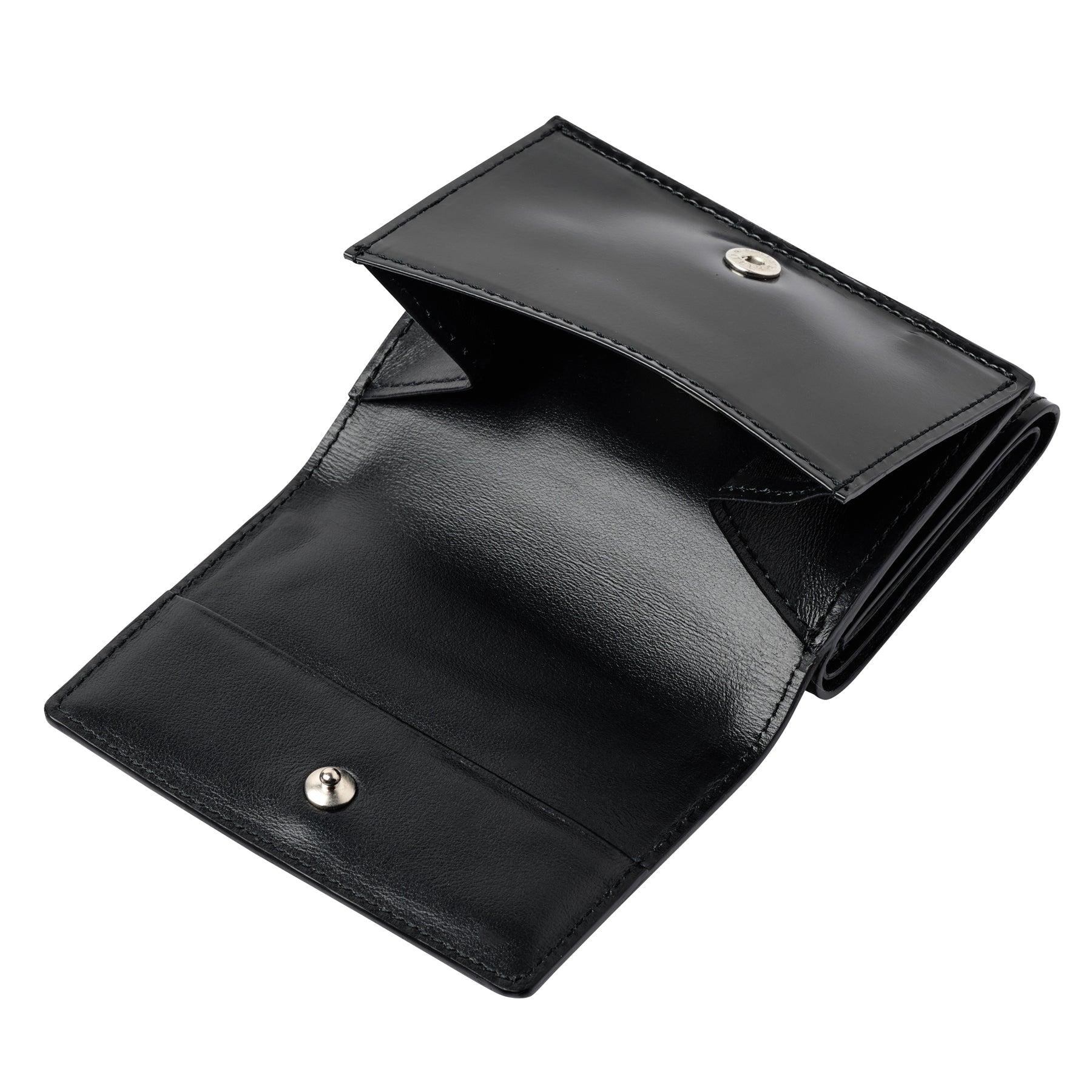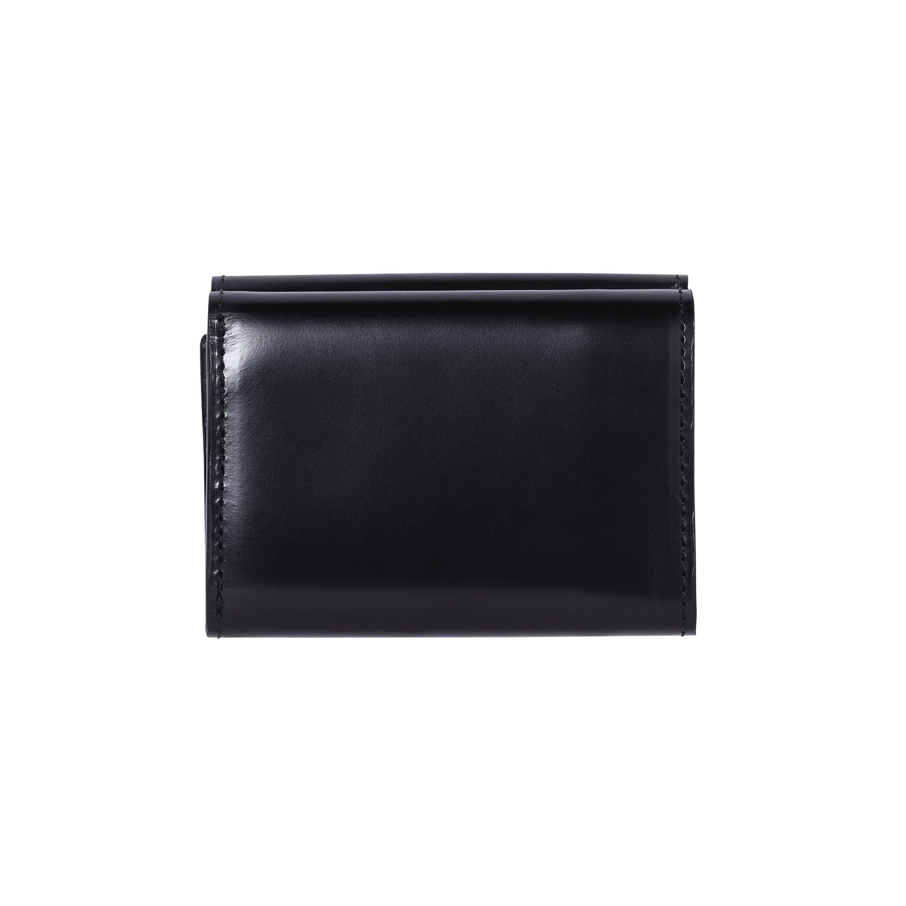 小巧的三折迷你錢包,設有兩個紙幣袋、一個夾層零錢袋和卡片插槽。為了追求皮革的質感和簡約,品牌標誌僅置於內側。採用無鉻無金屬鞣製牛皮,由獲得 LWG 銀級環保認證的製革廠提供,該認證僅授予符合嚴格國際標準的製革廠。這種意大利皮革表面光滑閃亮,如鏡面般光滑,並帶有玻璃塗層,從各個角度看都散發出優雅深邃的光澤。