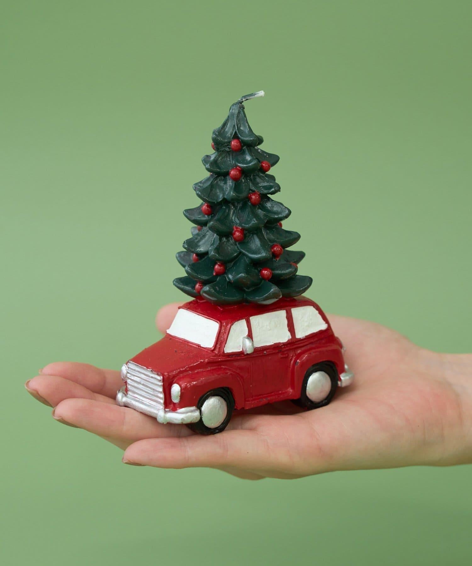手工蠟燭上印有五顏六色的汽車,上面還有一棵樹。