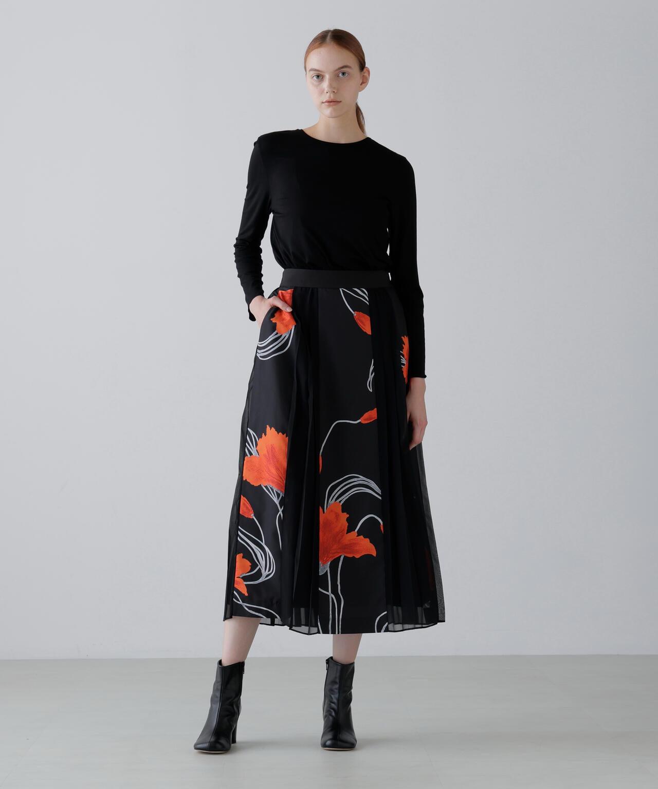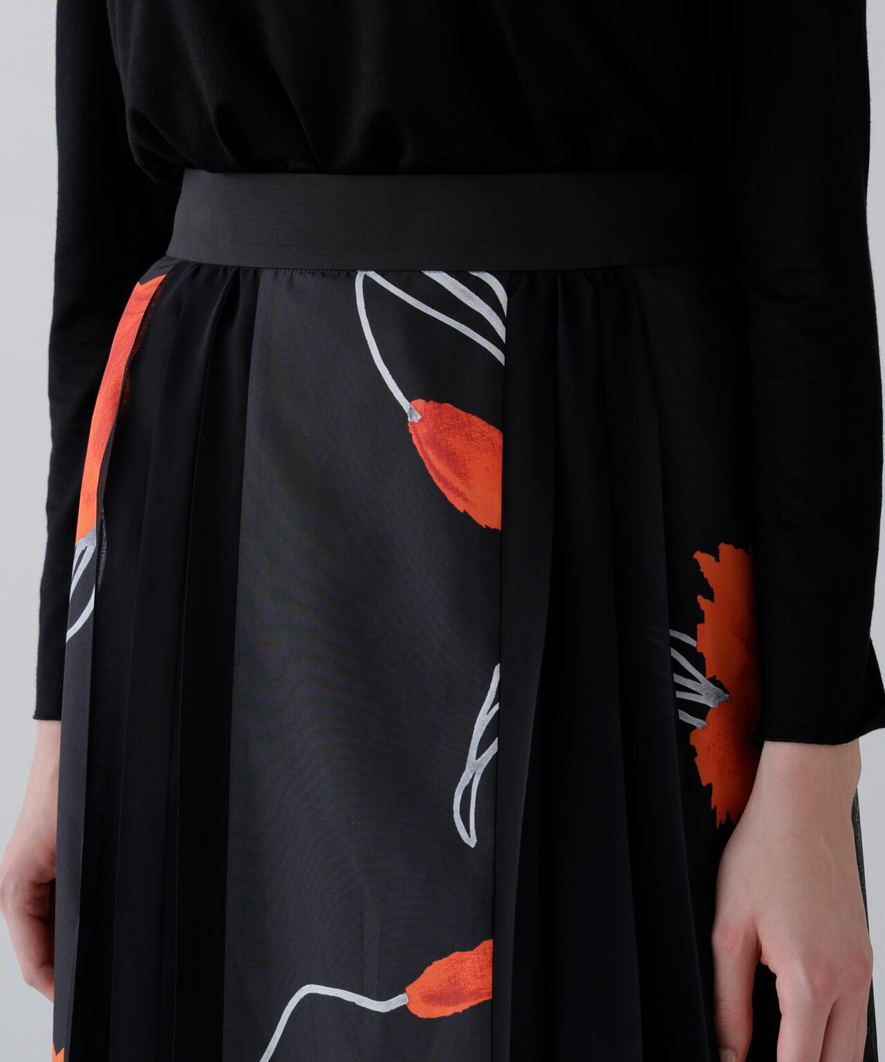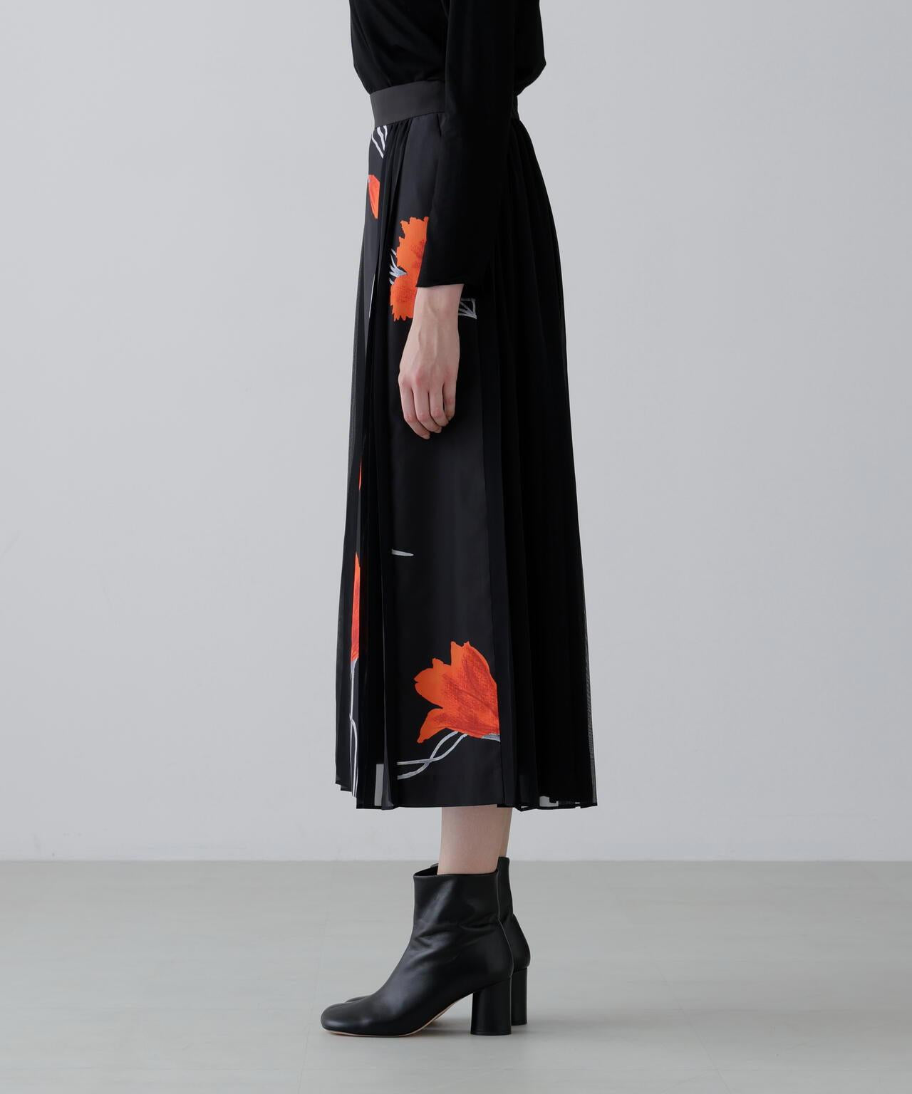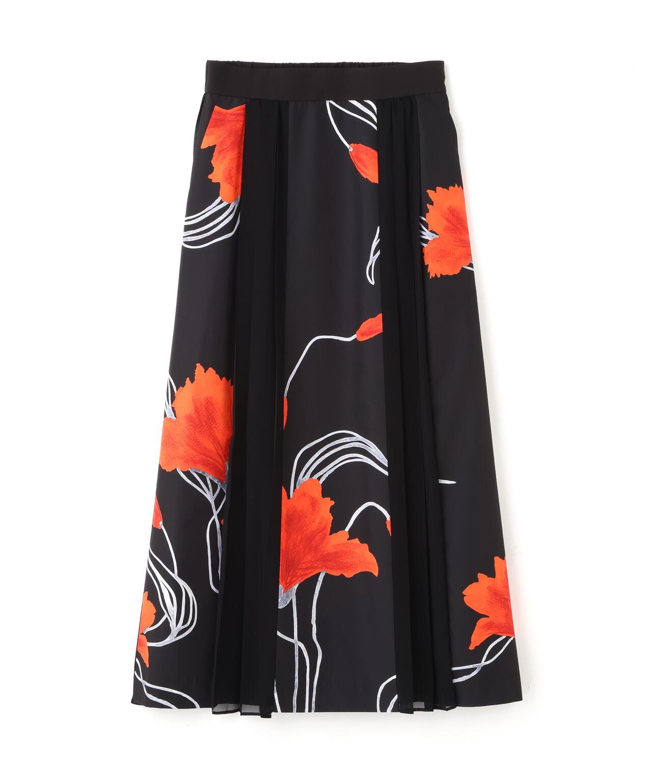 圖畫花卉印花裙,醒目大膽的印花充滿藝術氣息,印花圖案像鑲板一樣插入,與不同的材料交叉使用。透明面料採用褶皺設計,部分用於正面,全部用於背面。這款裙子即使與簡單的上衣搭配,也能彰顯出強大的氣場,因為它是一件華麗的單品。採用表面平整的輕薄新面料,底面印有鑲板圖案花紋,並採用張力適中的輕塔夫綢面料。