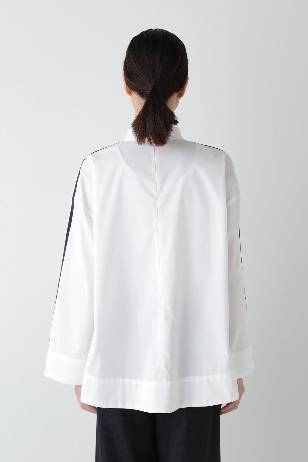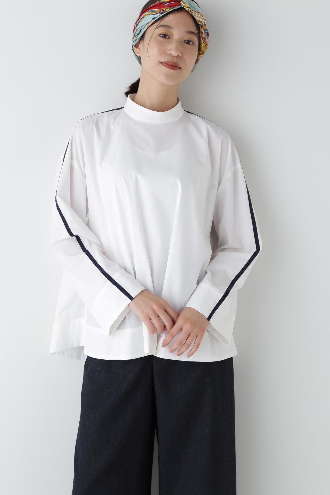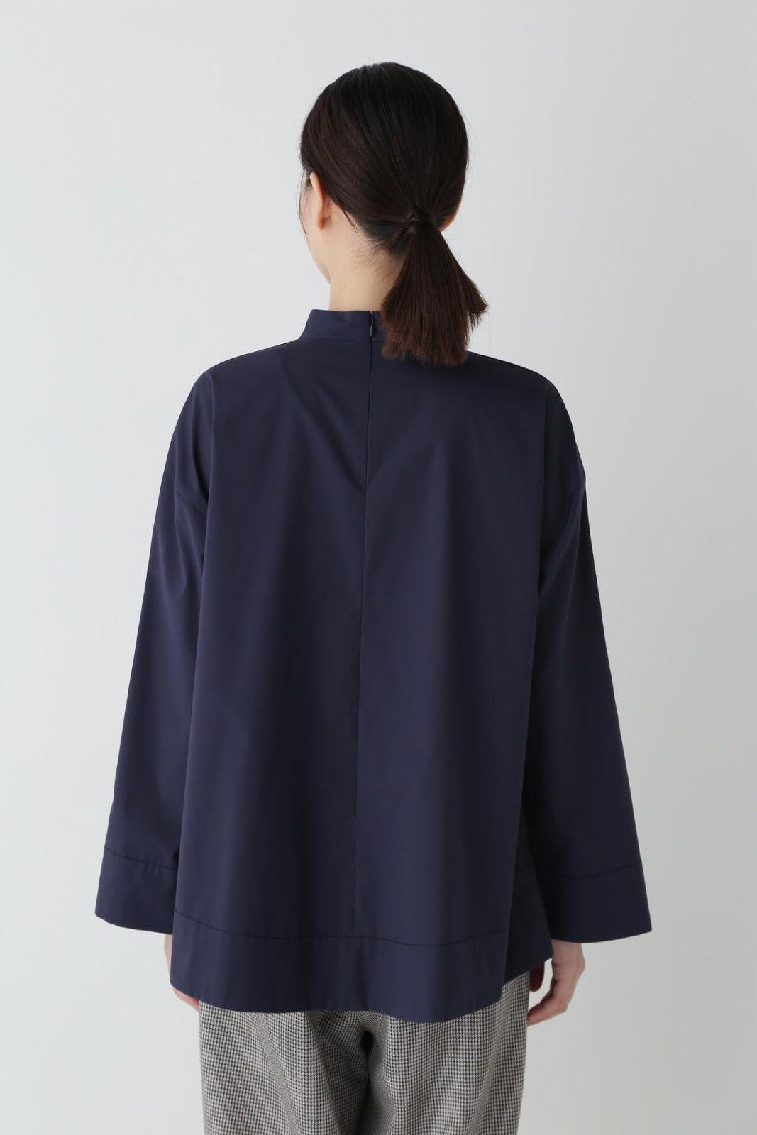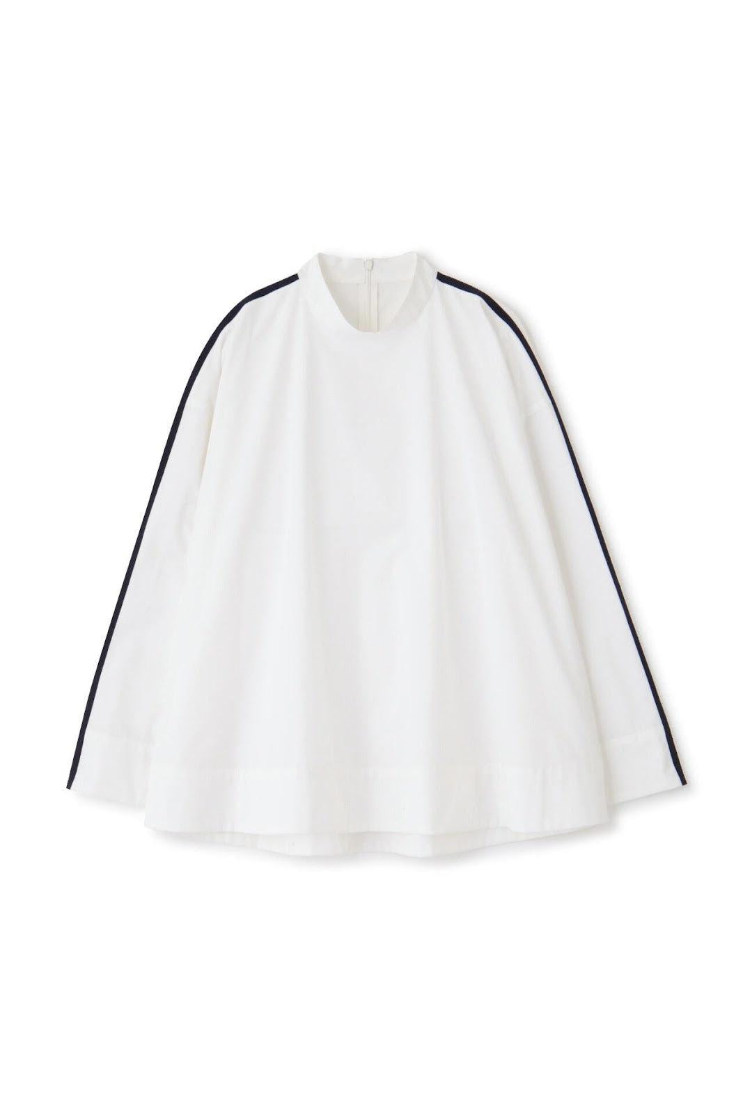 立領襯衫,線條醒目 [設計特色] 這是一款立領襯衫。從肩部到袖子的羅緞織帶線條使這款襯衫呈現出醒目的喇叭形輪廓。上衣採用滌綸混紡面料,抗皺性強,軟硬適中,材質美觀。建議搭配】上衣略長,建議外出時搭配衣服穿著。搭配修身或半寬鬆長褲都很合適。