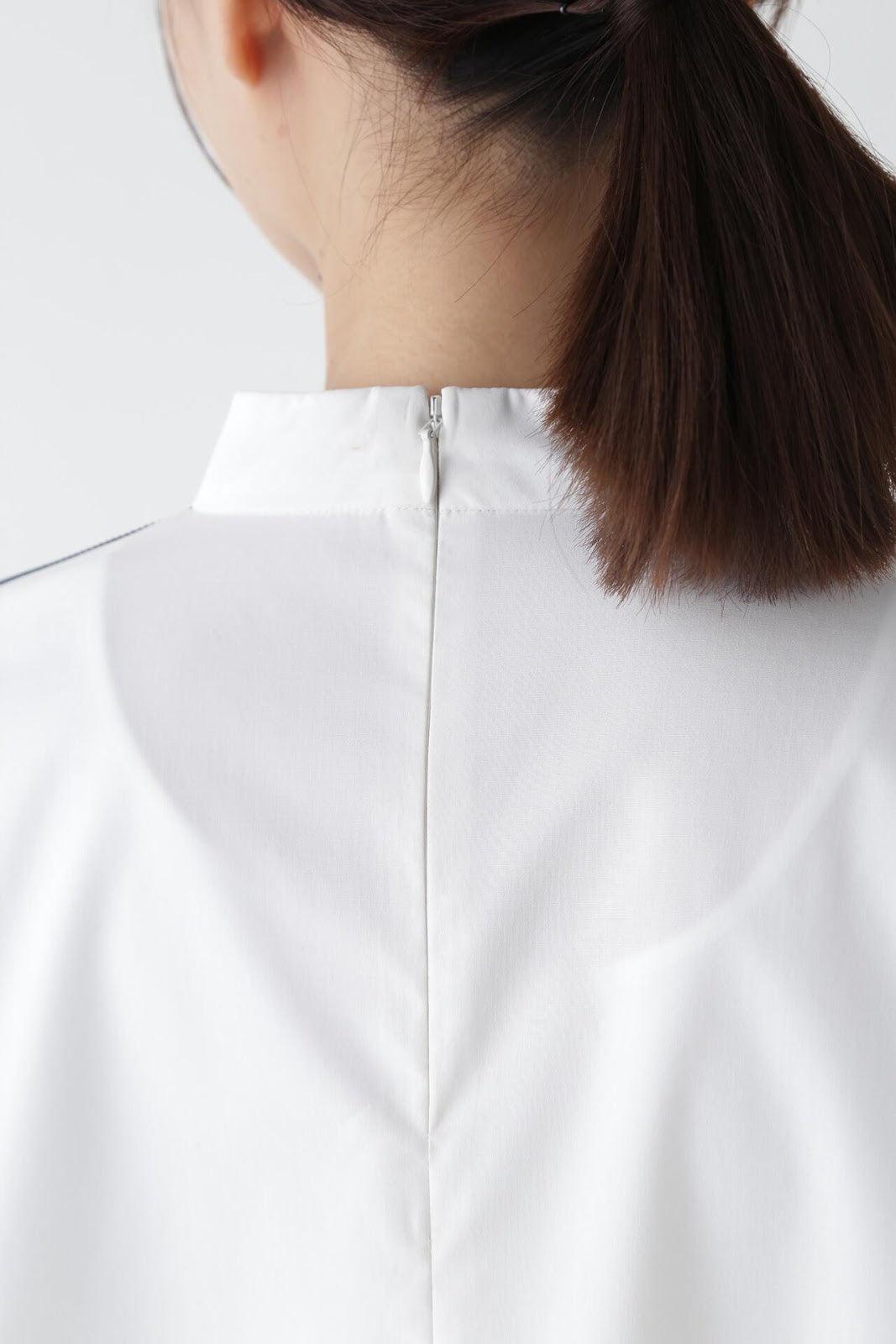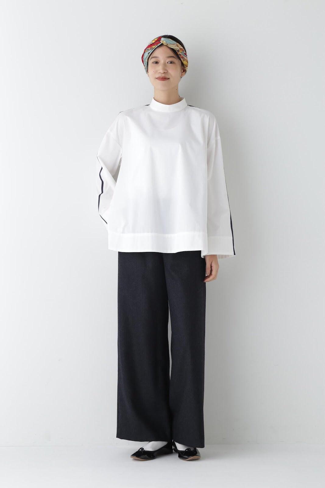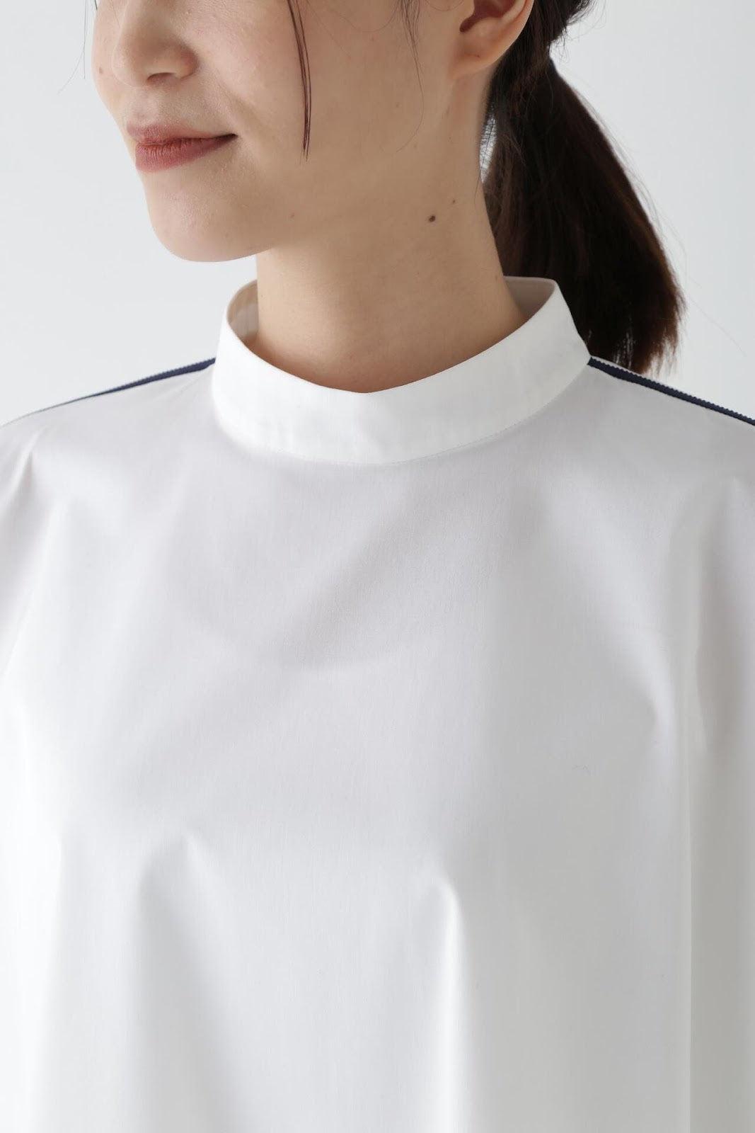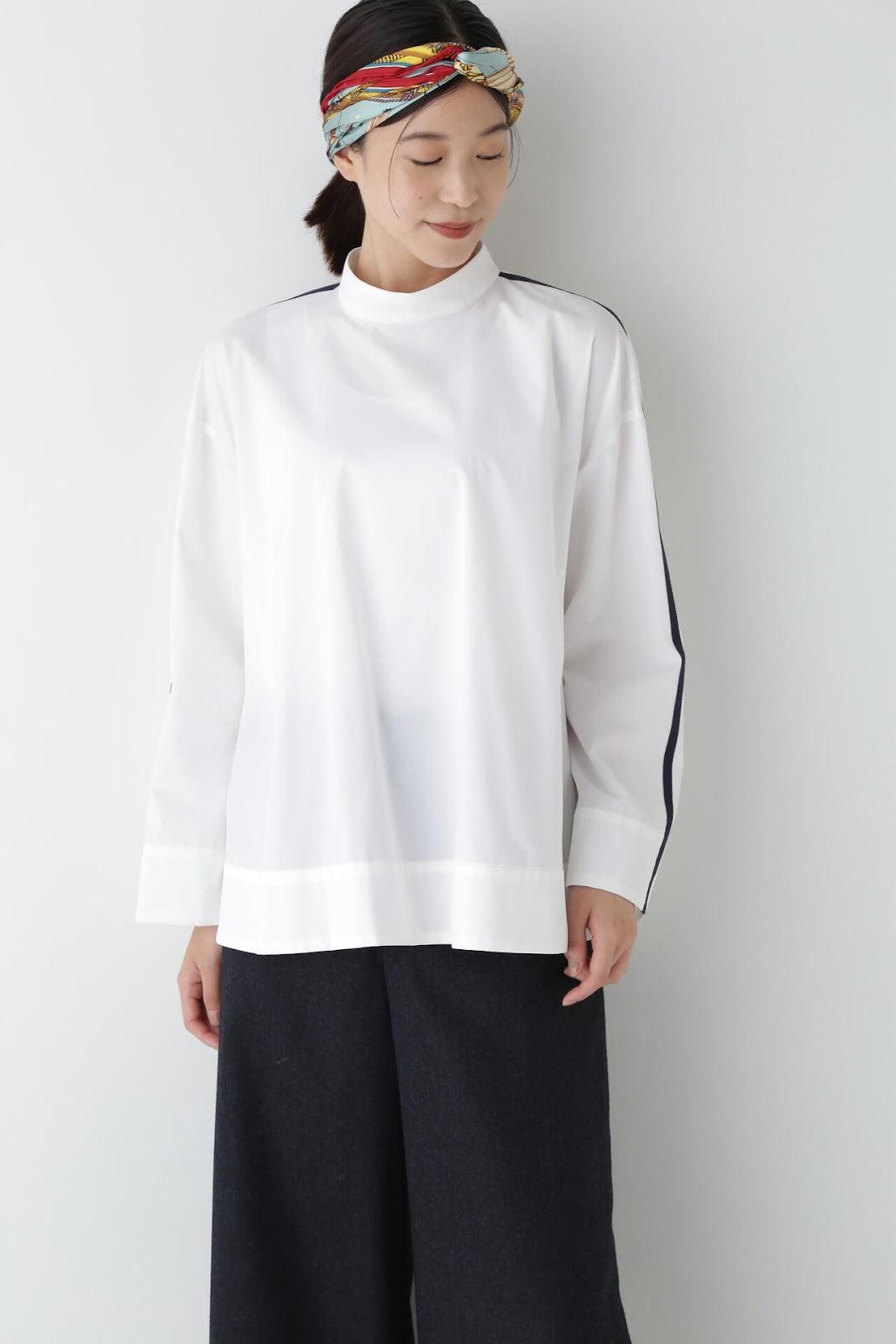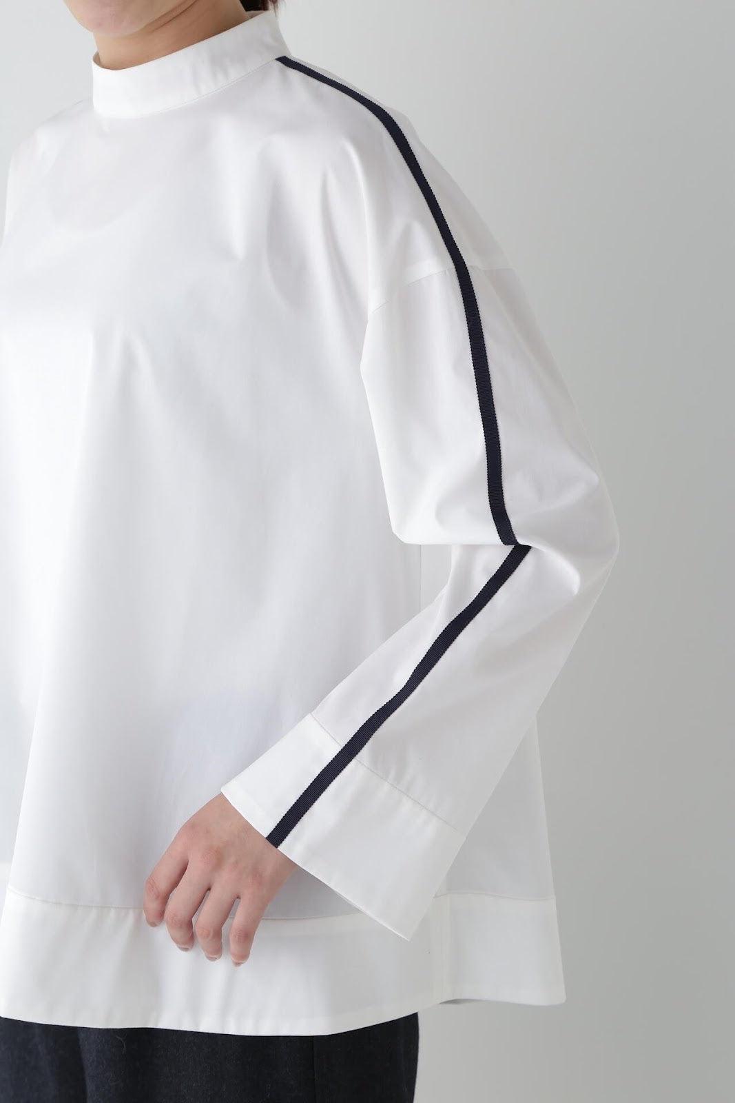 立領襯衫,線條醒目 [設計特色] 這是一款立領襯衫。從肩部到袖子的羅緞織帶線條使這款襯衫呈現出醒目的喇叭形輪廓。上衣採用滌綸混紡面料,抗皺性強,軟硬適中,材質美觀。建議搭配】上衣略長,建議外出時搭配衣服穿著。搭配修身或半寬鬆長褲都很合適。