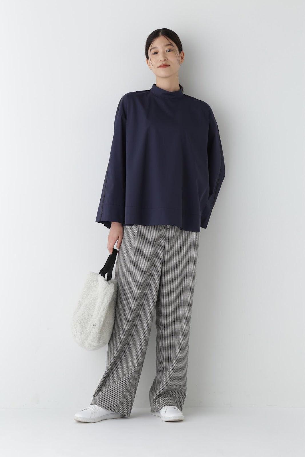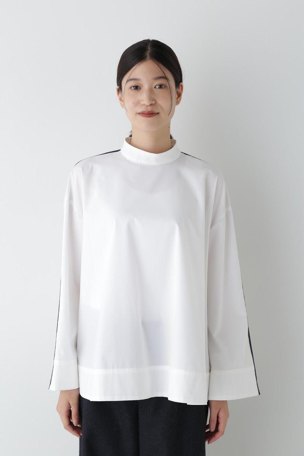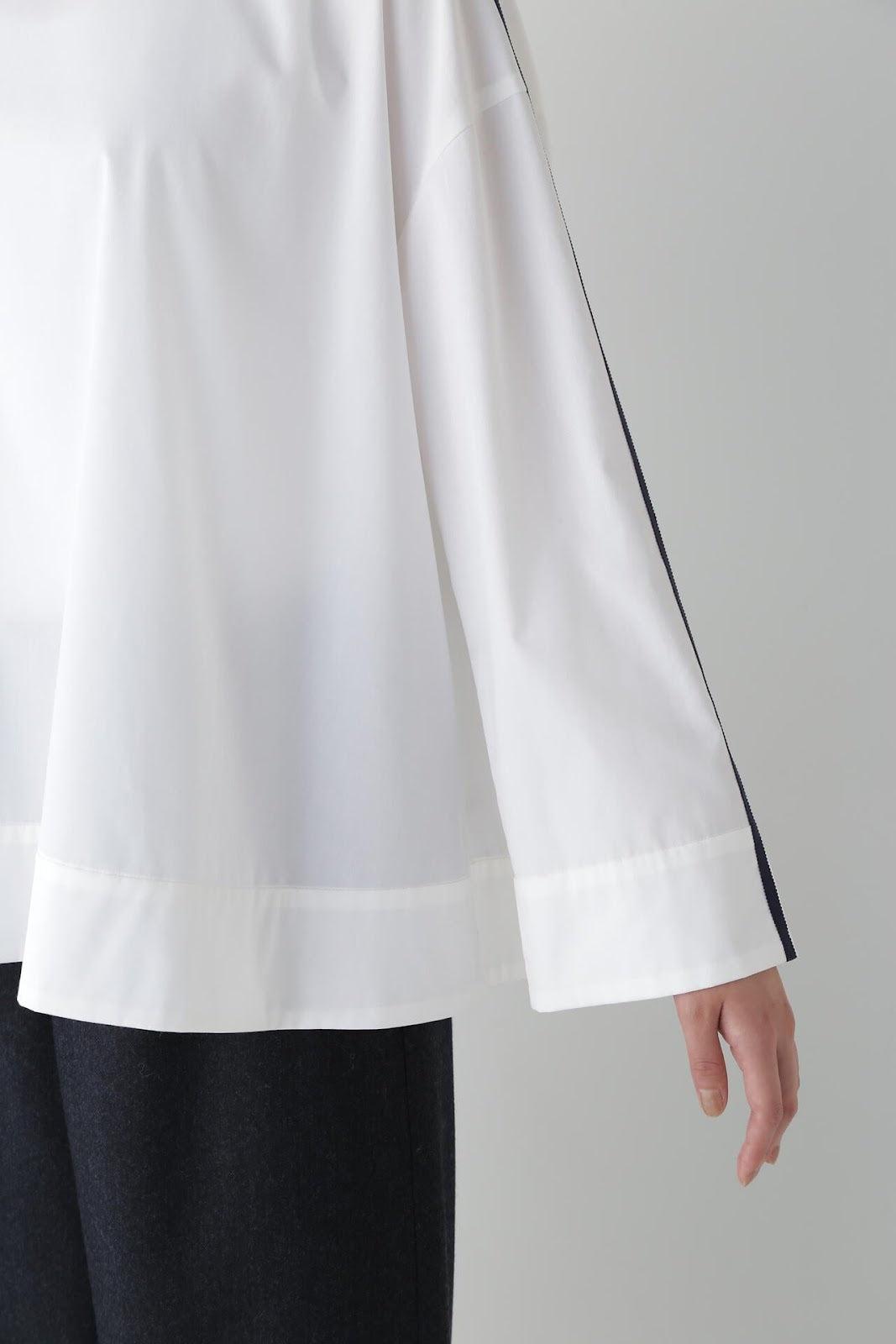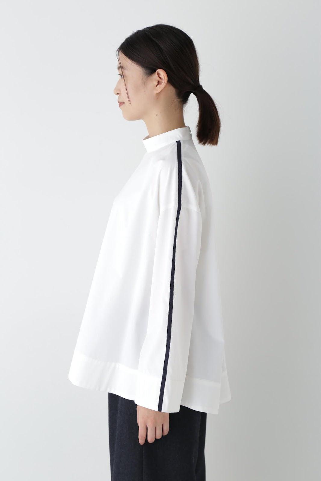 立領襯衫,線條醒目 [設計特色] 這是一款立領襯衫。從肩部到袖子的羅緞織帶線條使這款襯衫呈現出醒目的喇叭形輪廓。上衣採用滌綸混紡面料,抗皺性強,軟硬適中,材質美觀。建議搭配】上衣略長,建議外出時搭配衣服穿著。搭配修身或半寬鬆長褲都很合適。
