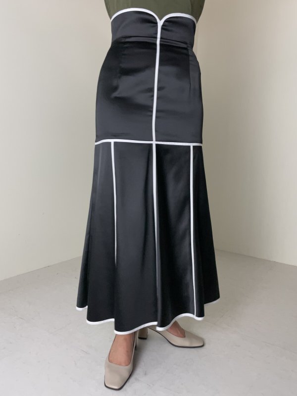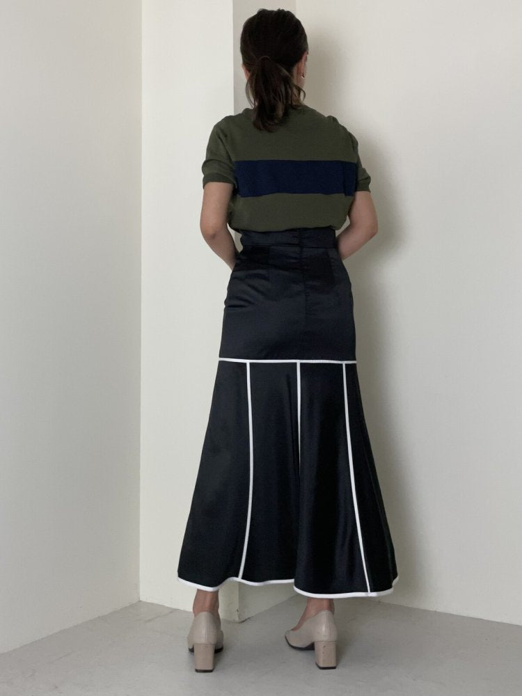 採用具有光澤和彈性的優雅面料製成。下襬隨著行走平穩擺動,但彈性保持了優美的輪廓。前腰的剪裁也是一個與眾不同的設計。後腰的鬆緊設計也是一大亮點,穿起來非常方便。腰部的剪裁和滾邊設計搭配簡單的上衣也很好看。