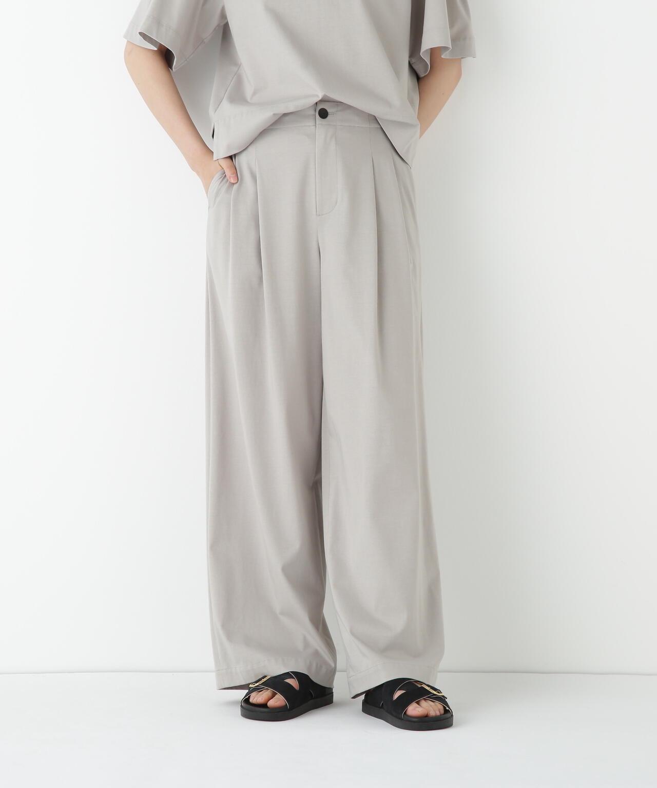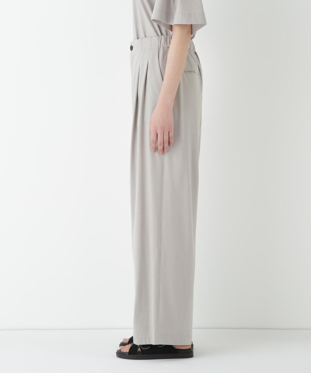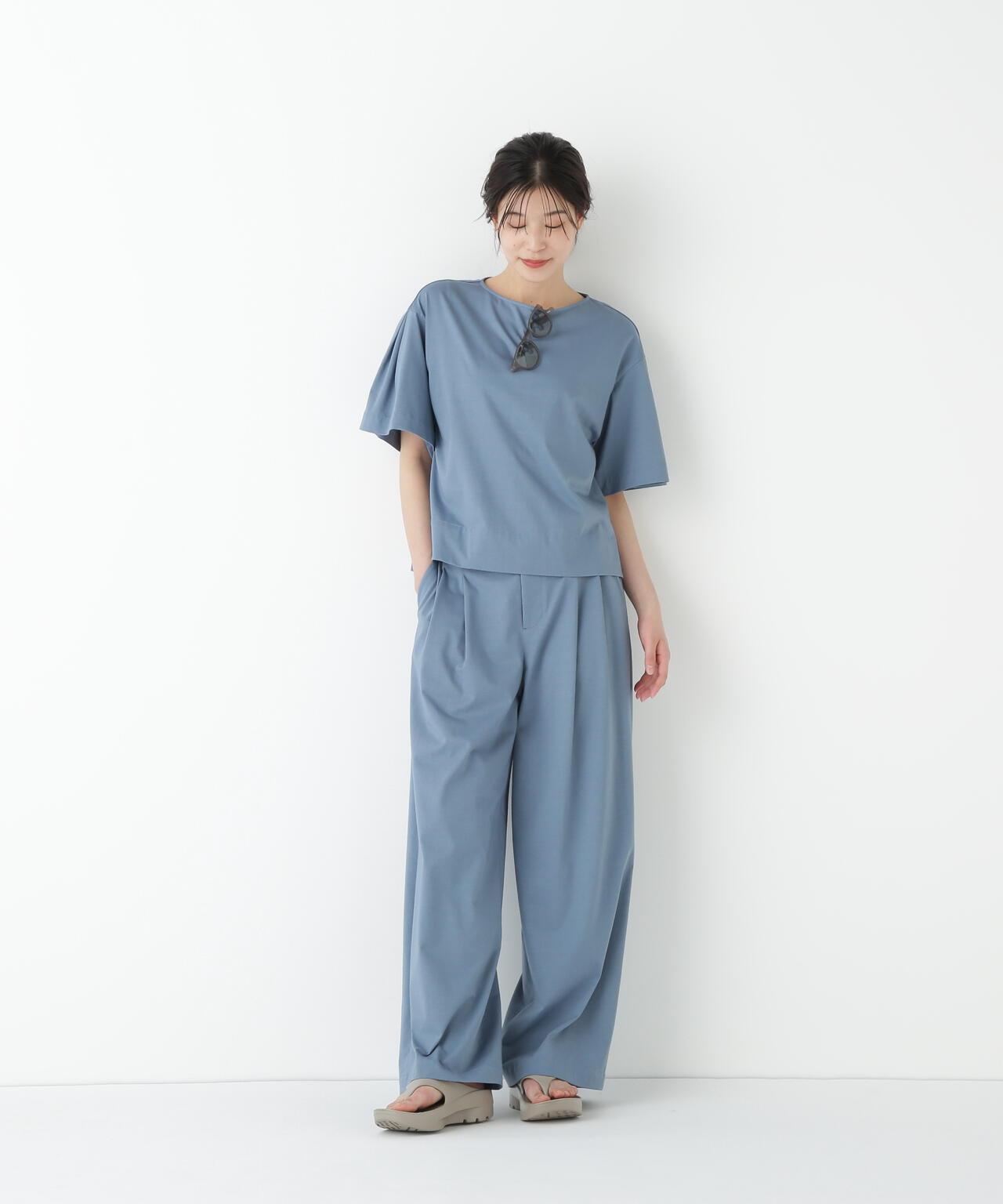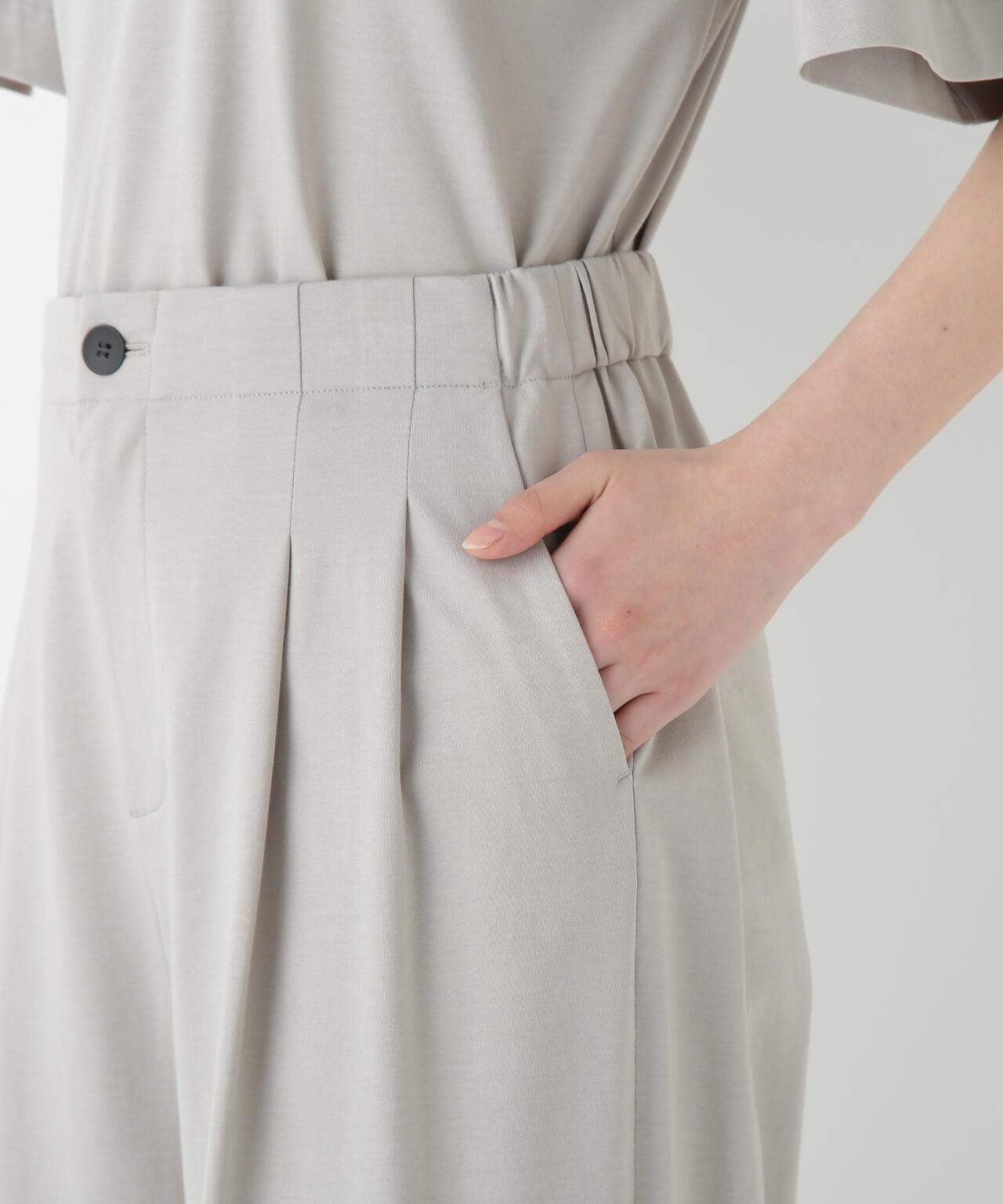 兼具簡潔外觀和舒適剪裁的半寬長褲 [設計特點] 雙襉半寬長褲的輪廓給人一種皮膚分離的感覺。腰部配有腰帶,外觀簡潔。面料採用有機鍍棉針織布與回收聚酯混紡製成,既有梭織面料的彈力,又有針織布的舒適。這種面料還具有可持續發展和接觸冷卻的特性。推薦搭配:與同材質的套頭衫搭配。單穿也非常適合。