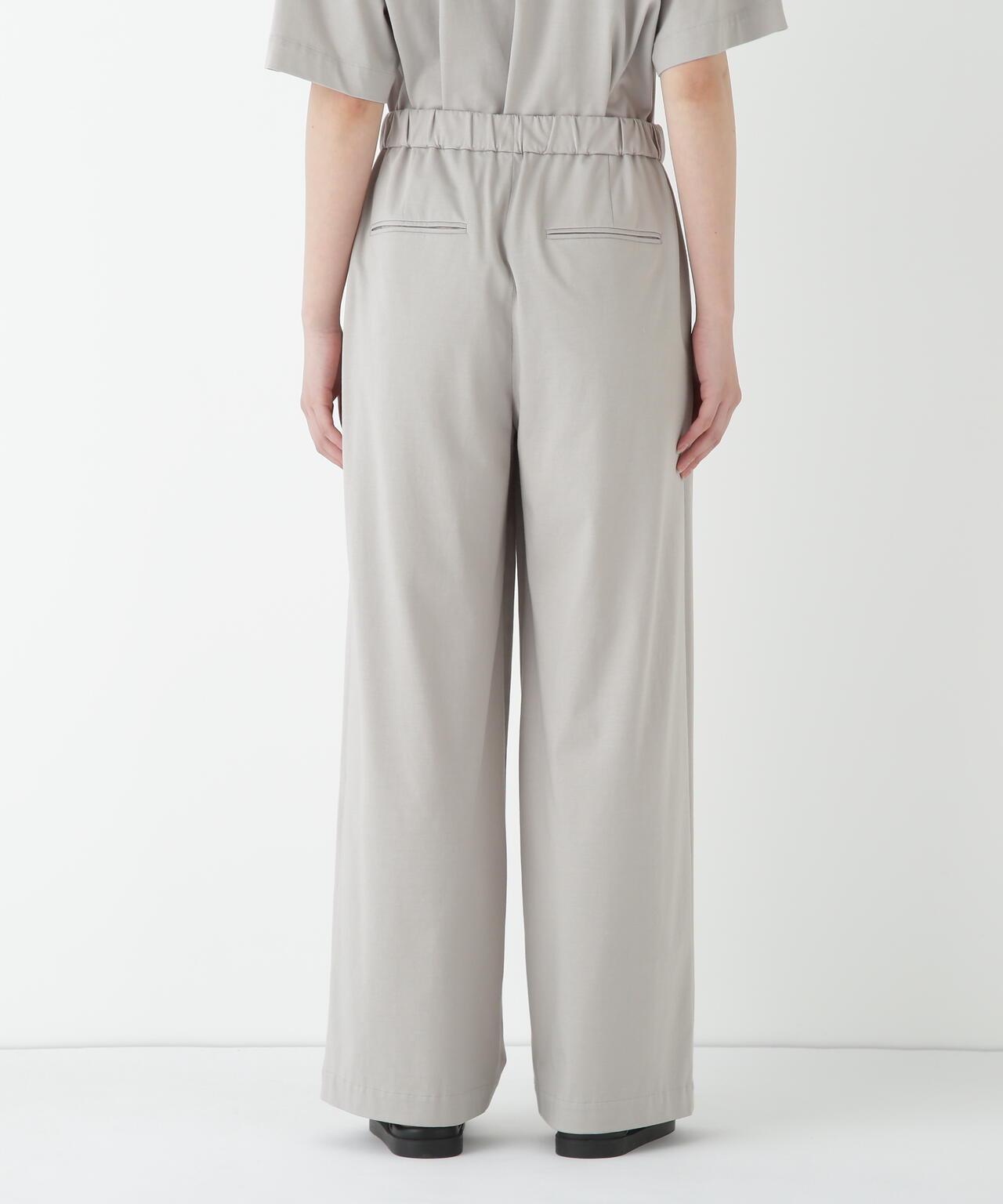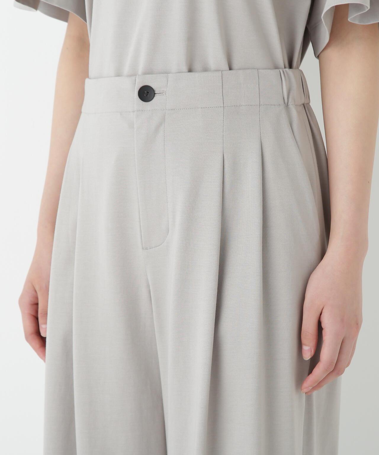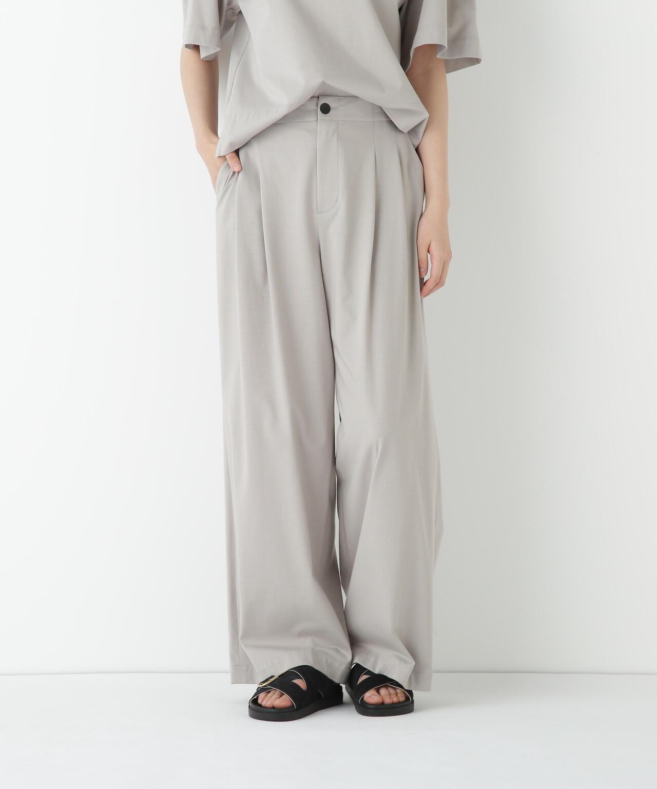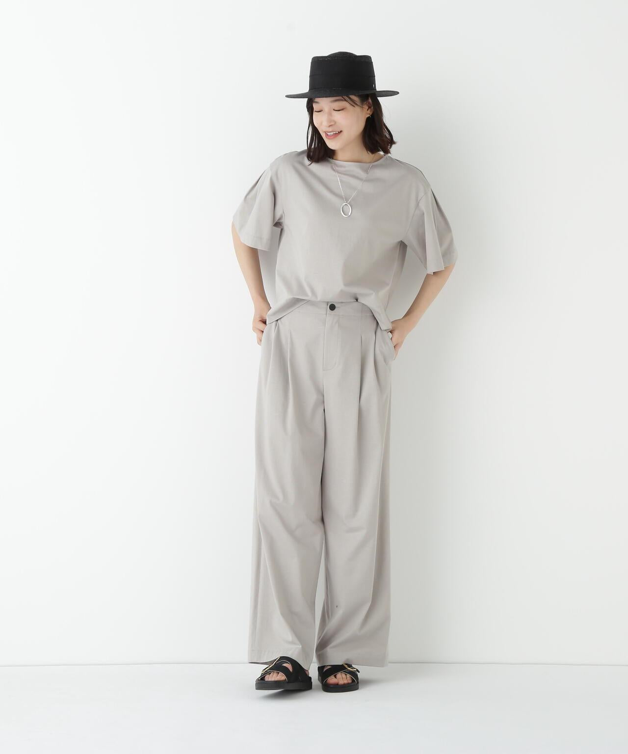 兼具簡潔外觀和舒適剪裁的半寬長褲 [設計特點] 雙襉半寬長褲的輪廓給人一種皮膚分離的感覺。腰部配有腰帶,外觀簡潔。面料採用有機鍍棉針織布與回收聚酯混紡製成,既有梭織面料的彈力,又有針織布的舒適。這種面料還具有可持續發展和接觸冷卻的特性。推薦搭配:與同材質的套頭衫搭配。單穿也非常適合。