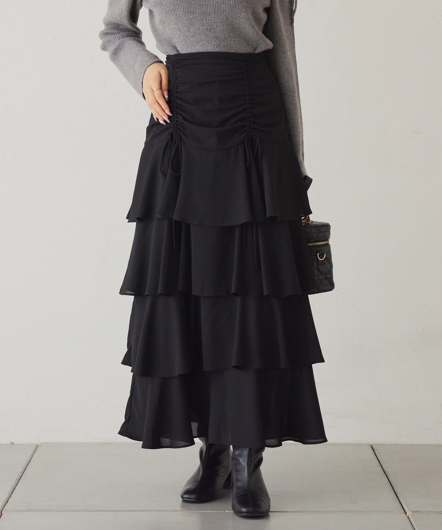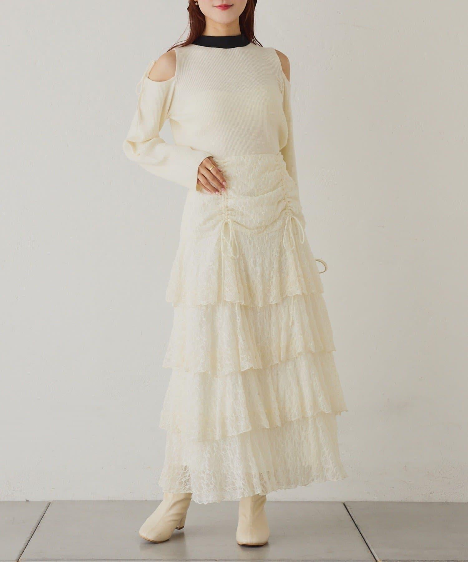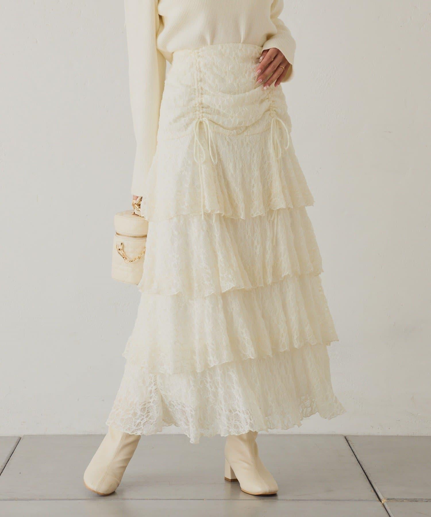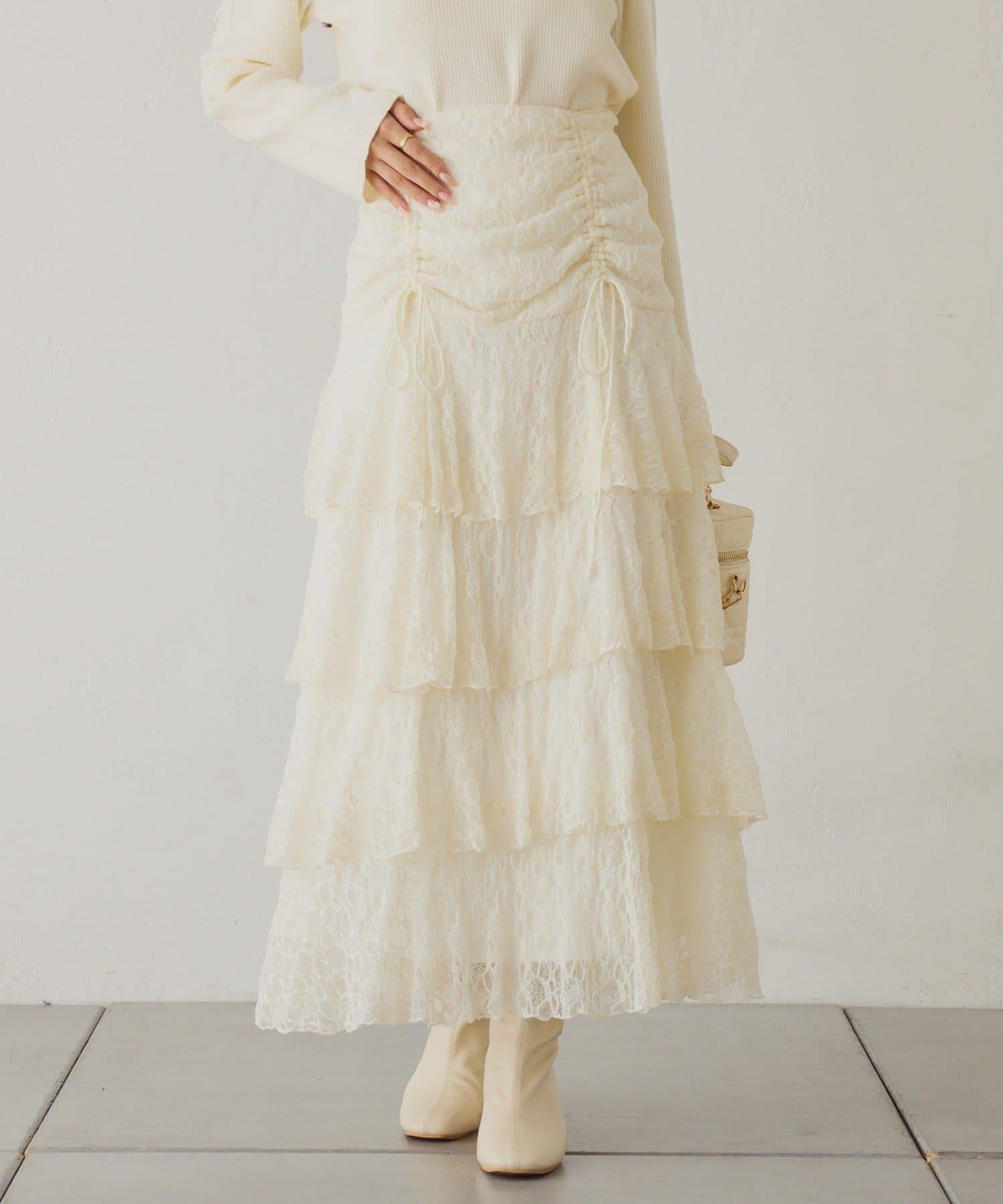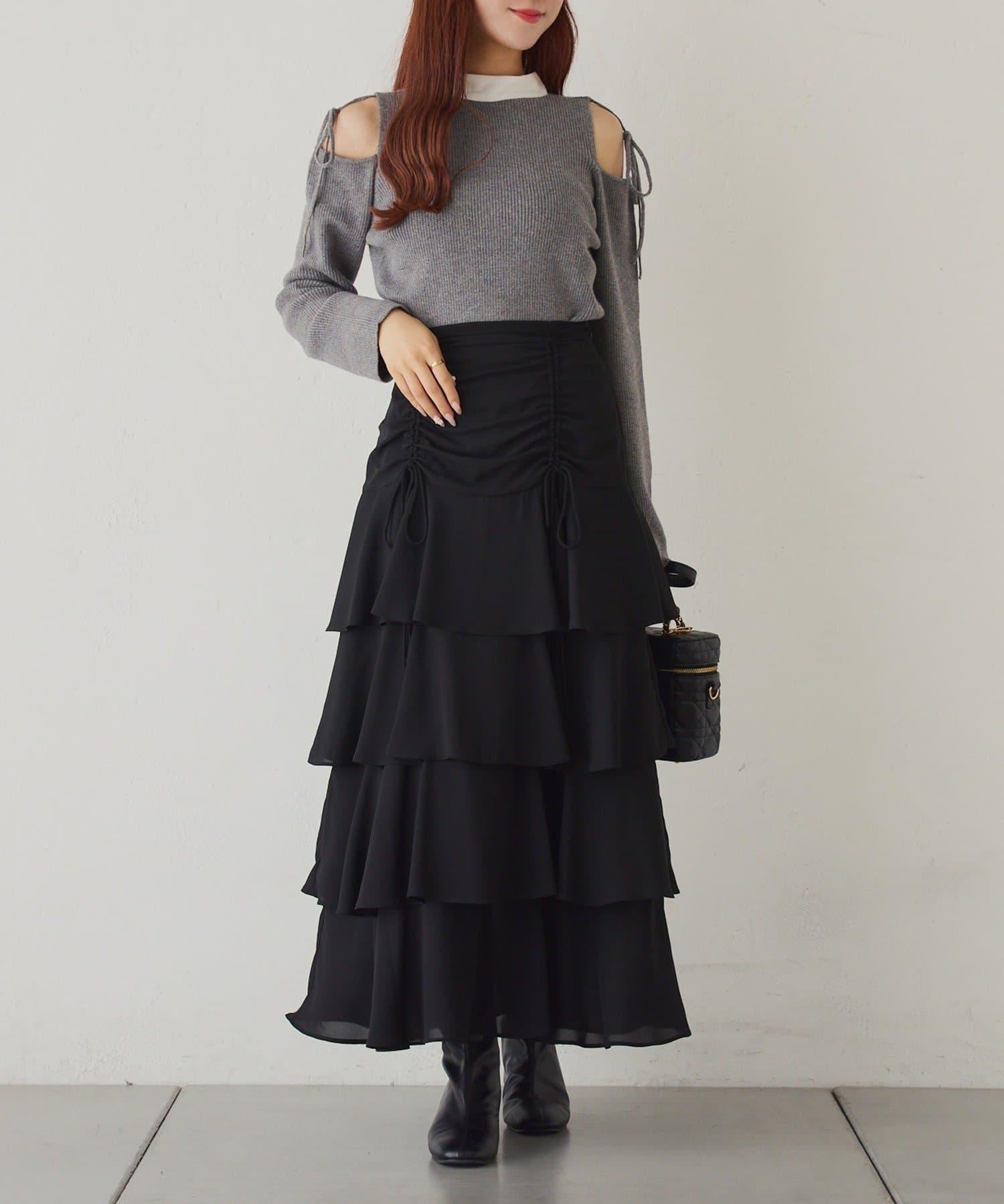 層層疊疊的裙襬上飾有大量荷葉邊,抽繩設計隨你的一舉一動而搖擺。