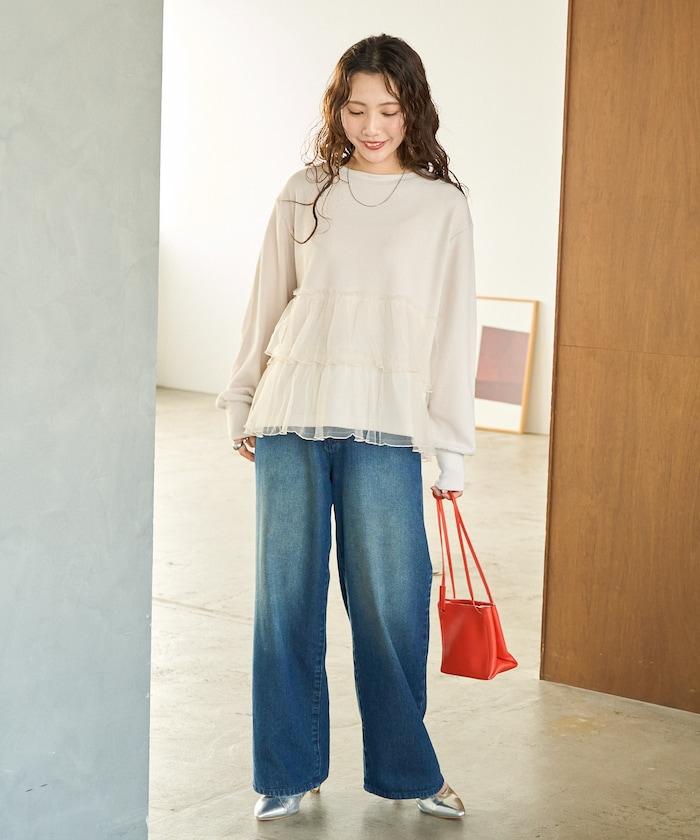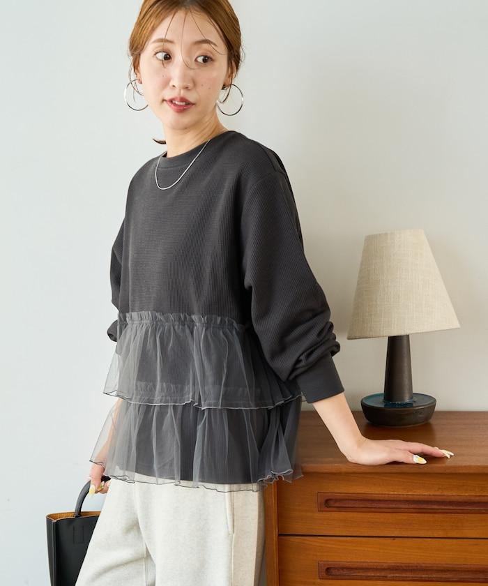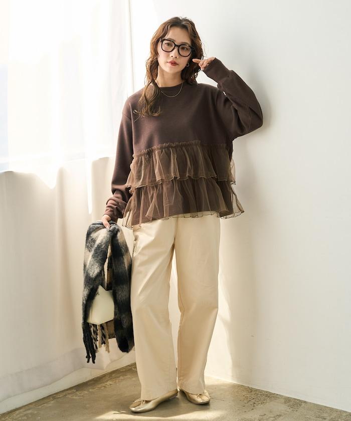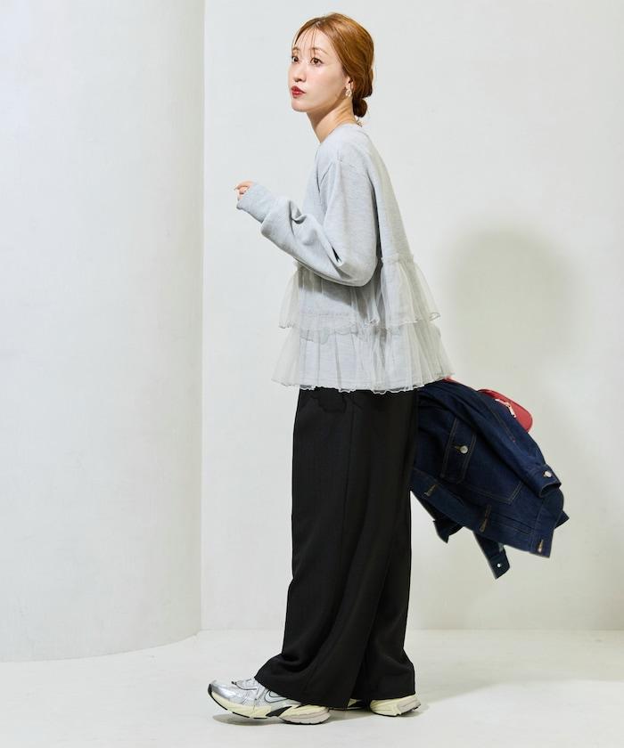 如果搭配長裙或喇叭裙,薄紗的魅力就會凸顯出來,營造出女性化的印象。腳上穿著運動鞋,則更顯休閒。