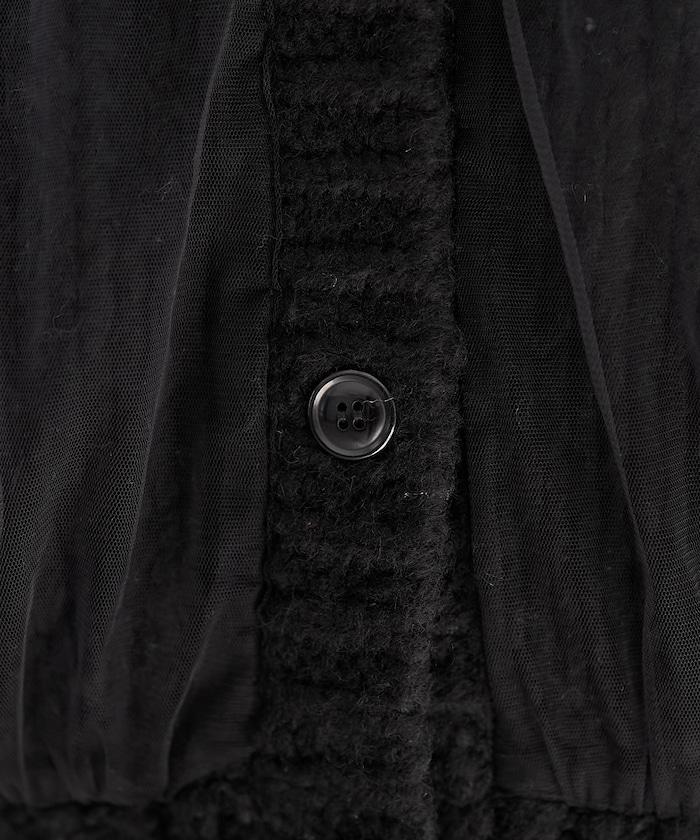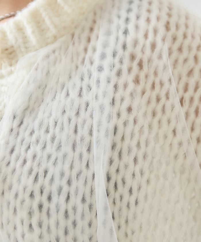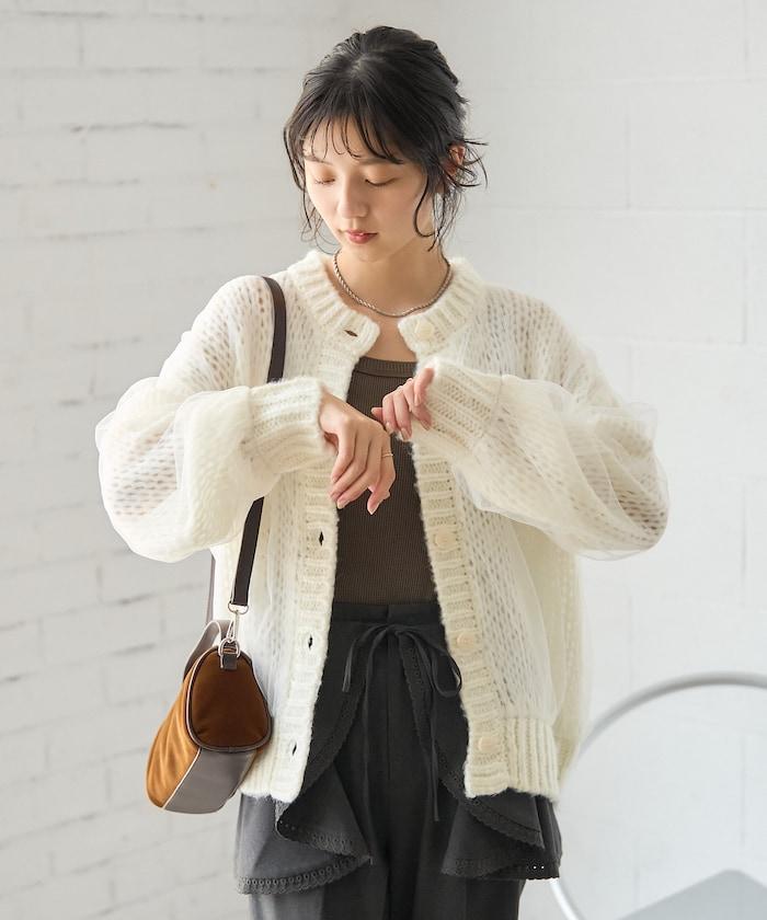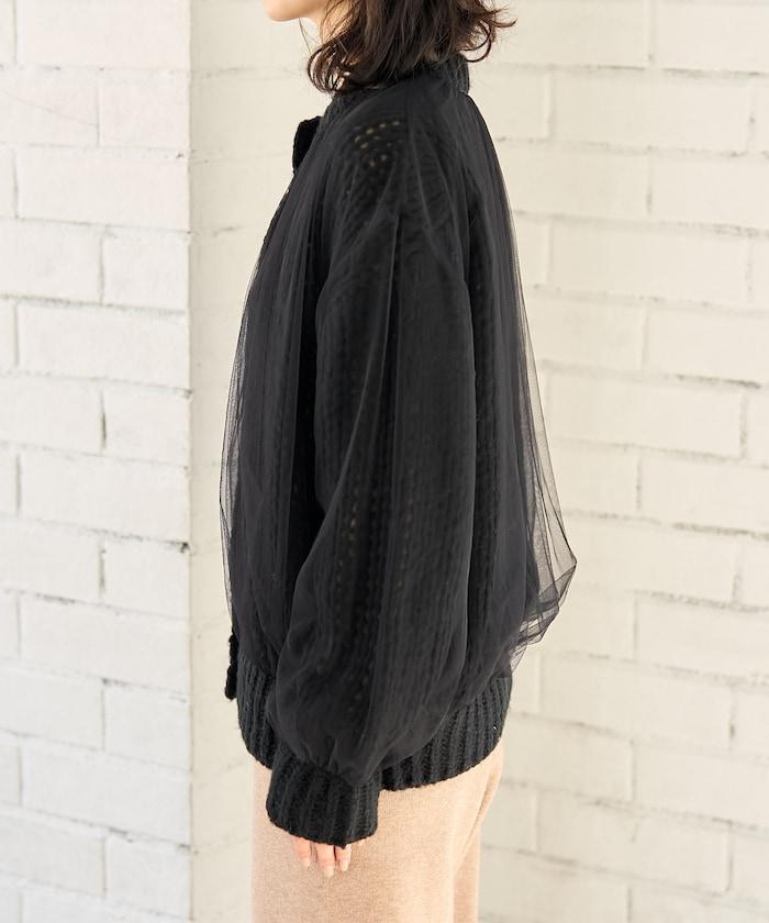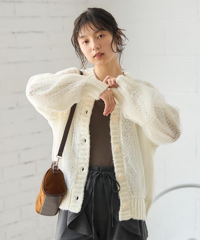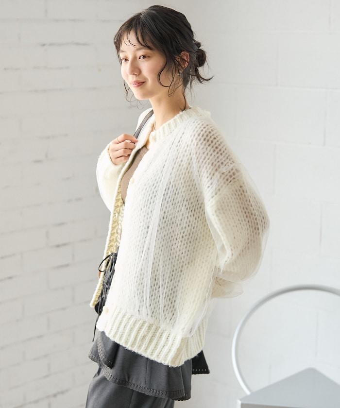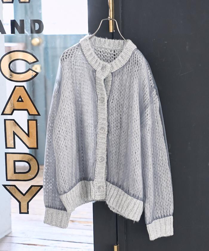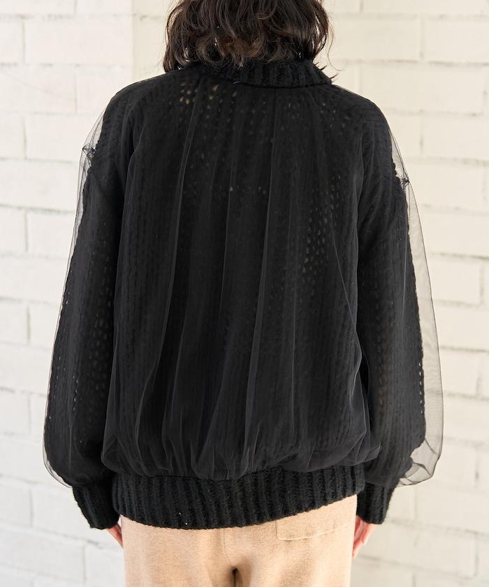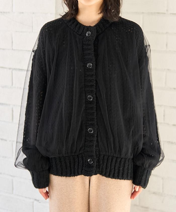 低針距針織和透明薄紗對接的開衫。
