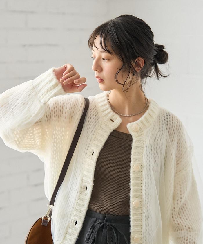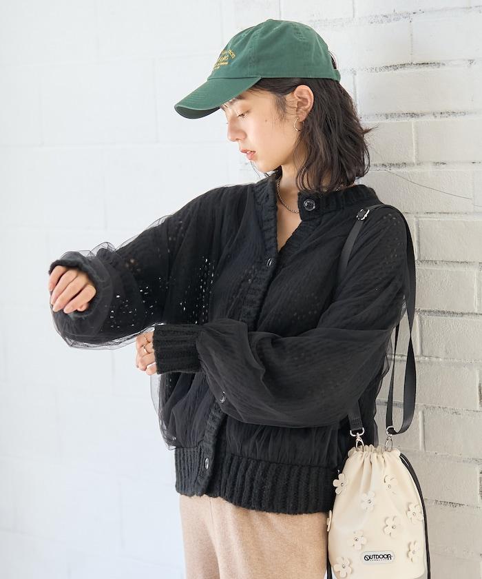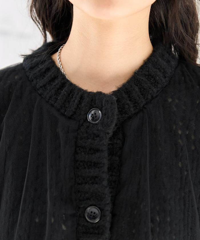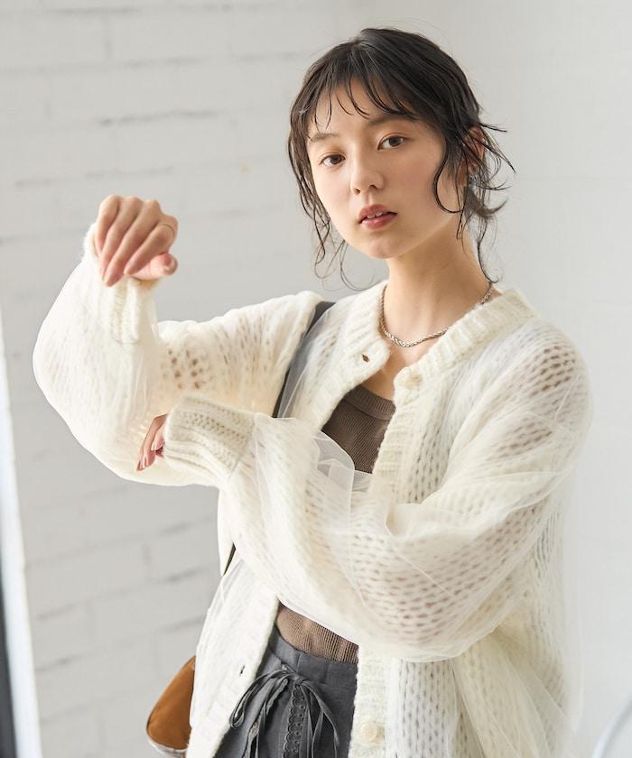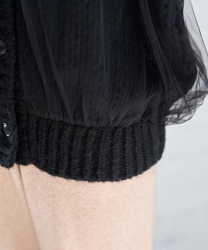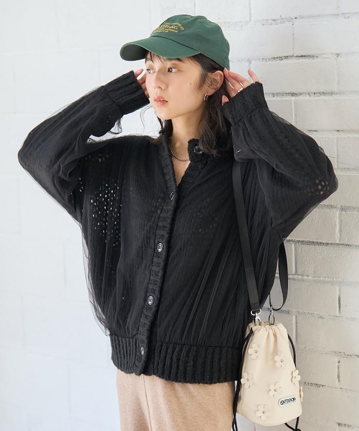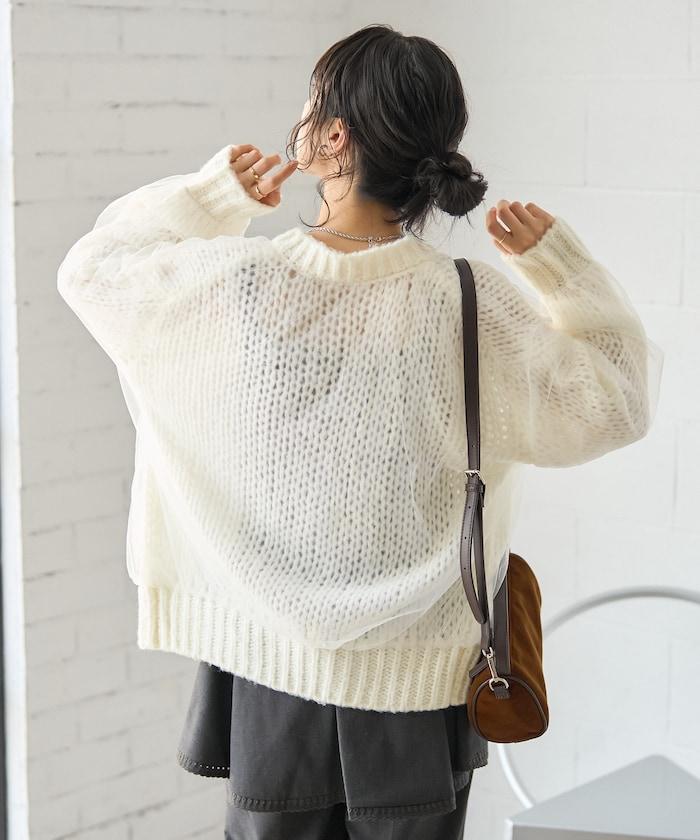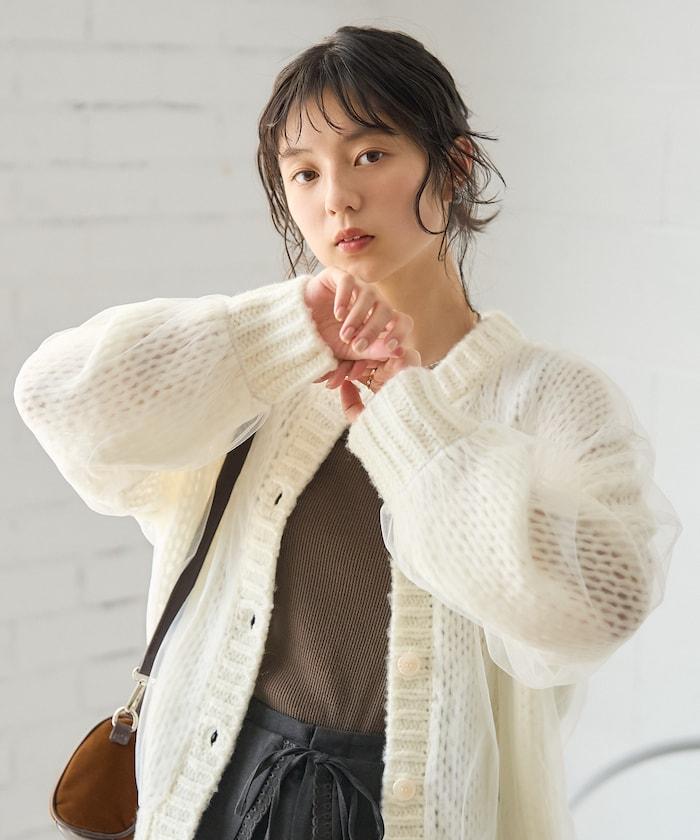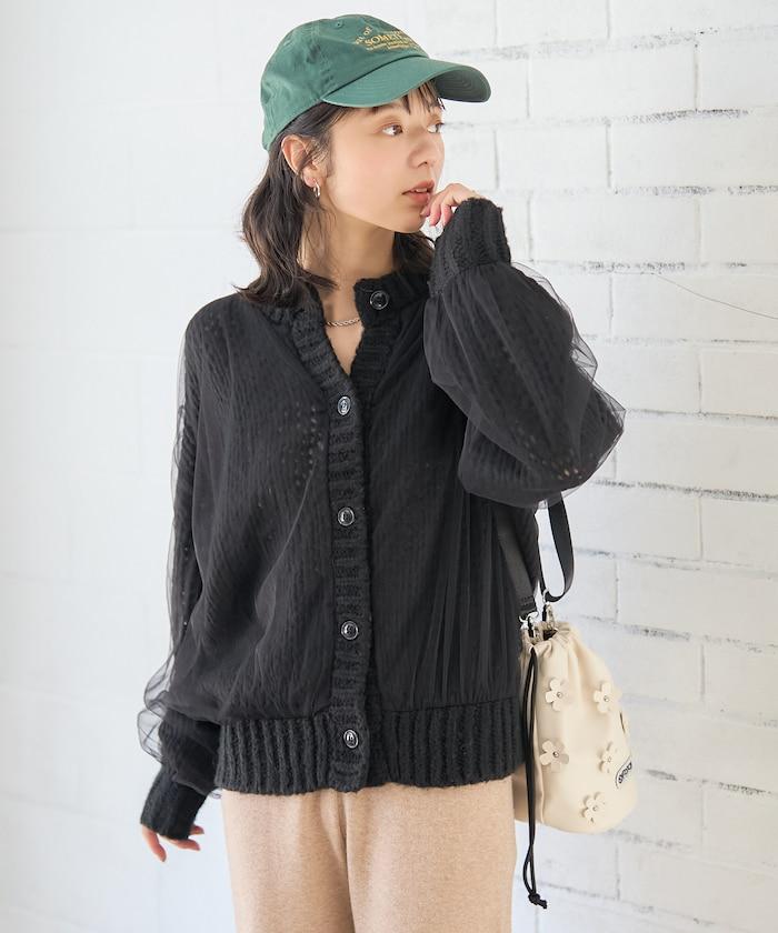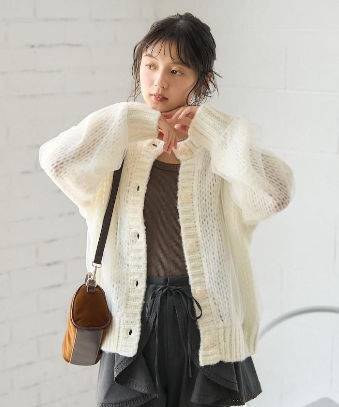 低針距針織和透明薄紗對接的開衫。