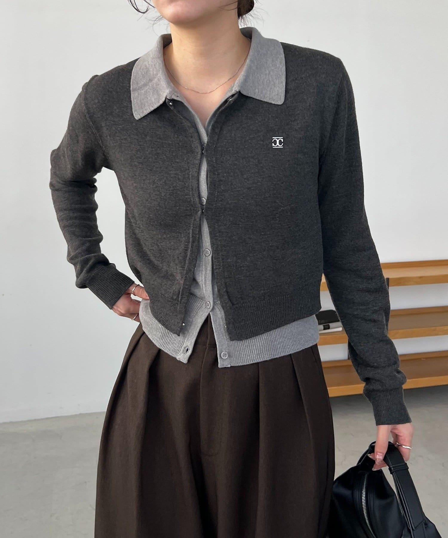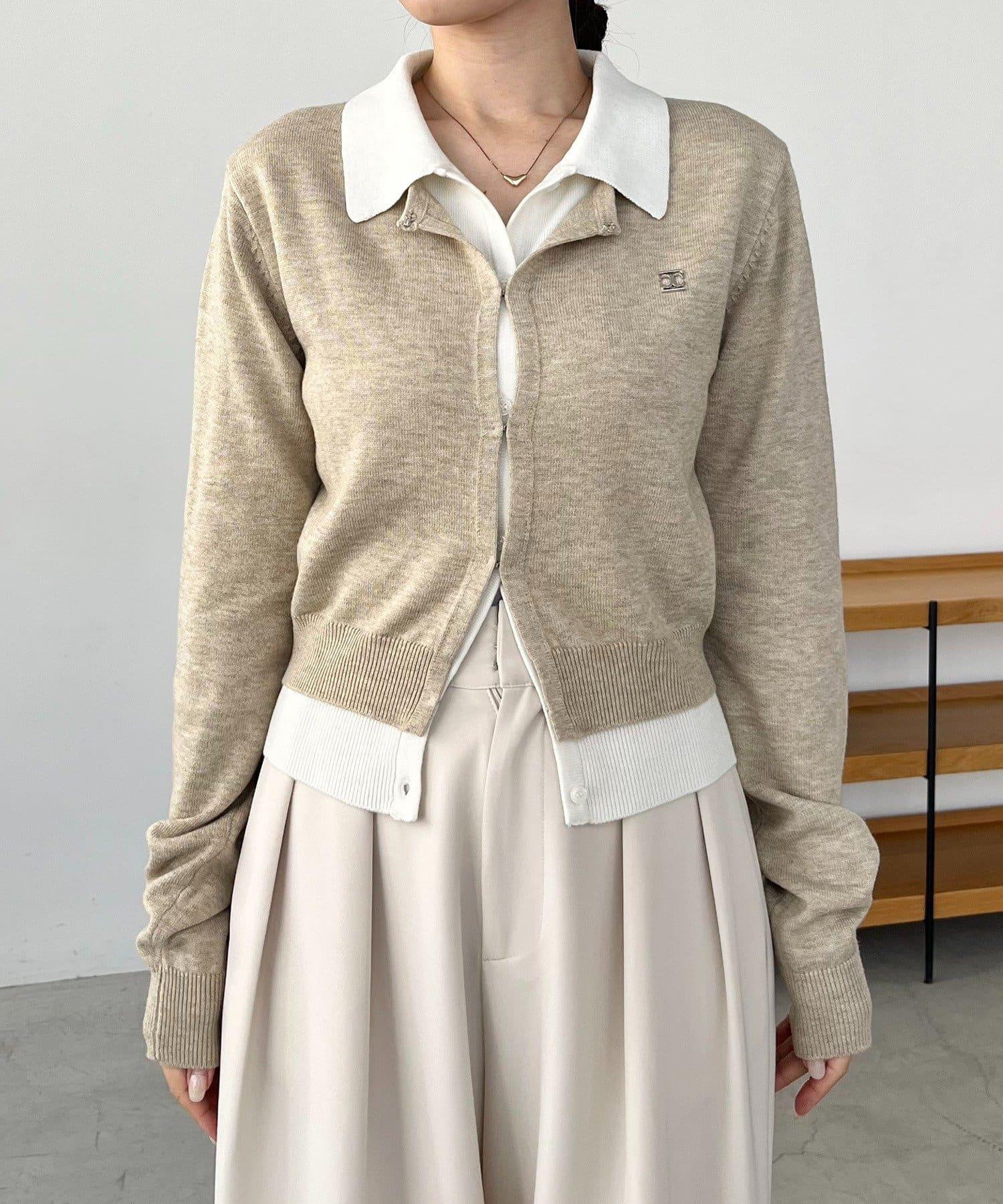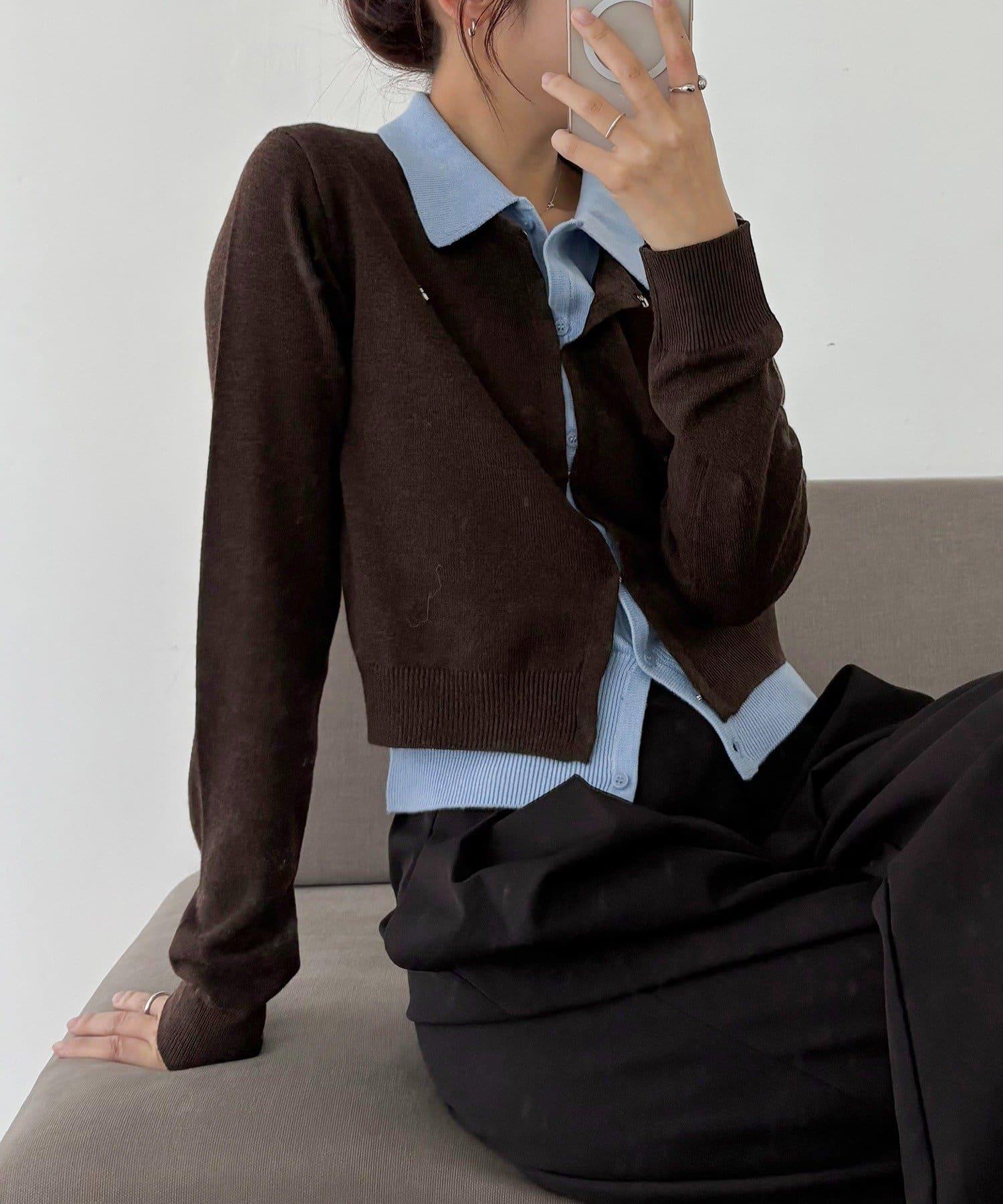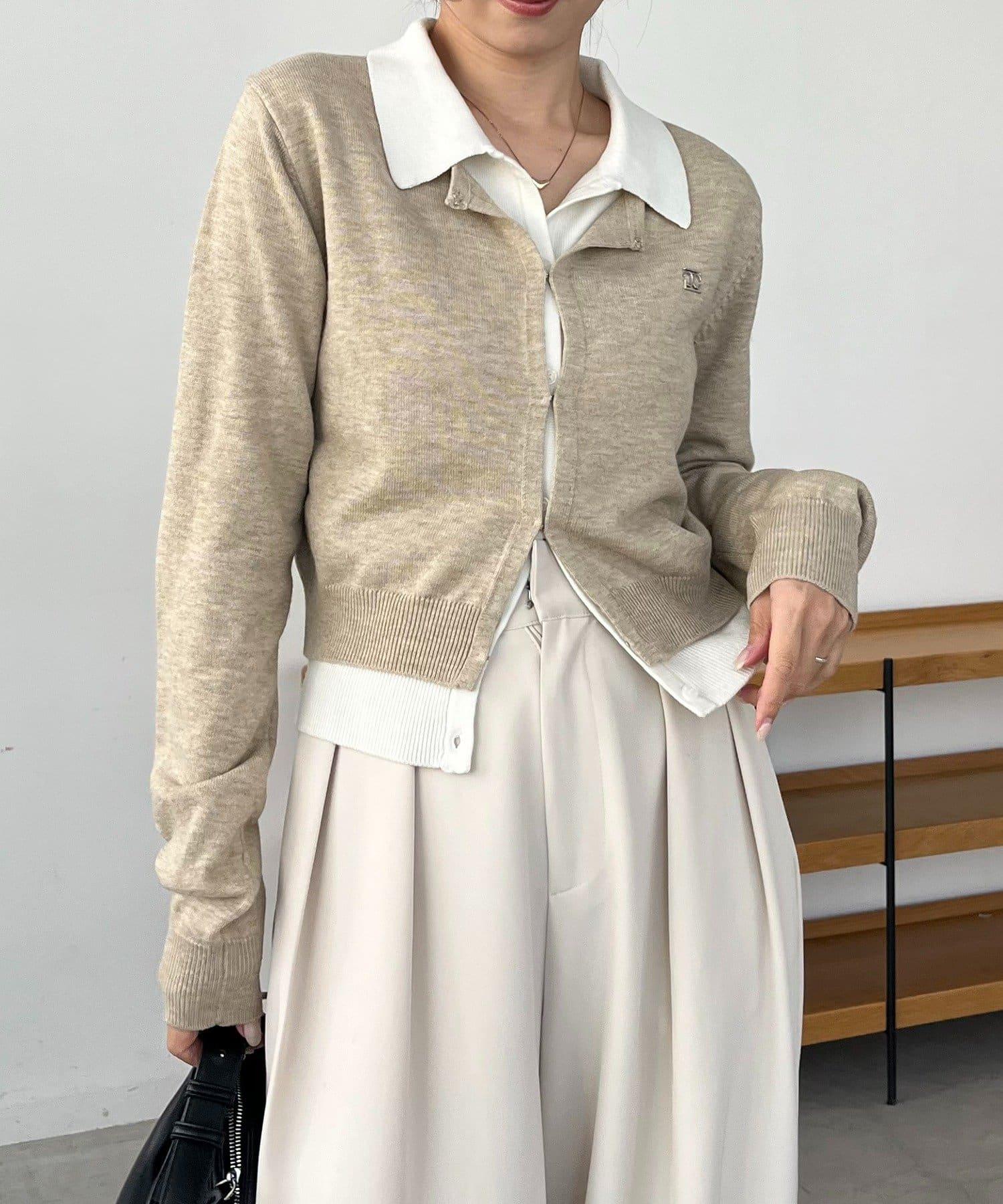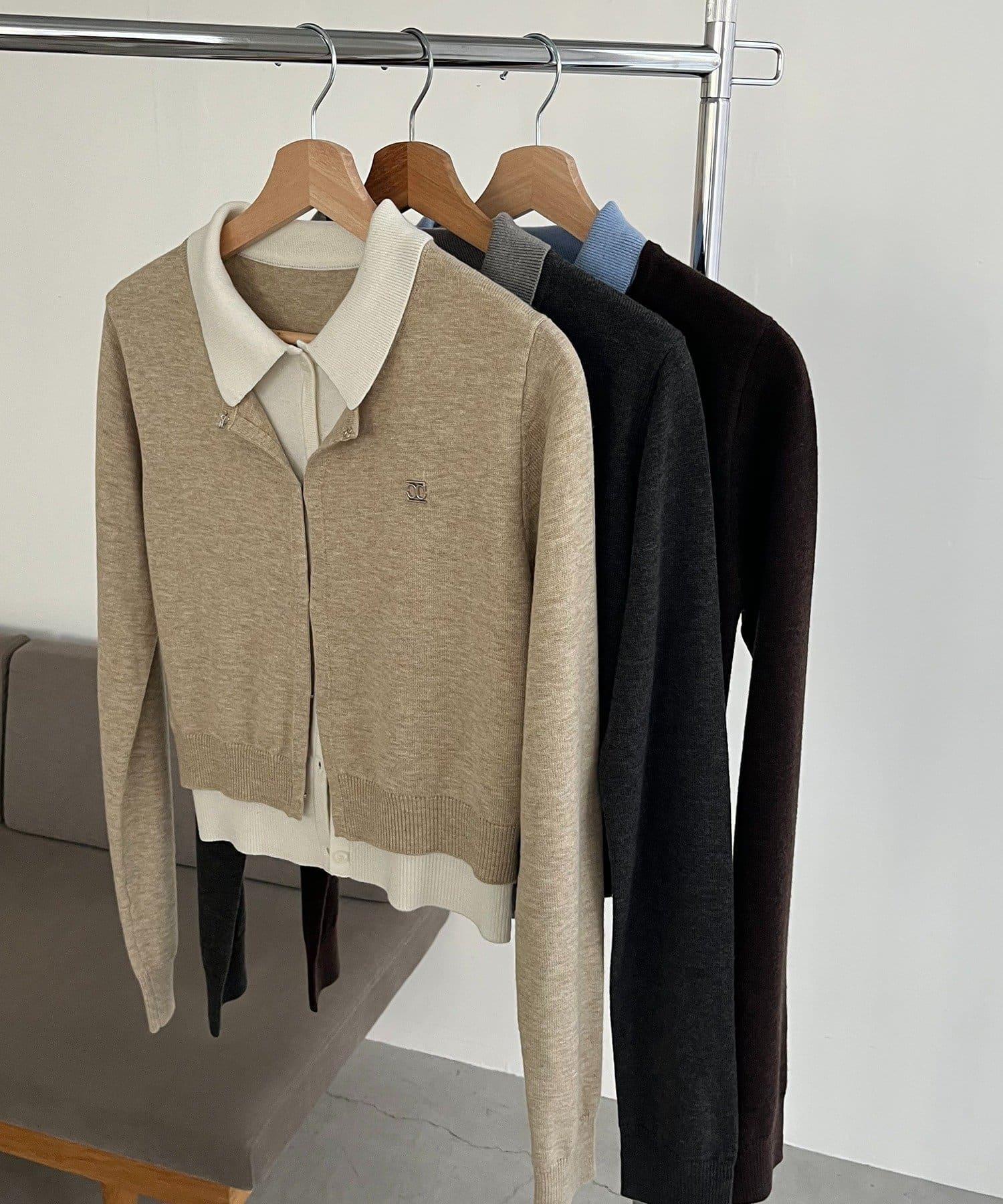在有領針織衫上疊加鉤扣開衫的正裝單品。
