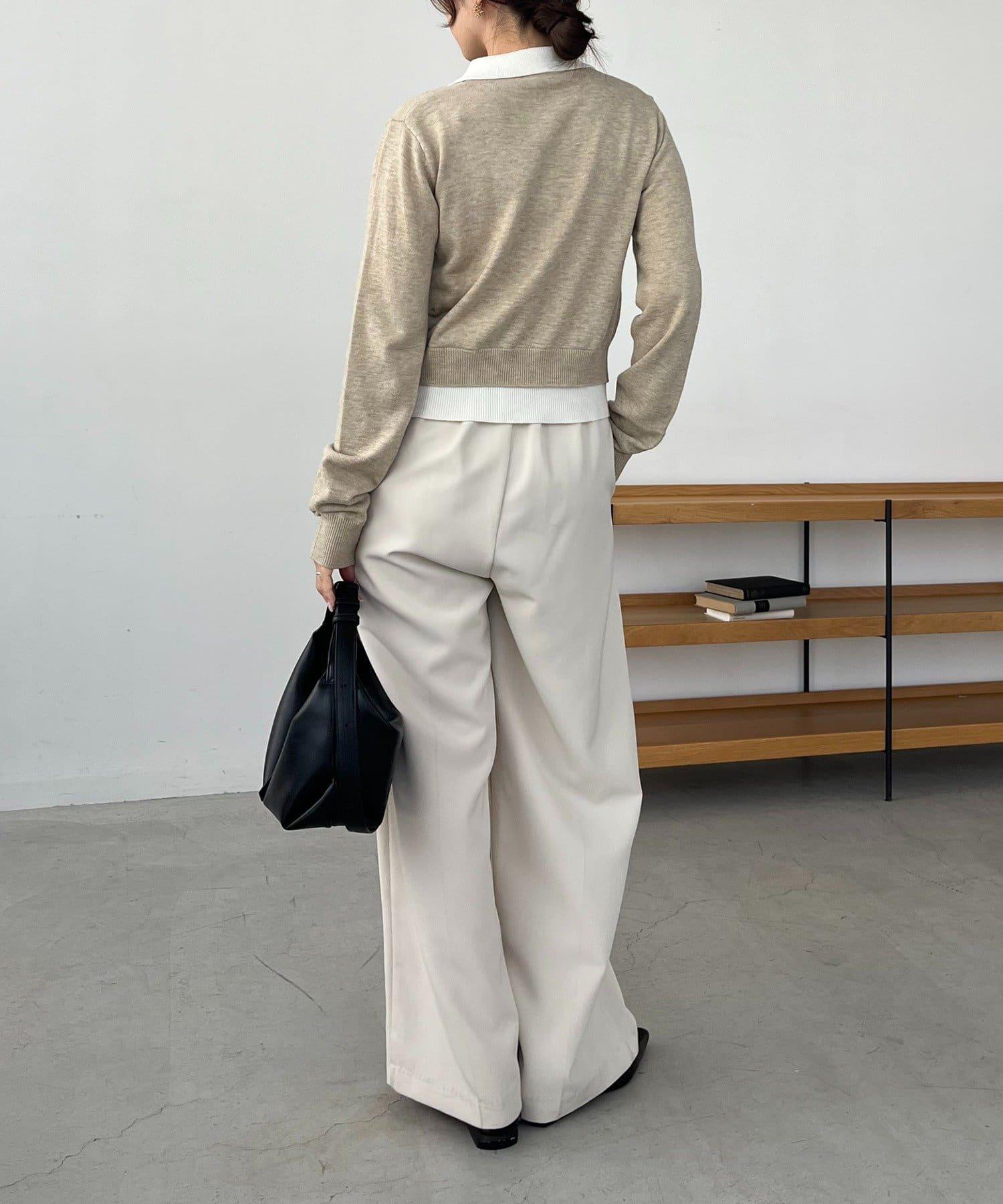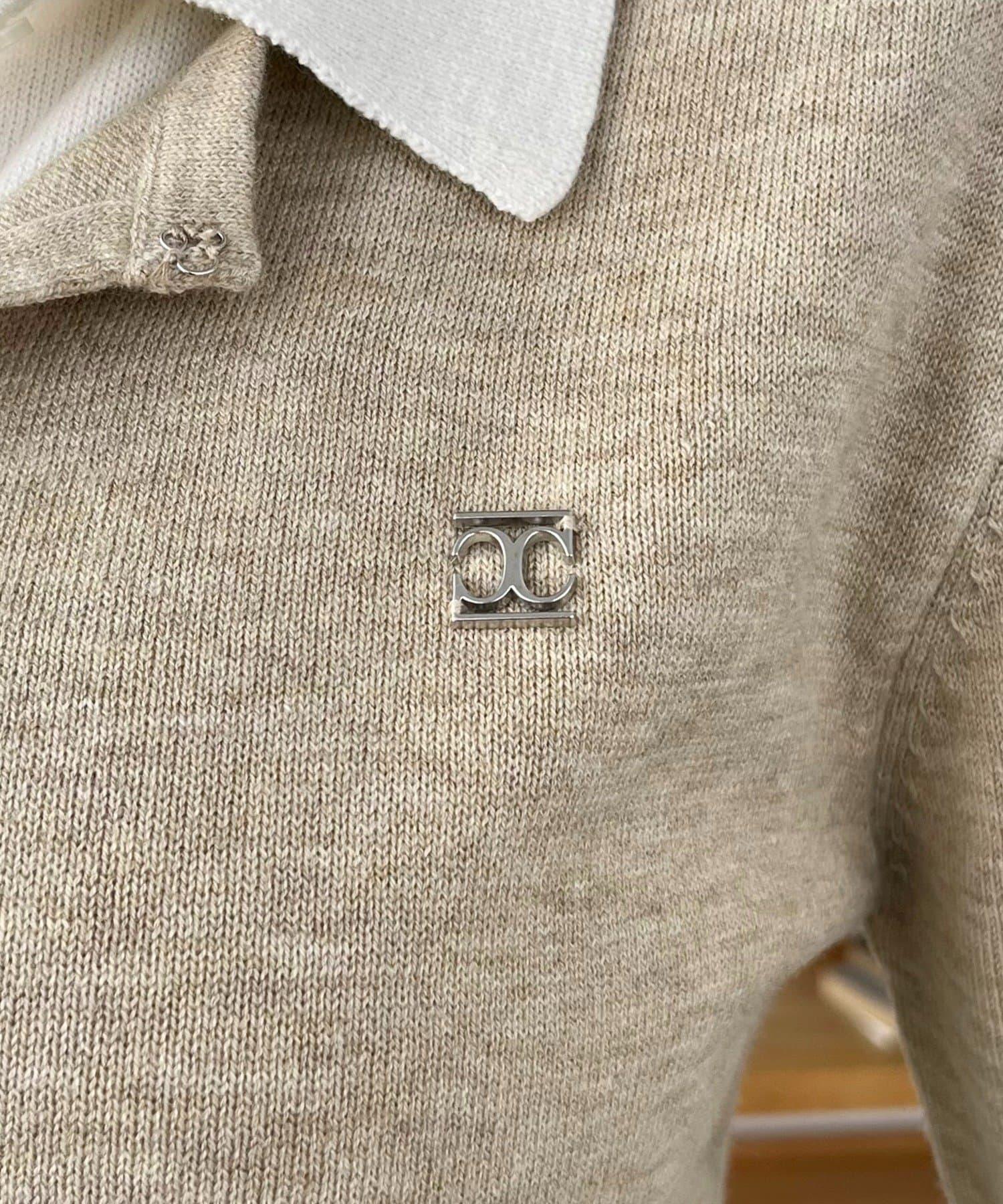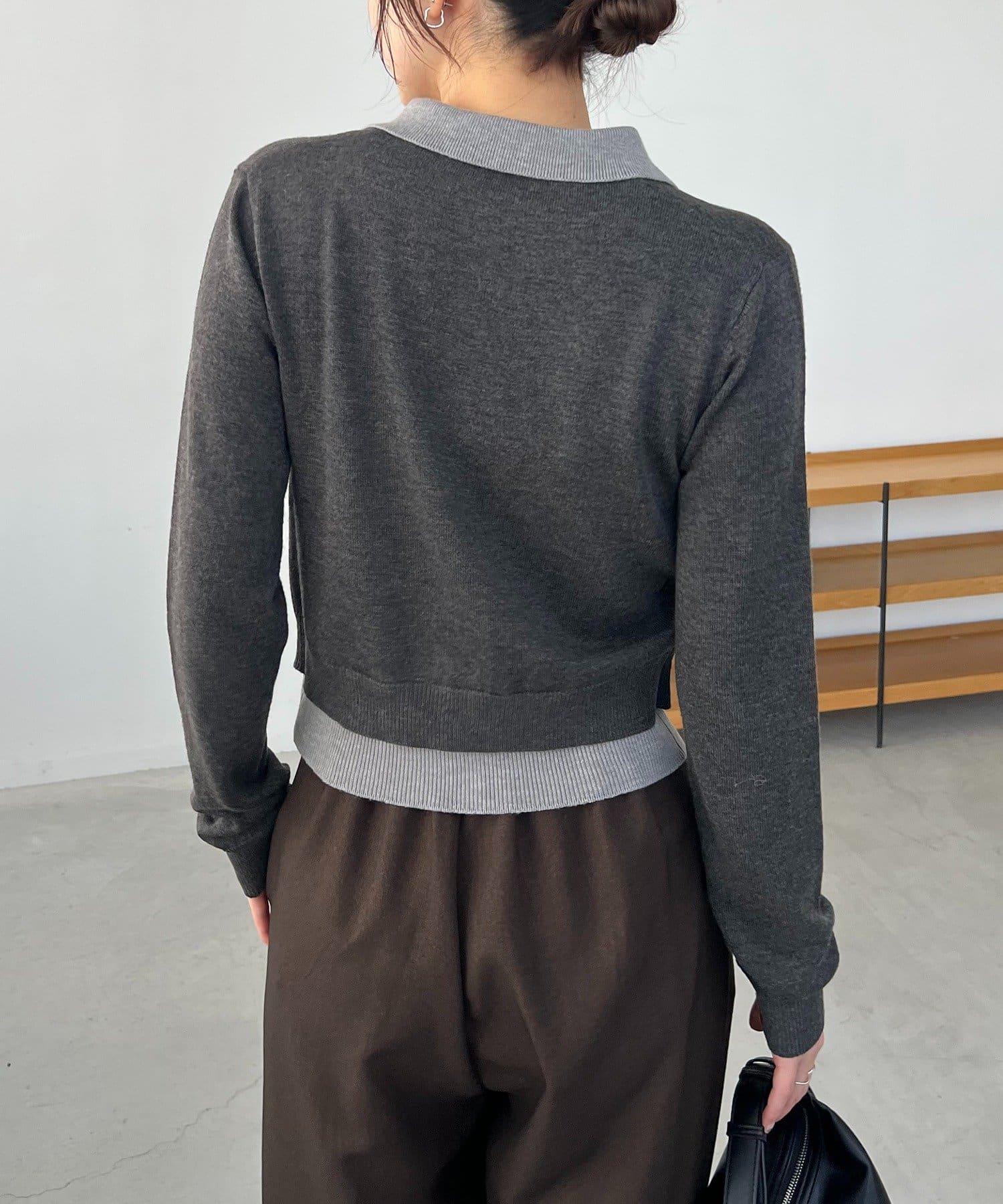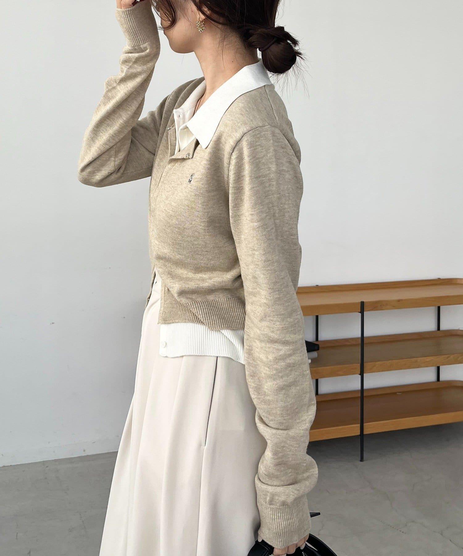 在有領針織衫上疊加鉤扣開衫的正裝單品。