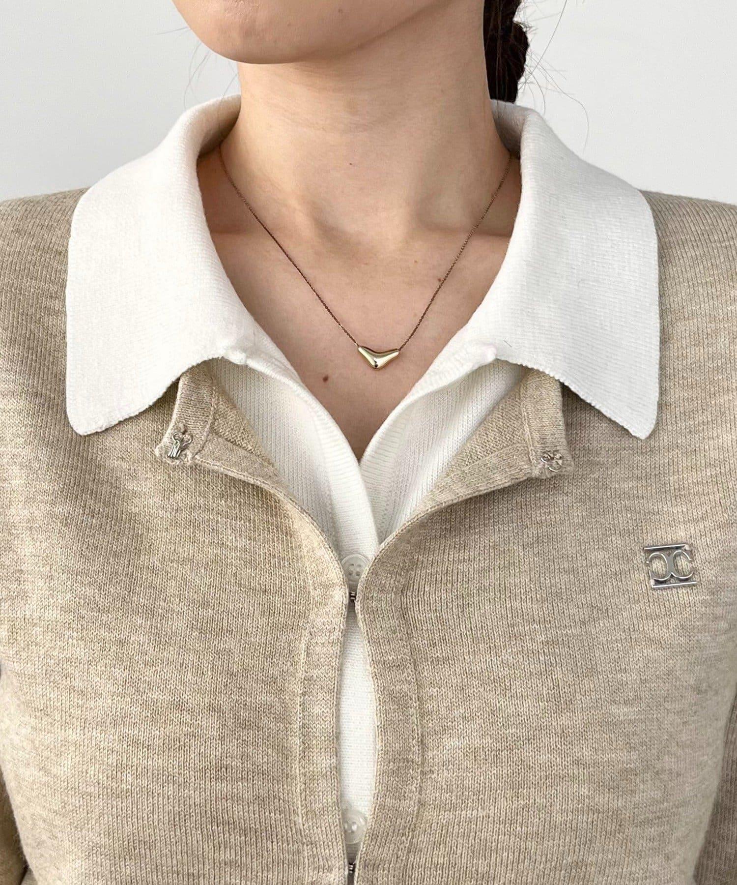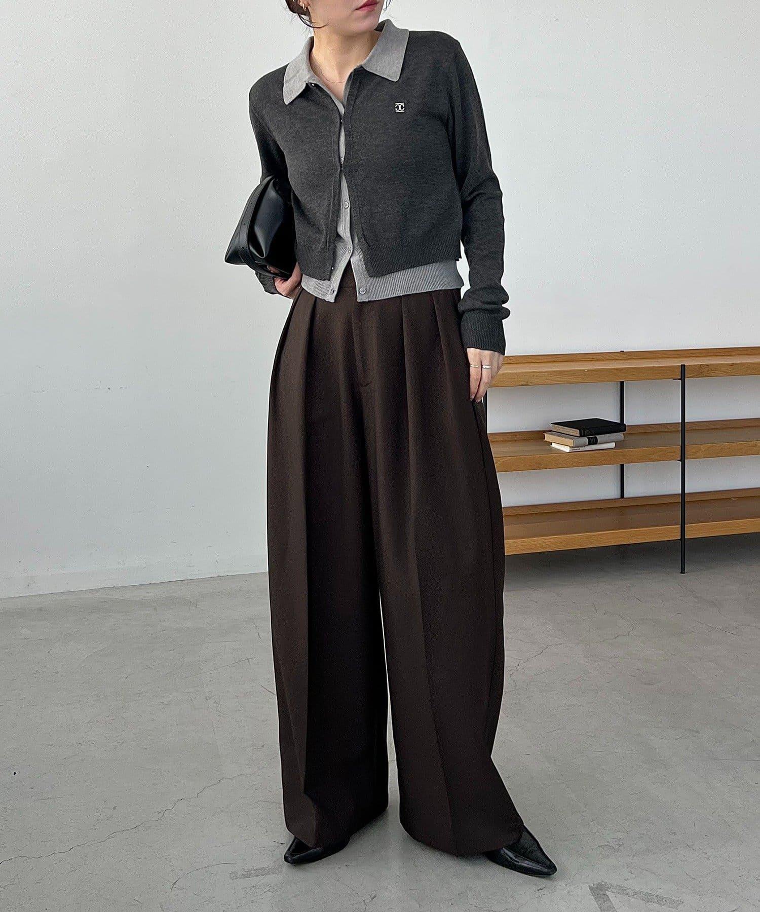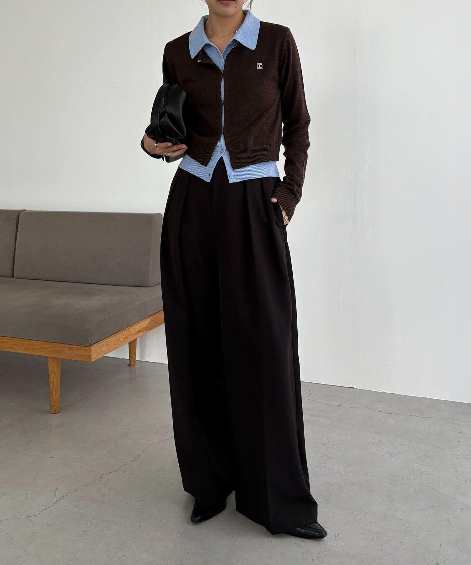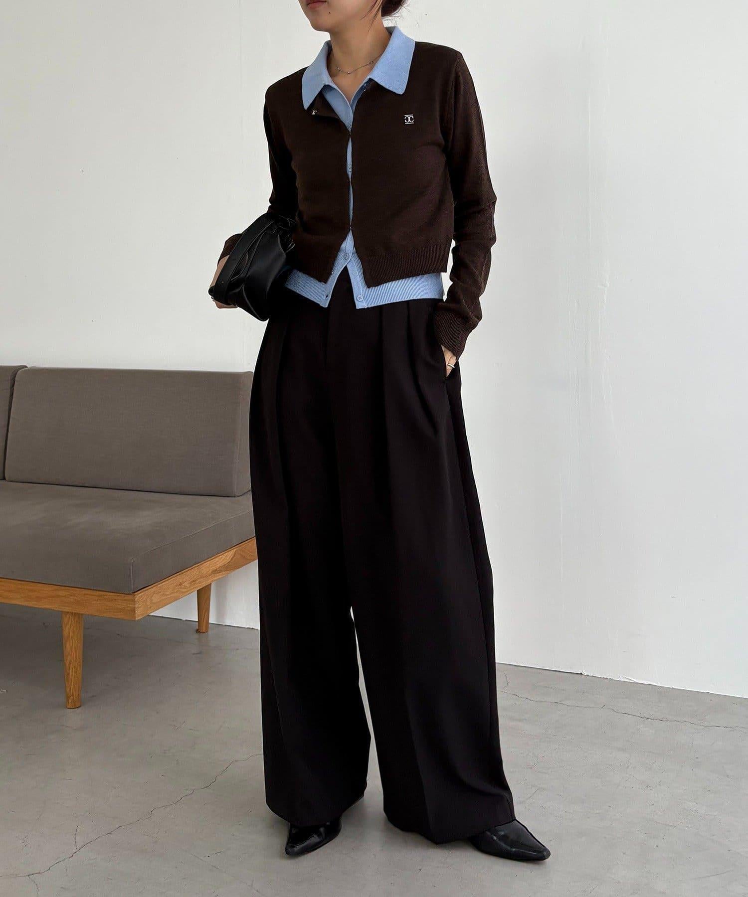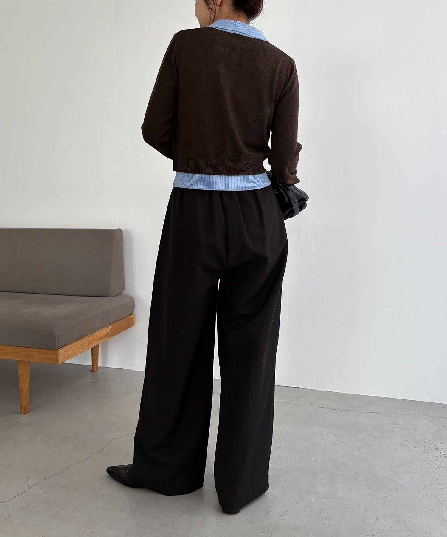 在有領針織衫上疊加鉤扣開衫的正裝單品。