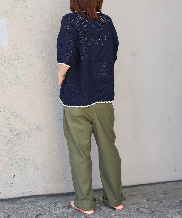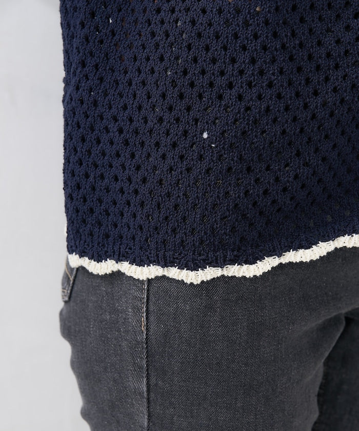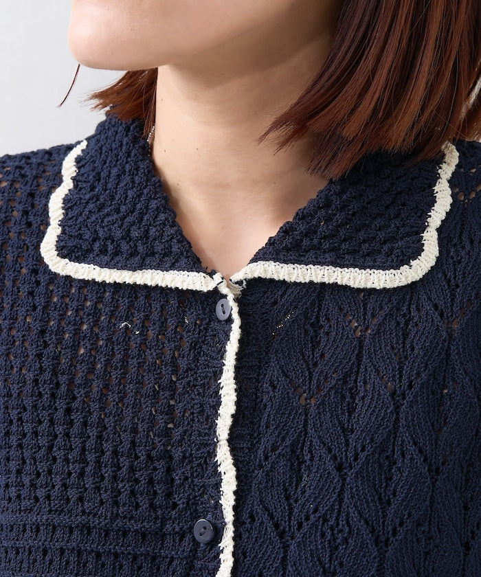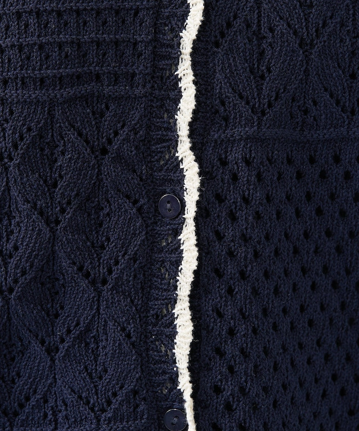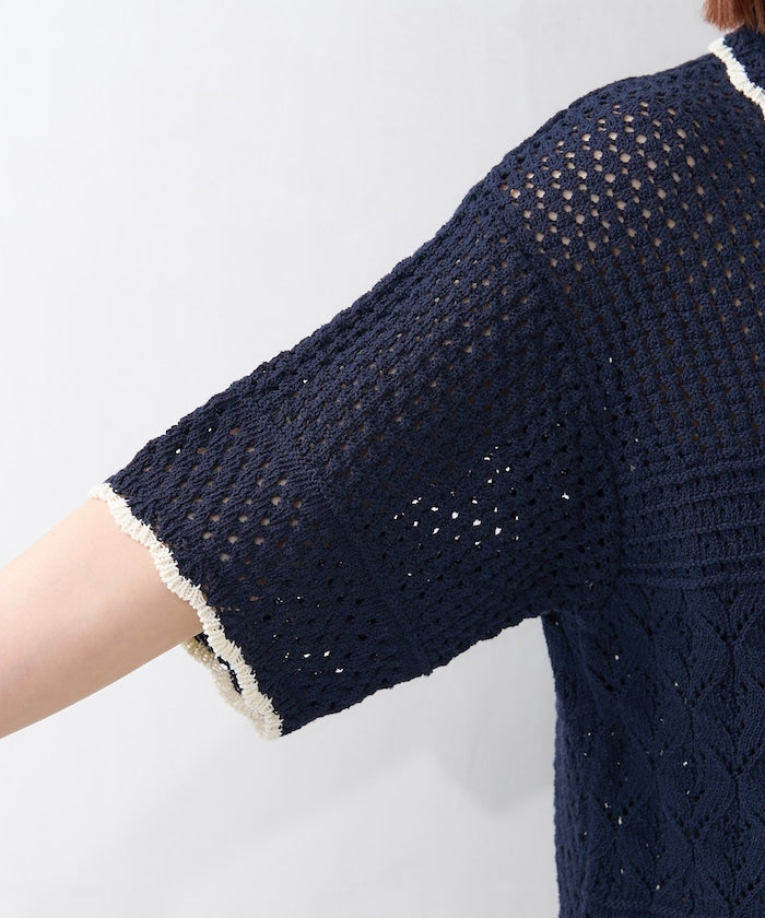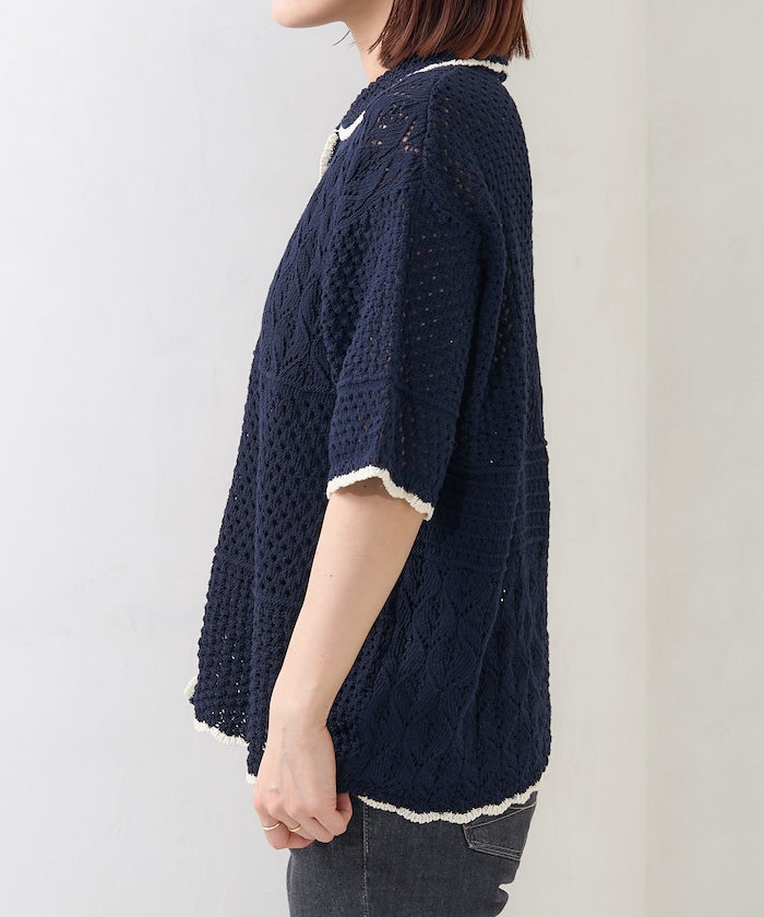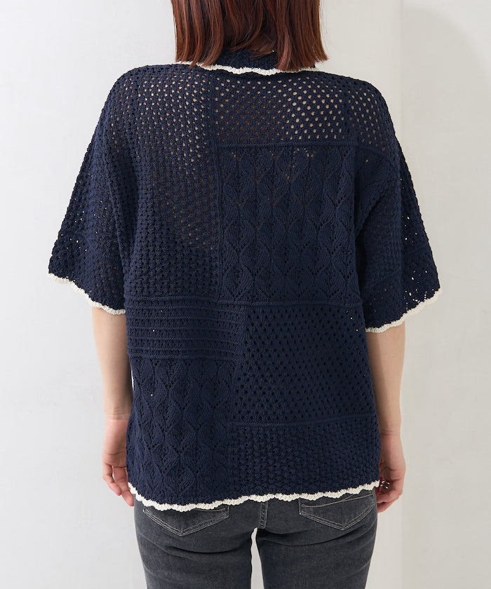 ● 鉤編風格的前開襟針織上衣,採用不對稱拼接設計。