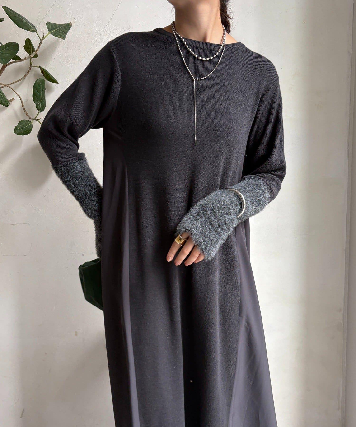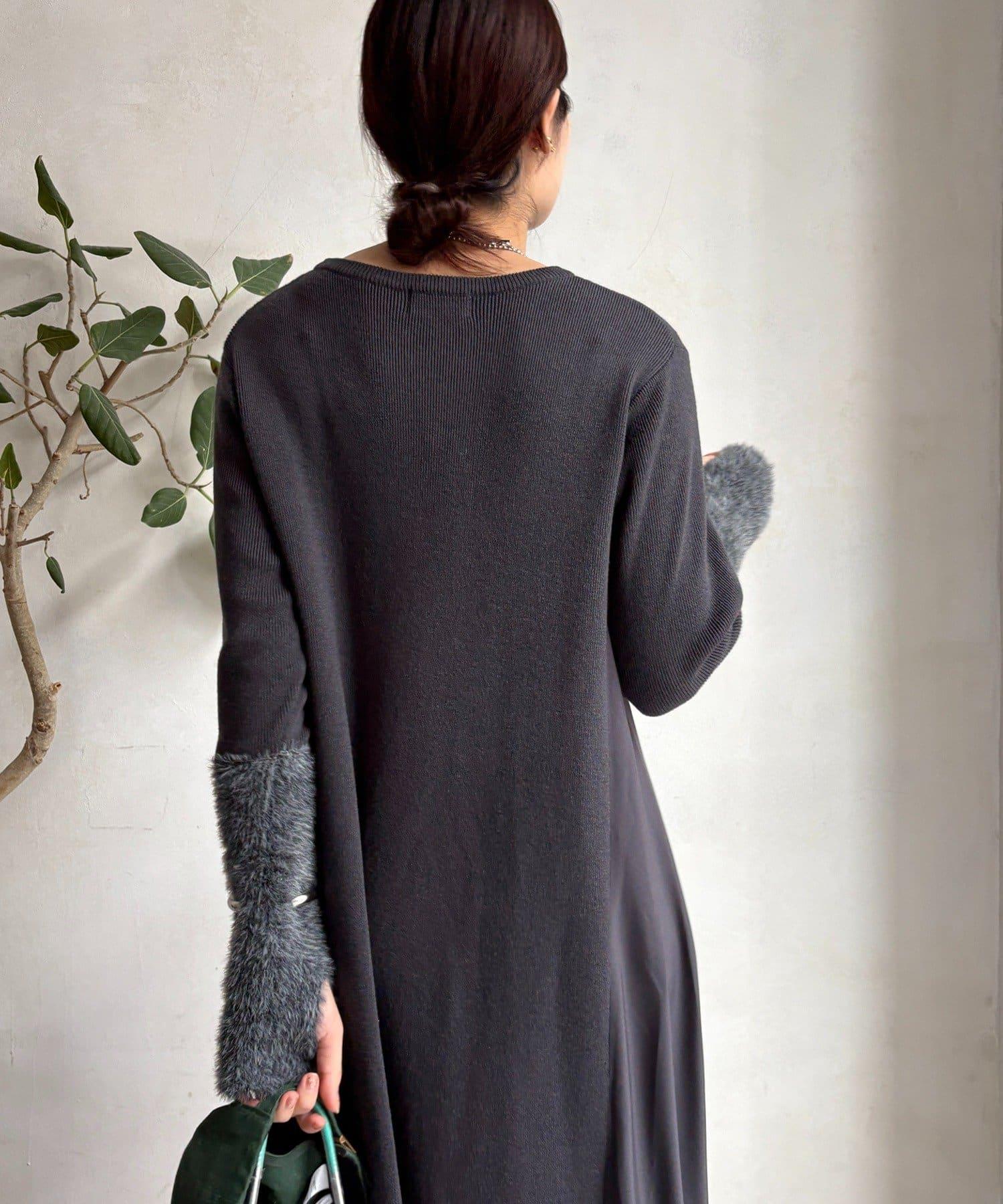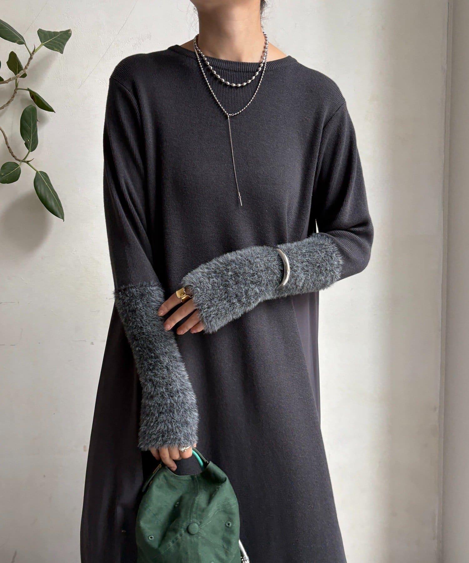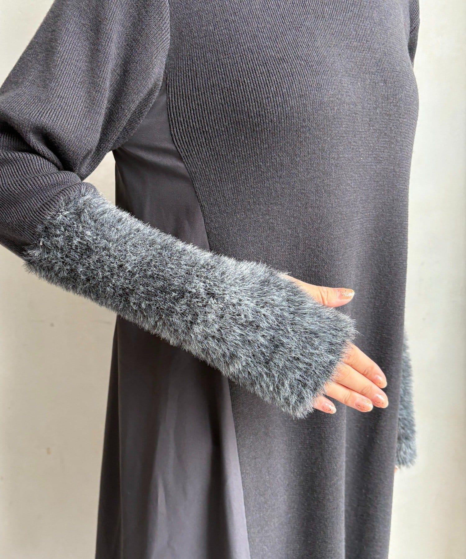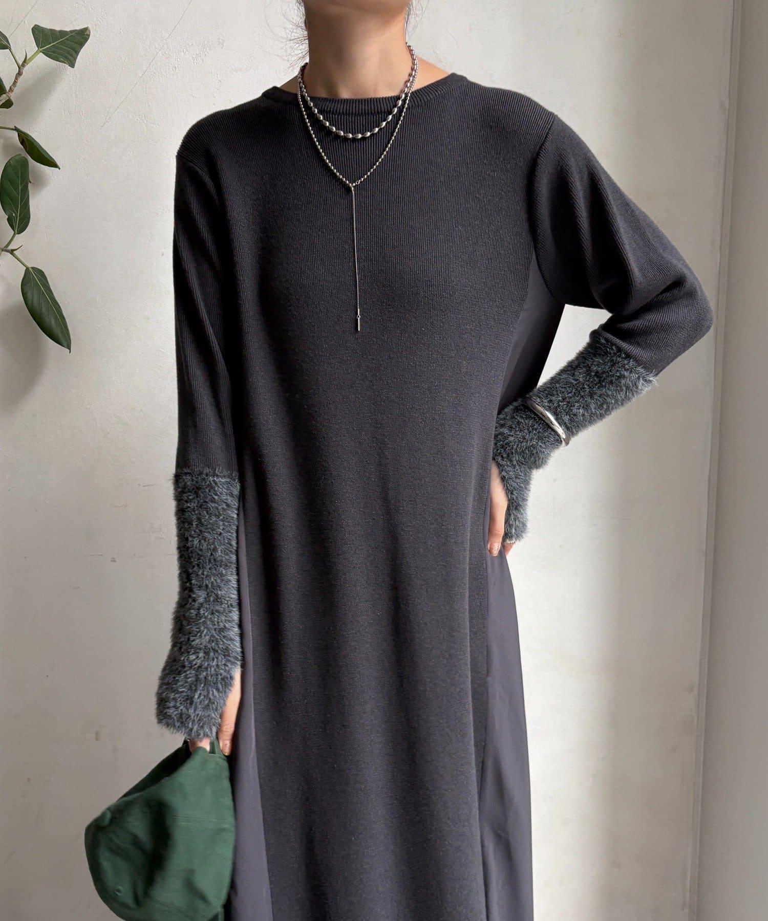 蓬鬆的絨毛材質與優雅的編織面料相結合的連身裙。