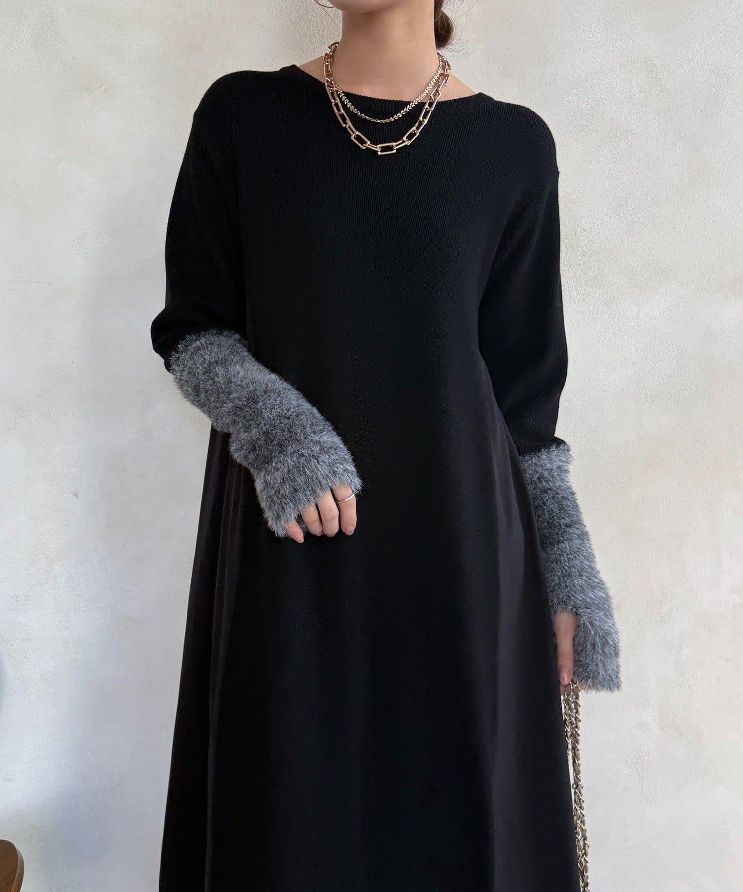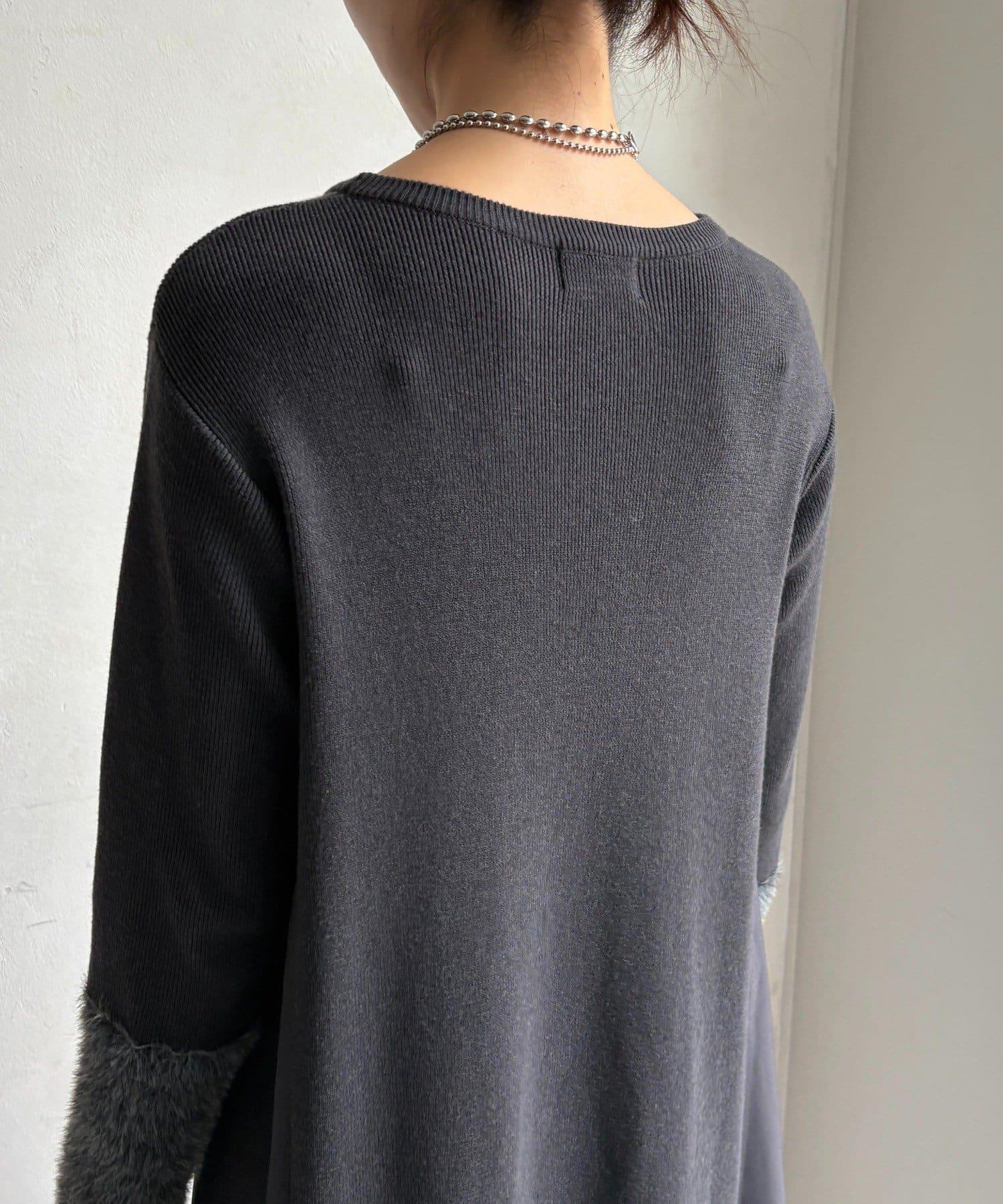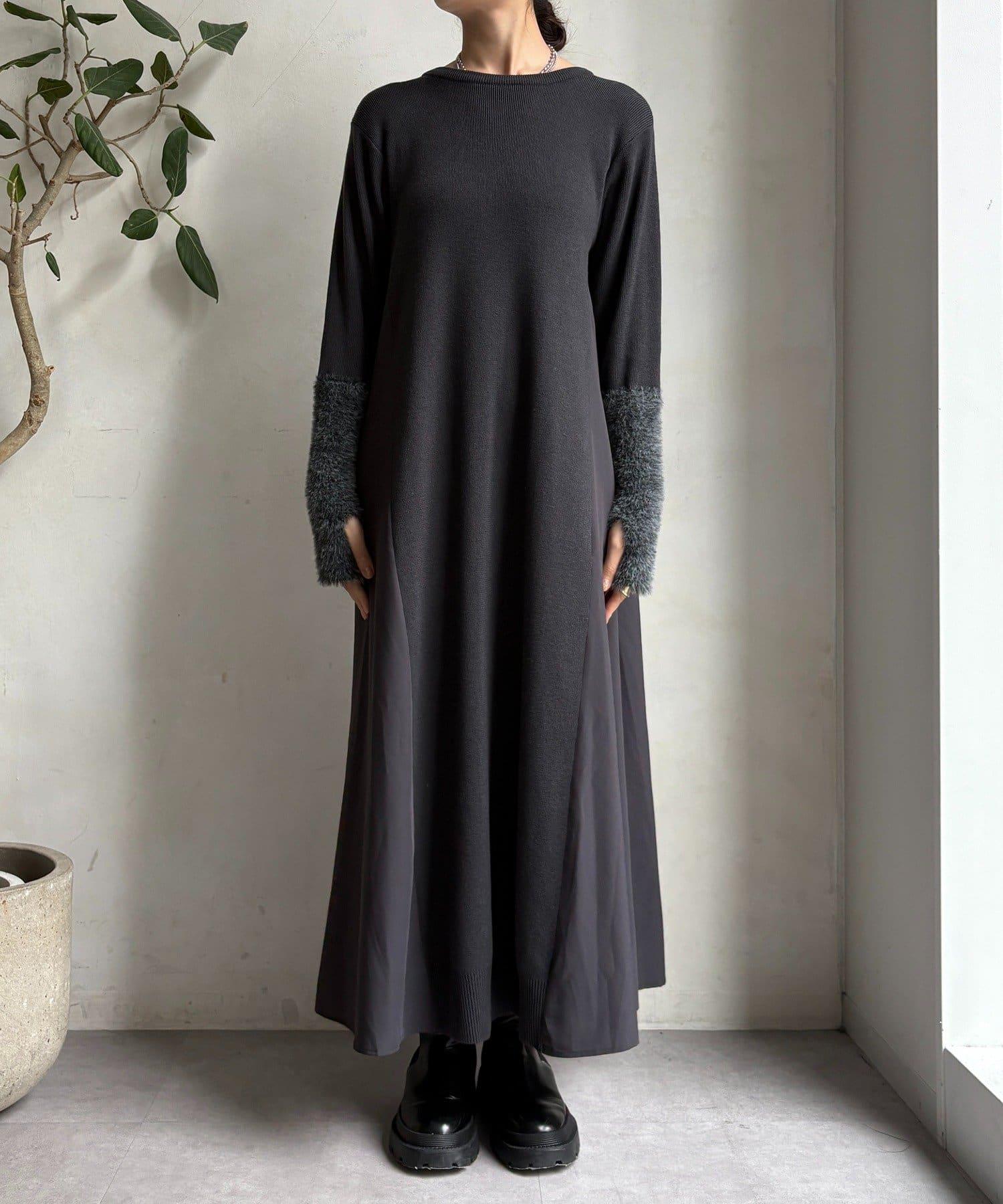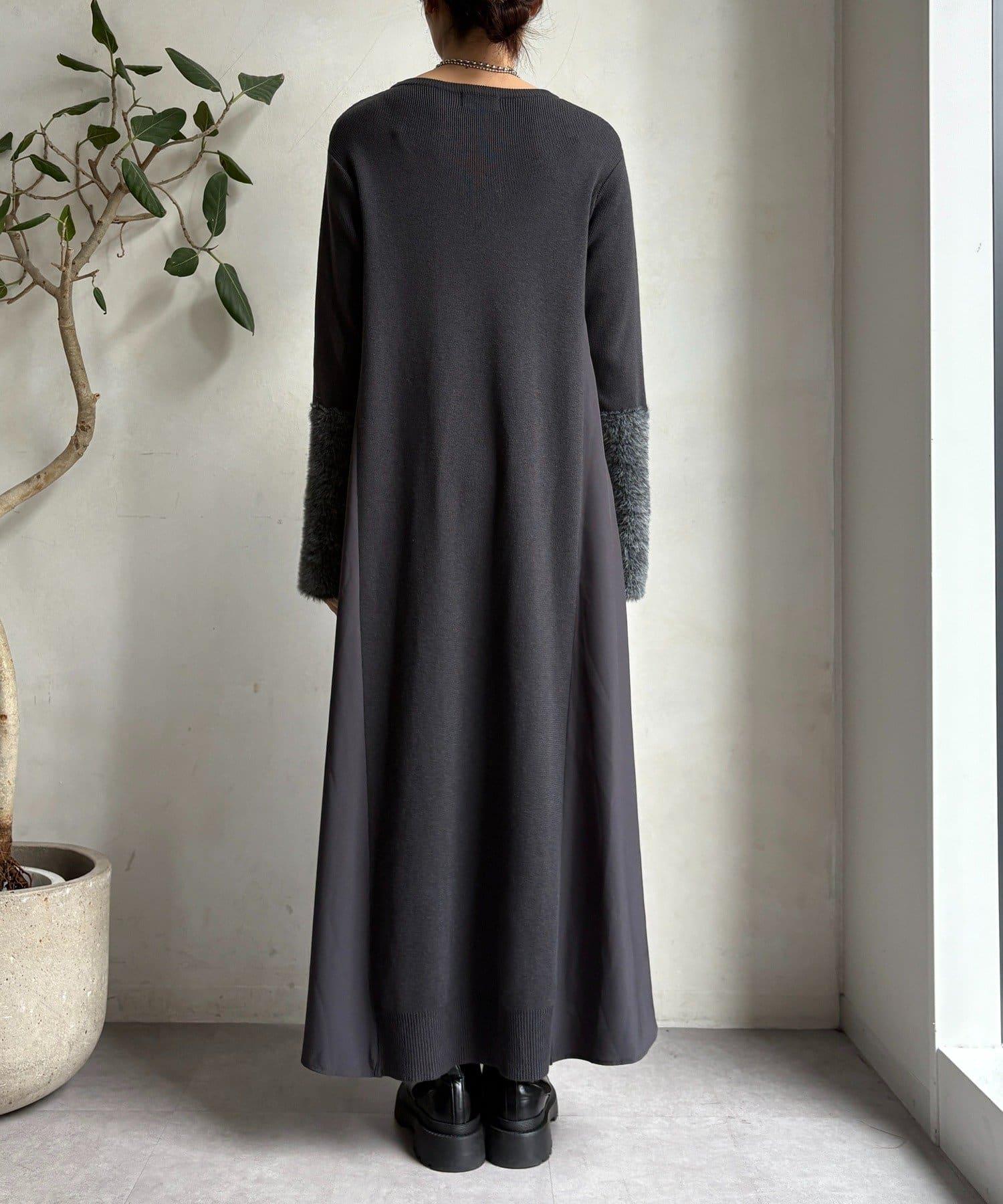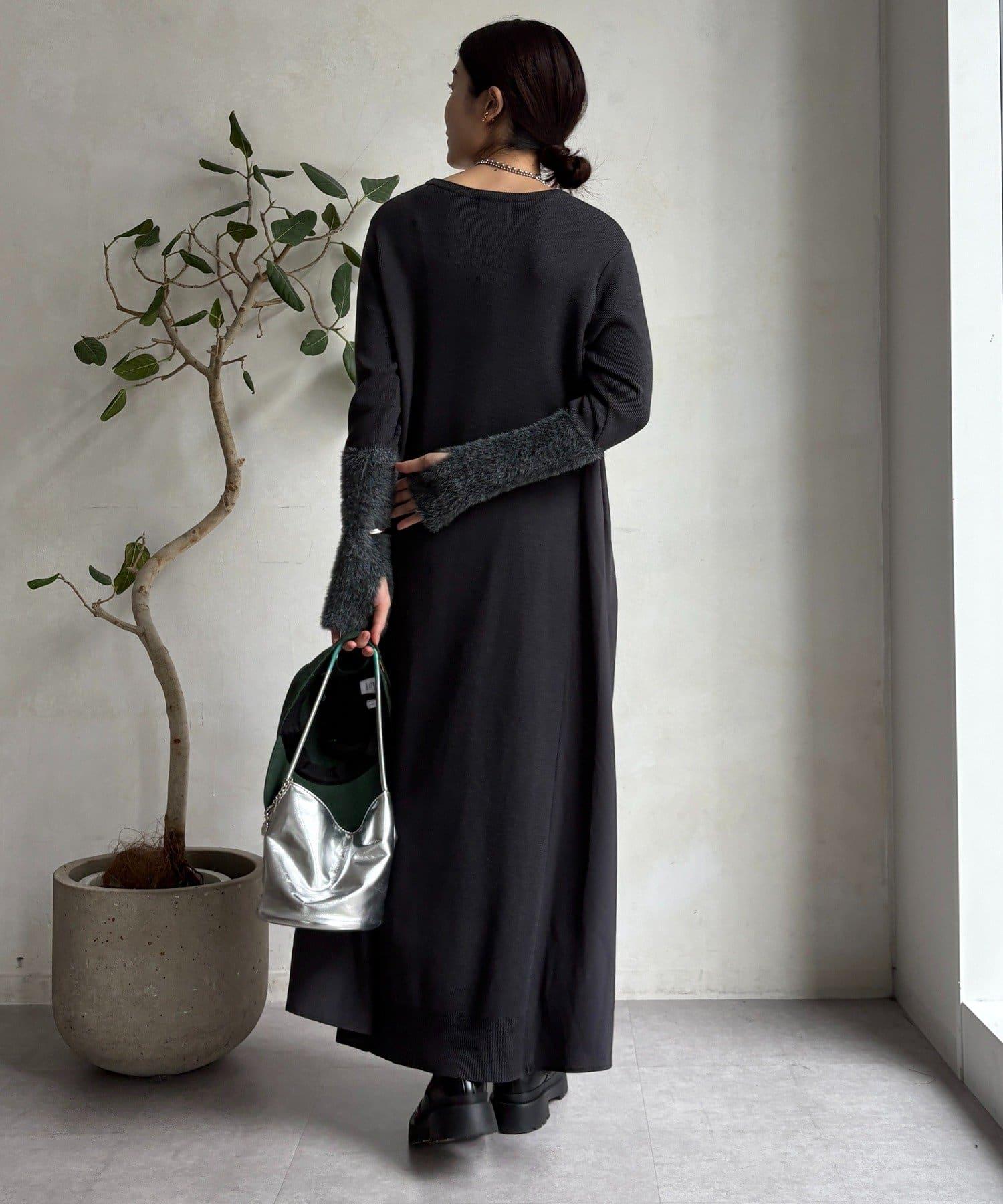 蓬鬆的絨毛材質與優雅的編織面料相結合的連身裙。